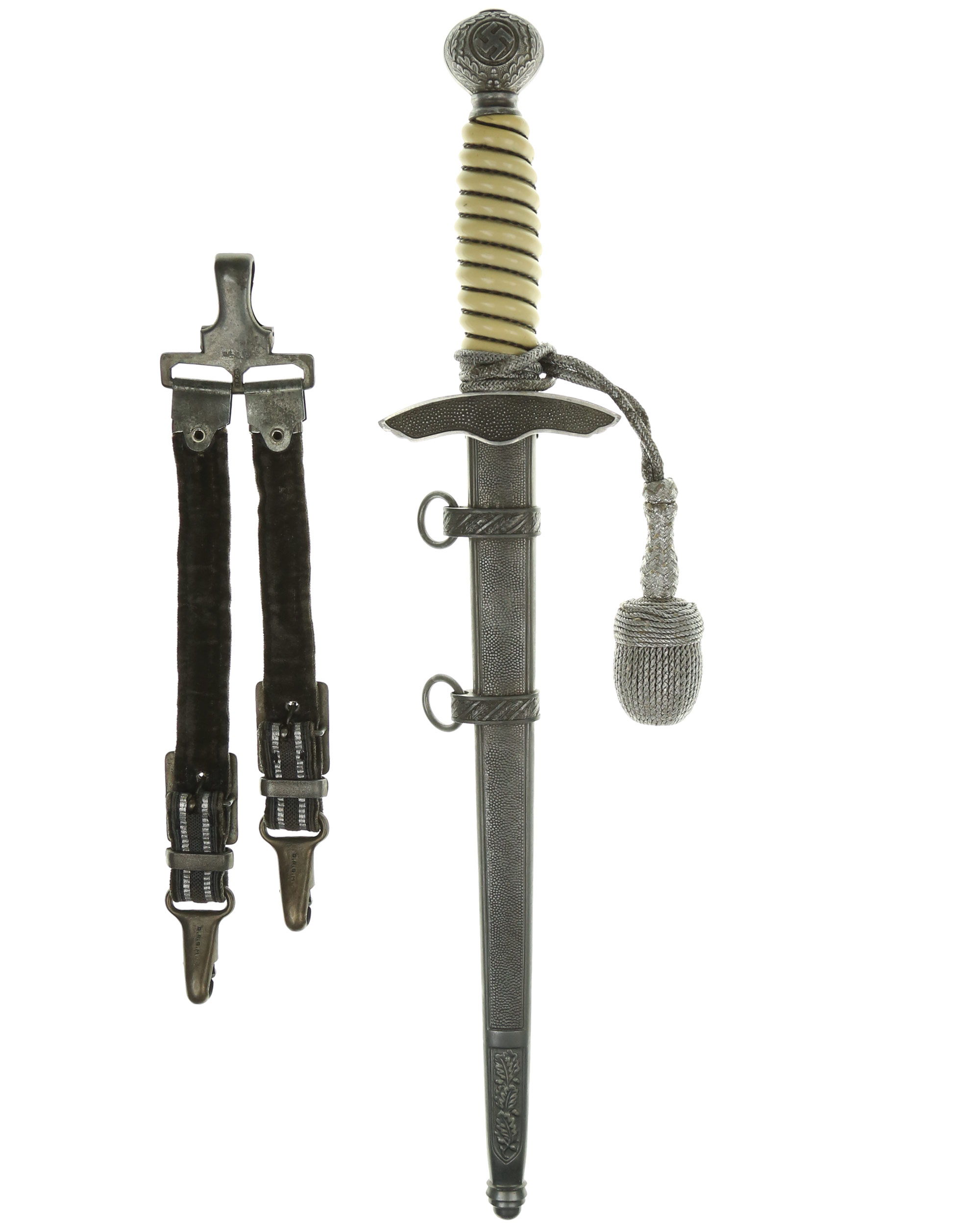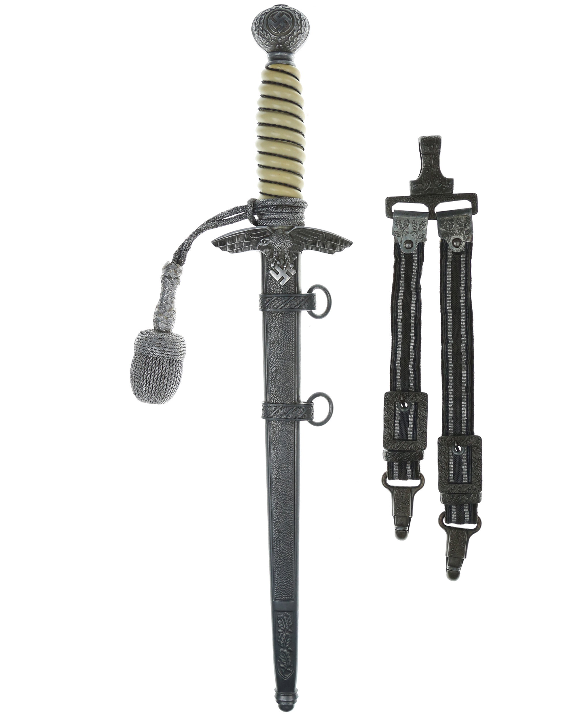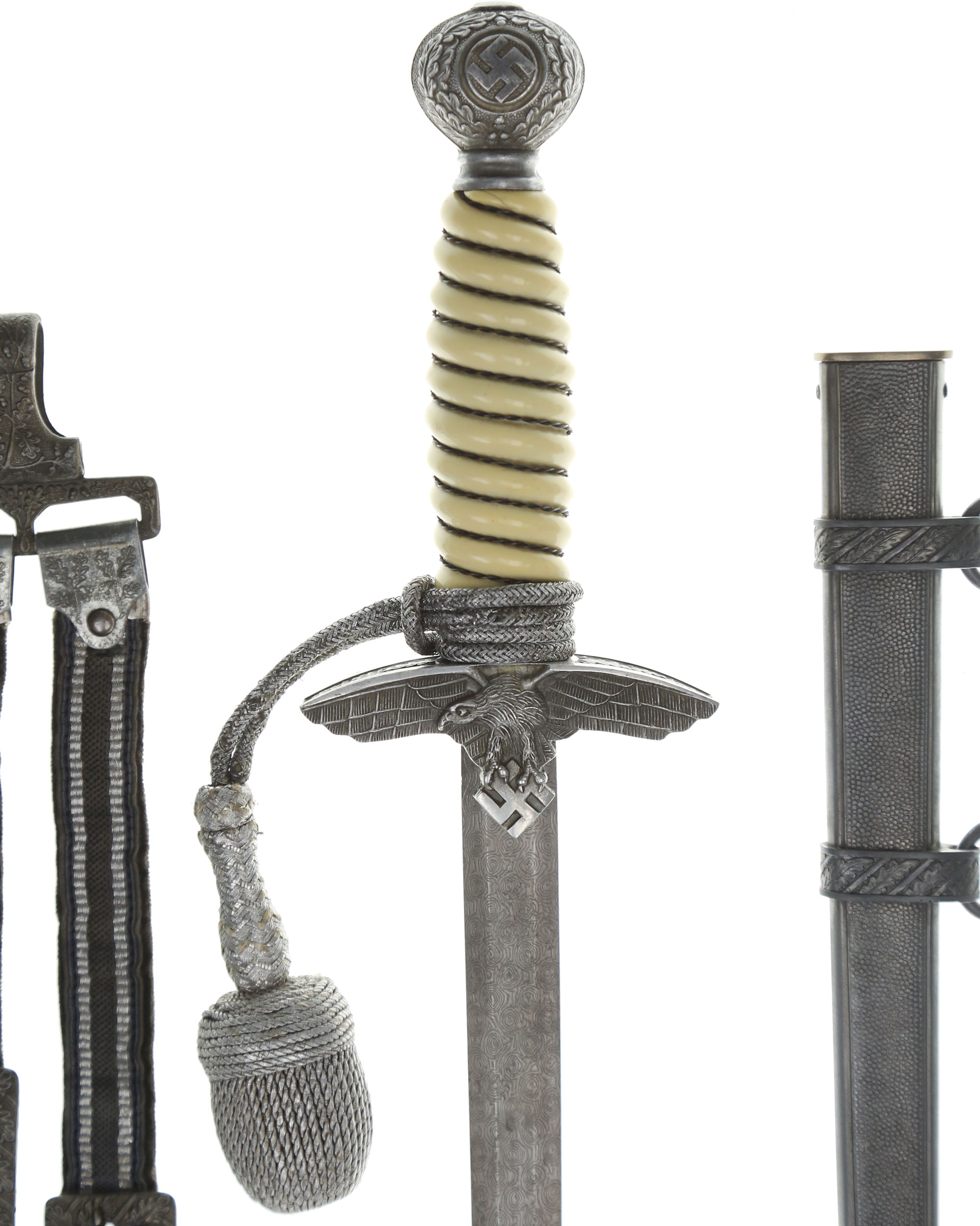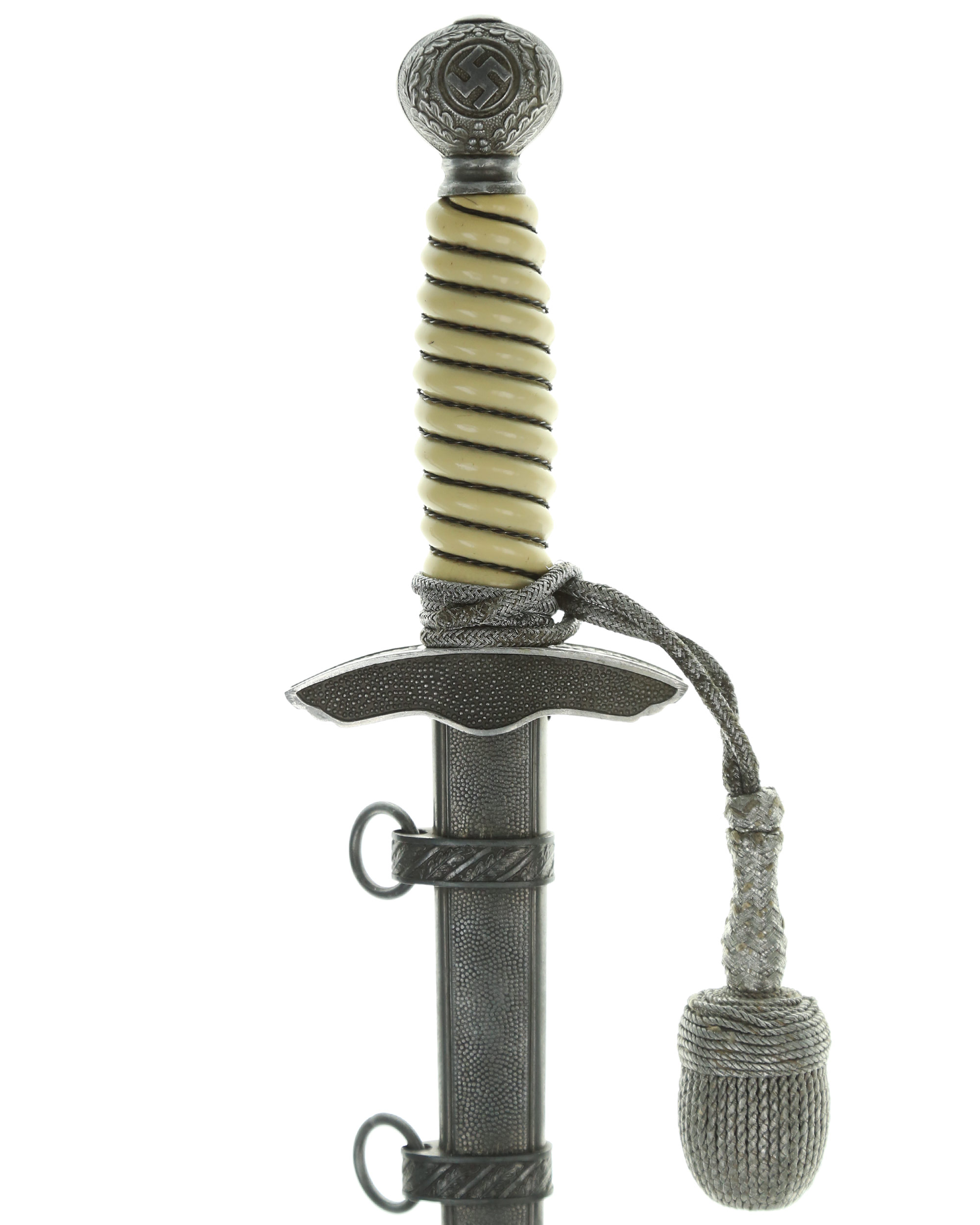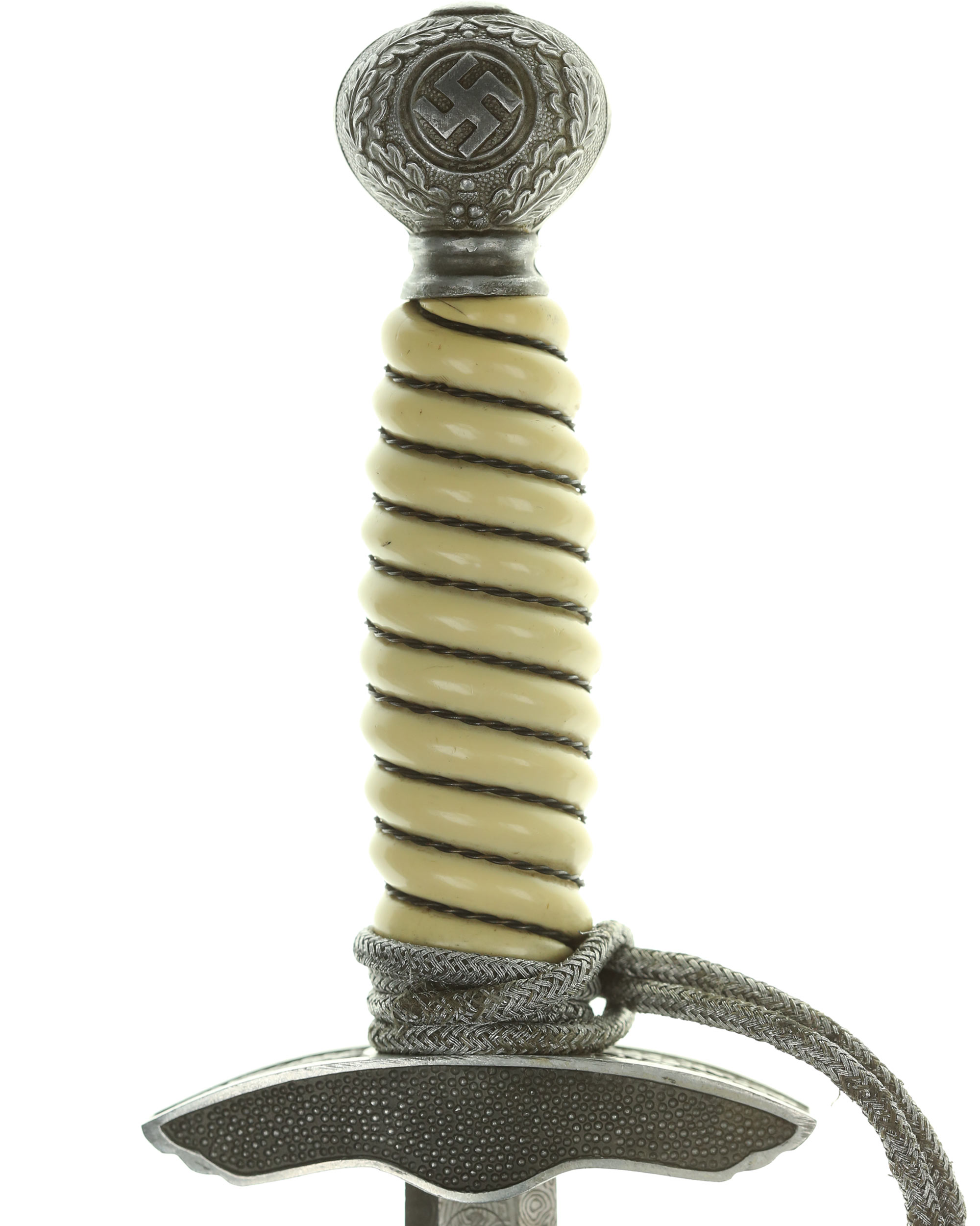 Griff: Der Griff ist rund und mit einem Holzkern, außen besteht dieser aus hellem Trolon. Die Form der Kanneluren ist konvex bzw. nach außen gewölbt. Der Knauf ist beiseitig mit Sonnenrädern und mit Eichenlaub verzierrt. dieser ist auf die Klingenangel festgeschraubt. Am unteren Ende des Griffes befindet sich der Griffring, der mit 7 Eichenlaubblättern nebeneinander verziert ist. Die Parierstange ist in Form eines Luftwaffenadlers, der nach links schaut. Zu den beiden Enden hin verlaufen die Flügel nach unten. In der Mitte befindet sich der Adler, der in seinen Krallen ein Hakenkreuz festhält.