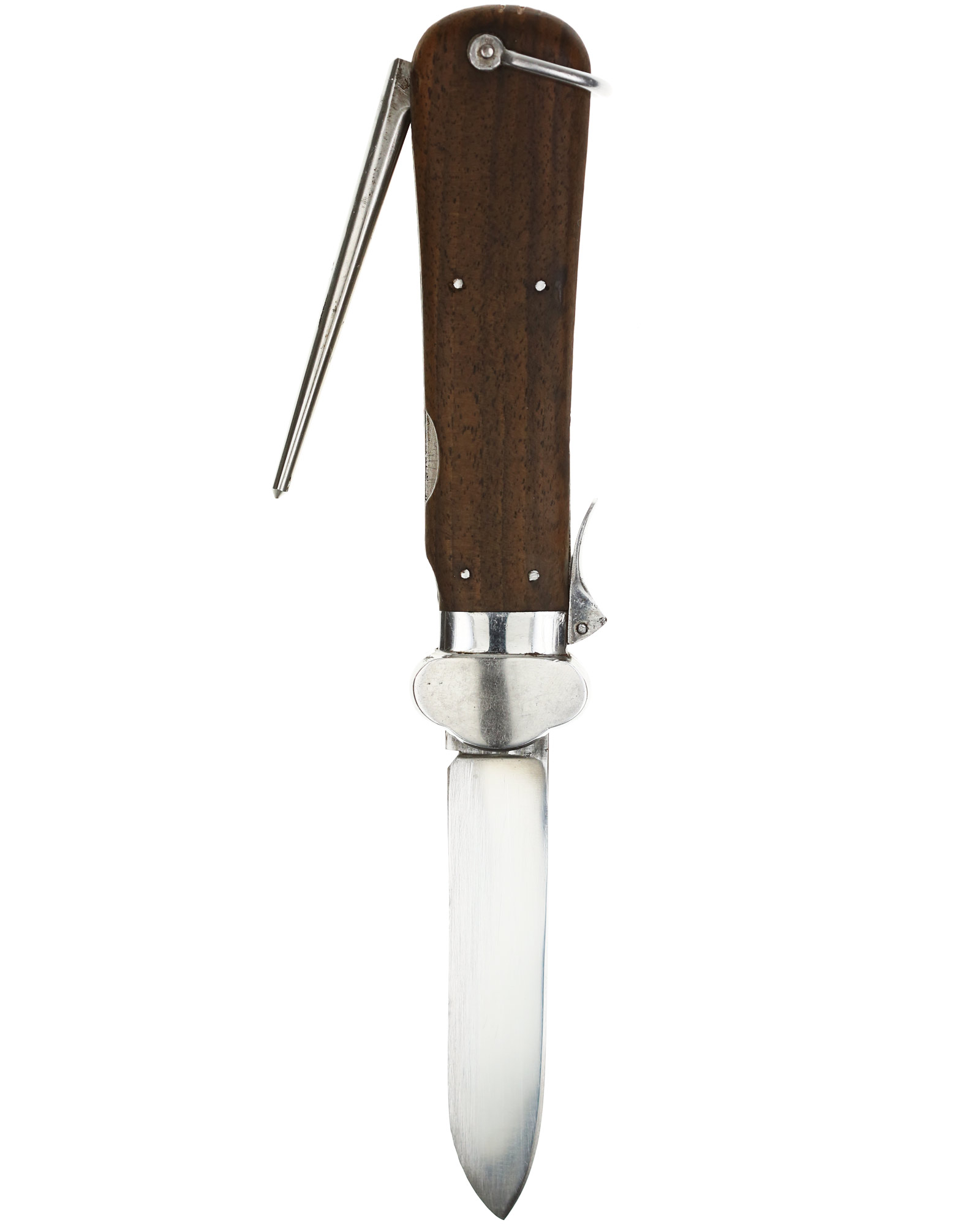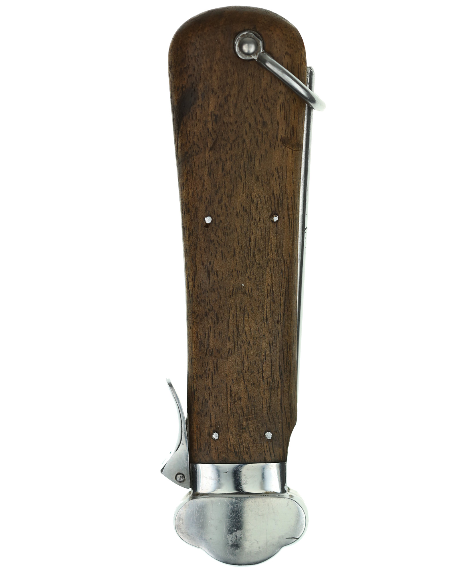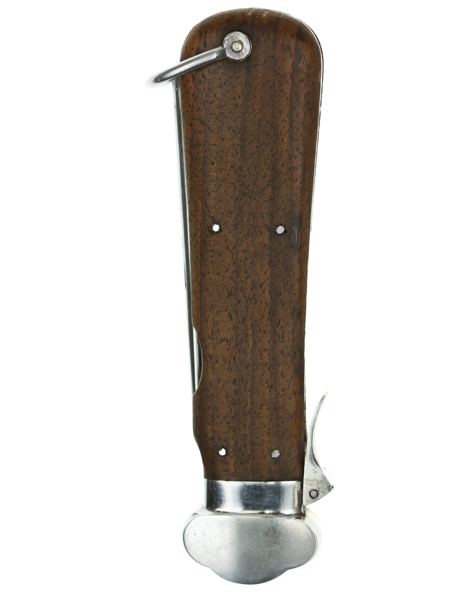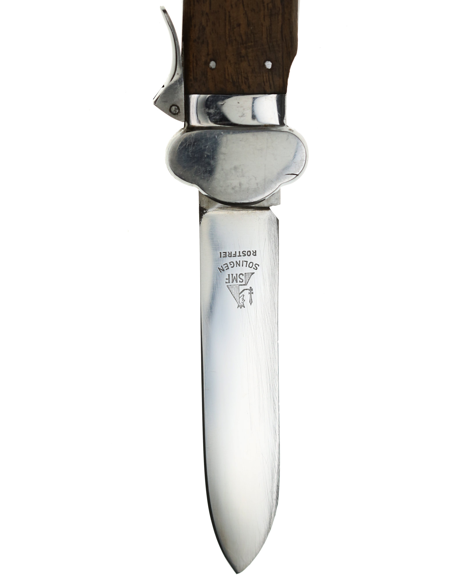 Flieger-Kappmesser mit rostfreiem Stahl. Die Gleitklinge ist einschneidig. Braune Nussbaum-Holzgriffschalen. Seitlich umlegbarer Druckhebel. Umlegbarer Aufreiber (Ahle) an der Schmalseite des Messerkastens. Vernieteter Tragebügel. Klinge lässt sich nicht einrasten. Polierte Klinge, mit seltenem Hersteller für das Fallschirm-Kappmesser: SMF Solingen. Der Druckhebel ist mit der Nummer 562 gekennzeichnet.