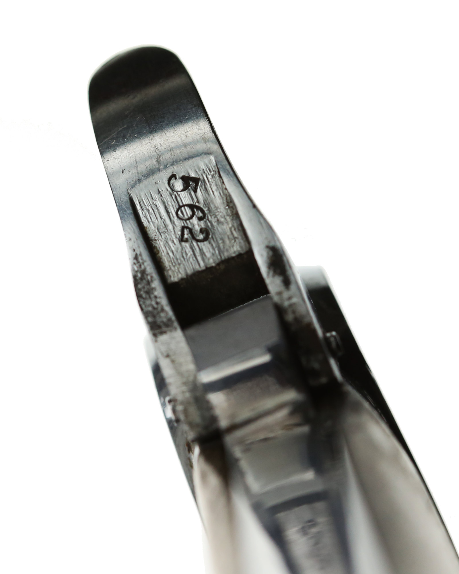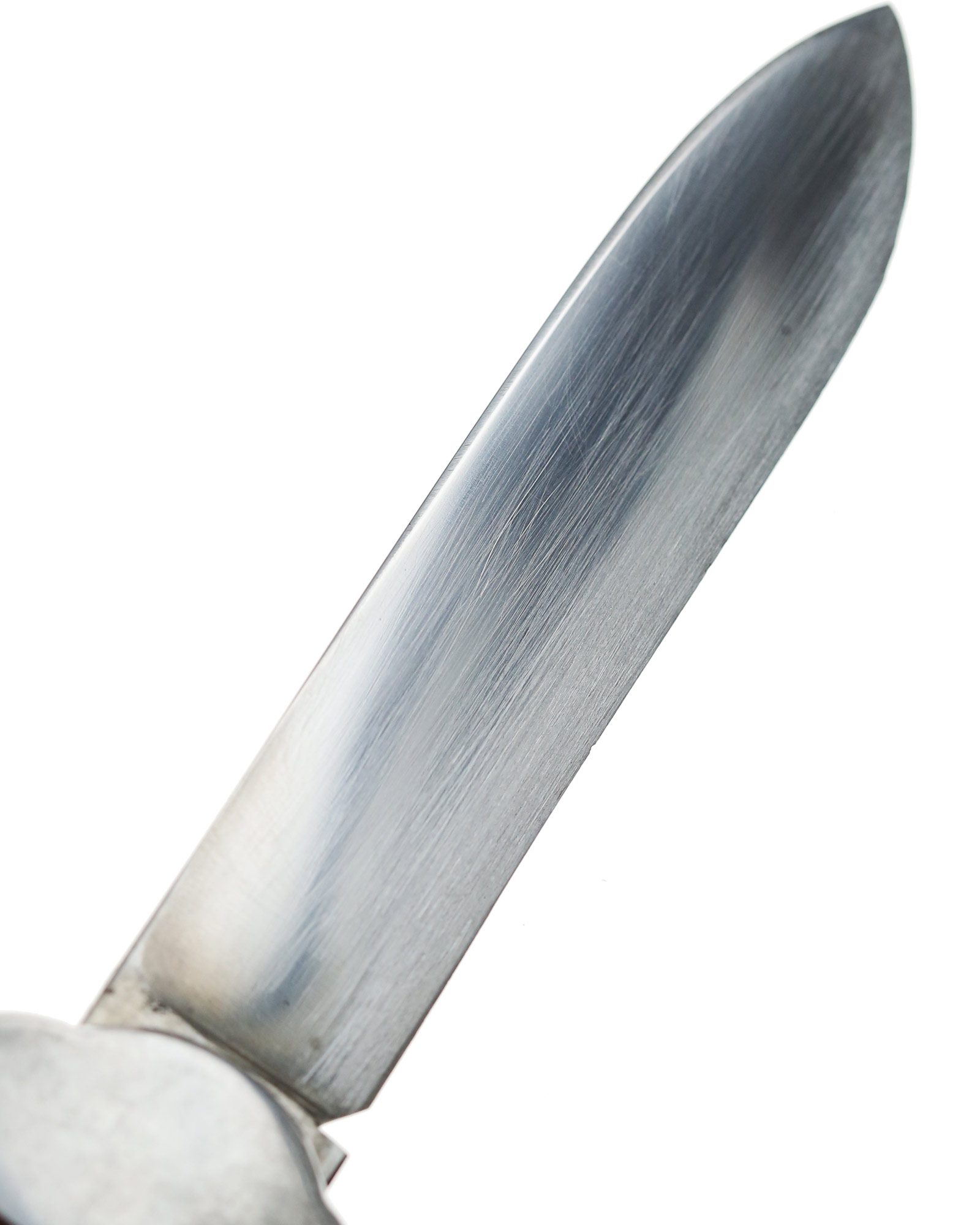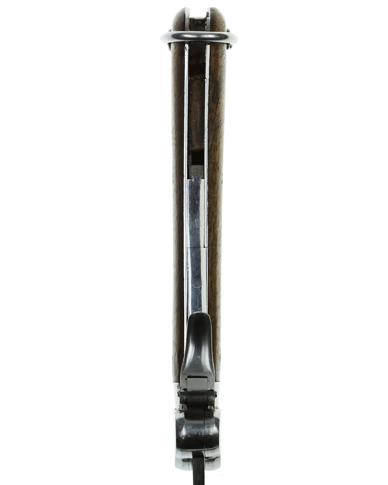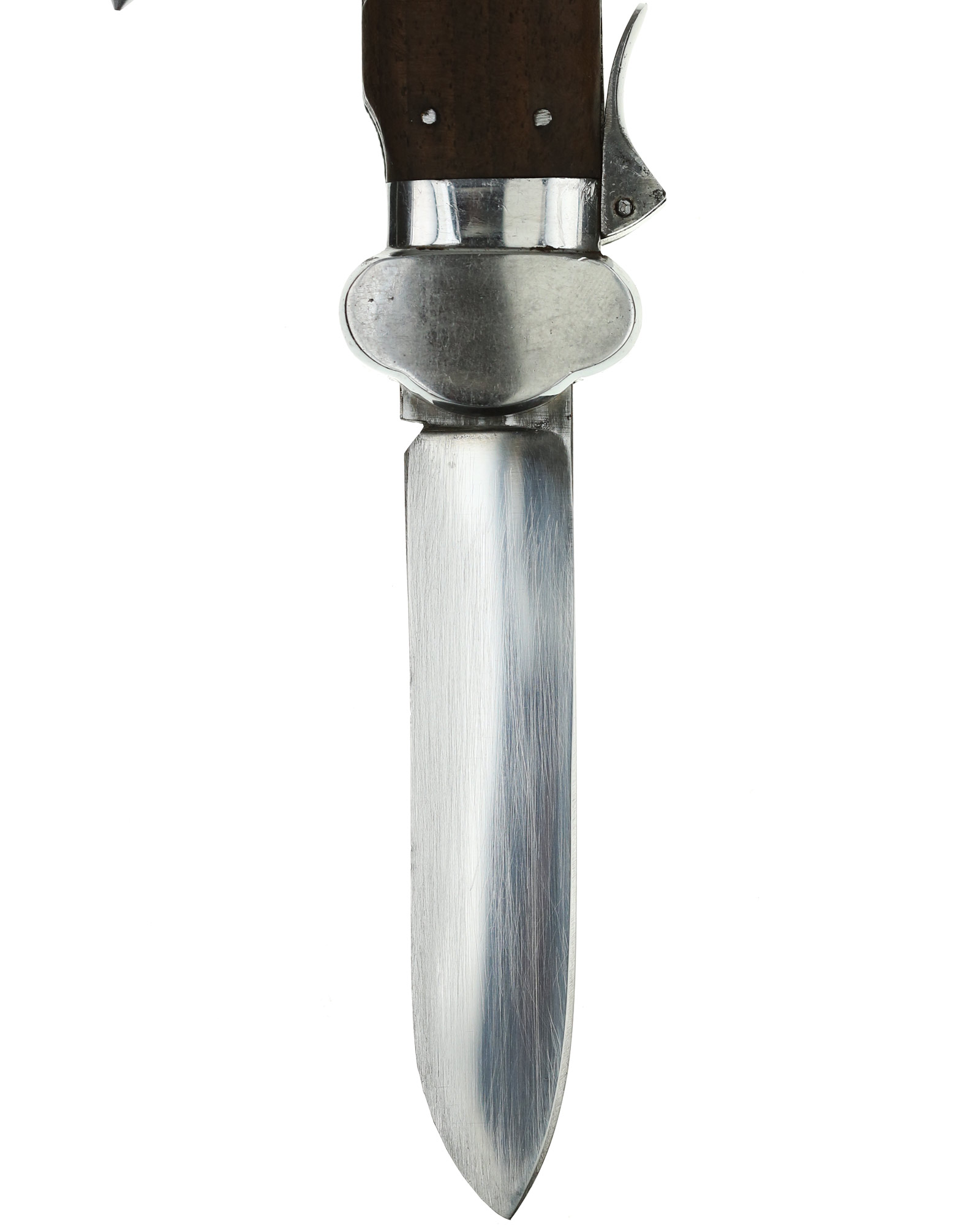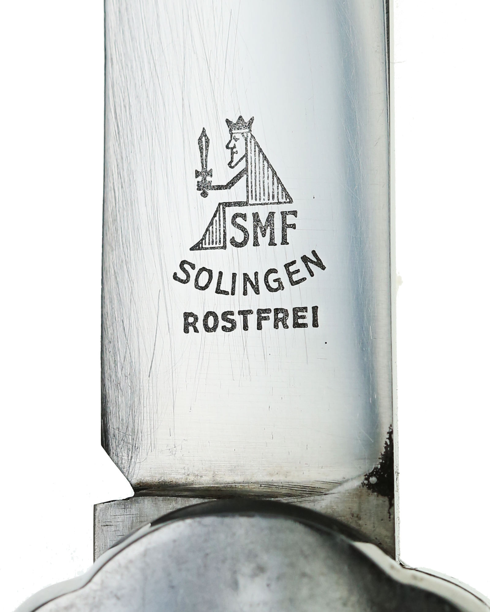 Flieger-Kappmesser mit rostfreiem Stahl. Die Gleitklinge ist einschneidig. Braune Nussbaum-Holzgriffschalen. Seitlich umlegbarer Druckhebel. Umlegbarer Aufreiber (Ahle) an der Schmalseite des Messerkastens. Vernieteter Tragebügel. Klinge lässt sich nicht einrasten. Polierte Klinge, mit seltenem Hersteller für das Fallschirm-Kappmesser: SMF Solingen. Der Druckhebel ist mit der Nummer 562 gekennzeichnet.