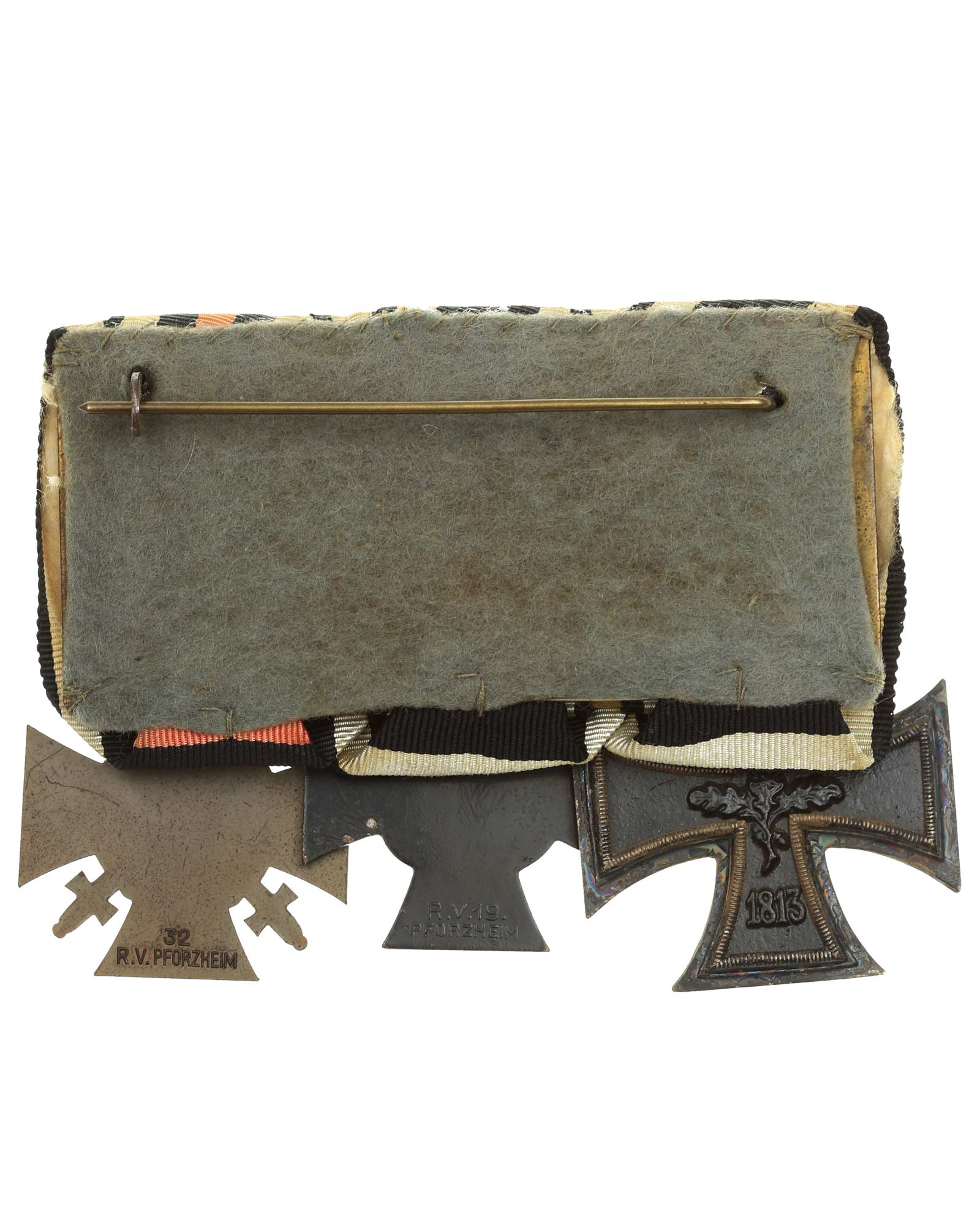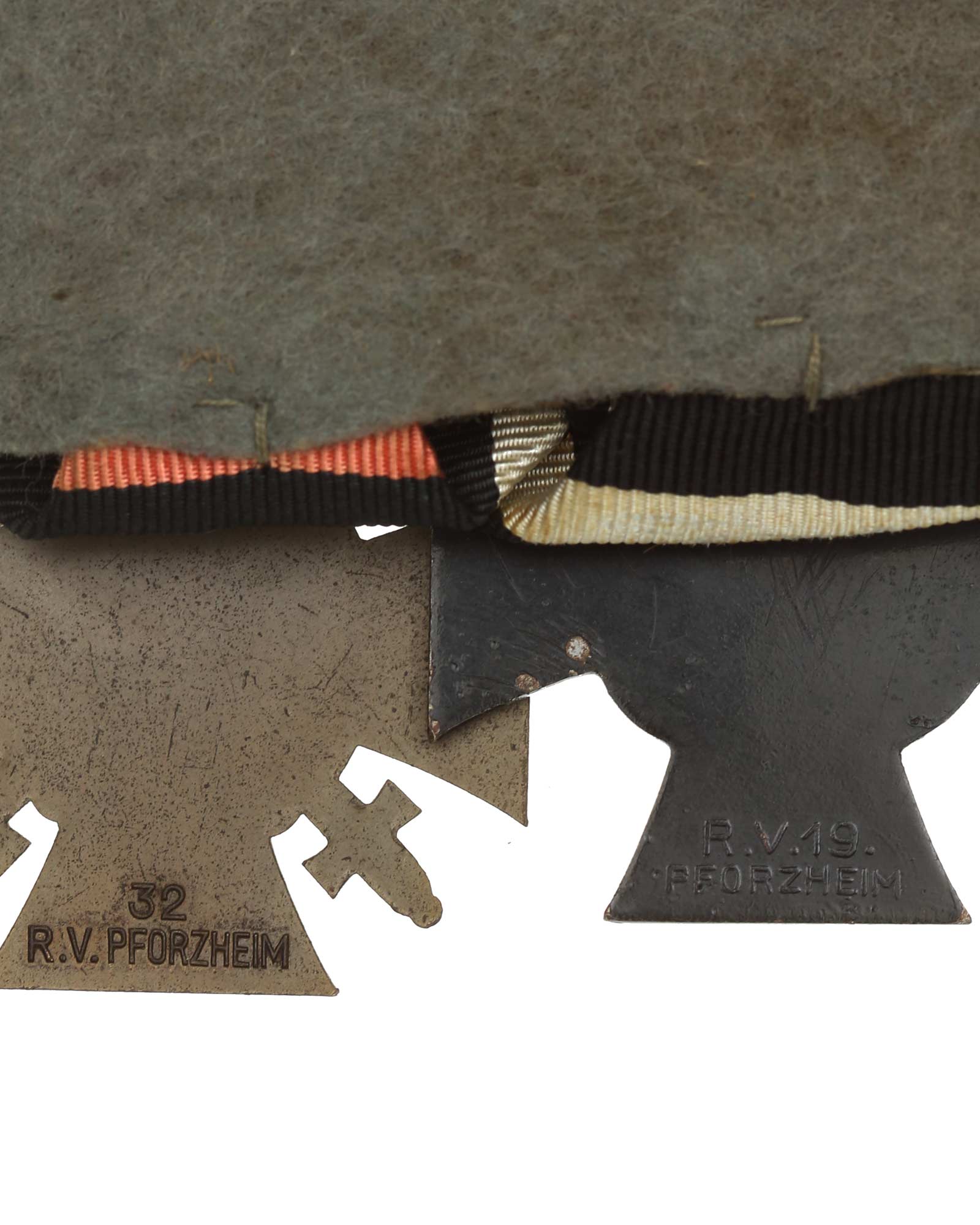 Ordensspange bestehend aus Eisernes Kreuz 1914 2. Klasse mit Herstellermarkierung, Ehrenkreuz des 1.Weltkrieges – Frontkämpferkreuz ohne Schwerter (R.V. 19. Pforzheim) und Ehrenkreuz mit Schwertern für Frontkämpfer 1914-1918 – 32 R.V. Pforzheim.