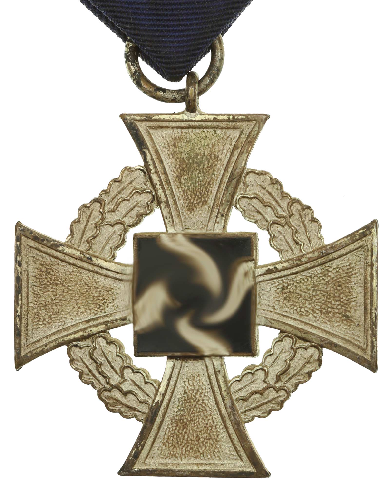 Treuedienst Ehrenzeichen 2. Stufe für 25 Jahre. Buntmetall versilbert. Rückseite mit Inschrift: "Für Treue Dienste". Gesamtgewicht 22 g, Abmessungen: 41,27 x 41,36 mm.