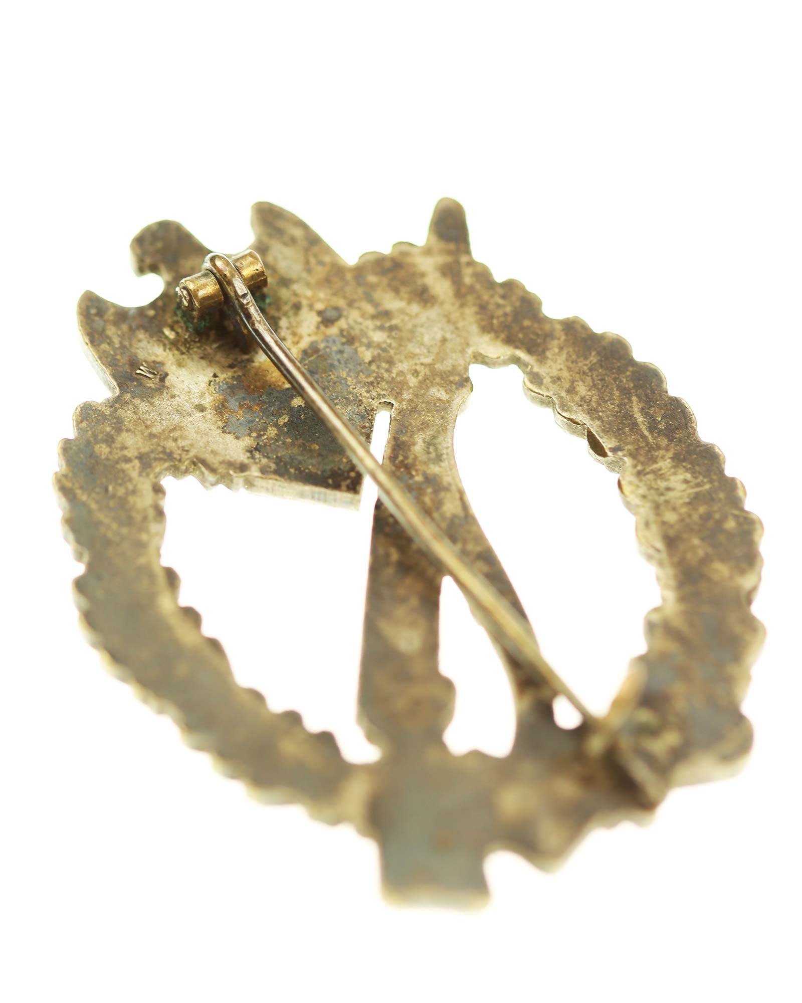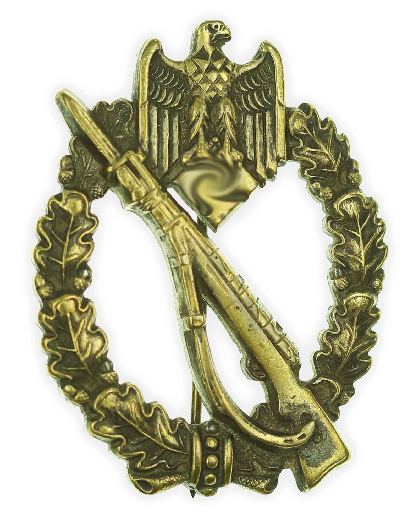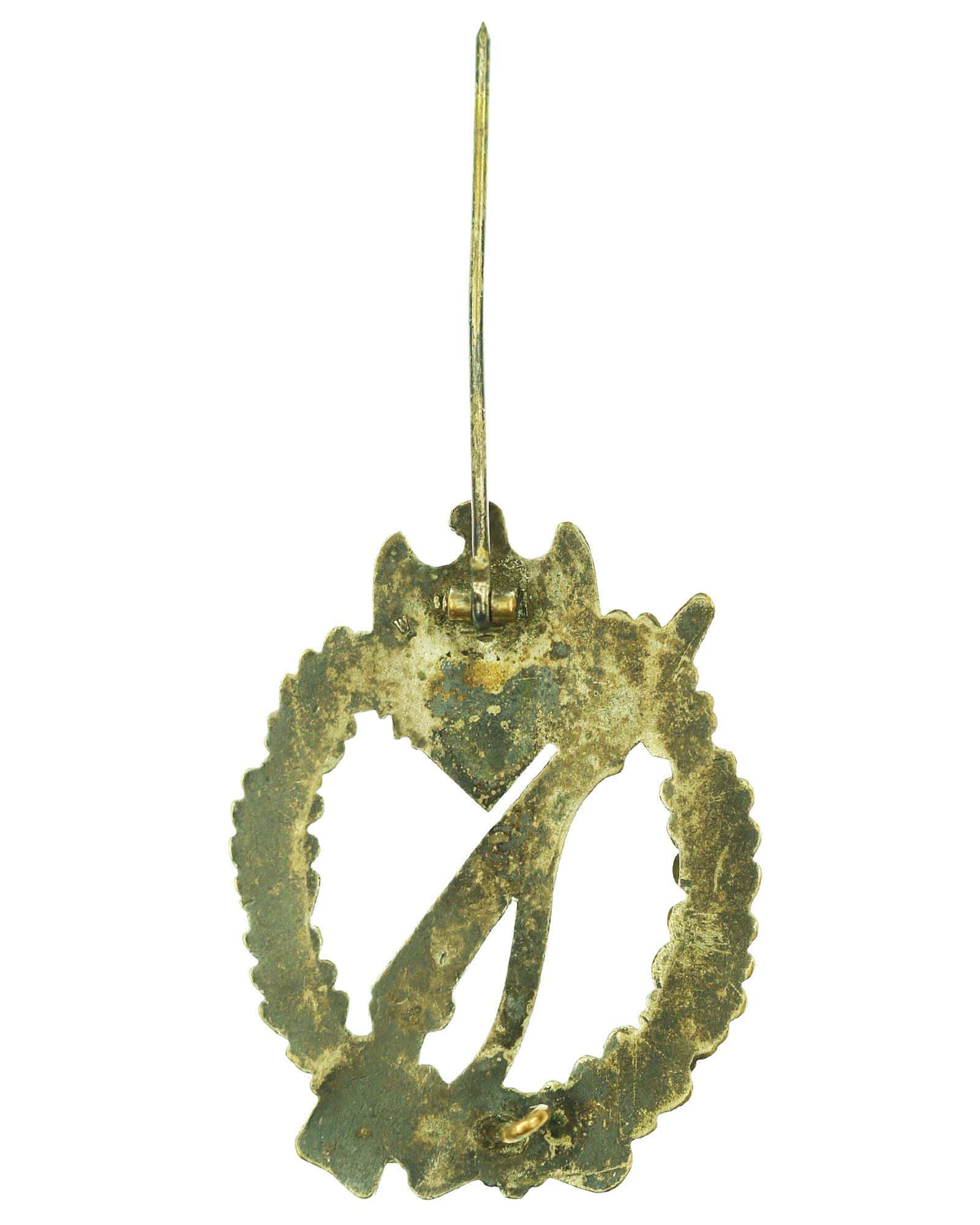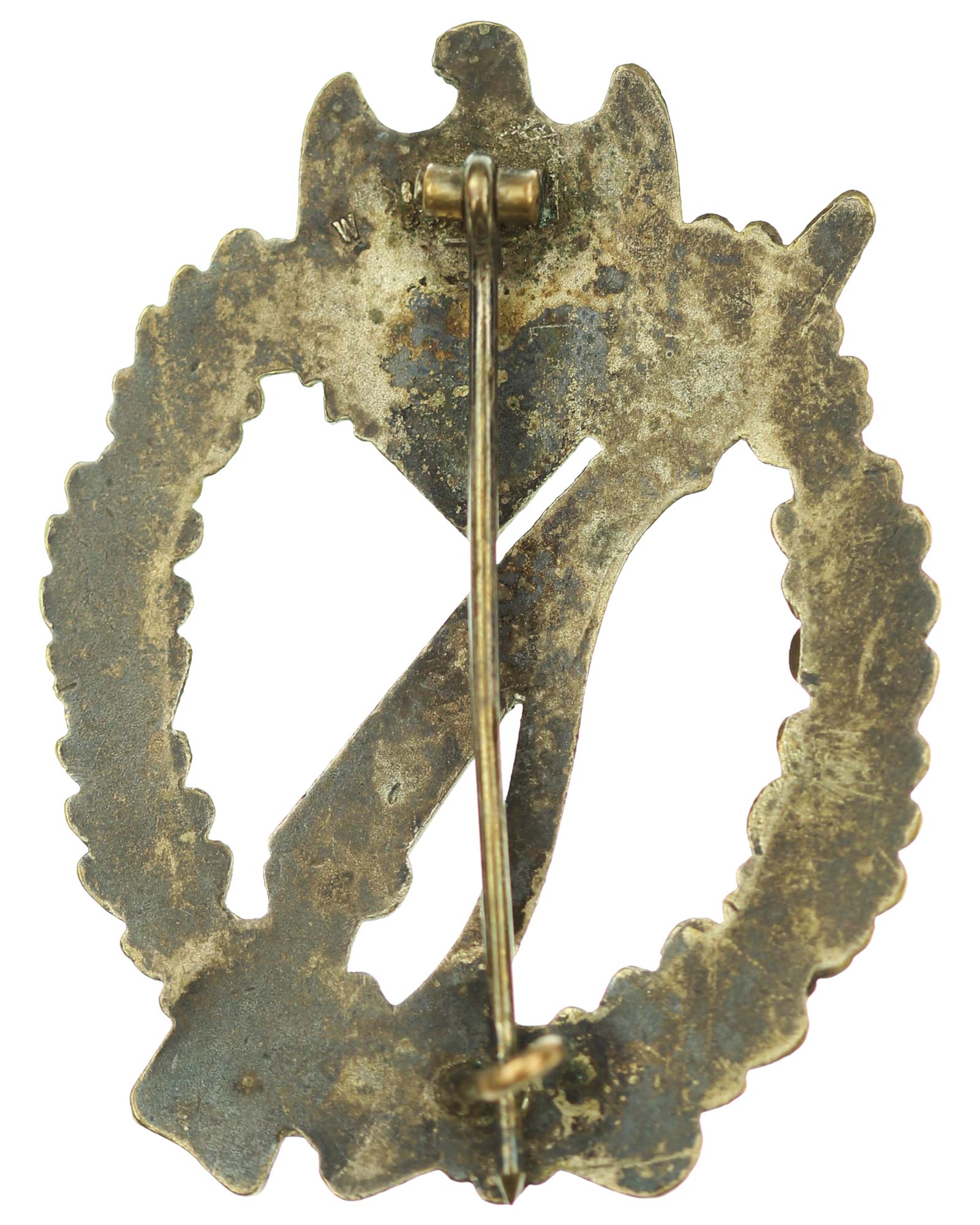 Infanteriesturmabzeichen in Bronze (Buntmetall massiv). Mit vollständiger Bronzierung. Neben dem Nadelbock auf der Rückseite befindet sich der Hersteller "W" (Karl Wurster Markneukirchen). Rückseite mit Nadel. Gesamtgewicht 38 g. Abmessungen: 61,78 x 47,35 mm.