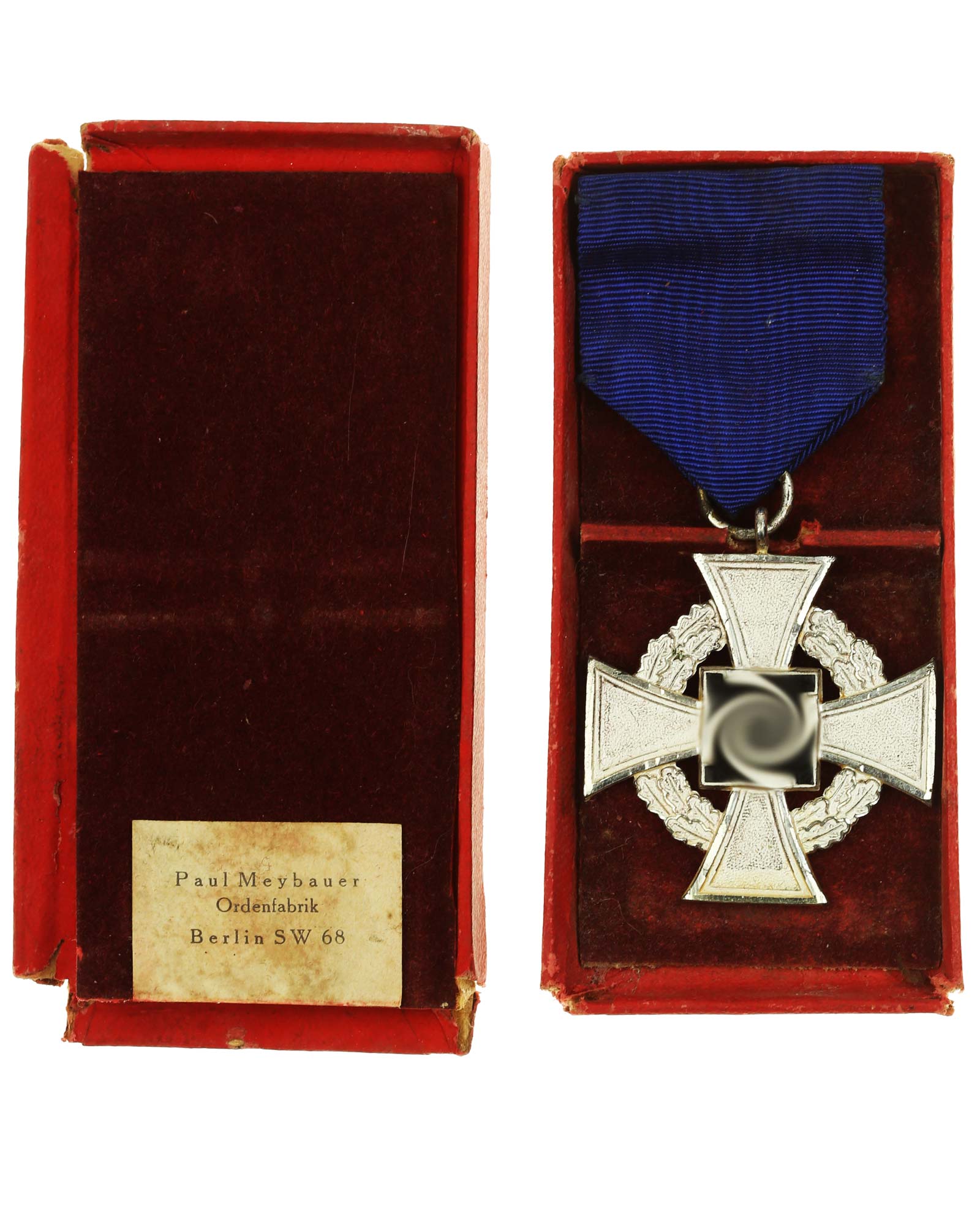 Treuedienst Ehrenzeichen 2. Stufe für 25 Jahre. Verleihungszeitraum 1938 - 1945. Buntmetall versilbert. Rückseite mit Inschrift: "Für Treue Dienste". Etui mit Hersteller Paul Meybauer Ordenfabrik Berlin SW 68. Gesamtgewicht 36 g, Abzeichen: 21 g. Abmessungen: 40,82 x 46,32 mm.