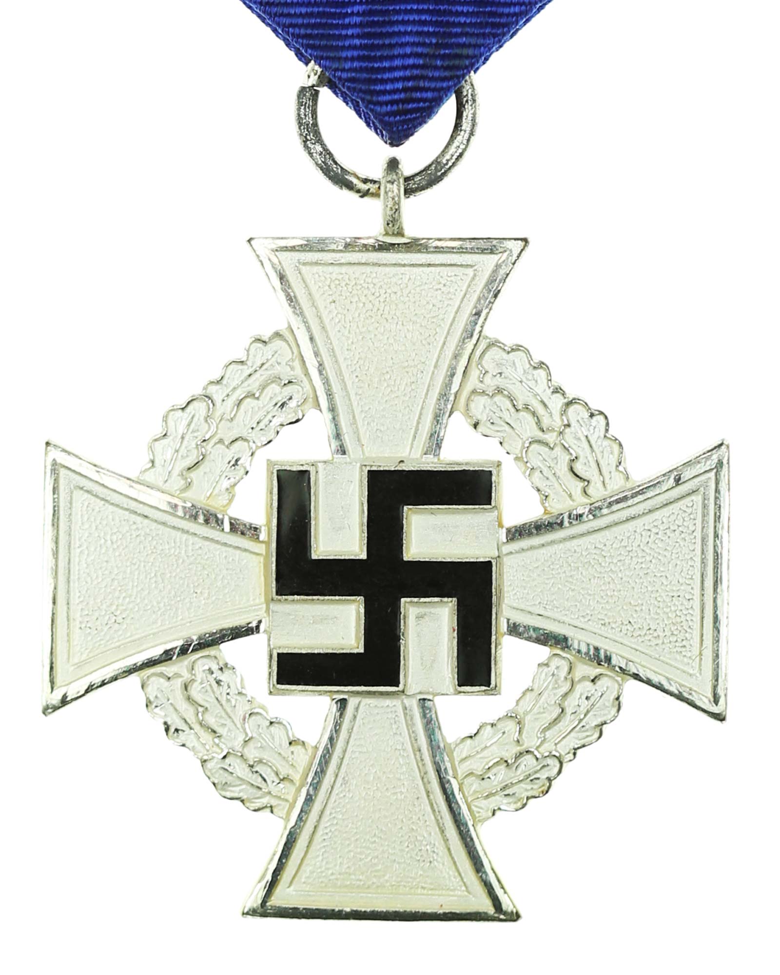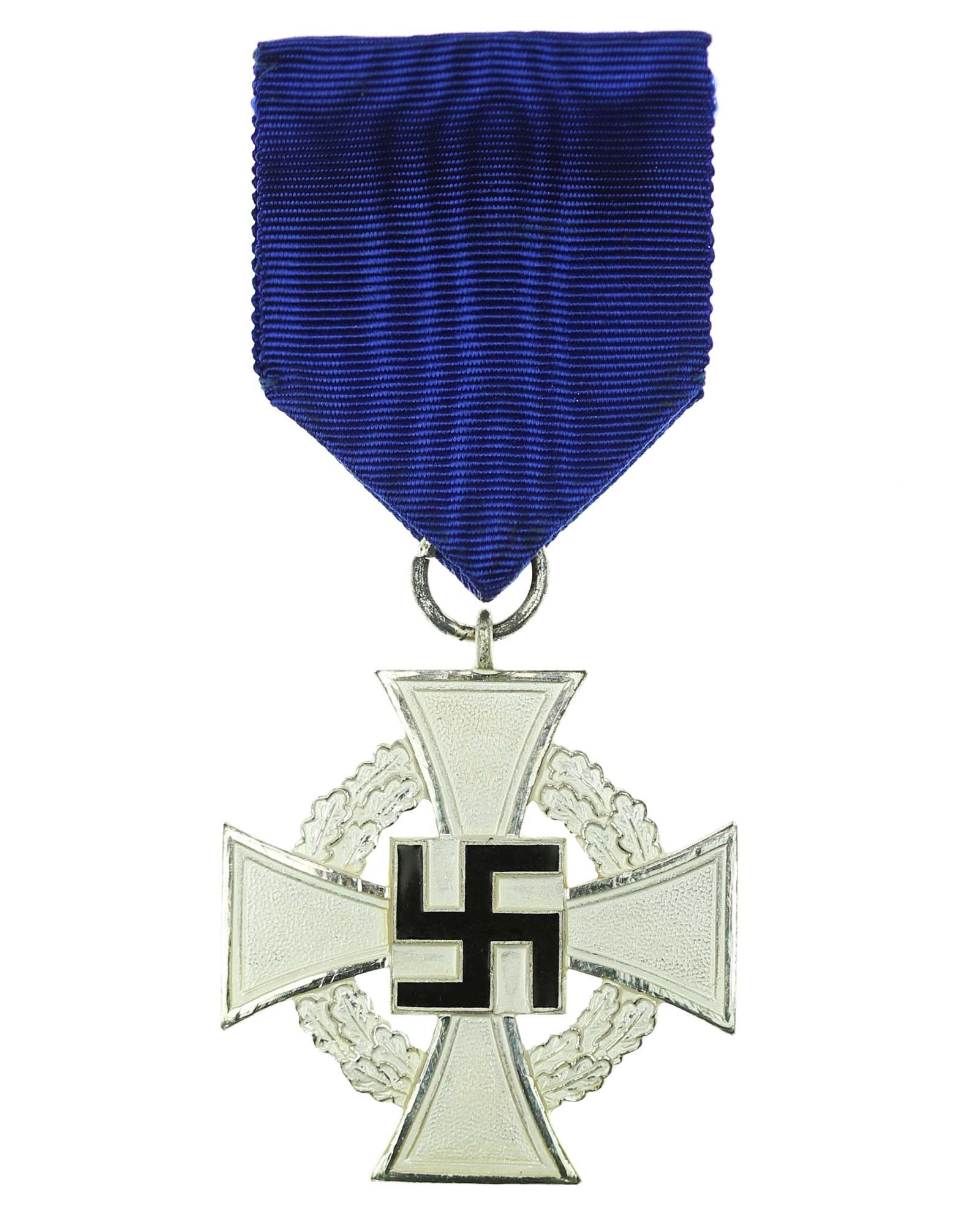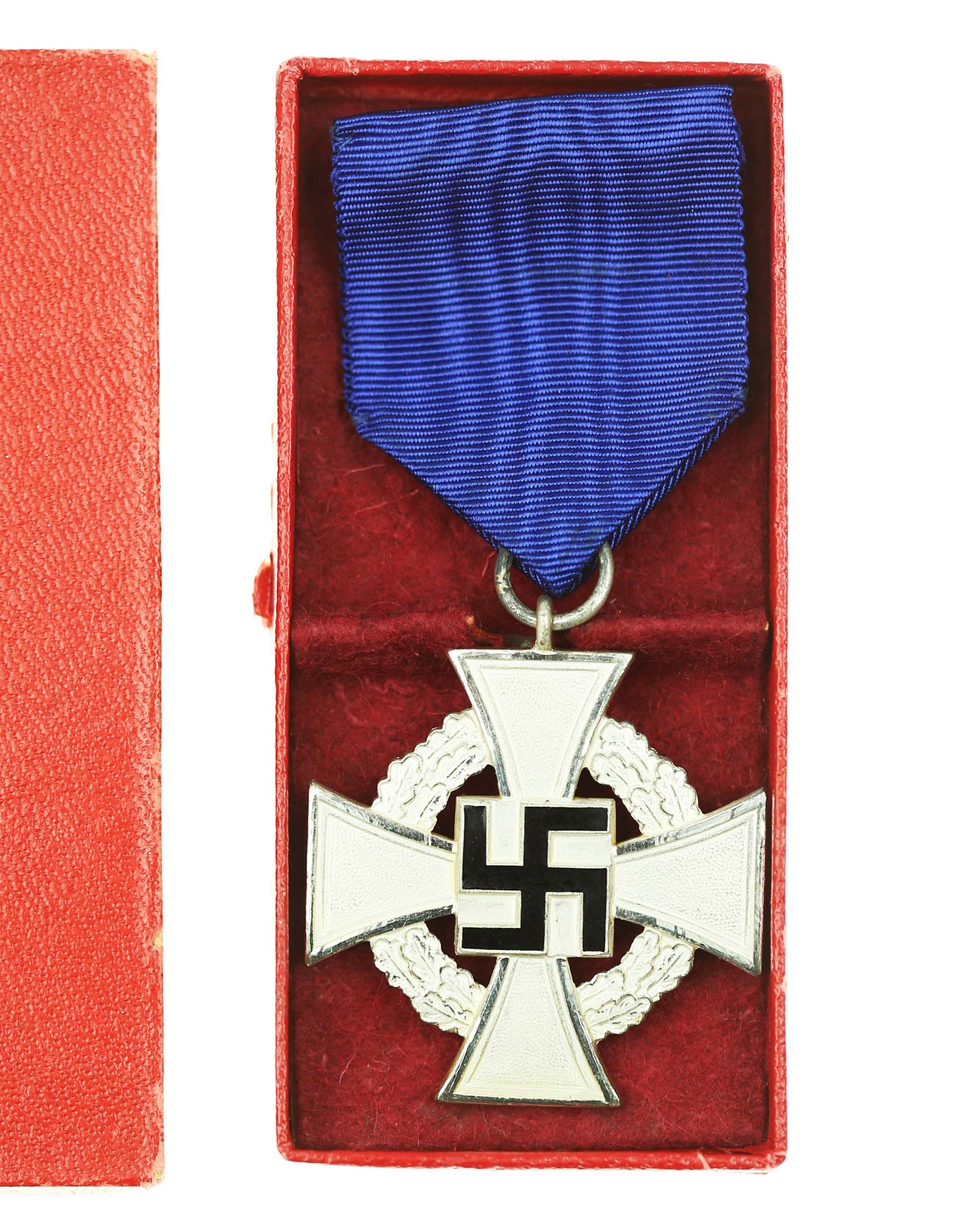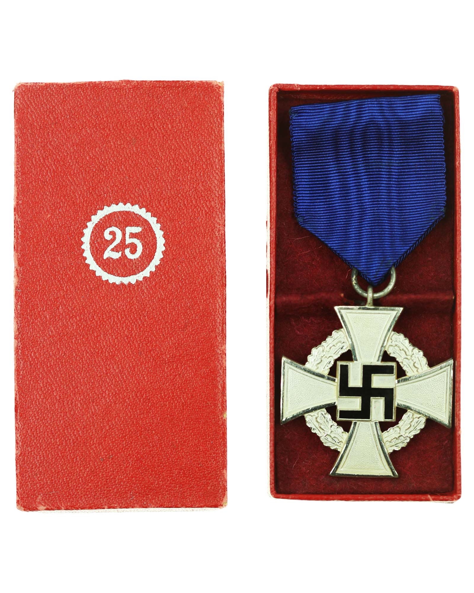 Treuedienst Ehrenzeichen 2. Stufe für 25 Jahre. Verleihungszeitraum 1938 - 1945. Buntmetall versilbert. Rückseite mit Inschrift: "Für Treue Dienste". Etui mit Hersteller Wächter & Lange Mittweida. Gesamtgewicht 36 g, Mutterkreuz: 21 g. Abmessungen: 41,19 x 41,18 mm.