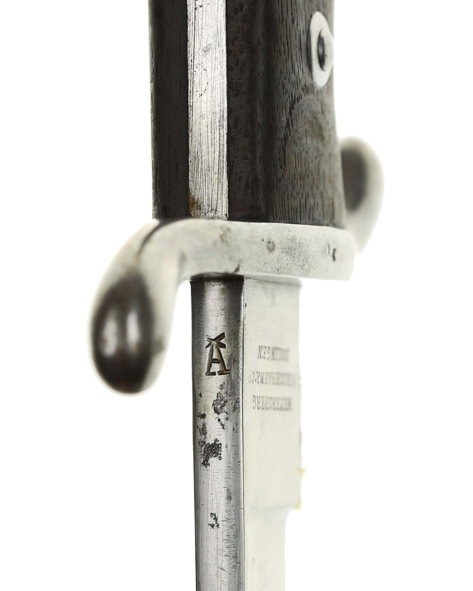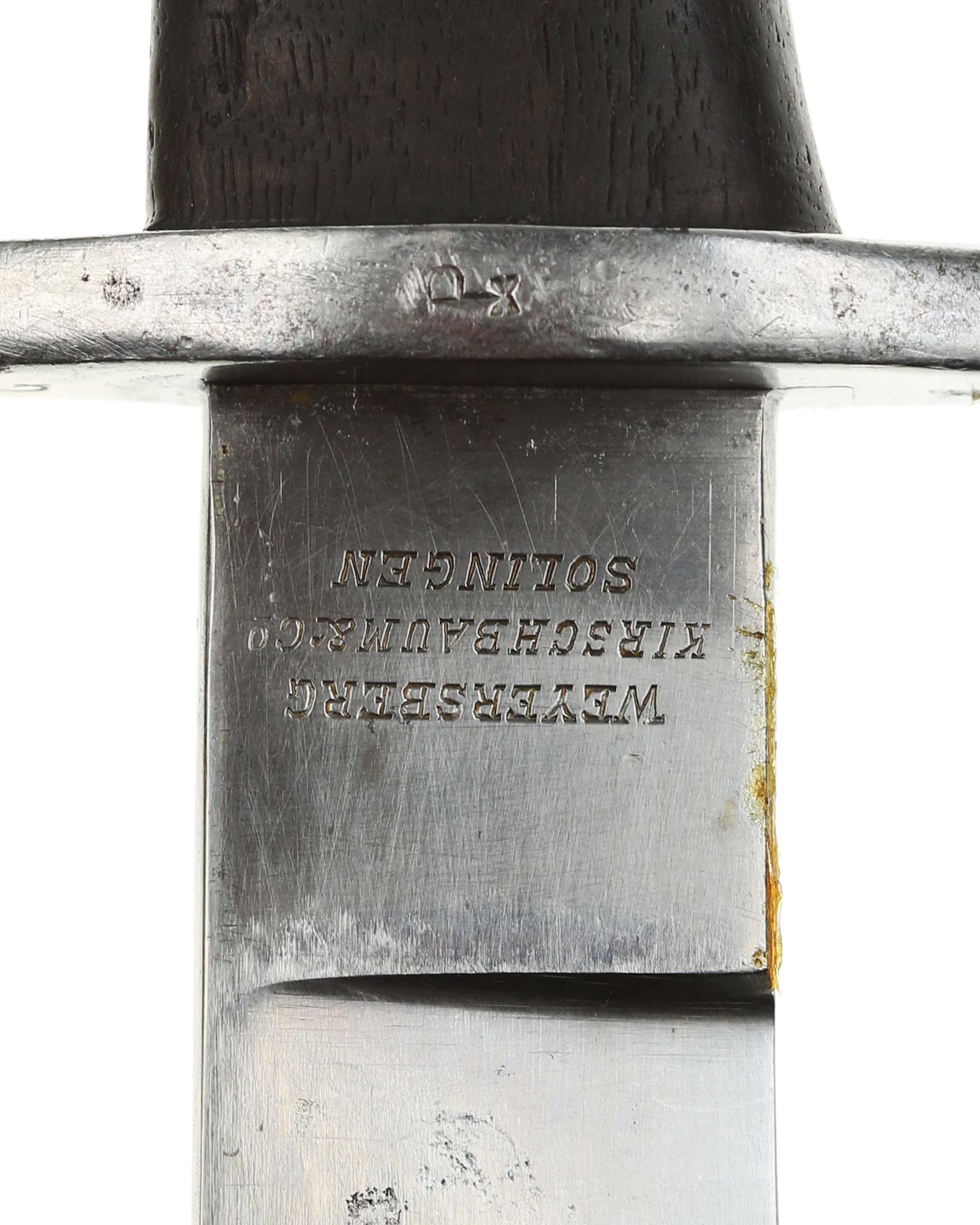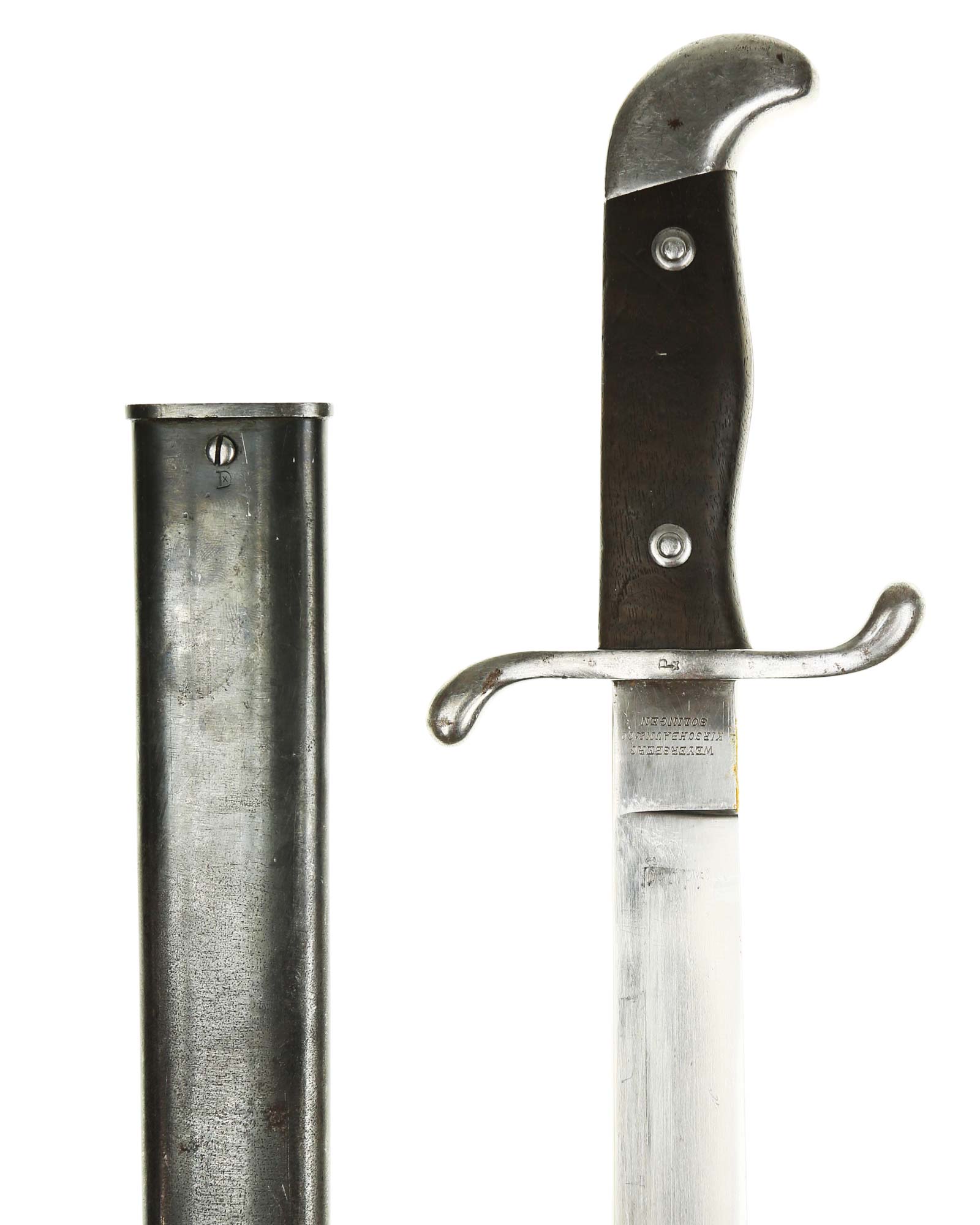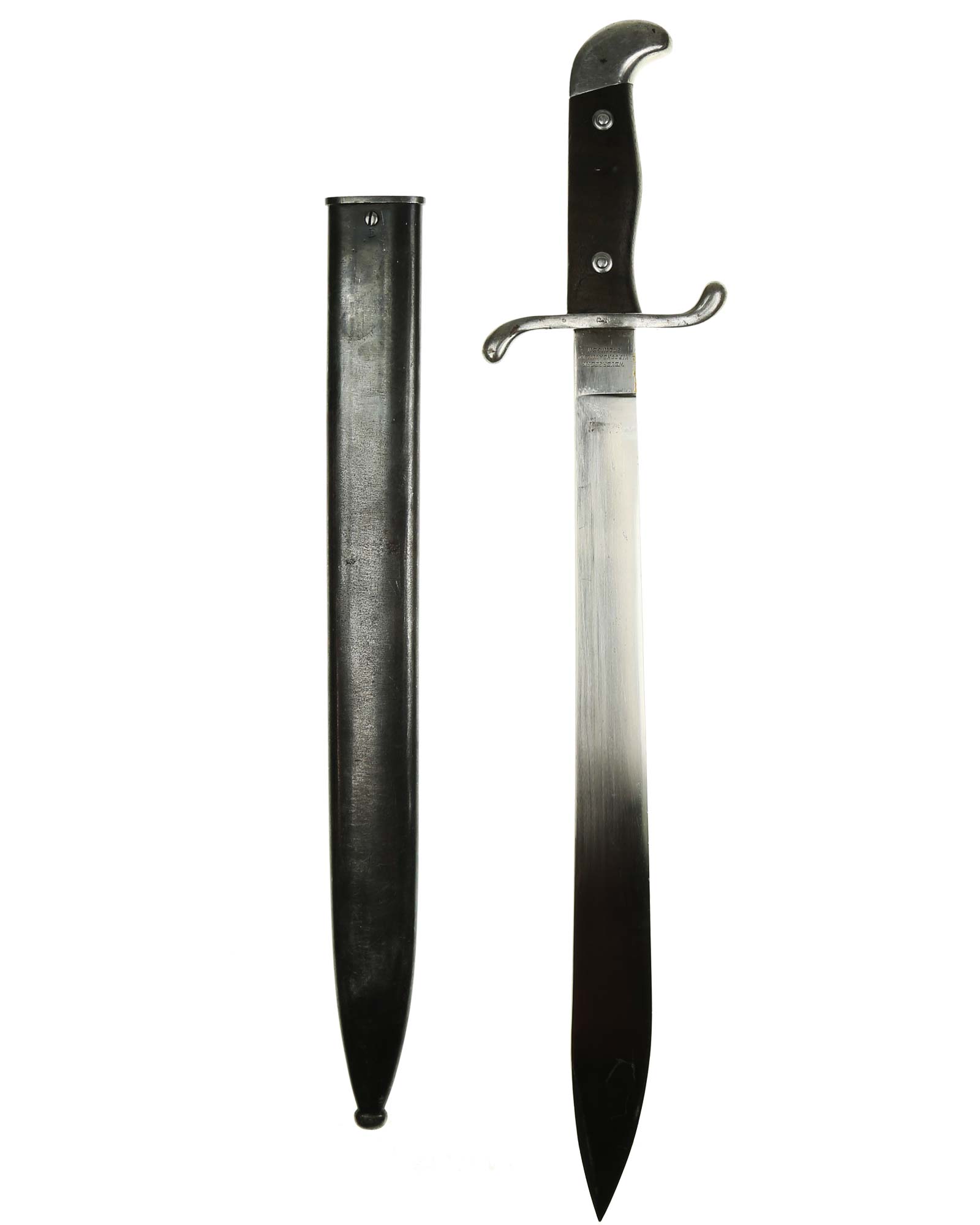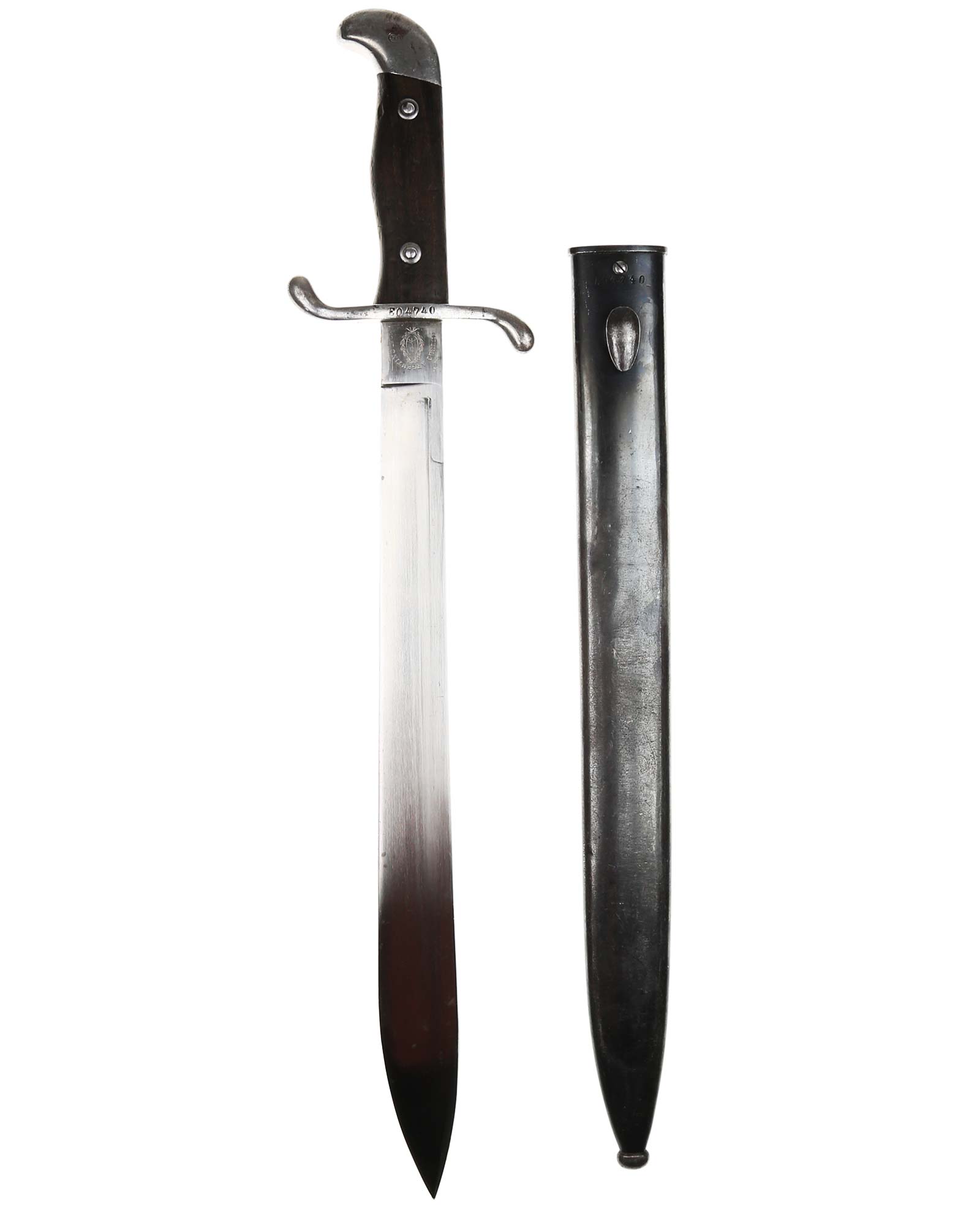 Argentinische Machete 1909 Modelo Argentino, hergestellt in Deutschland bei Weyersberg Kirschbaum Co. in Solingen. Parierstange ist aus Stahl und in beide Richtungen gerichtet mit Nummer: E04740. Die Klinge ist gerade, einschneidig, auf der Vorderseite mit Logo: Modelo Argentino 1909. Die Rückseite ist mit WKC Herstellerlogo: Weyersberg Kirschbaum & Co. Solingen. Die Scheide ist brüniert und nummerngleich (E04740). Gesamtlänge beträgt 52,5 cm.