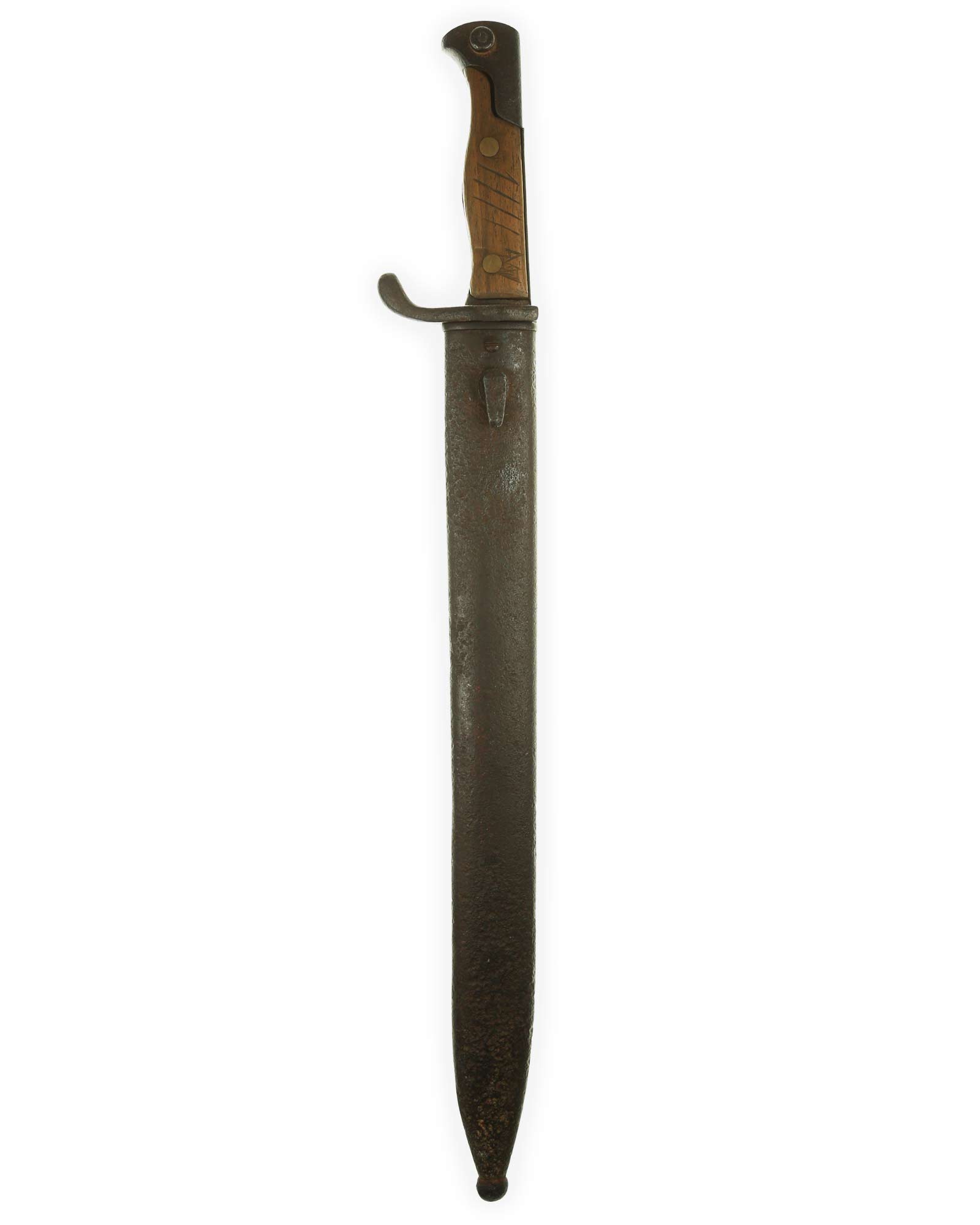 Preußen, Seitengewehr 98/05 n.A. mit dem Hersteller: Frister & Rossmann Berlin. Griff mit zwei Holzgriffschalen, zweifach verschraubt. Stahlblechscheide, mit Abnahmestempel auf Klinge. Die Scheide ist aus Stahl.