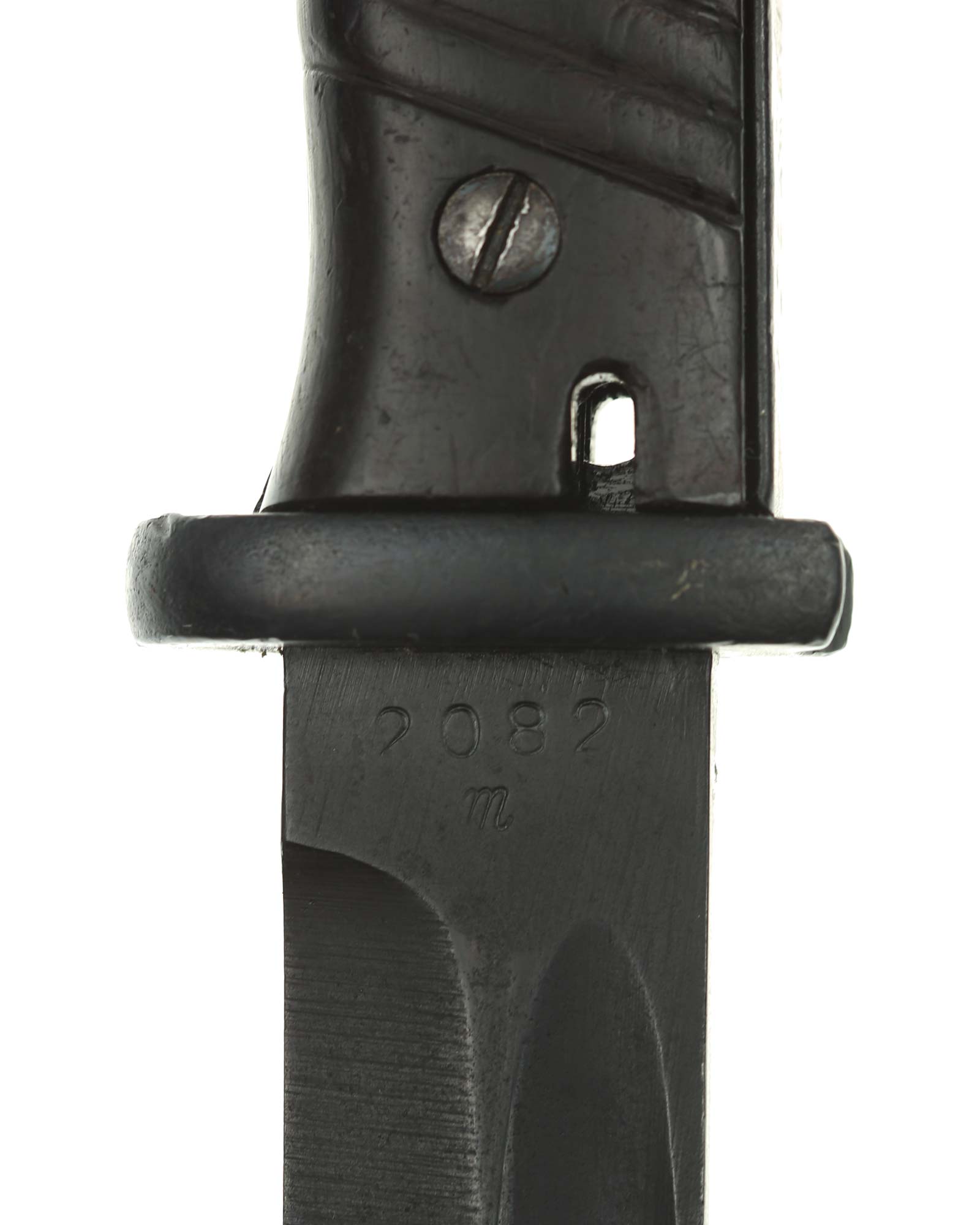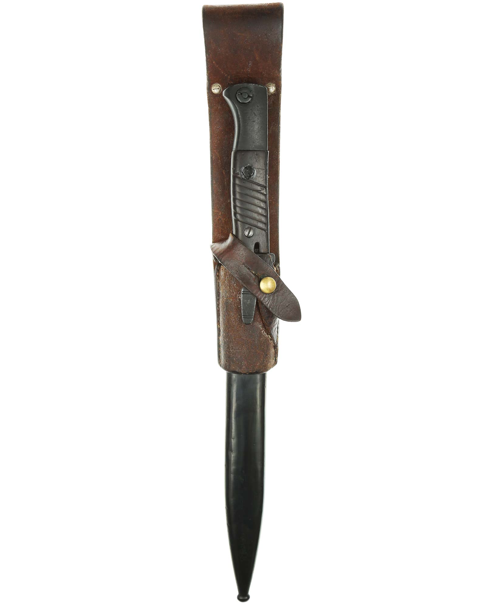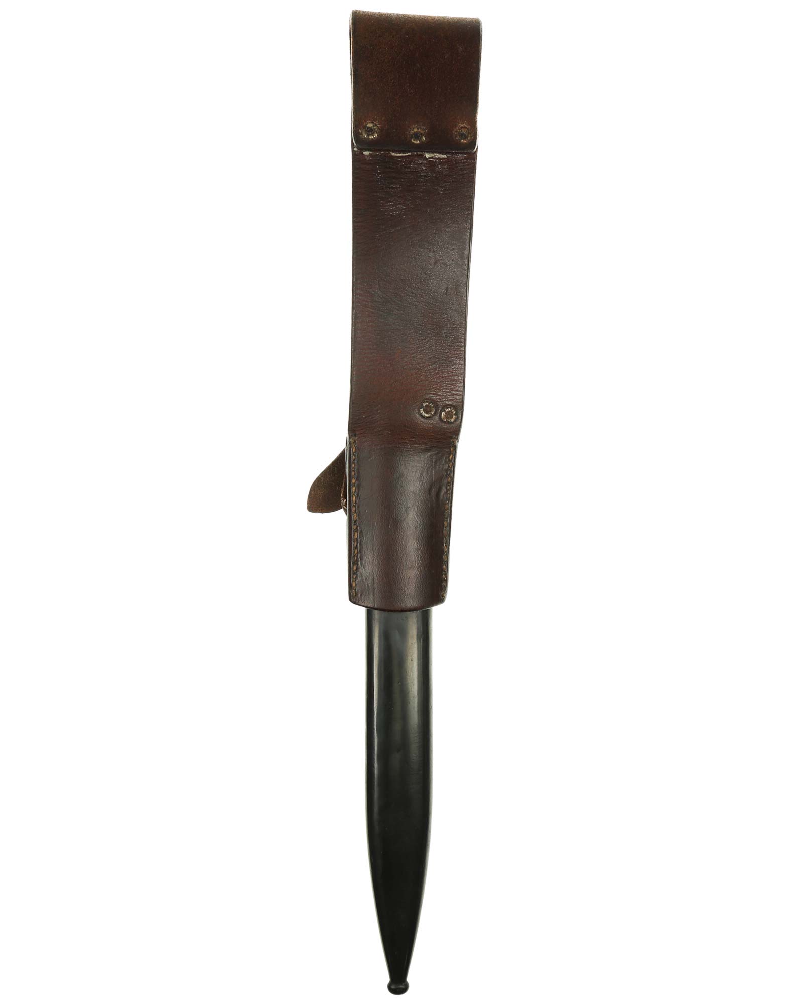 Seitengewehr 84/98 mit Leder-Koppelschuh. Griff mit schwarzbraunen Bakelit-Griffschalen, diese werden mit zwei Schrauben befestigt, eine Schraube wurde ausgetauscht. Druckknopf funktioniert einwandfrei, Griff mit Waffenamtstempel (WaA519). Die Klinge ist brüniert und einschneidig mit runden Hohlkehlen. Auf der Vorderseite der Klinge ist die Nummer (2082 m) eingeschlagen, Rückseite mit Herstellercode: 42asw (E. & F. Hörster Solingen). Brünierte Stahlscheide mit Nummer (3289 d). Gesamtlänge beträgt 404 mm.
