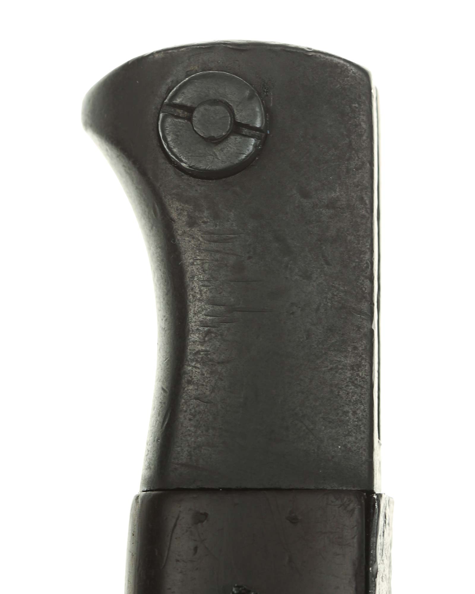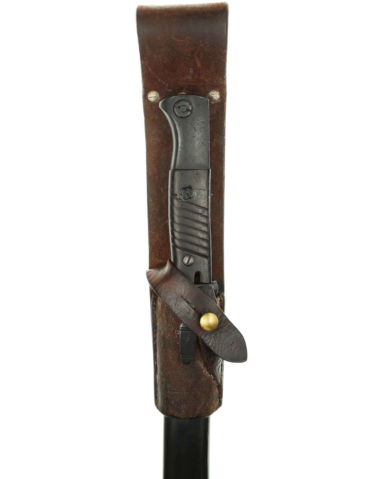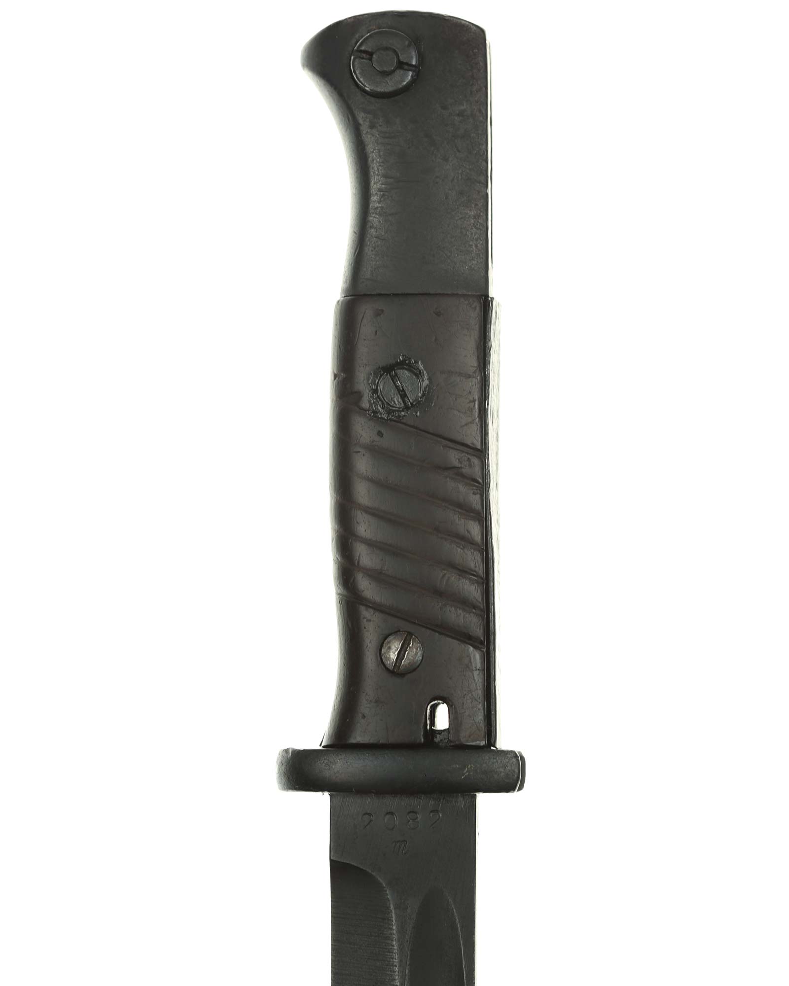 Seitengewehr 84/98 mit Leder-Koppelschuh. Griff mit schwarzbraunen Bakelit-Griffschalen, diese werden mit zwei Schrauben befestigt, eine Schraube wurde ausgetauscht. Druckknopf funktioniert einwandfrei, Griff mit Waffenamtstempel (WaA519). Die Klinge ist brüniert und einschneidig mit runden Hohlkehlen. Auf der Vorderseite der Klinge ist die Nummer (2082 m) eingeschlagen, Rückseite mit Herstellercode: 42asw (E. & F. Hörster Solingen). Brünierte Stahlscheide mit Nummer (3289 d). Gesamtlänge beträgt 404 mm.