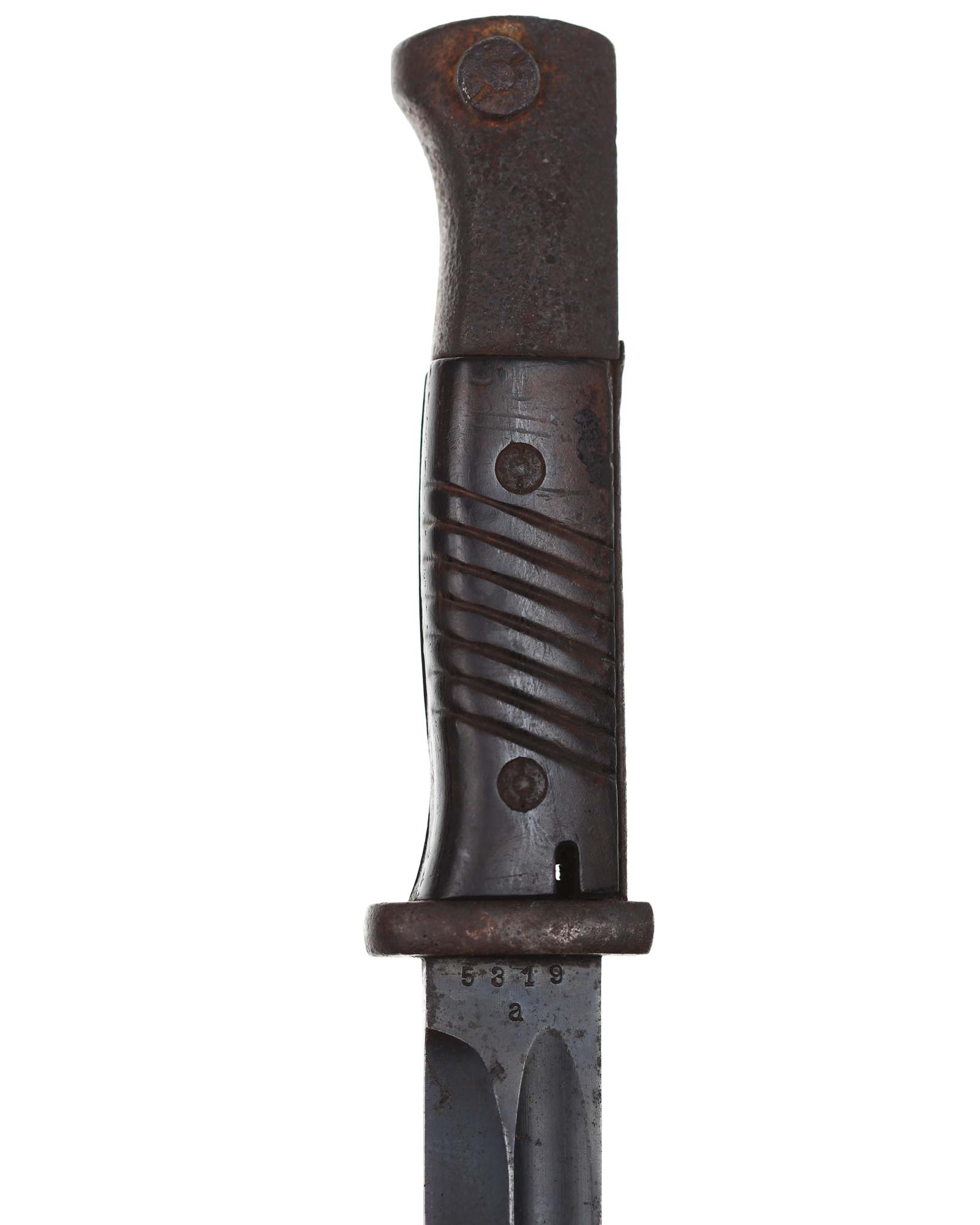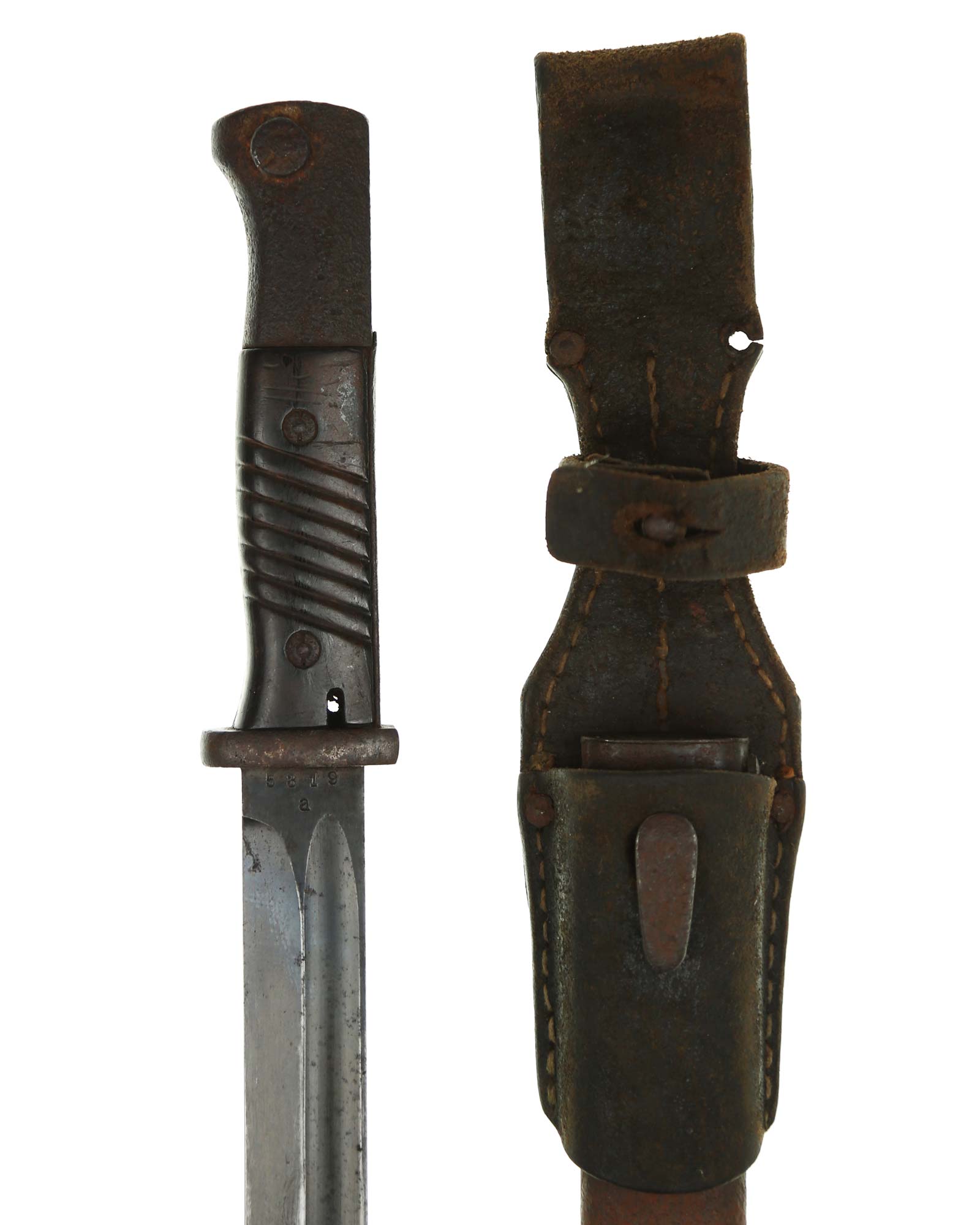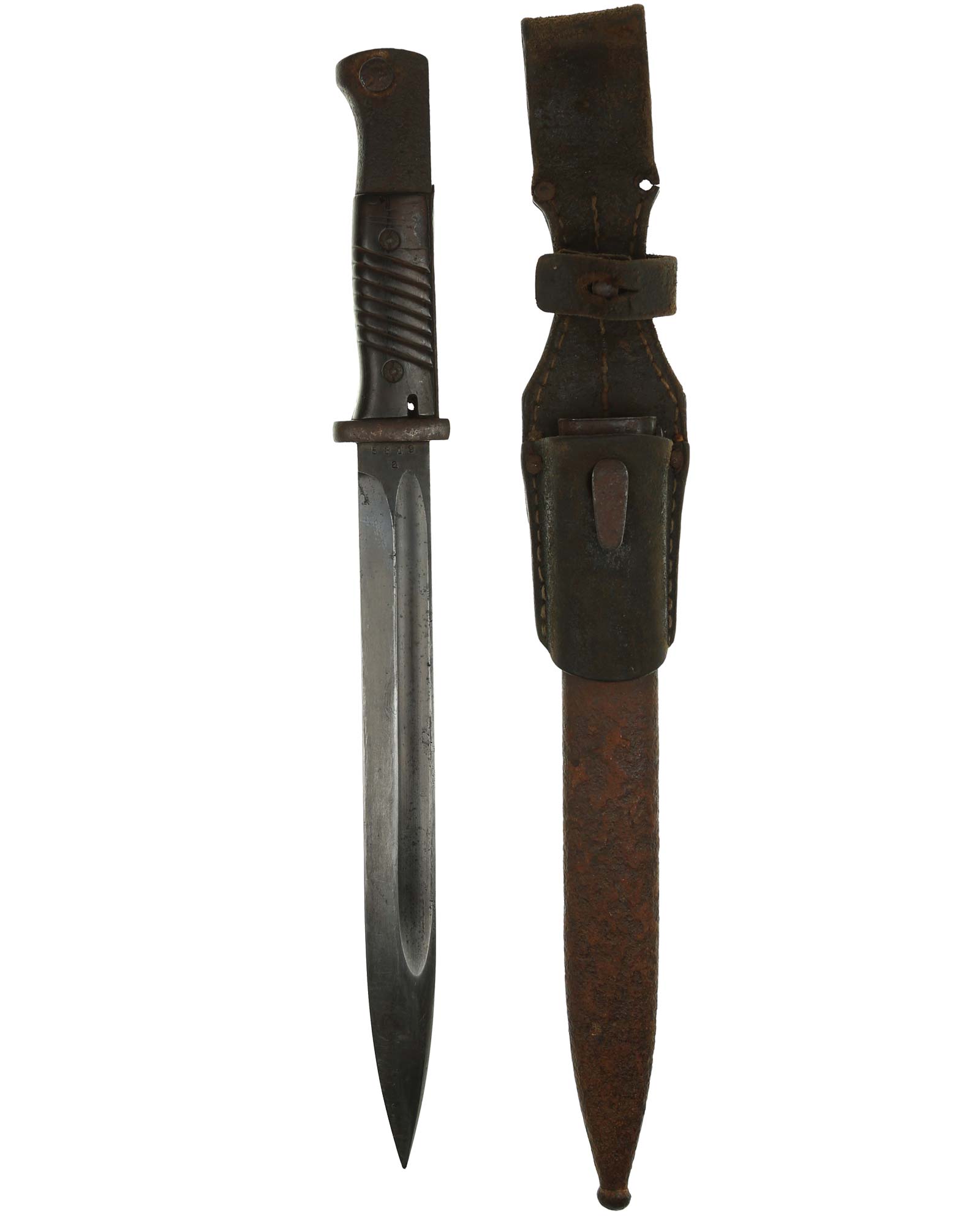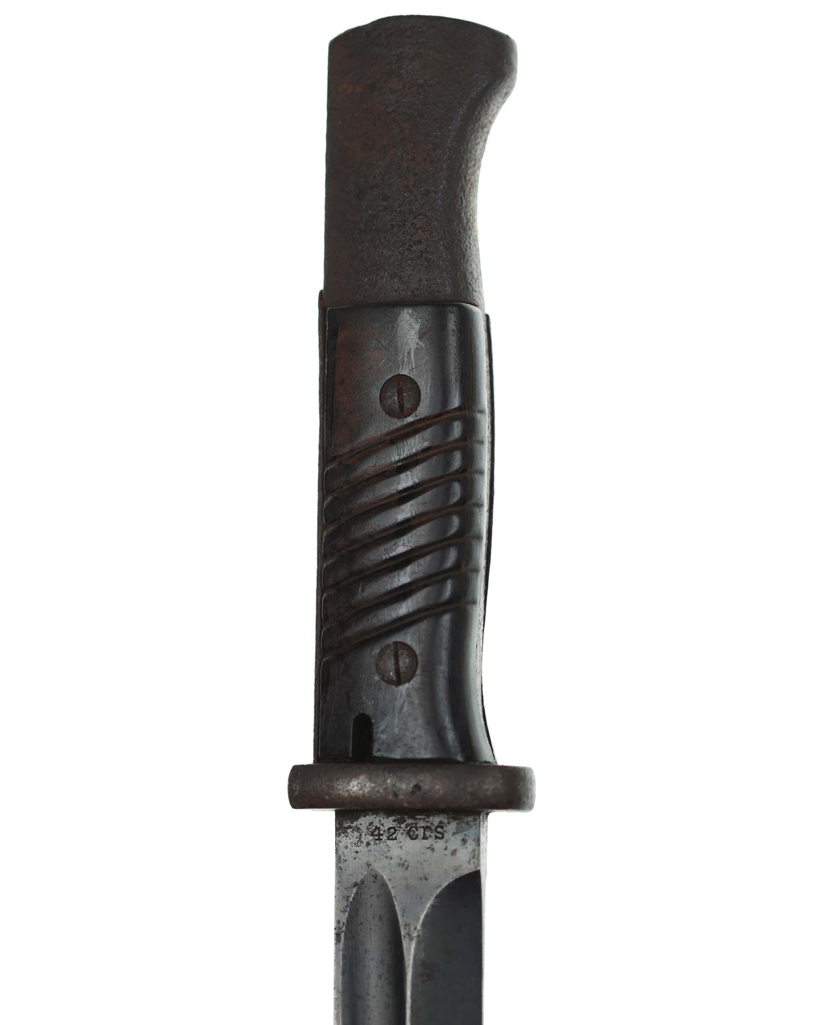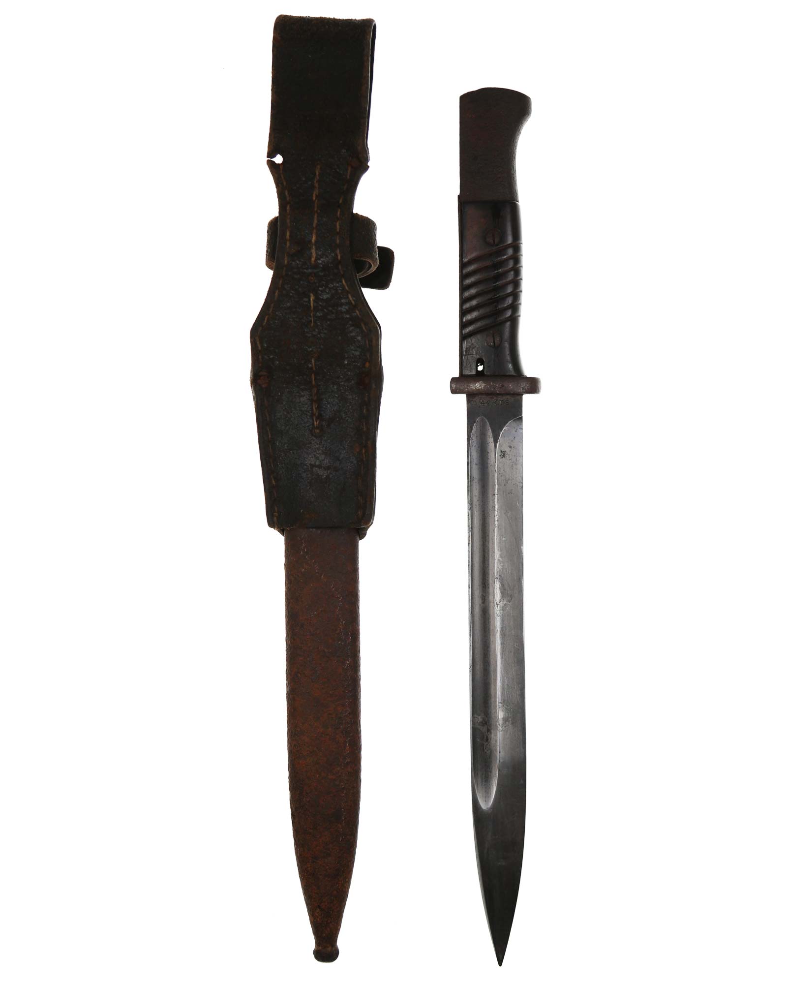 Seitengewehr 84/98 mit Leder-Koppelschuh. Griff mit schwarzbraunen Bakelit-Griffschalen, diese werden mit zwei Schrauben befestigt. Die Klinge ist brüniert und einschneidig mit runden Hohlkehlen. Auf der Vorderseite der Klinge ist die Nummer (5319 a) eingeschlagen, Rückseite mit Herstellercode: CRS 42 (Paul Weyersberg Solingen).