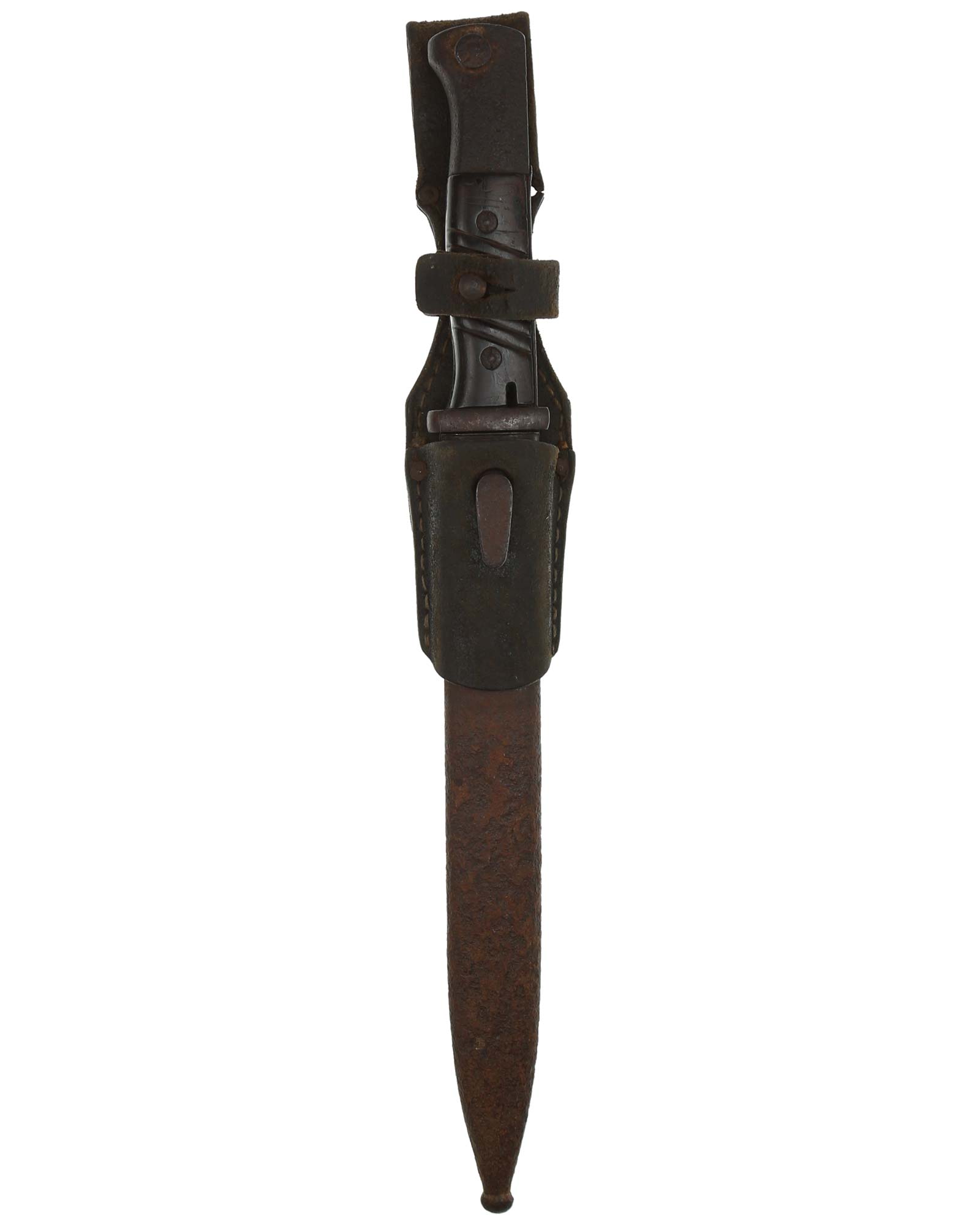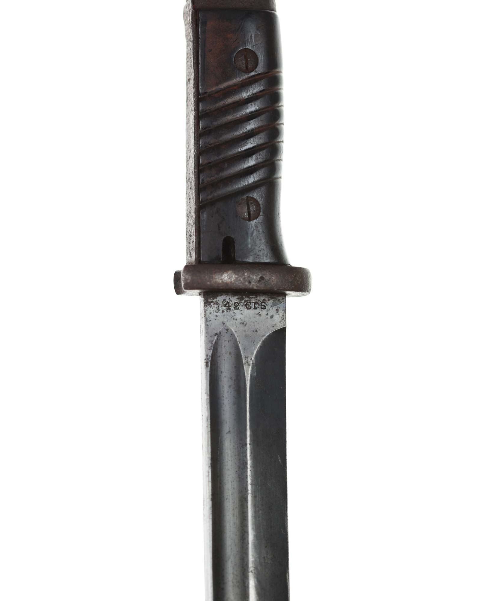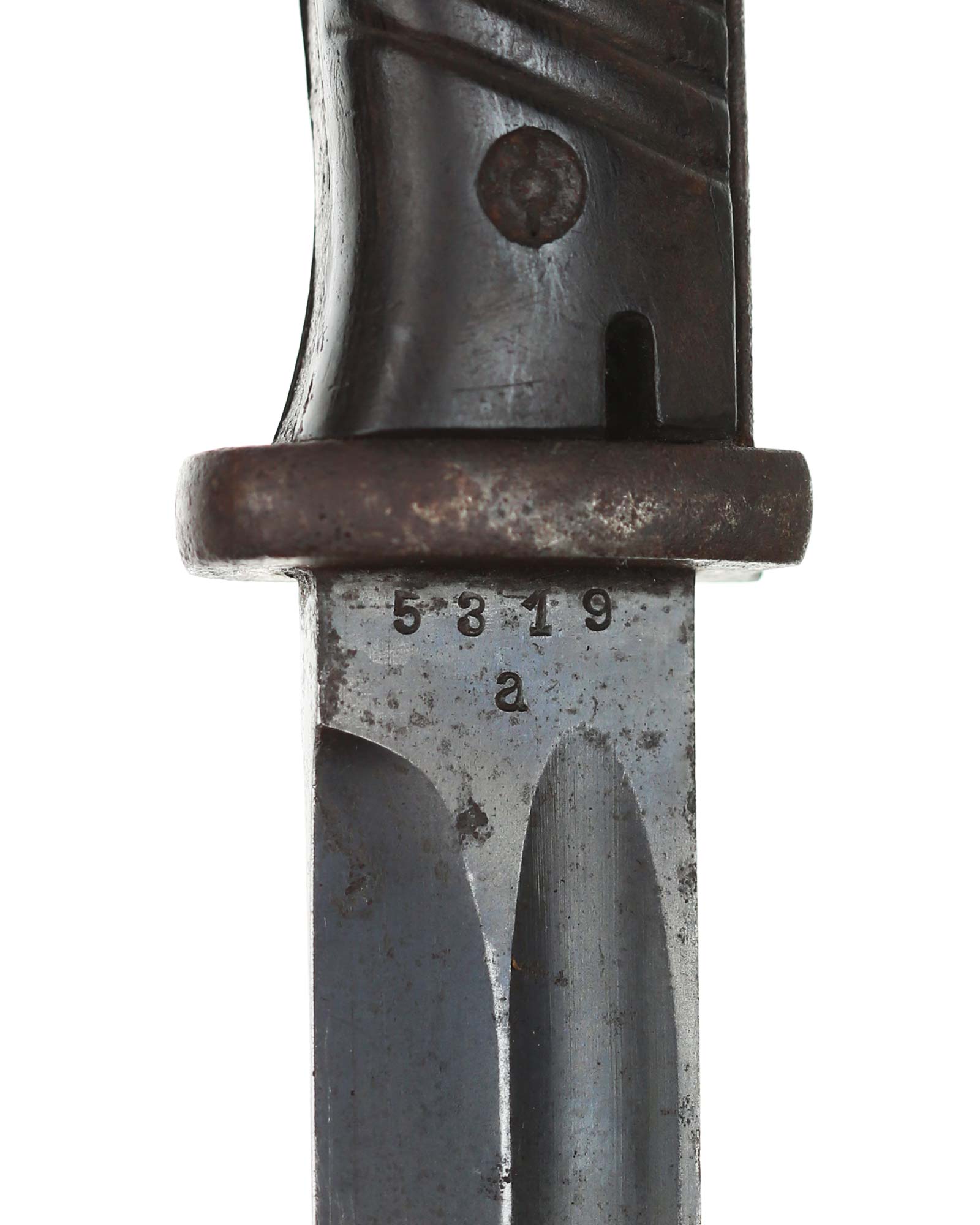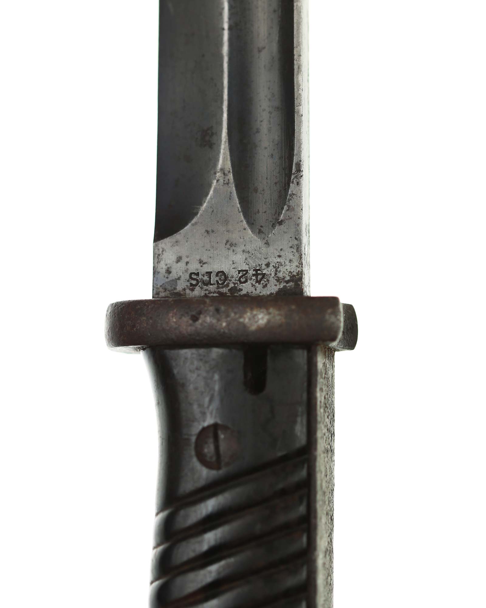 Seitengewehr 84/98 mit Leder-Koppelschuh. Griff mit schwarzbraunen Bakelit-Griffschalen, diese werden mit zwei Schrauben befestigt. Die Klinge ist brüniert und einschneidig mit runden Hohlkehlen. Auf der Vorderseite der Klinge ist die Nummer (5319 a) eingeschlagen, Rückseite mit Herstellercode: CRS 42 (Paul Weyersberg Solingen).