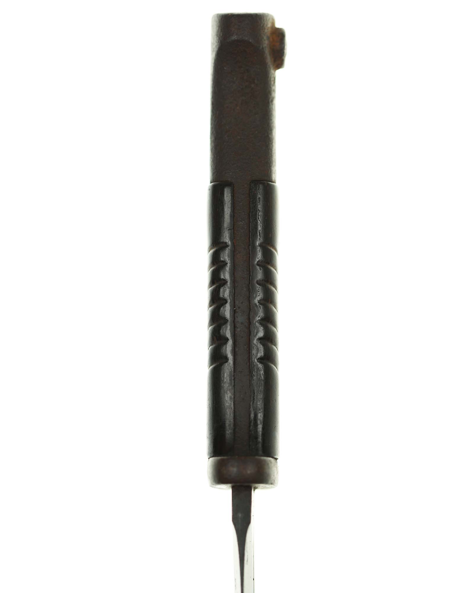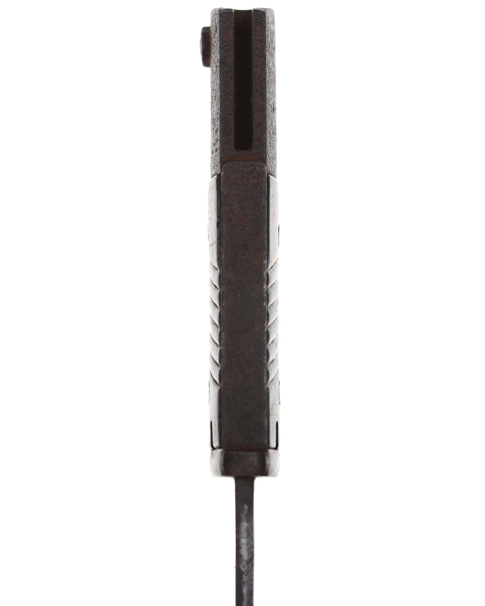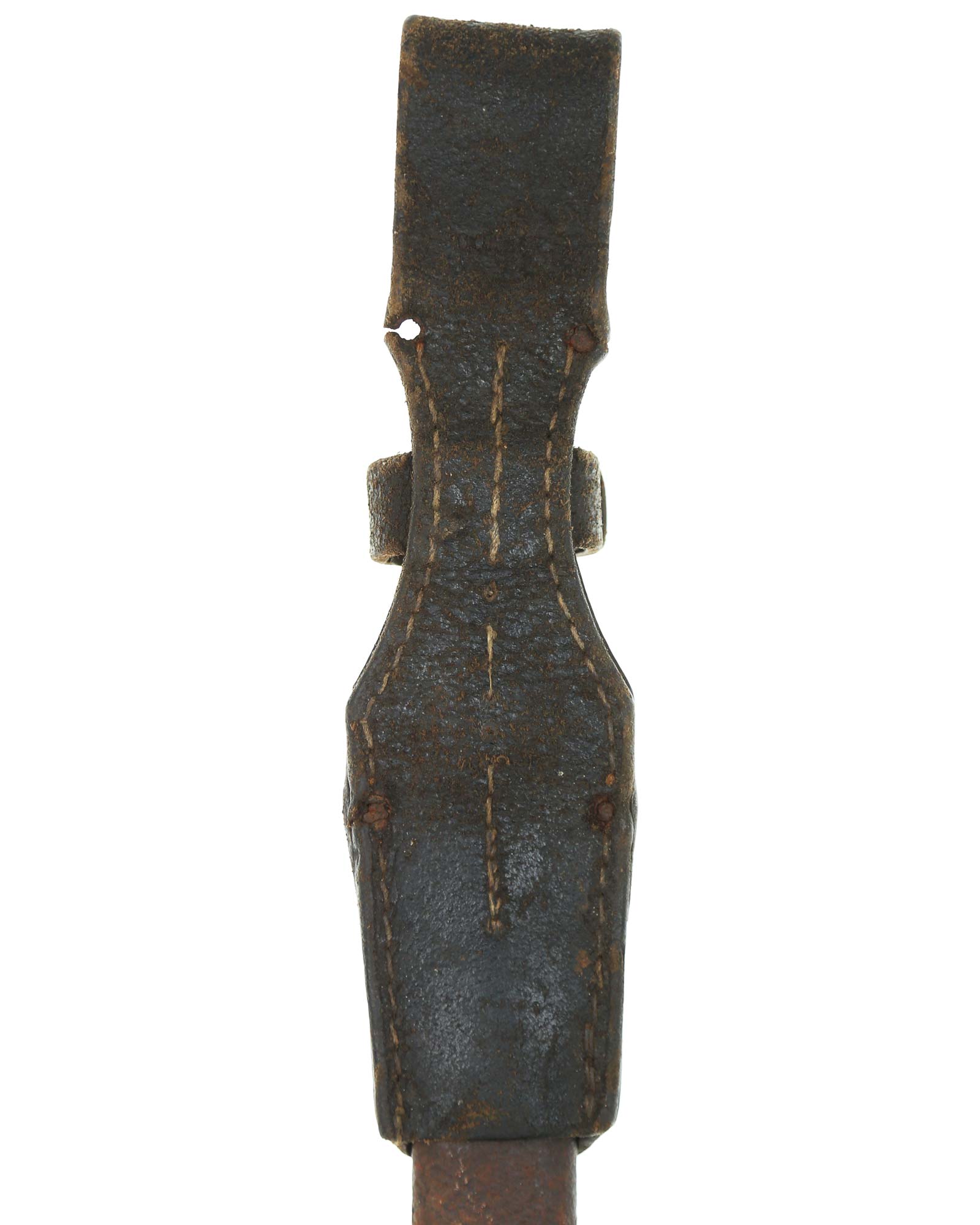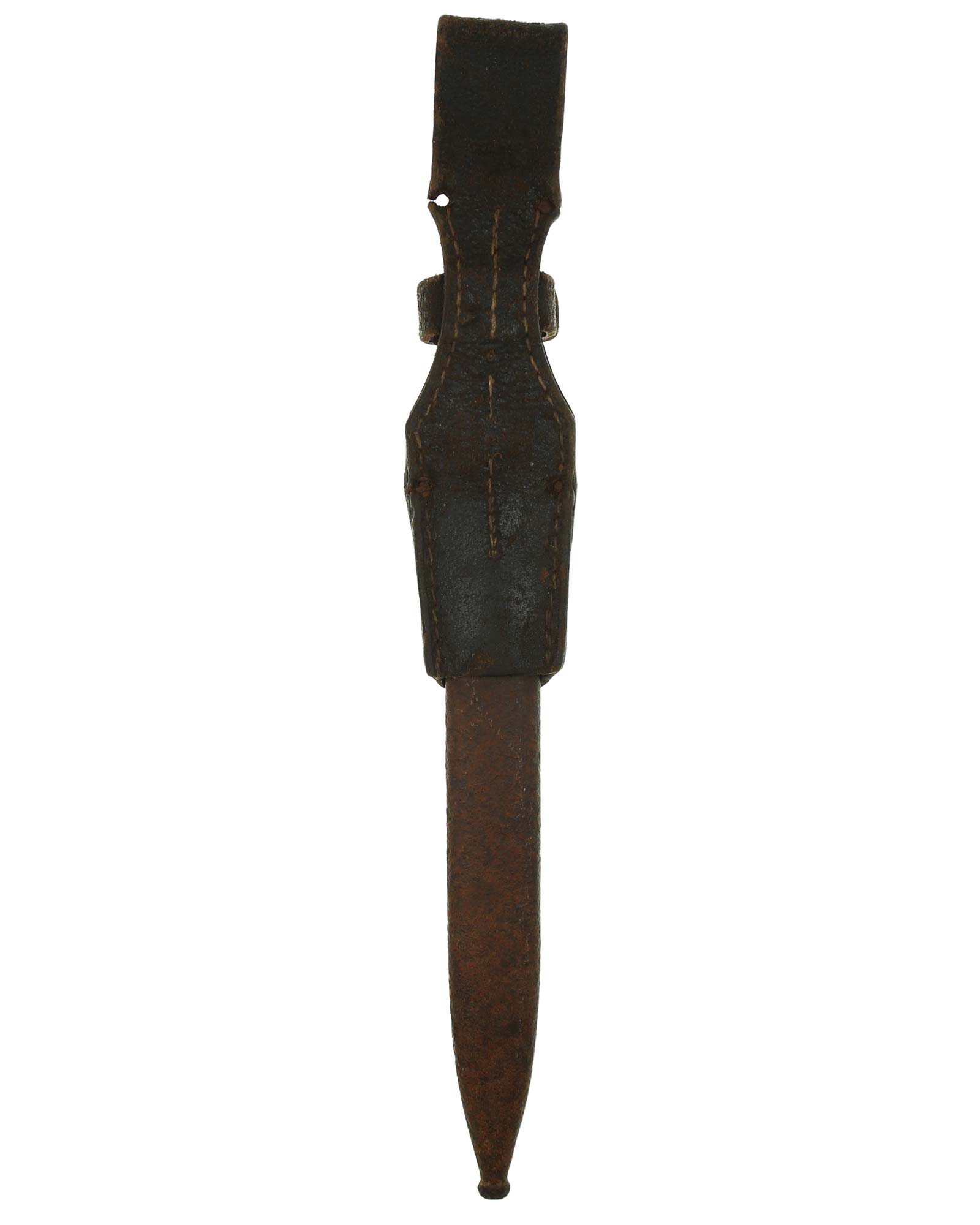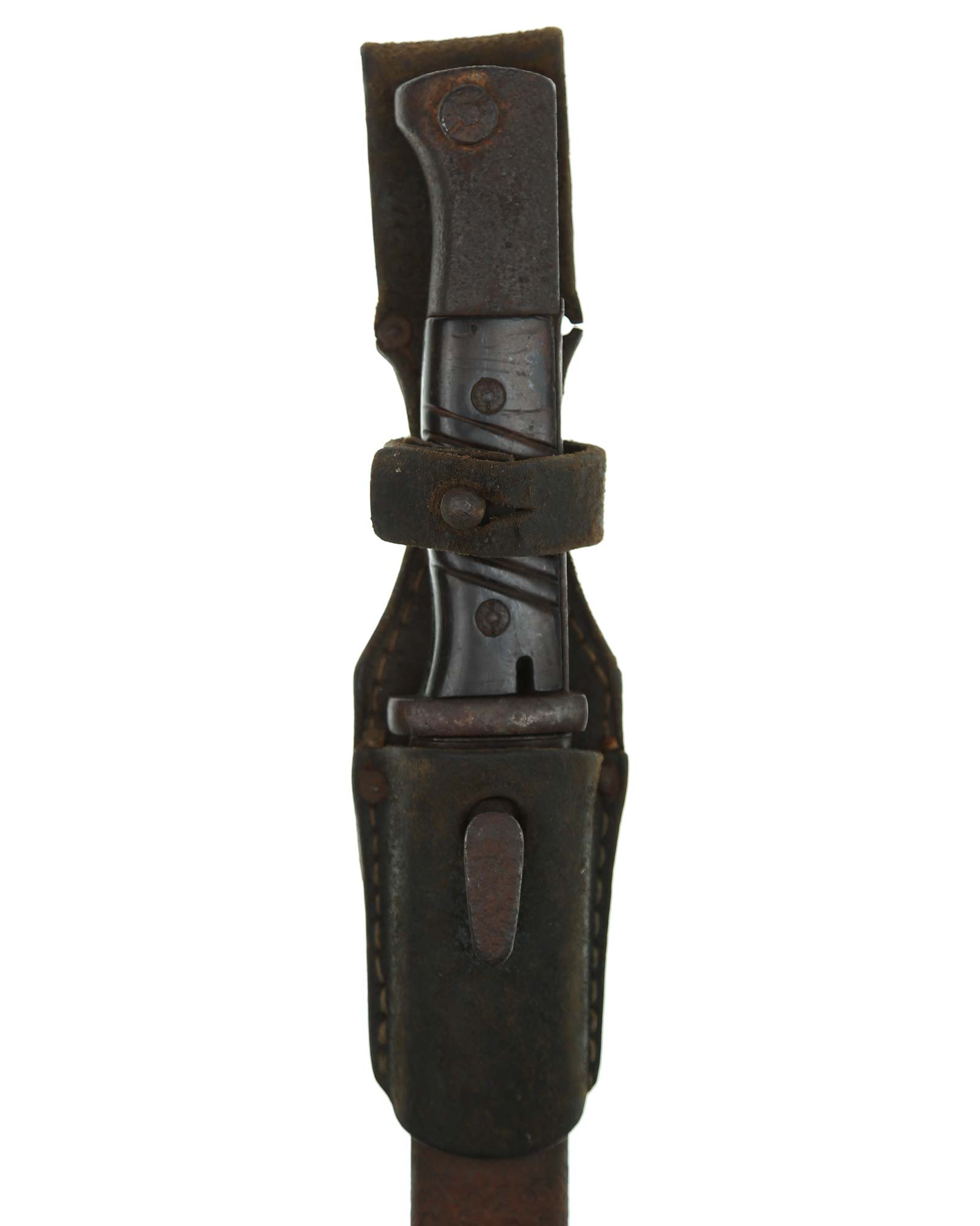 Seitengewehr 84/98 mit Leder-Koppelschuh. Griff mit schwarzbraunen Bakelit-Griffschalen, diese werden mit zwei Schrauben befestigt. Die Klinge ist brüniert und einschneidig mit runden Hohlkehlen. Auf der Vorderseite der Klinge ist die Nummer (5319 a) eingeschlagen, Rückseite mit Herstellercode: CRS 42 (Paul Weyersberg Solingen).