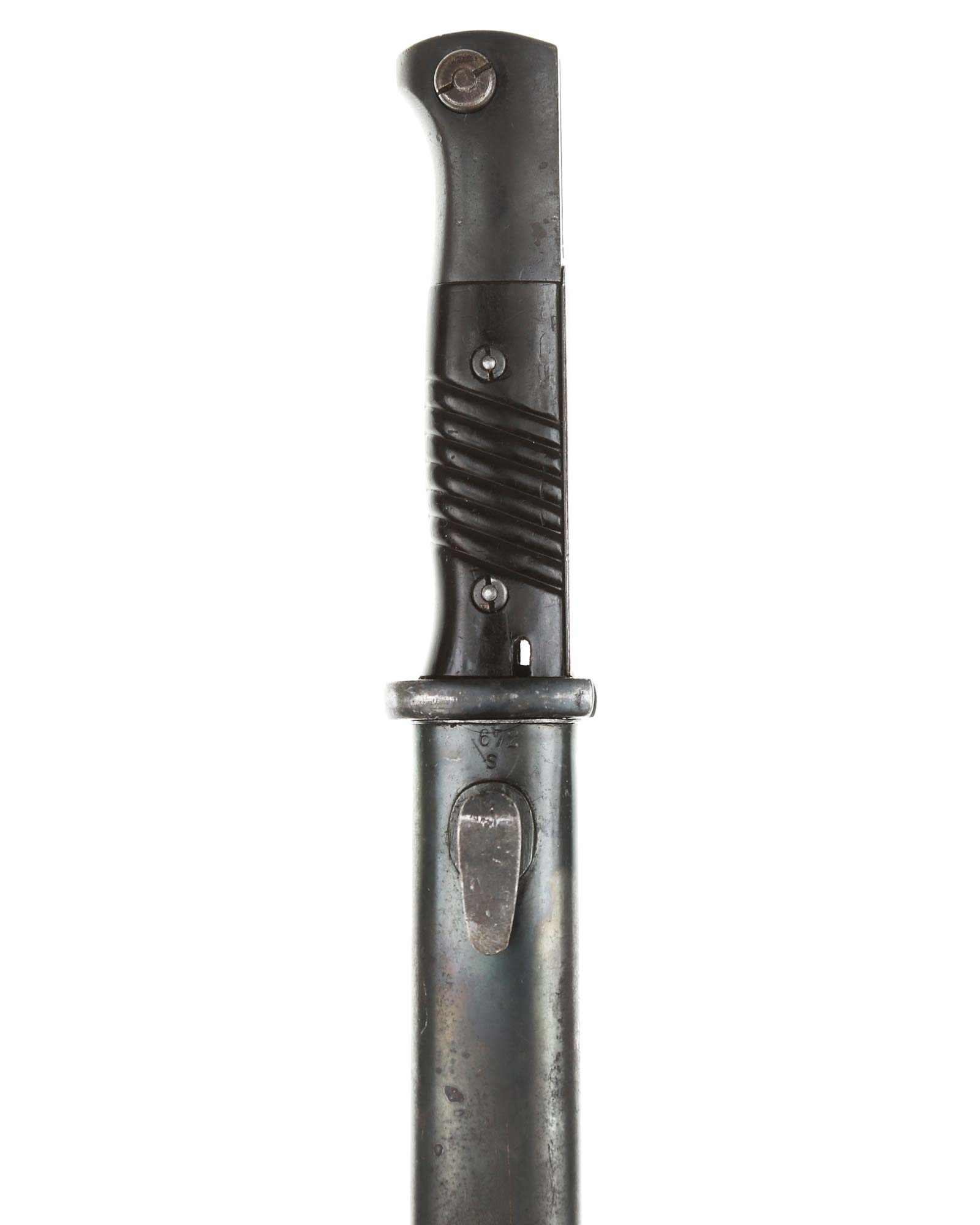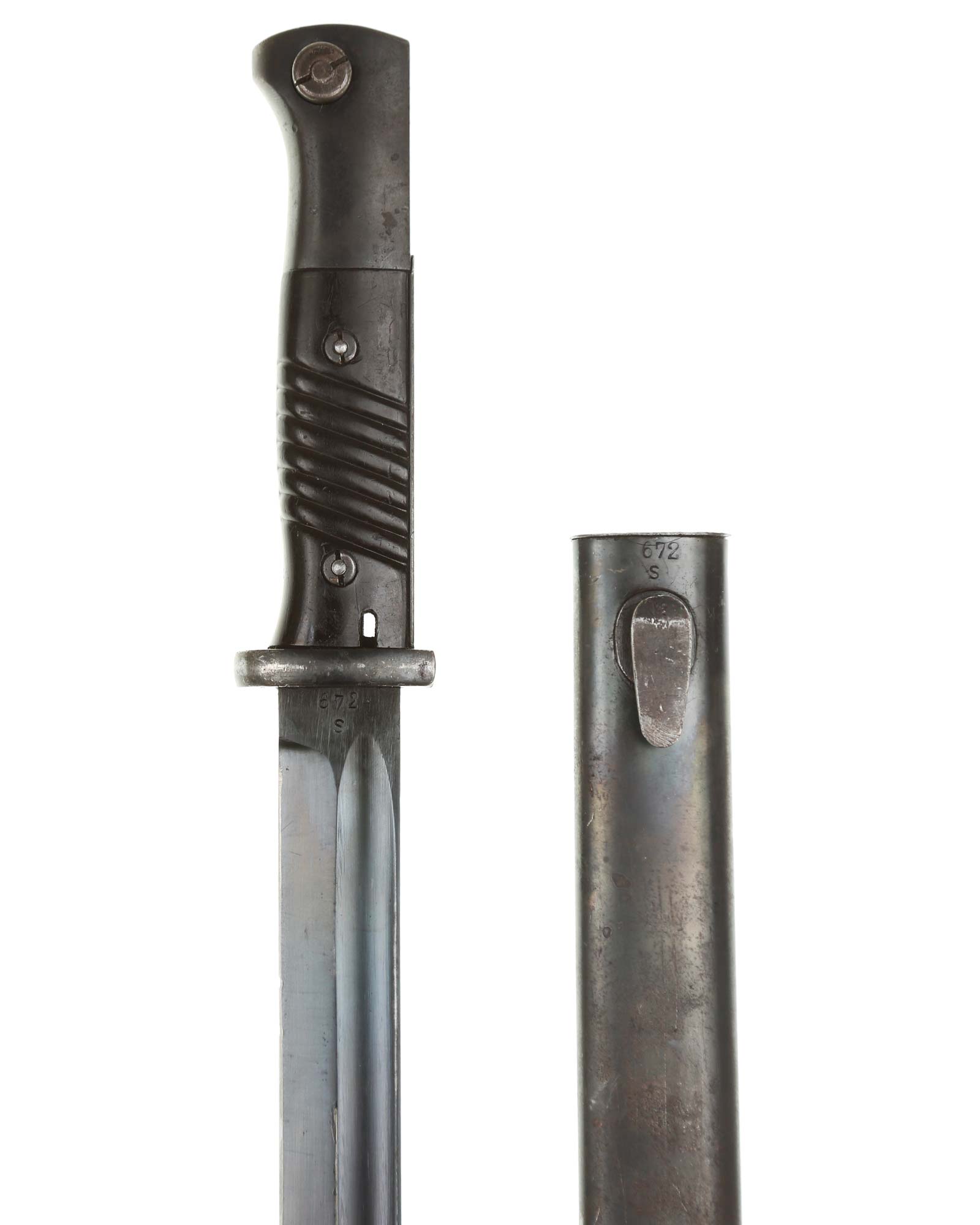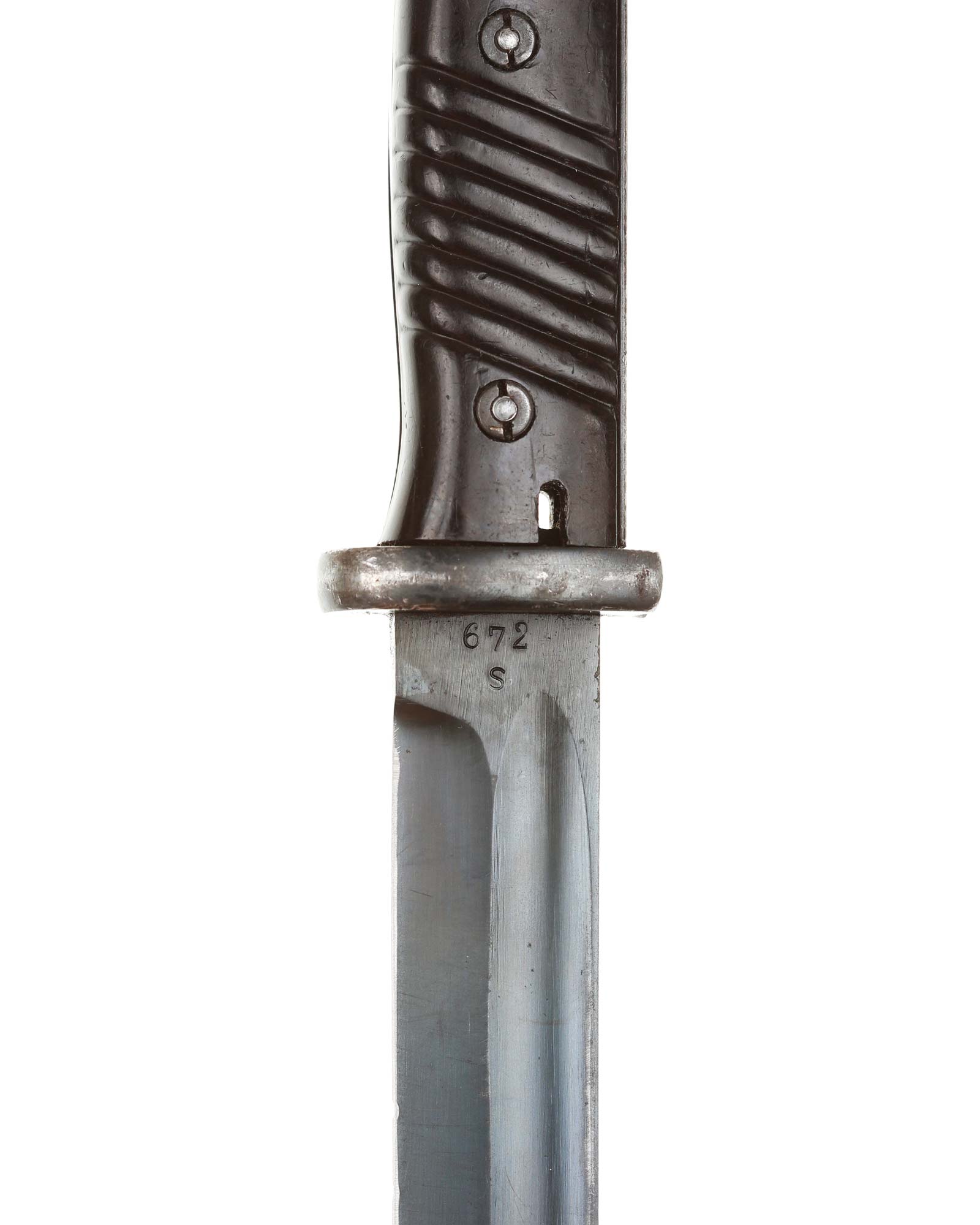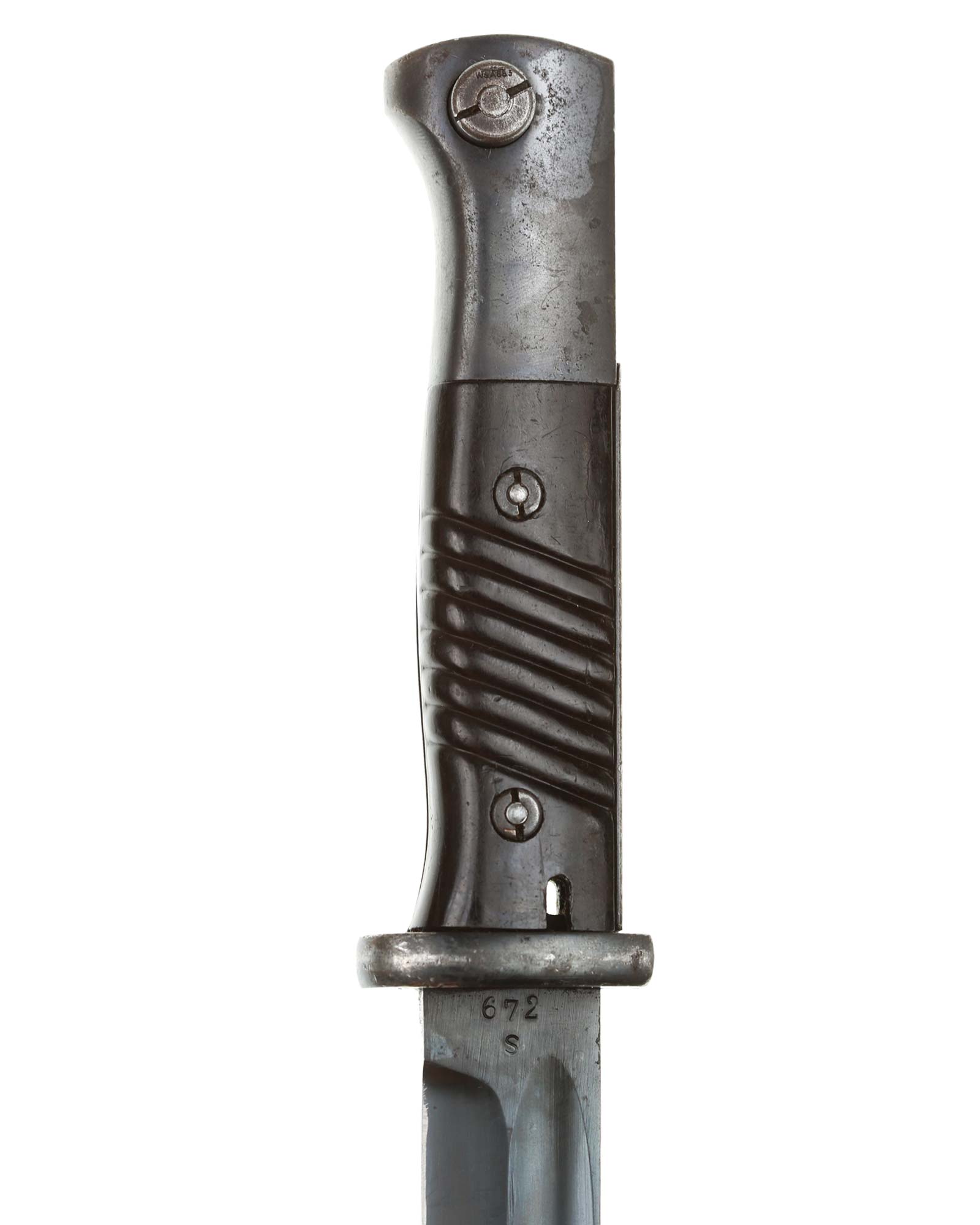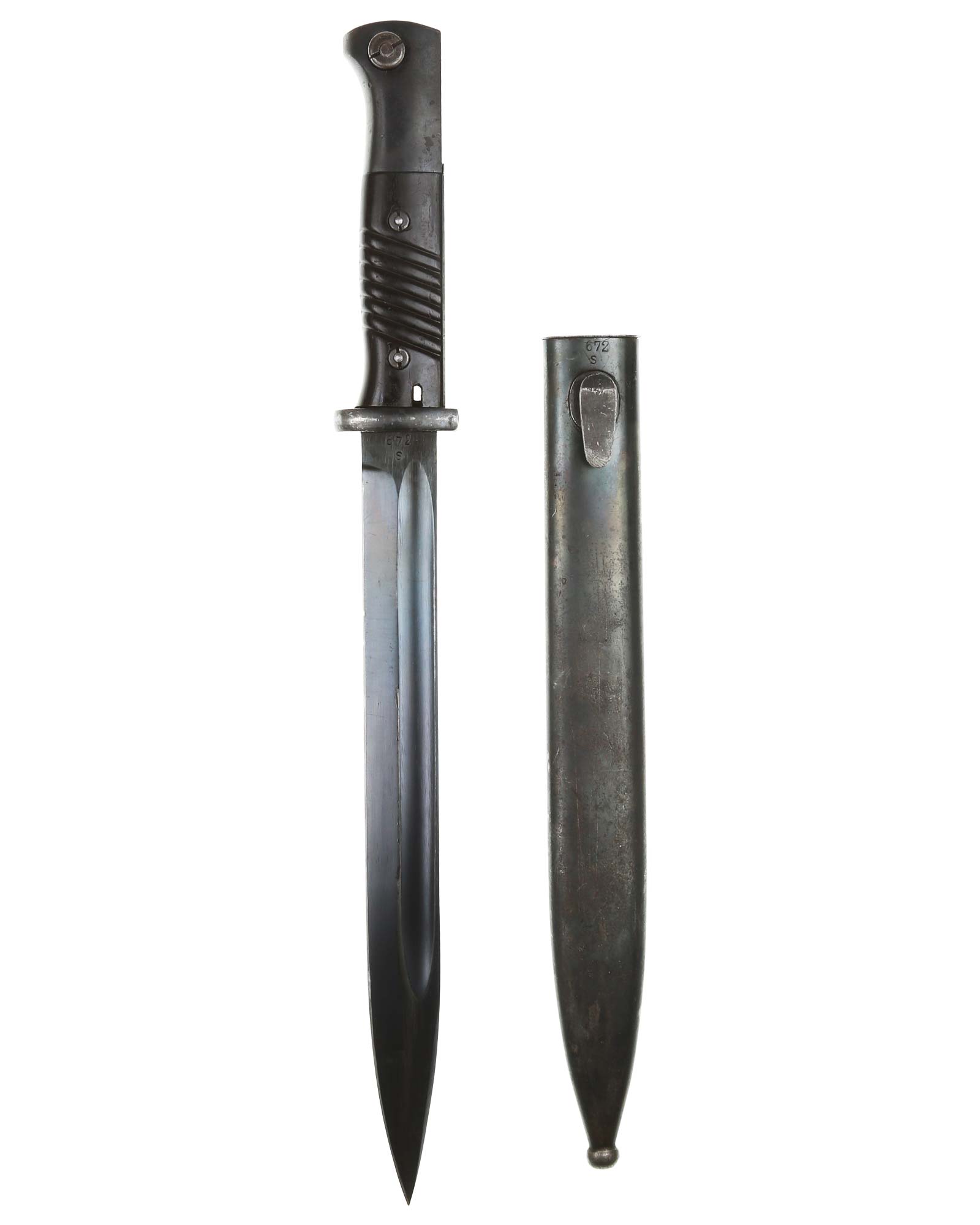Seitengewehr 84/98 nummerngleich mit der Scheide. Griff mit schwarzbraunen Bakelit-Griffschalen, diese werden mit zwei Schrauben befestigt. Druckknopf funktioniert einwandfrei. Die Klinge ist brüniert und einschneidig mit runden Hohlkehlen. Auf der Vorderseite der Klinge ist die Nummer (672 S) eingeschlagen, Rückseite mit Herstellermarkierung: 41crs (Paul Weyersberg & Solingen). Brünierte Stahlscheide. Gesamtlänge beträgt 406 mm.