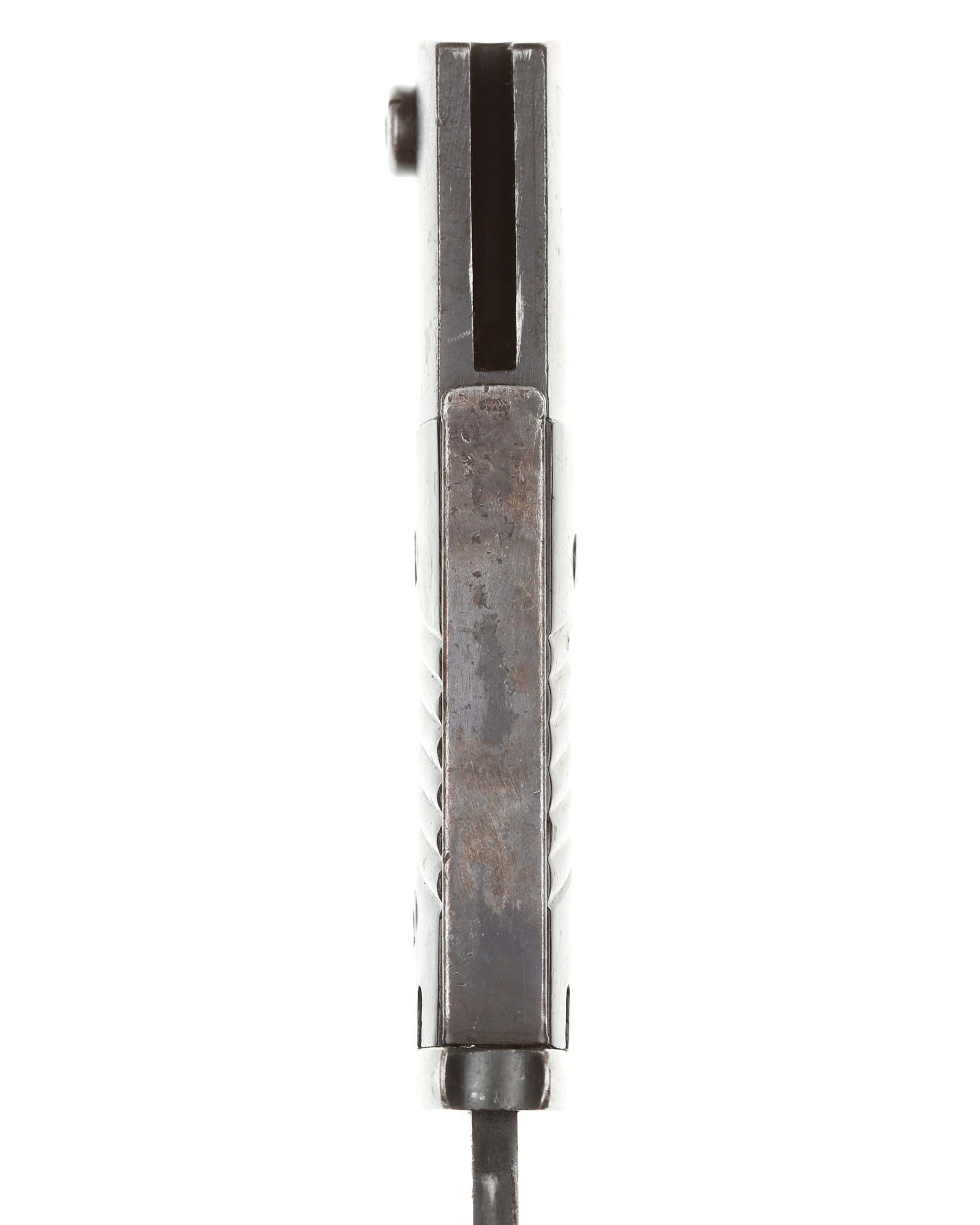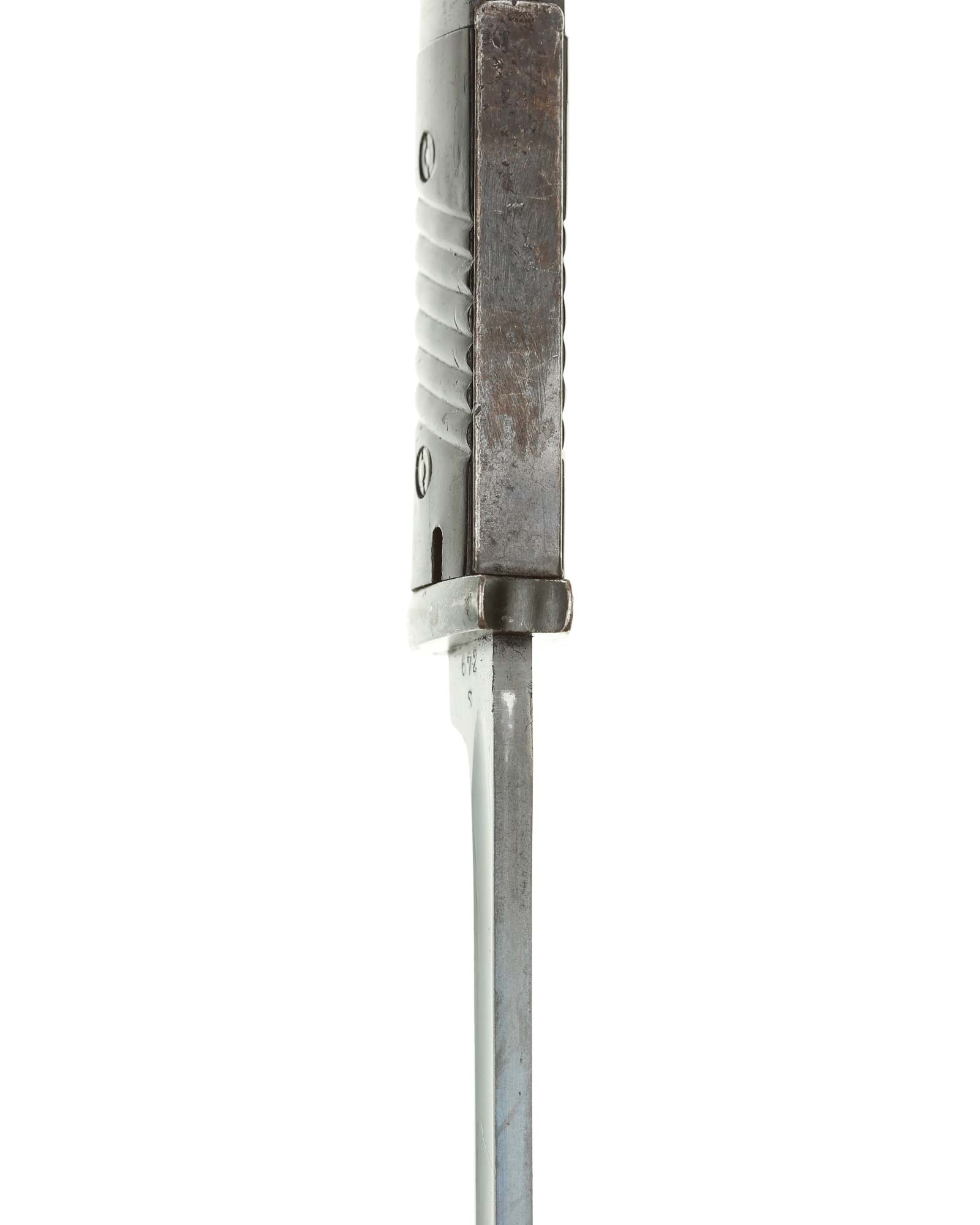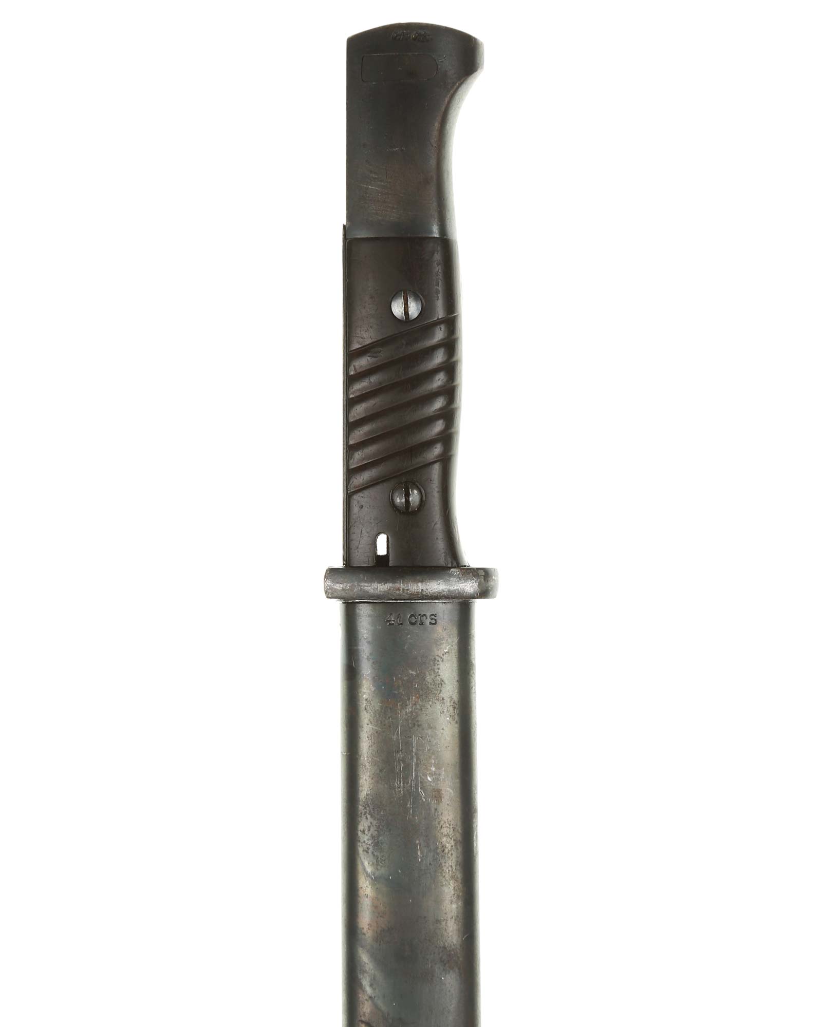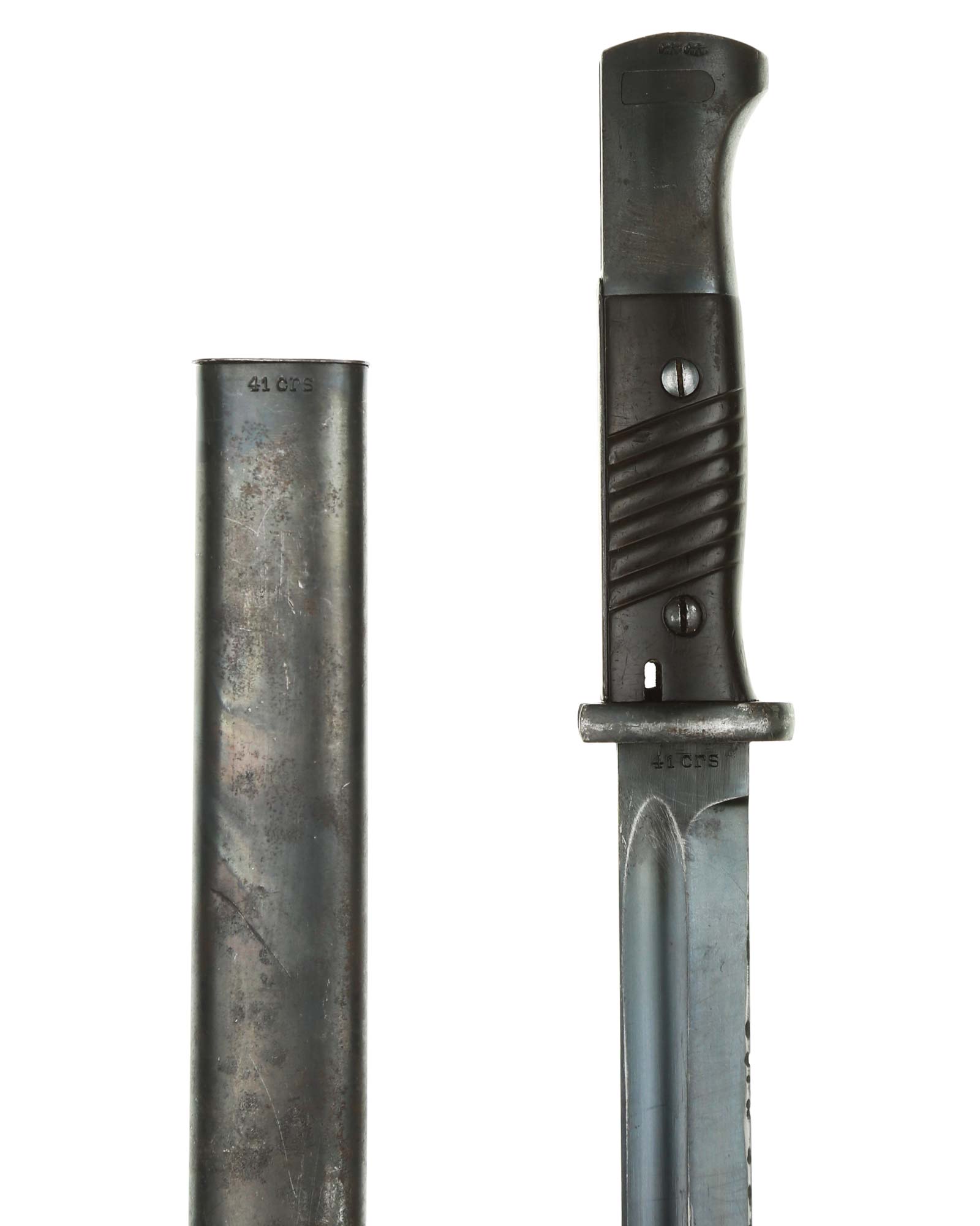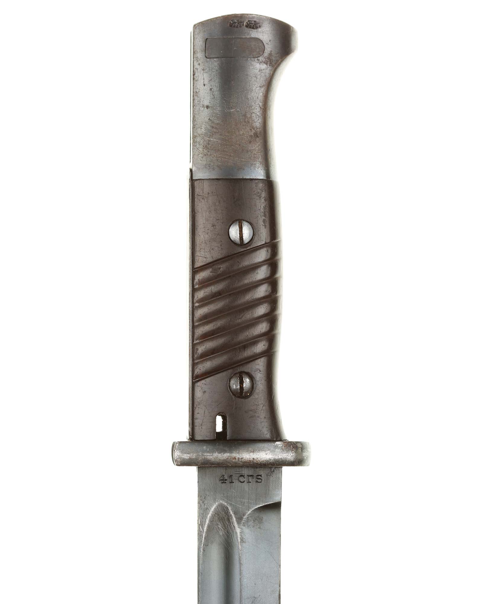 Seitengewehr 84/98 nummerngleich mit der Scheide. Griff mit schwarzbraunen Bakelit-Griffschalen, diese werden mit zwei Schrauben befestigt. Druckknopf funktioniert einwandfrei. Die Klinge ist brüniert und einschneidig mit runden Hohlkehlen. Auf der Vorderseite der Klinge ist die Nummer (672 S) eingeschlagen, Rückseite mit Herstellermarkierung: 41crs (Paul Weyersberg & Solingen). Brünierte Stahlscheide. Gesamtlänge beträgt 406 mm.