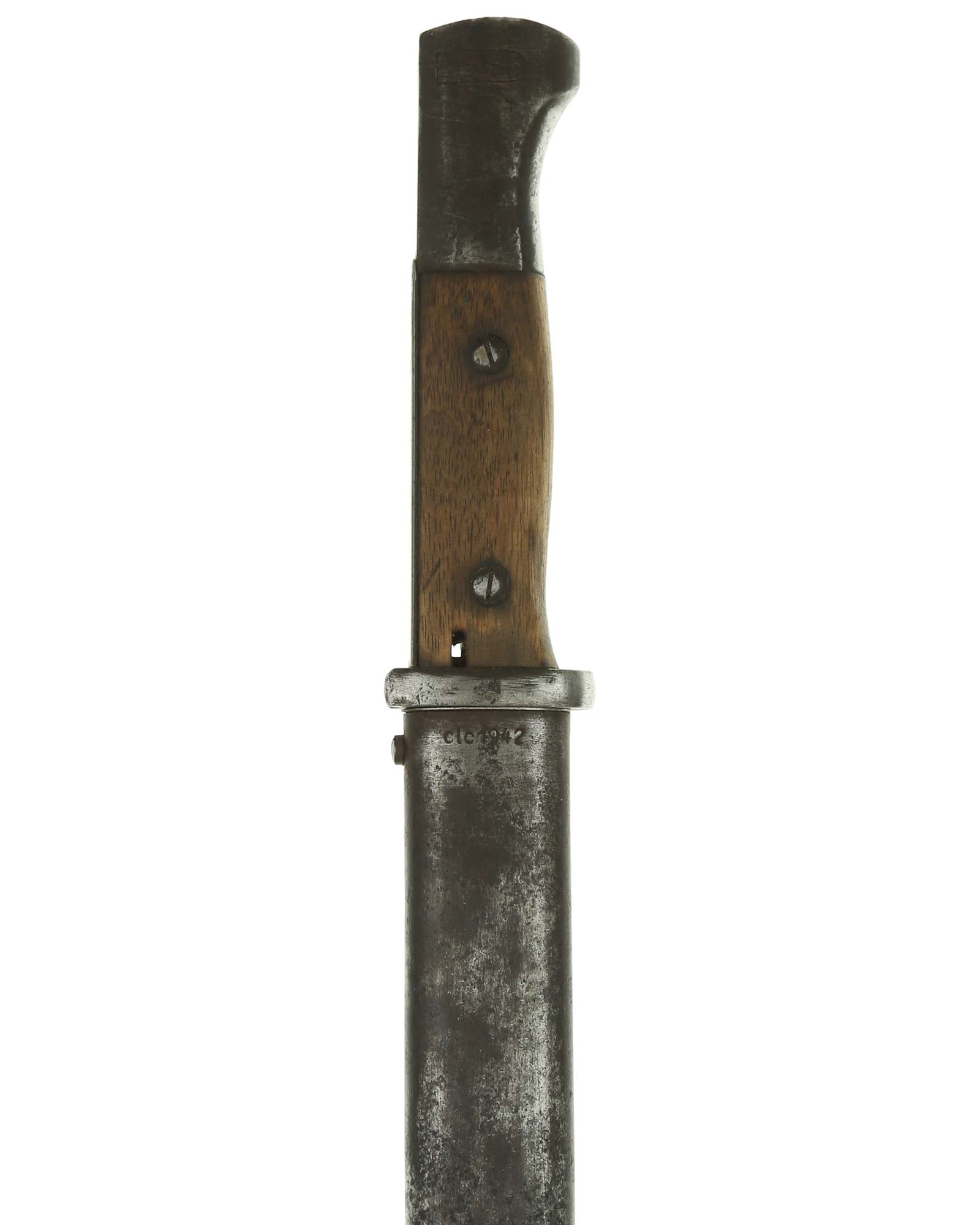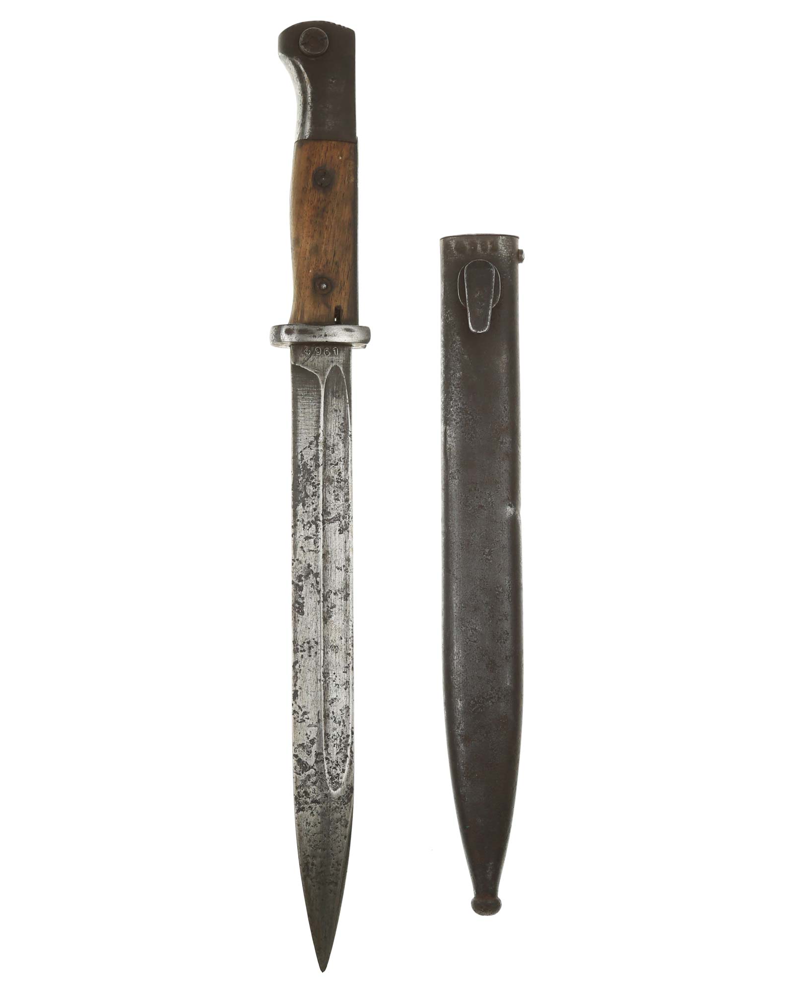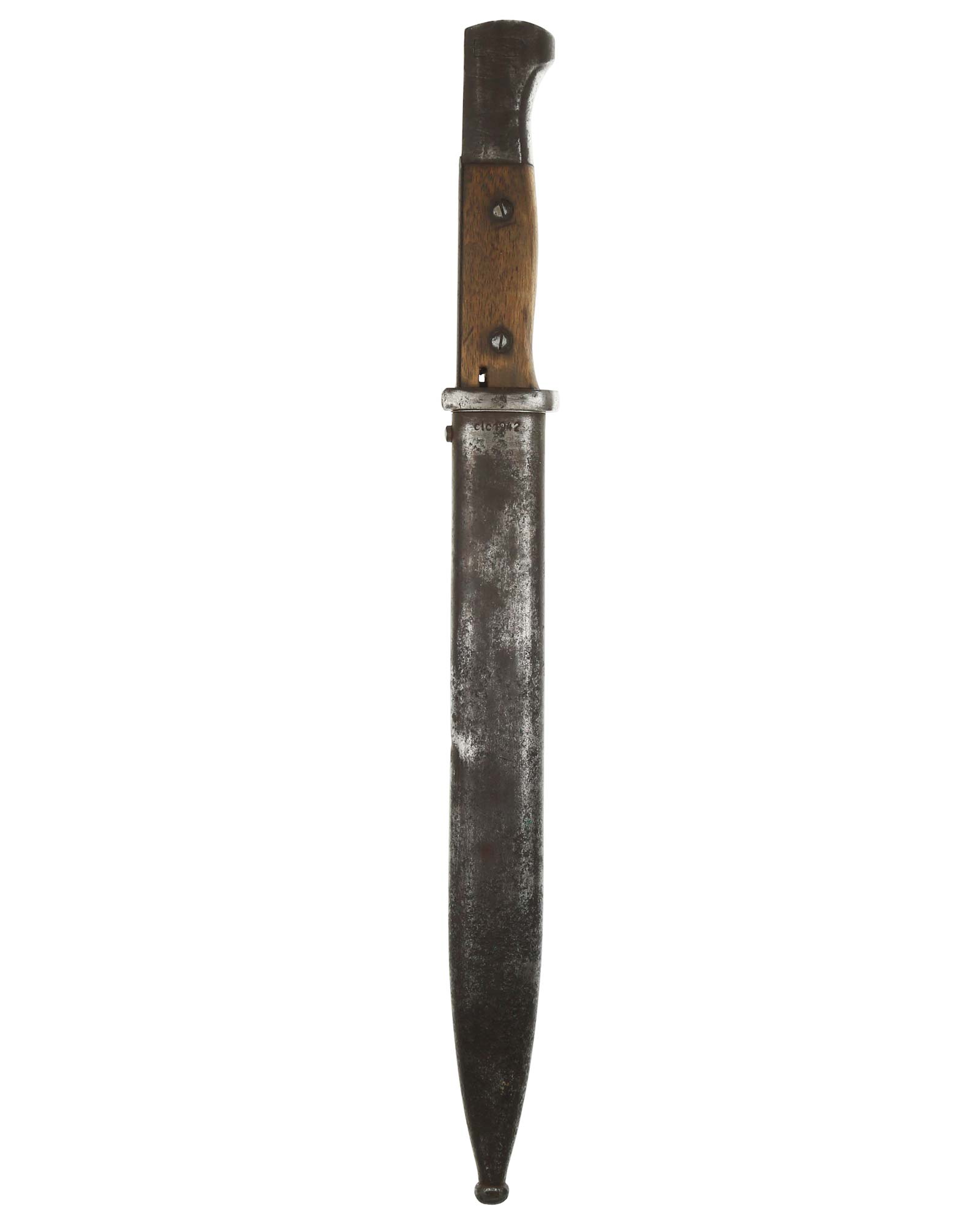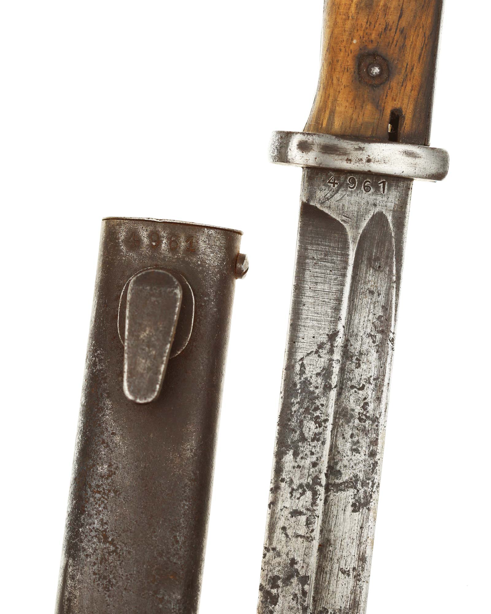 Seitengewehr 84/98 III mit Holzgriffschalen. Das Seitengewehr ist nummergleich (4961). Die Klinge und Scheide mit Herstellercode von R. Albrecht Herder Solingen ([clc). Gesamtlänge 40,5 cm. Zustand 2.