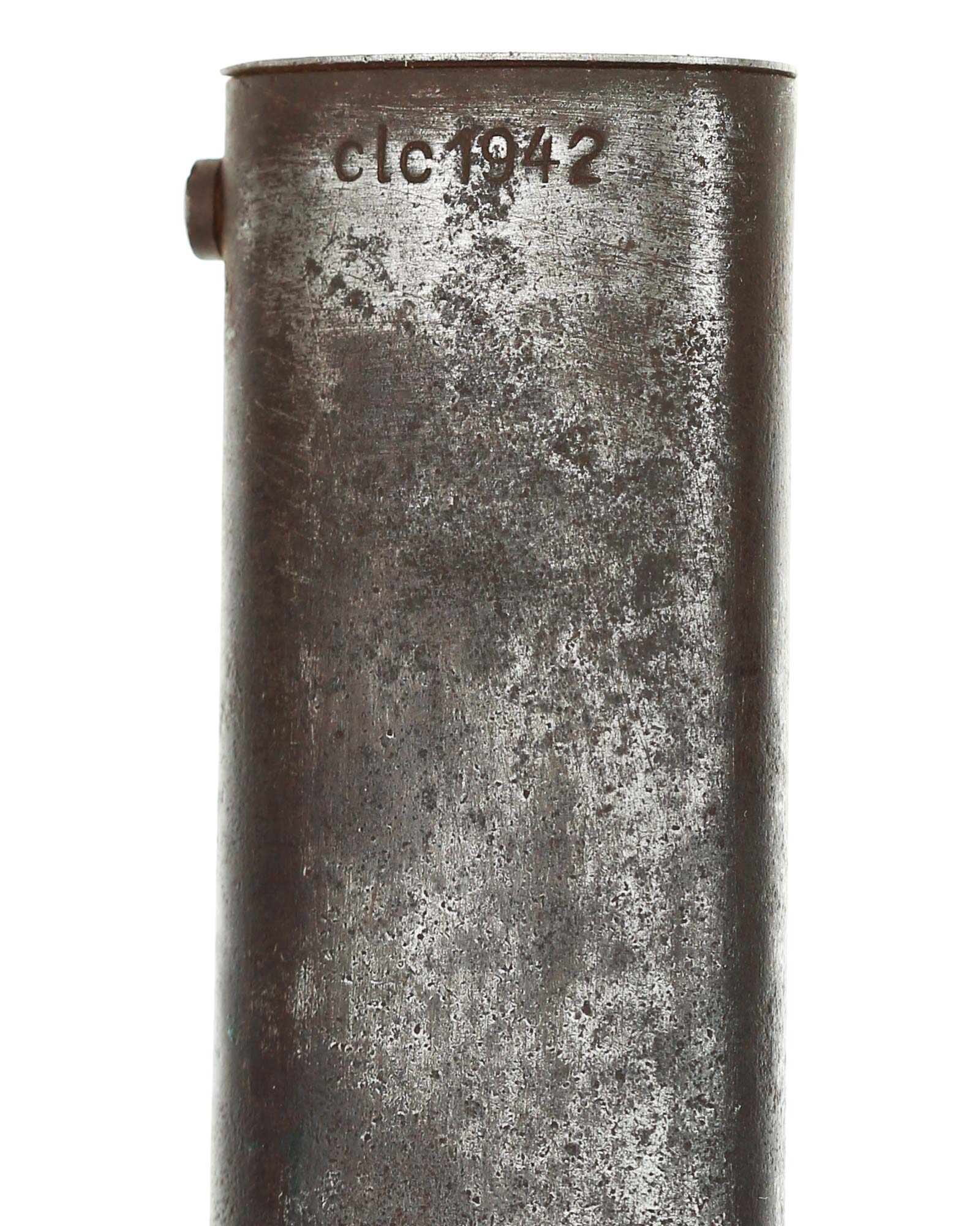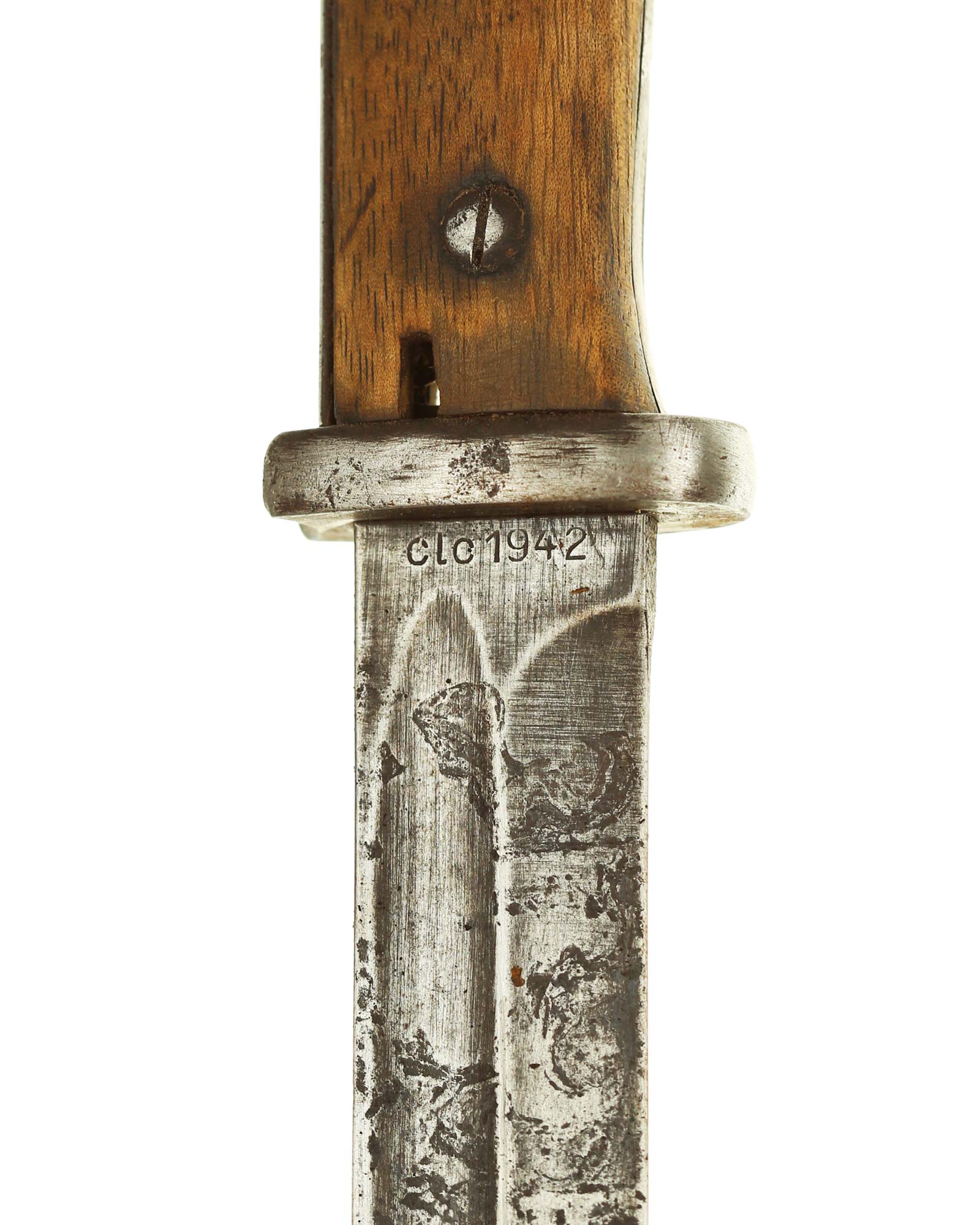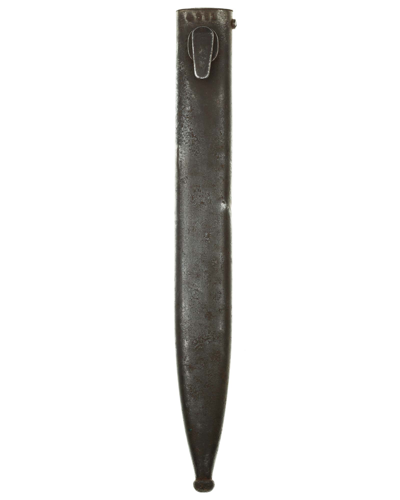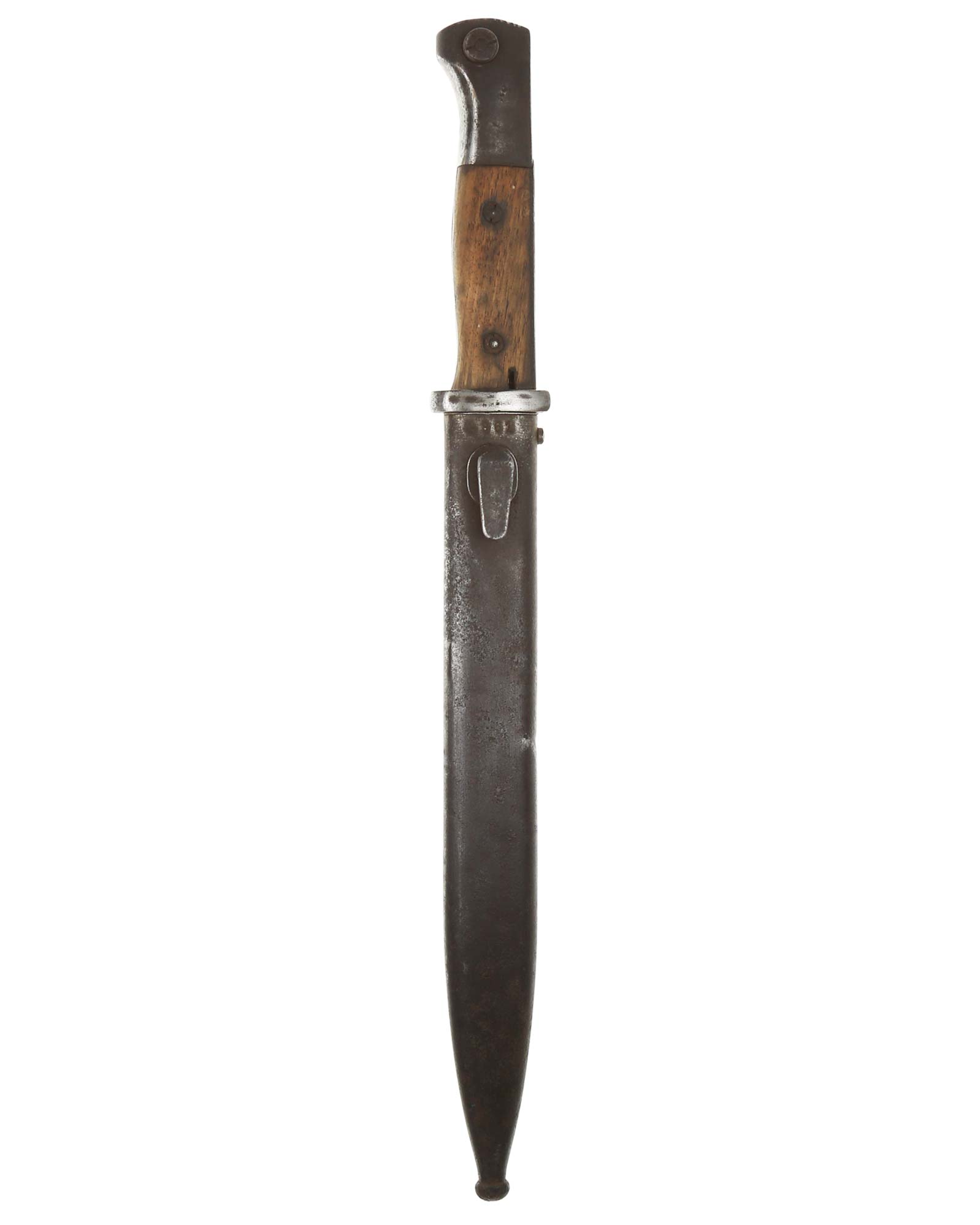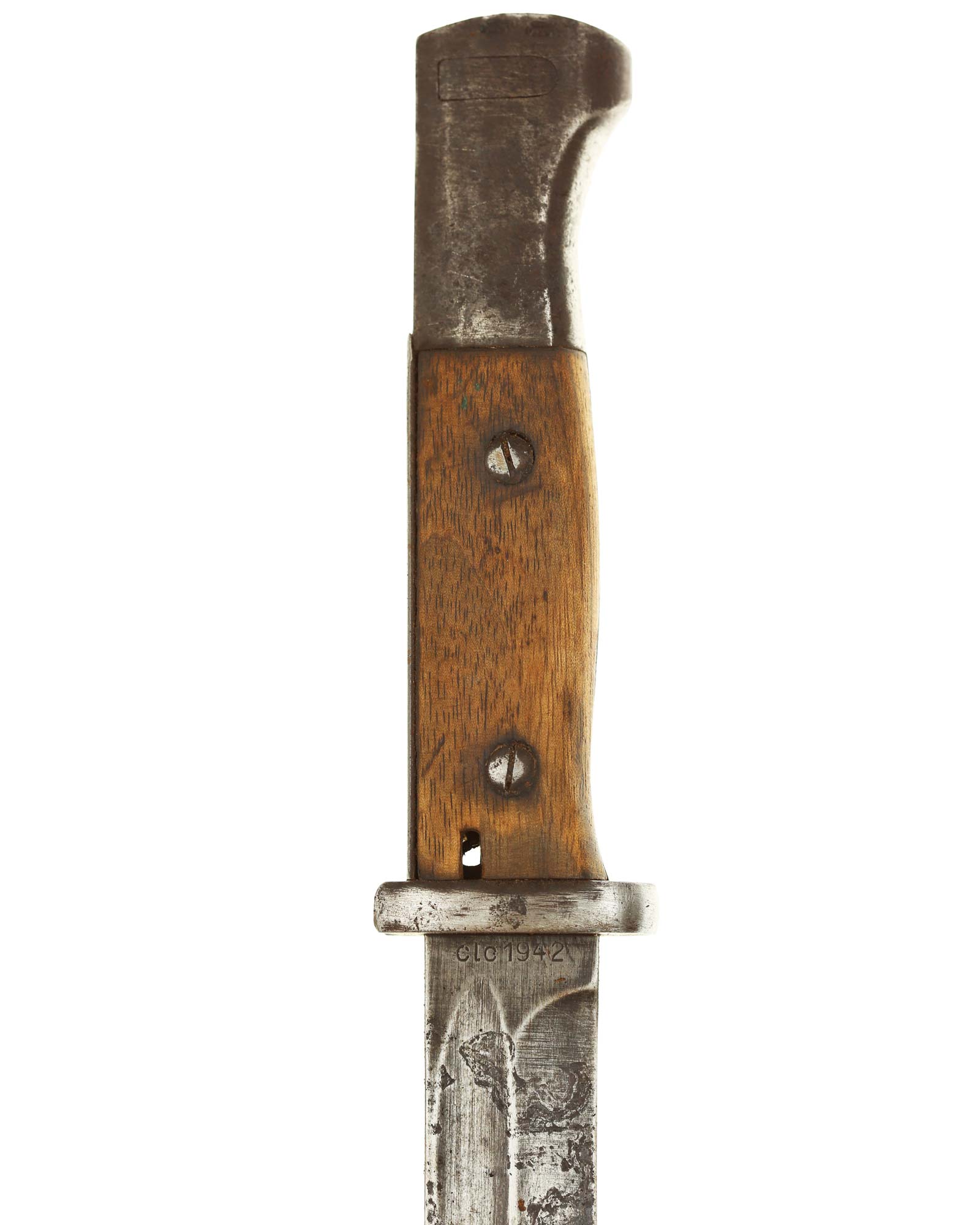 Seitengewehr 84/98 III mit Holzgriffschalen. Das Seitengewehr ist nummergleich (4961). Die Klinge und Scheide mit Herstellercode von R. Albrecht Herder Solingen ([clc). Gesamtlänge 40,5 cm. Zustand 2.