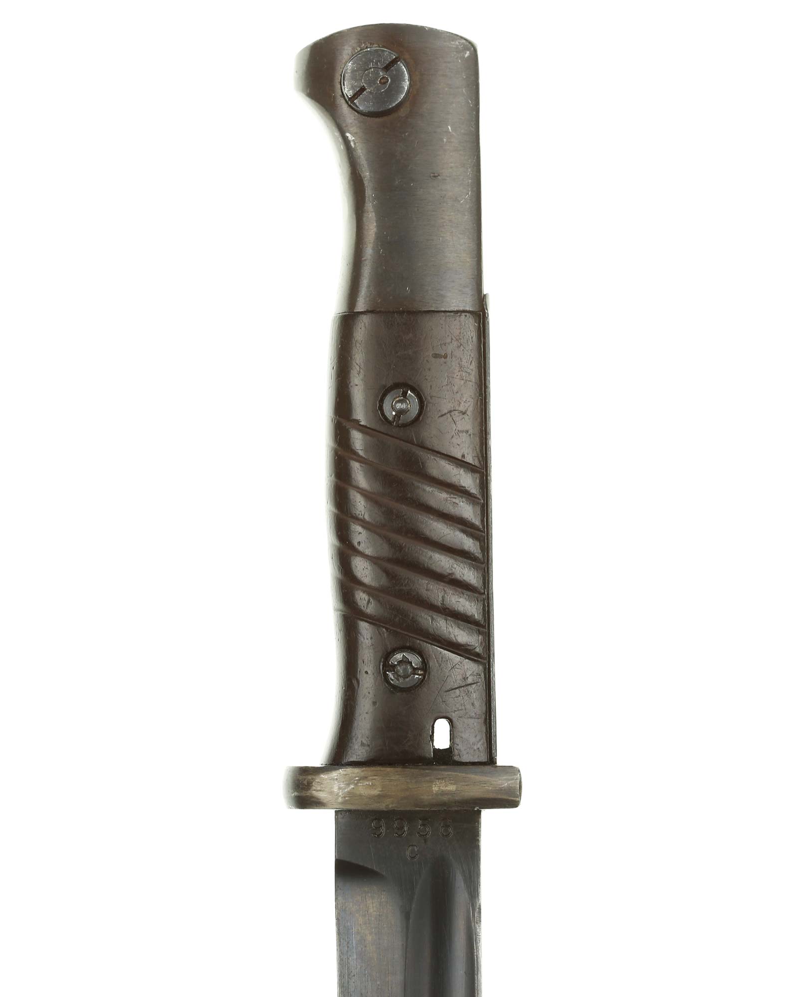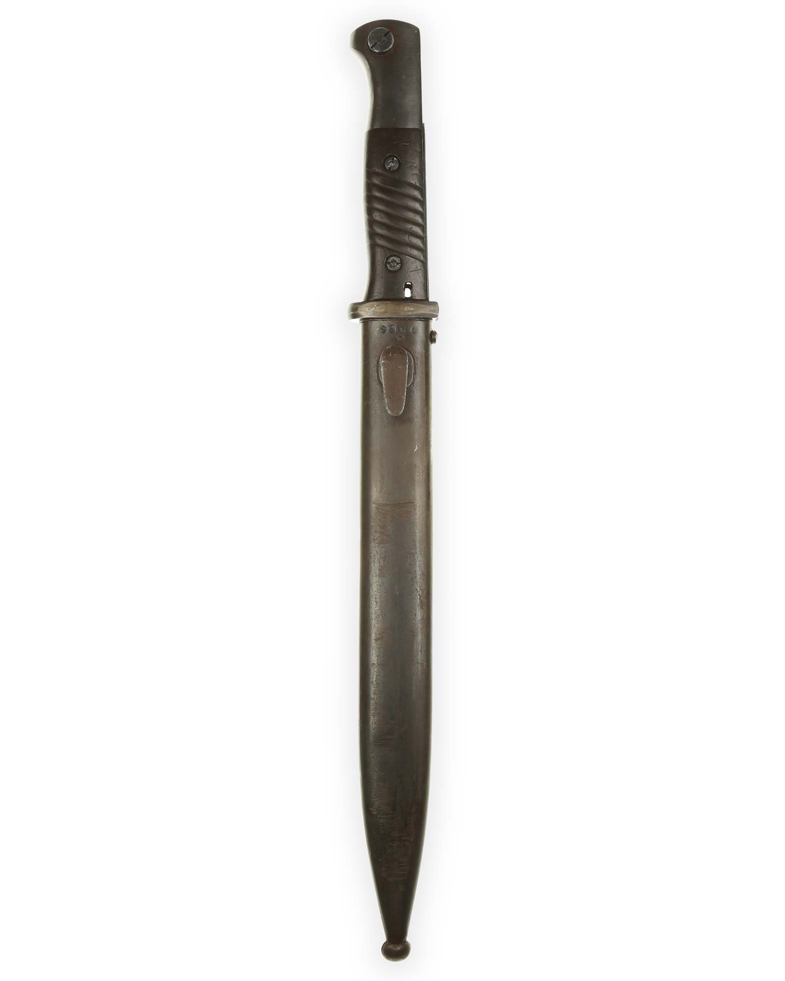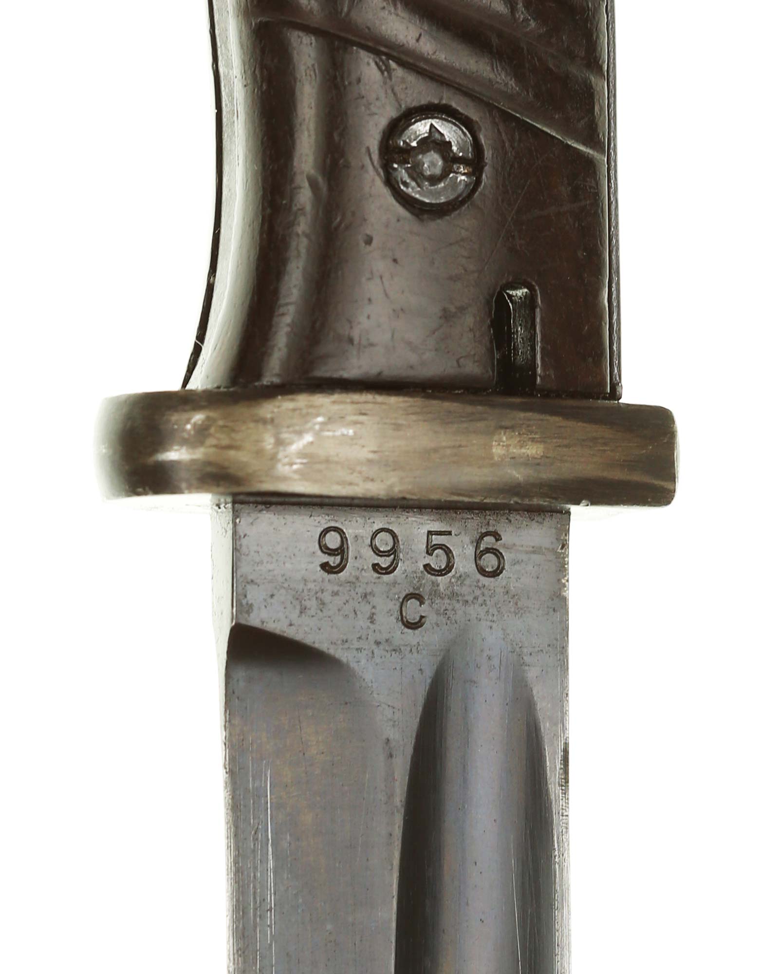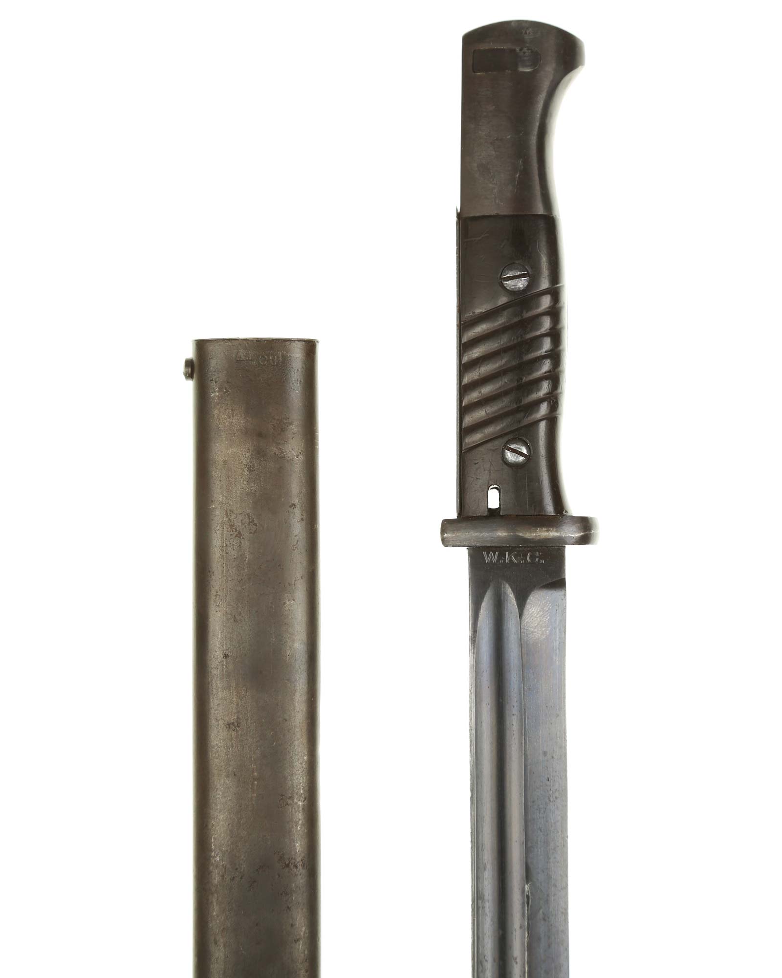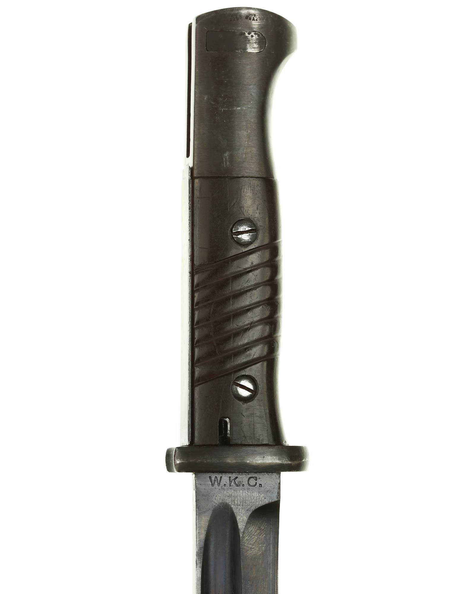 Seitengewehr 84/98 mit Hersteller. Griff mit schwarzbraunen Bakelit-Griffschalen, diese werden mit zwei Schrauben befestigt. Druckknopf funktioniert einwandfrei. Die Klinge ist brüniert und einschneidig mit runden Hohlkehlen. Auf der Vorderseite der Klinge ist die Nummer (9956 C) eingeschlagen, Rückseite mit Hersteller: WKC Solingen. Brünierte Stahlscheide. Gesamtlänge beträgt 406 mm.