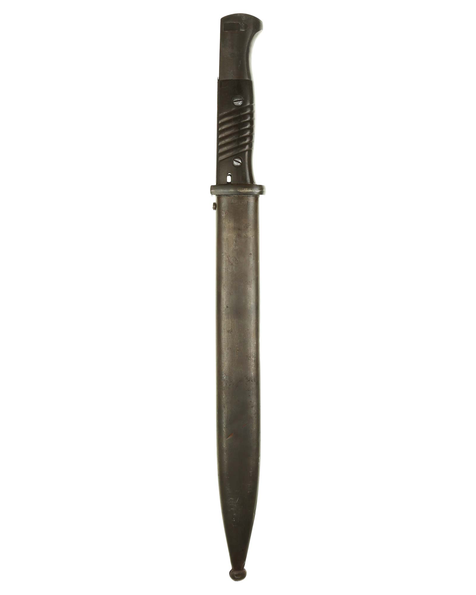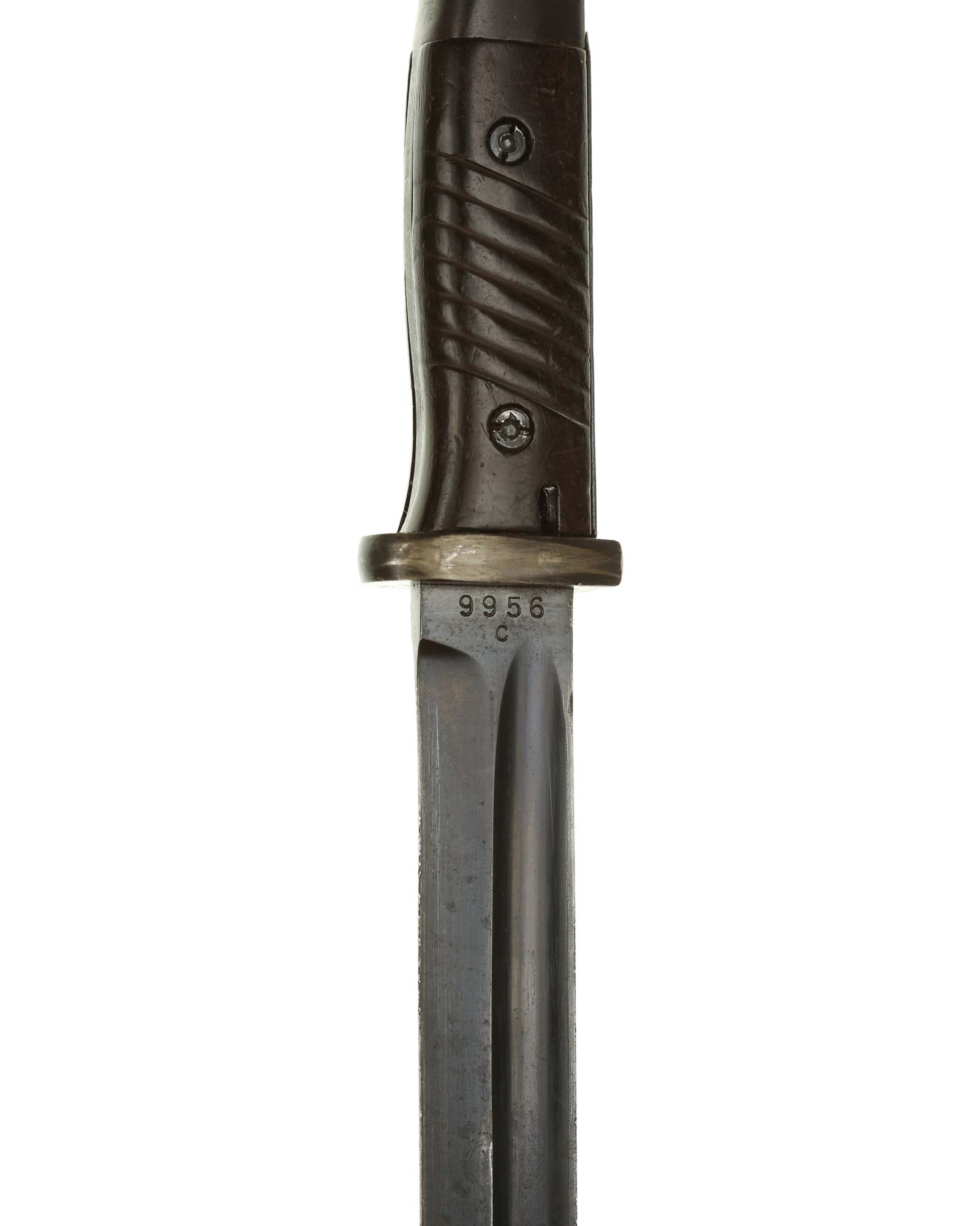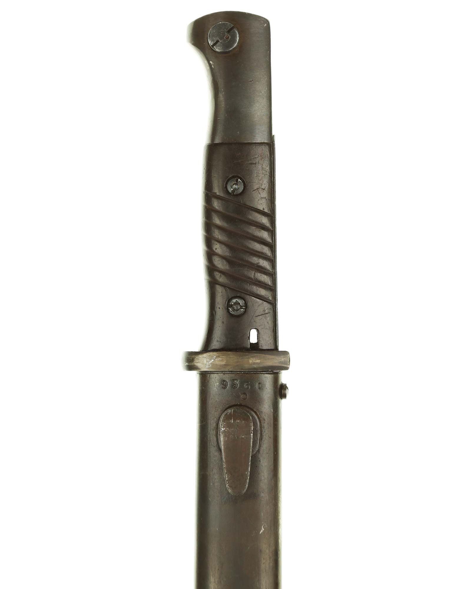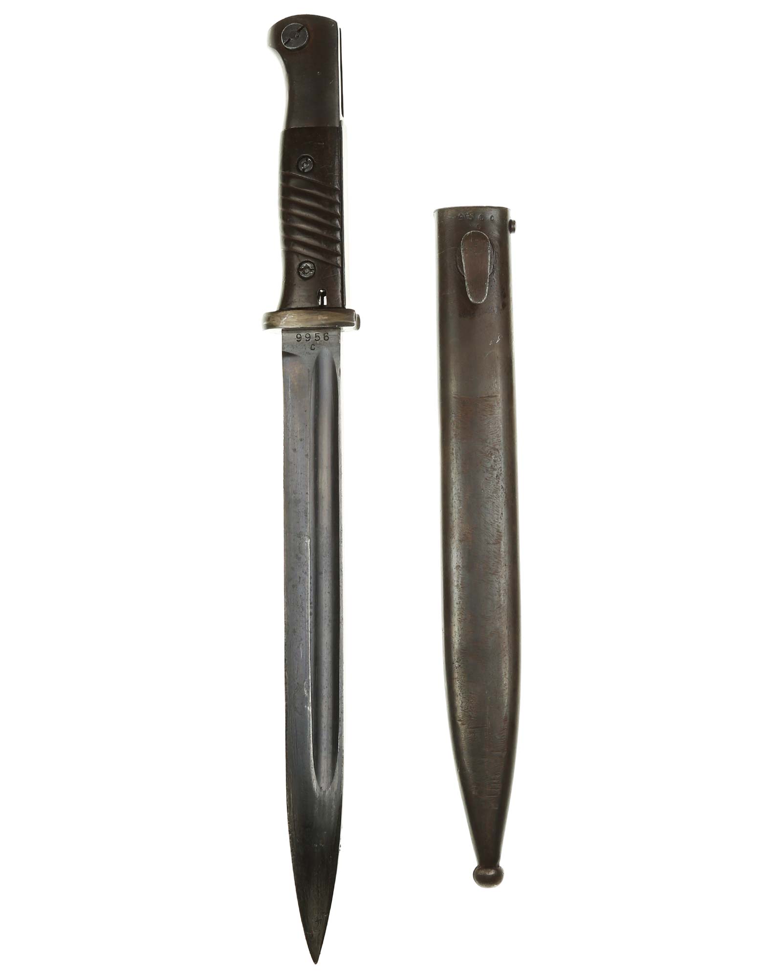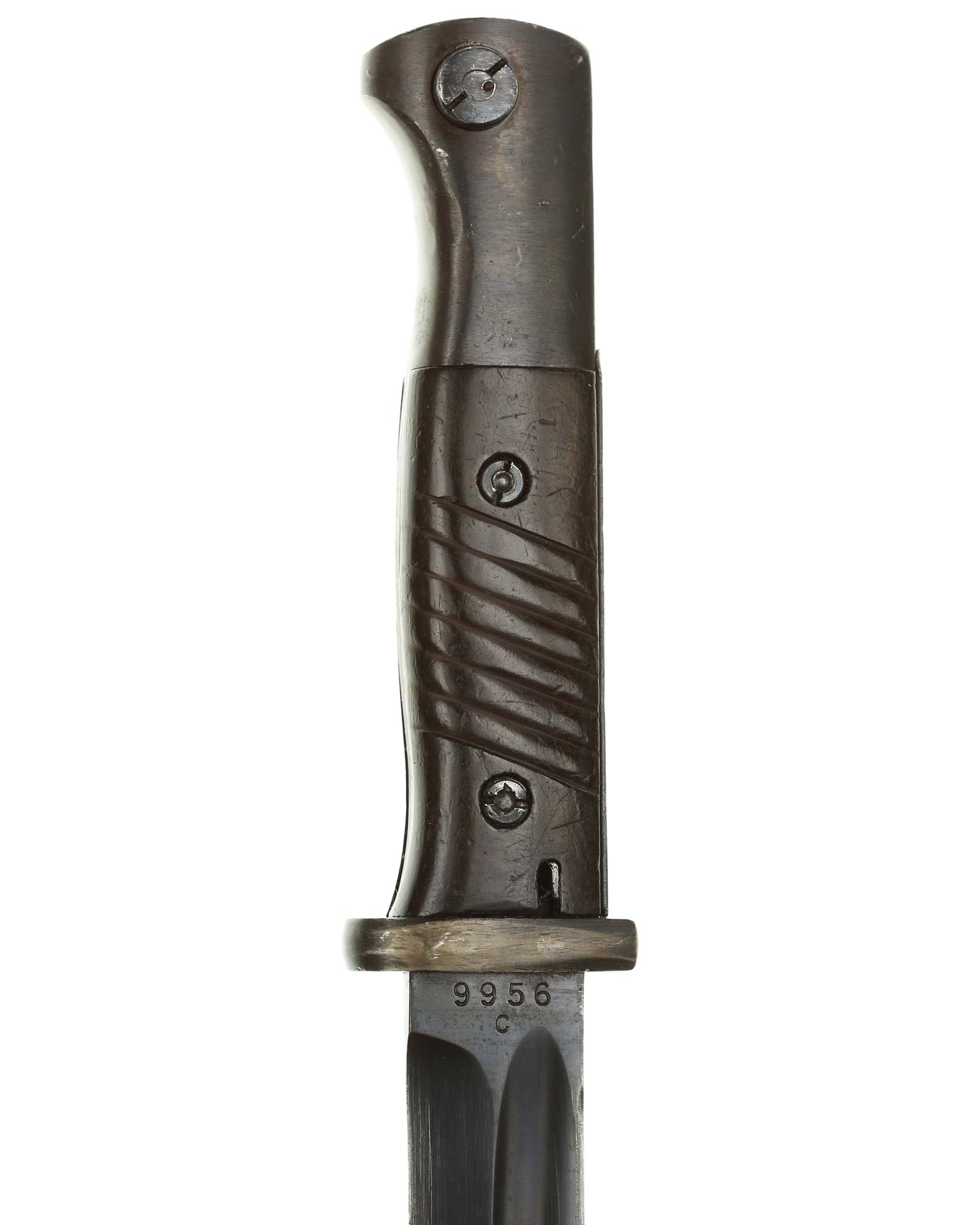 Seitengewehr 84/98 mit Hersteller. Griff mit schwarzbraunen Bakelit-Griffschalen, diese werden mit zwei Schrauben befestigt. Druckknopf funktioniert einwandfrei. Die Klinge ist brüniert und einschneidig mit runden Hohlkehlen. Auf der Vorderseite der Klinge ist die Nummer (9956 C) eingeschlagen, Rückseite mit Hersteller: WKC Solingen. Brünierte Stahlscheide. Gesamtlänge beträgt 406 mm.