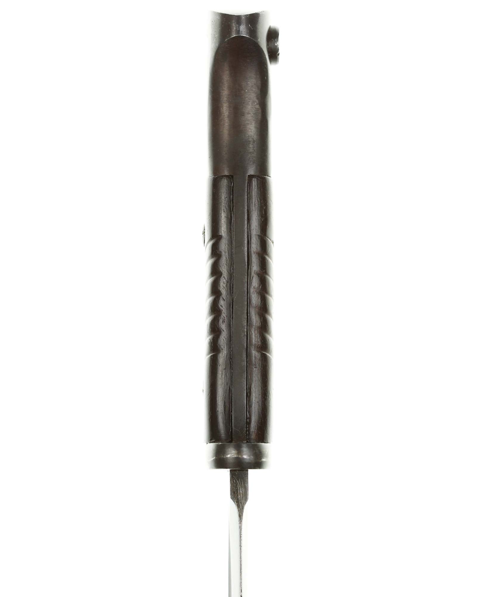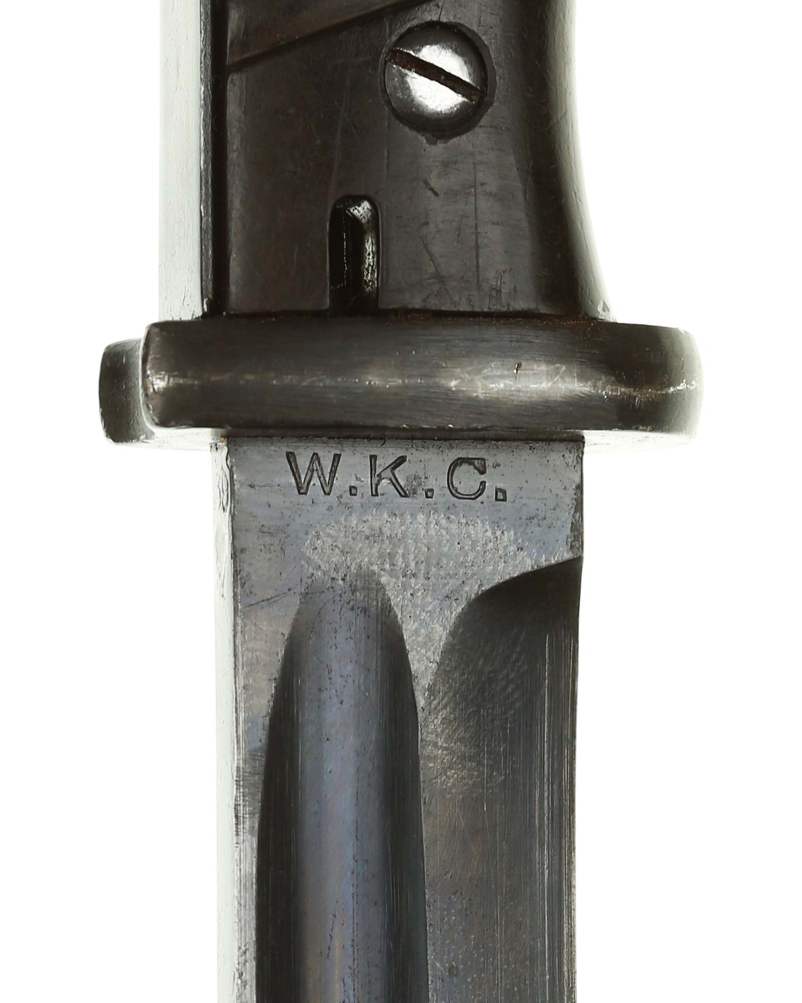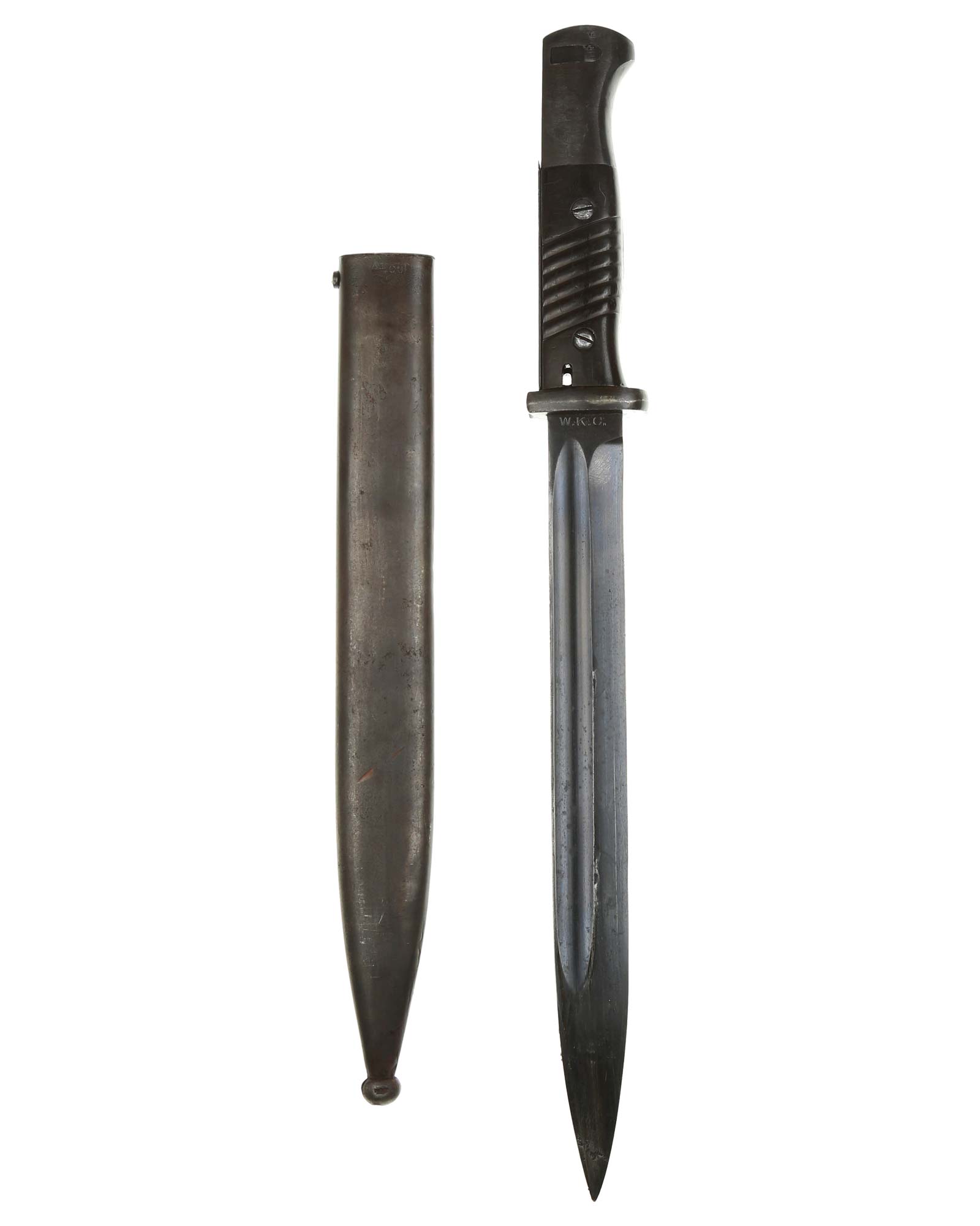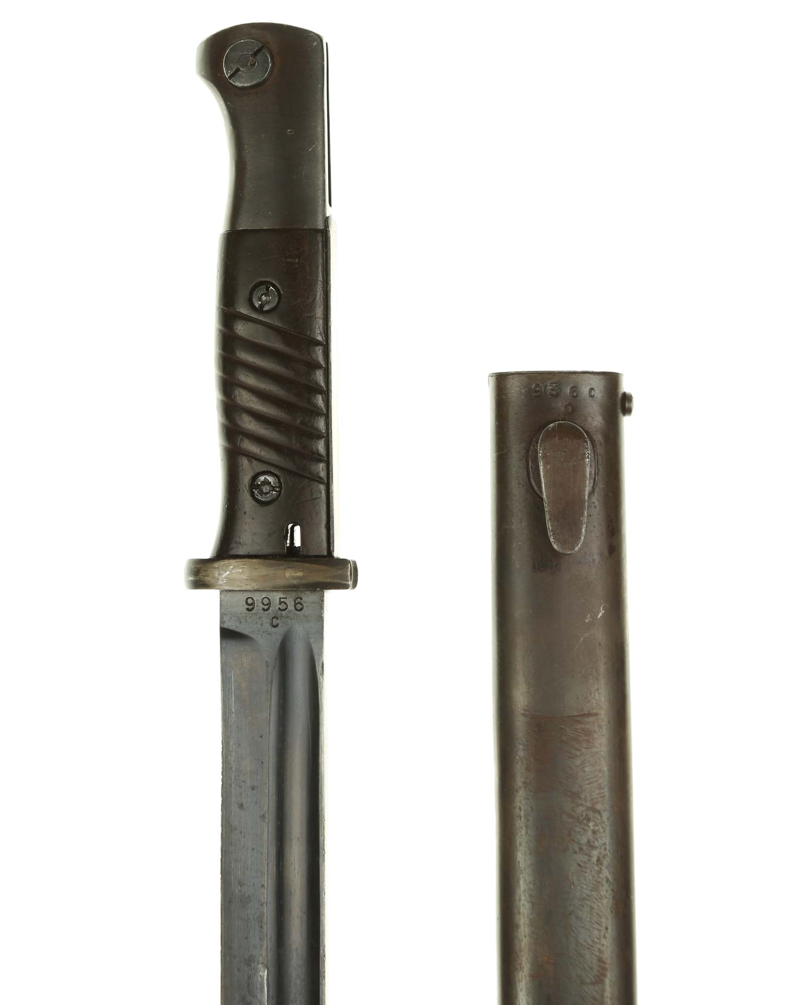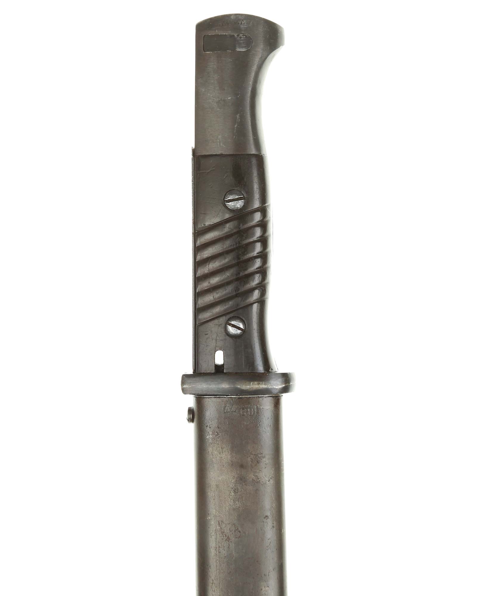Seitengewehr 84/98 mit Hersteller. Griff mit schwarzbraunen Bakelit-Griffschalen, diese werden mit zwei Schrauben befestigt. Druckknopf funktioniert einwandfrei. Die Klinge ist brüniert und einschneidig mit runden Hohlkehlen. Auf der Vorderseite der Klinge ist die Nummer (9956 C) eingeschlagen, Rückseite mit Hersteller: WKC Solingen. Brünierte Stahlscheide. Gesamtlänge beträgt 406 mm.