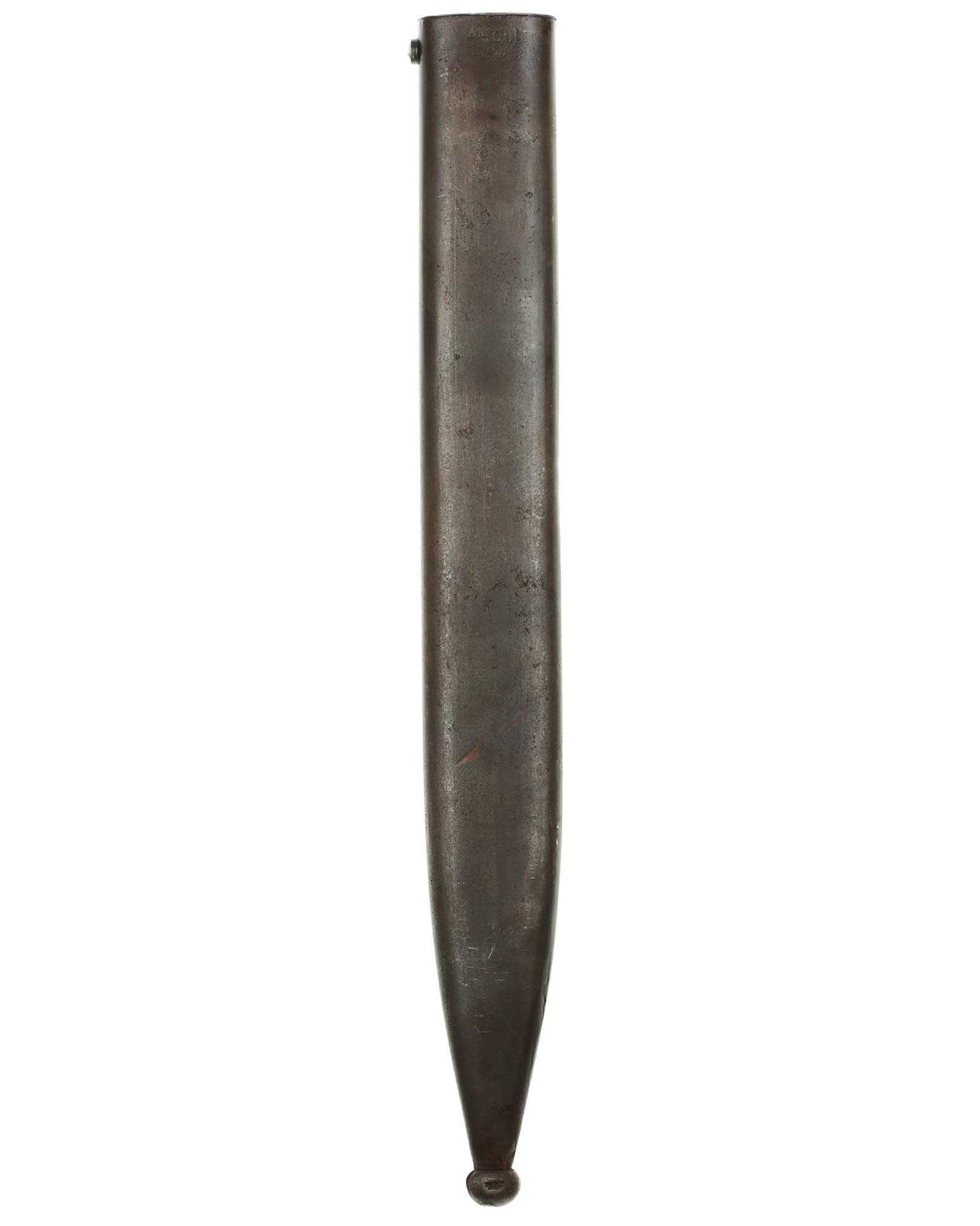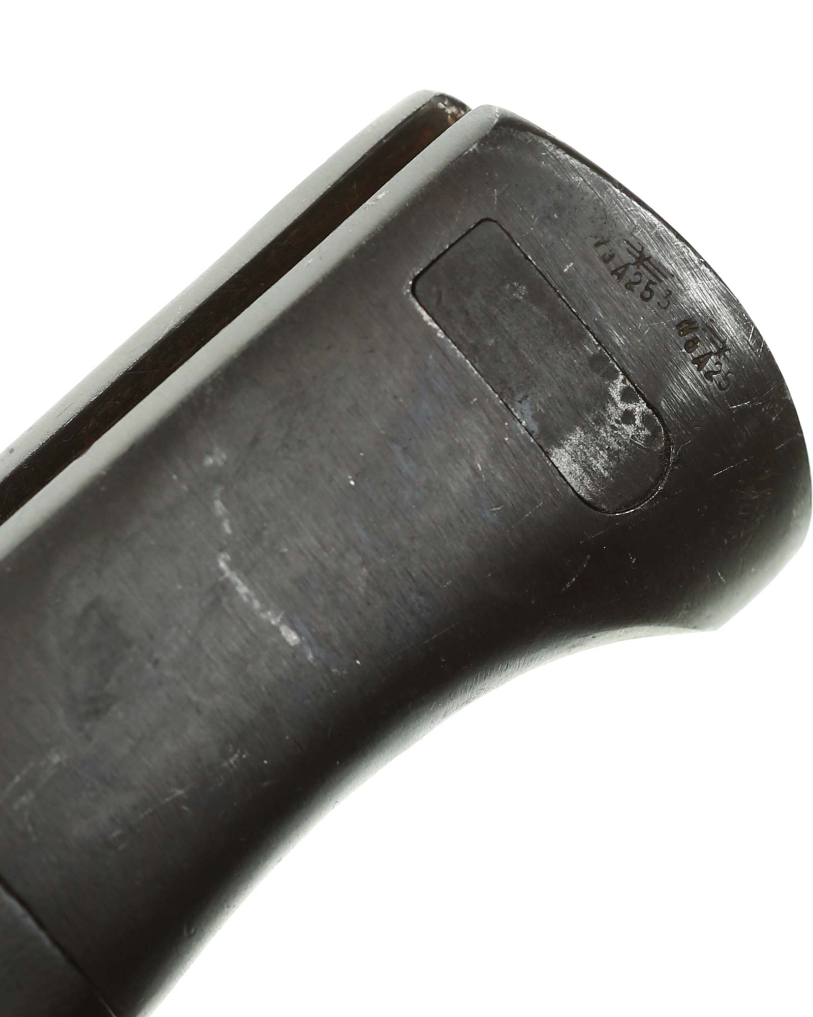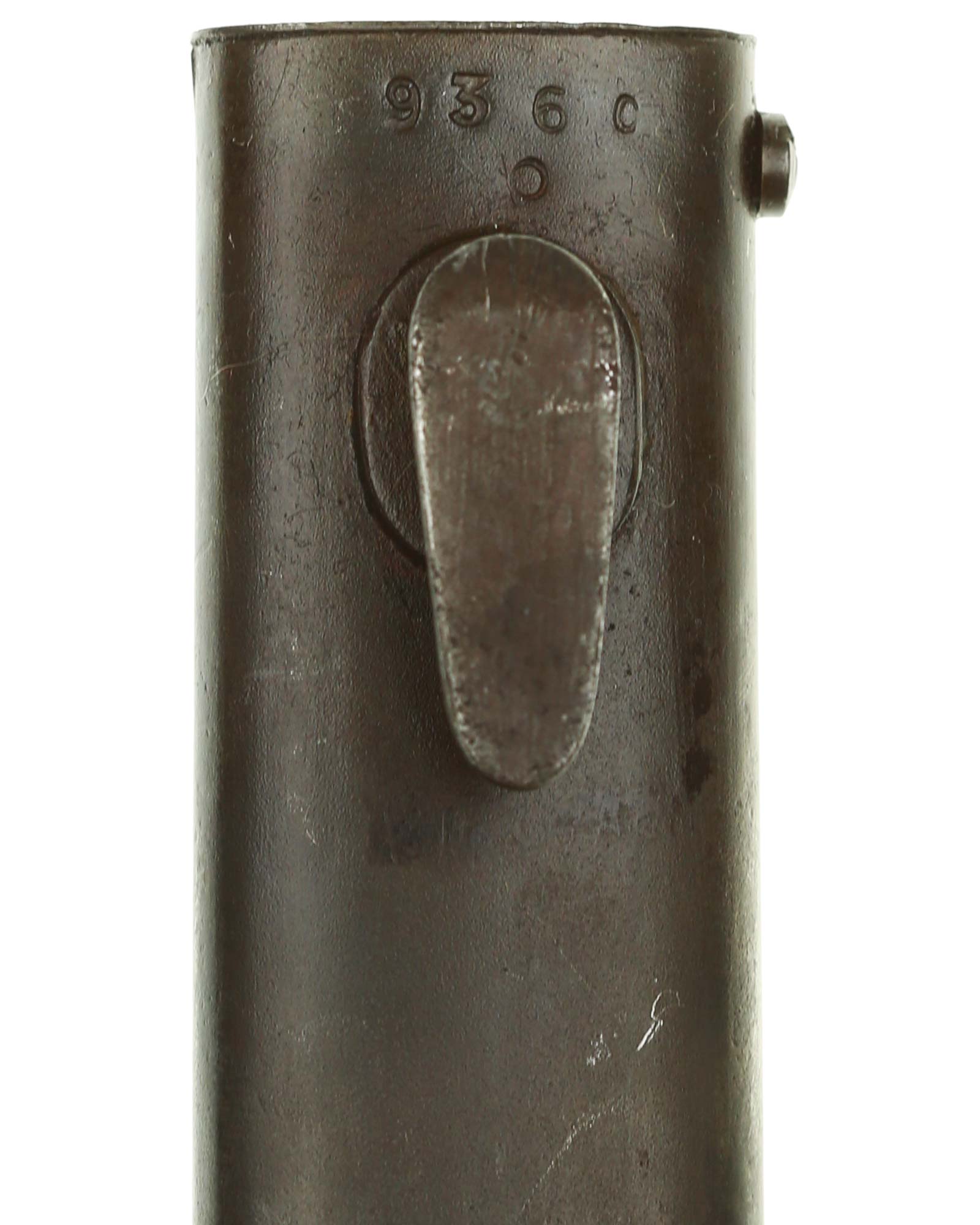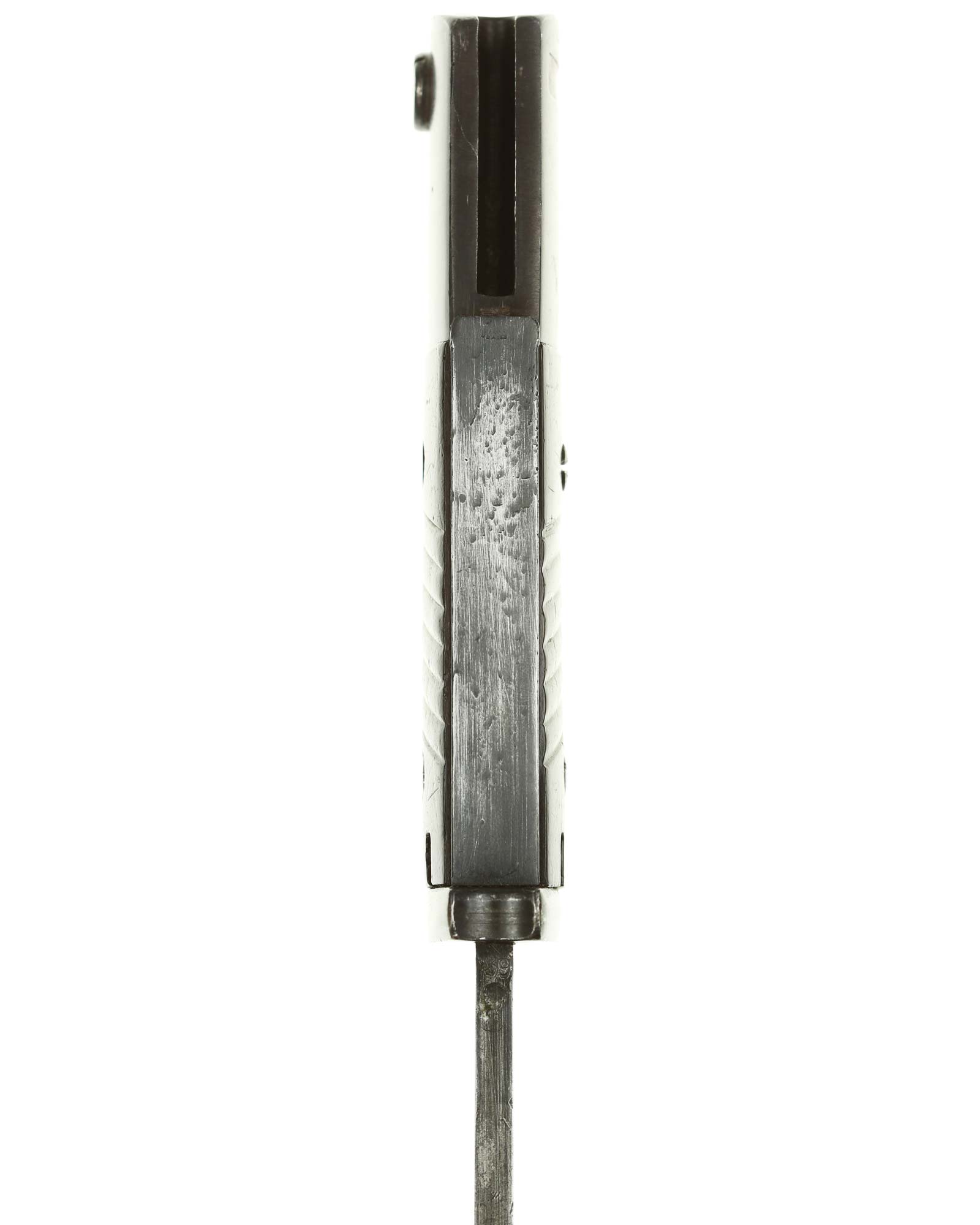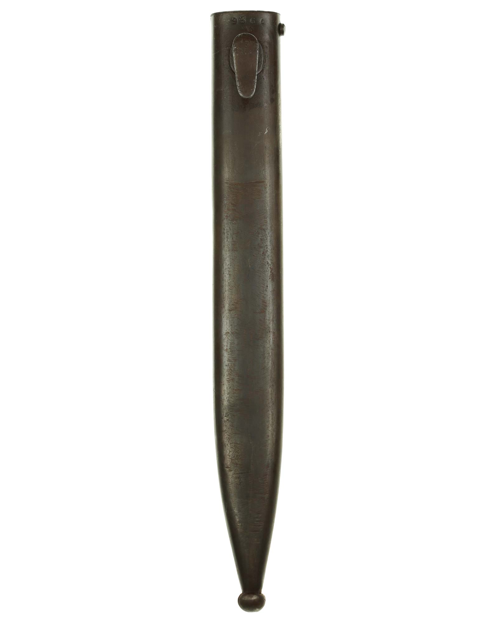 Seitengewehr 84/98 mit Hersteller. Griff mit schwarzbraunen Bakelit-Griffschalen, diese werden mit zwei Schrauben befestigt. Druckknopf funktioniert einwandfrei. Die Klinge ist brüniert und einschneidig mit runden Hohlkehlen. Auf der Vorderseite der Klinge ist die Nummer (9956 C) eingeschlagen, Rückseite mit Hersteller: WKC Solingen. Brünierte Stahlscheide. Gesamtlänge beträgt 406 mm.