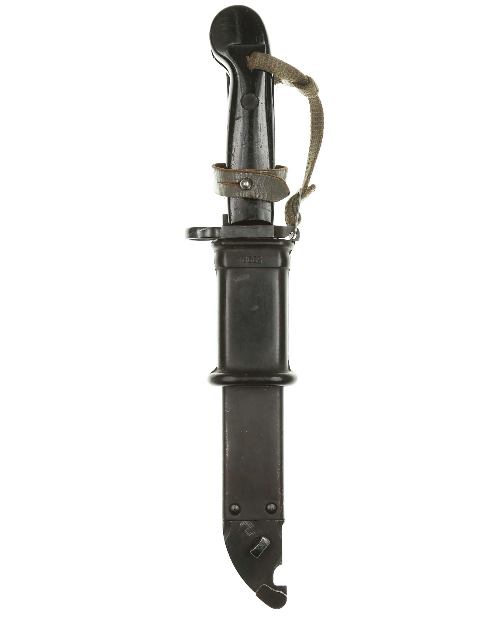 AK Bajonett Typ 6Ch3 (Schwarz) mit Scheide. Griff aus Plastik. Gesamtlänge 33,5 cm. Einschneidige Klinge. Das Bajonett ist gekennzeichnet (HL4051, 5998). Gesamtgewicht 466 g. Gesamtlänge: 335 mm. Zustand 1-.