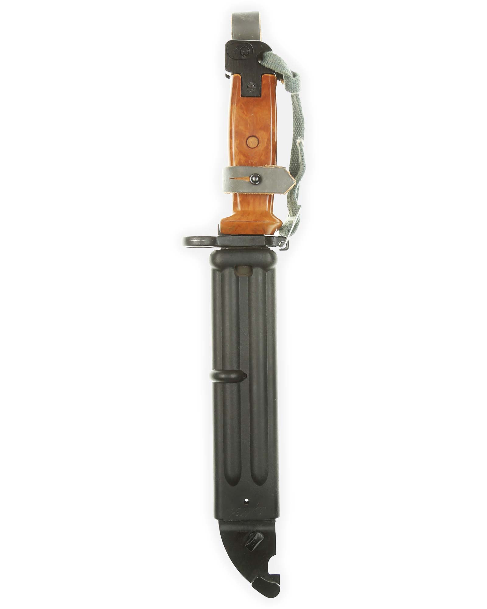 AK Bajonett Typ 6Ch4 (Braun) mit Scheide. Gesamtlänge 33,2 cm. Einschneidige Klinge. Das Bajonett ist gekennzeichnet (#221131). Gesamtgewicht 468 g. Gesamtlänge: 332 mm. Zustand 1-.