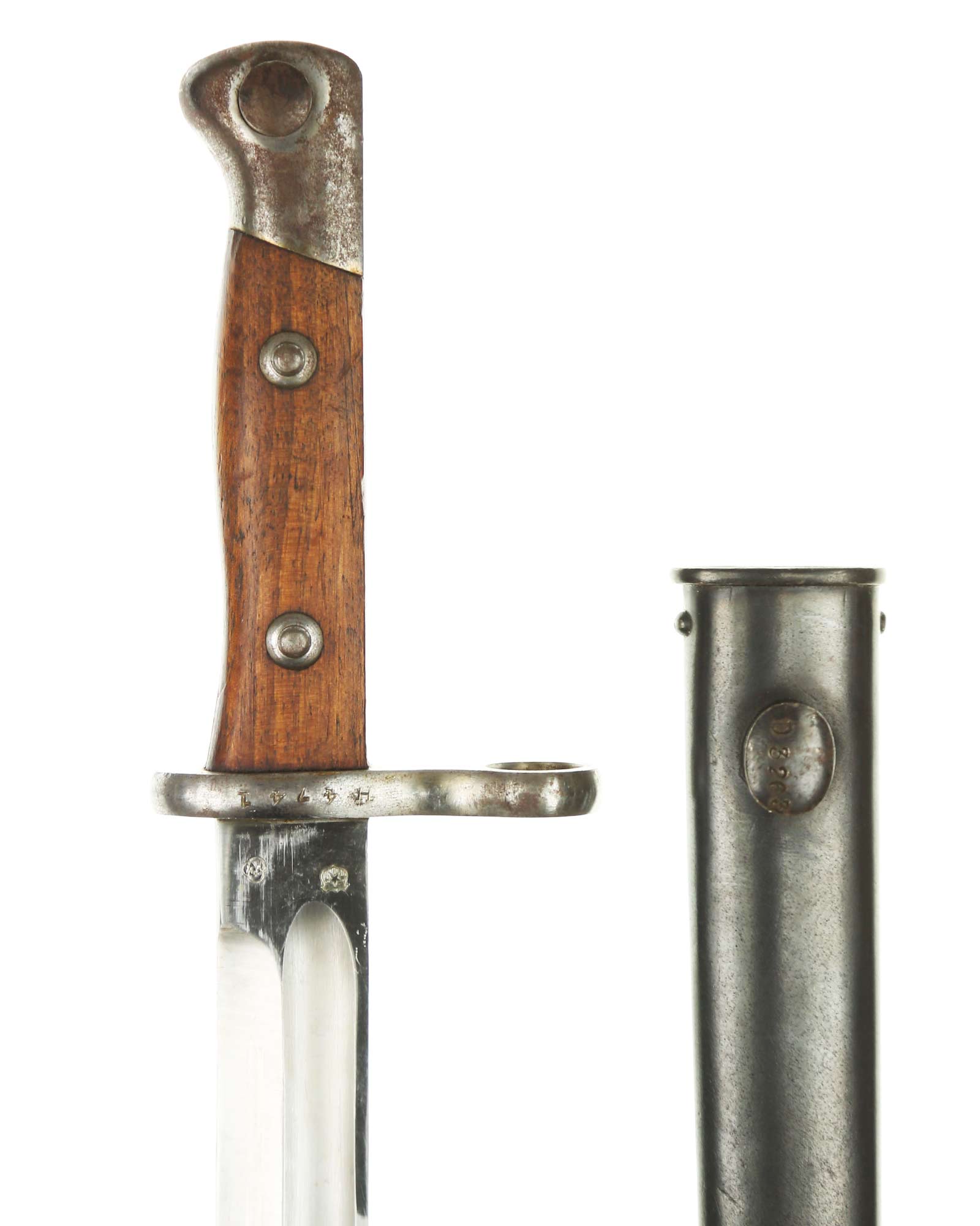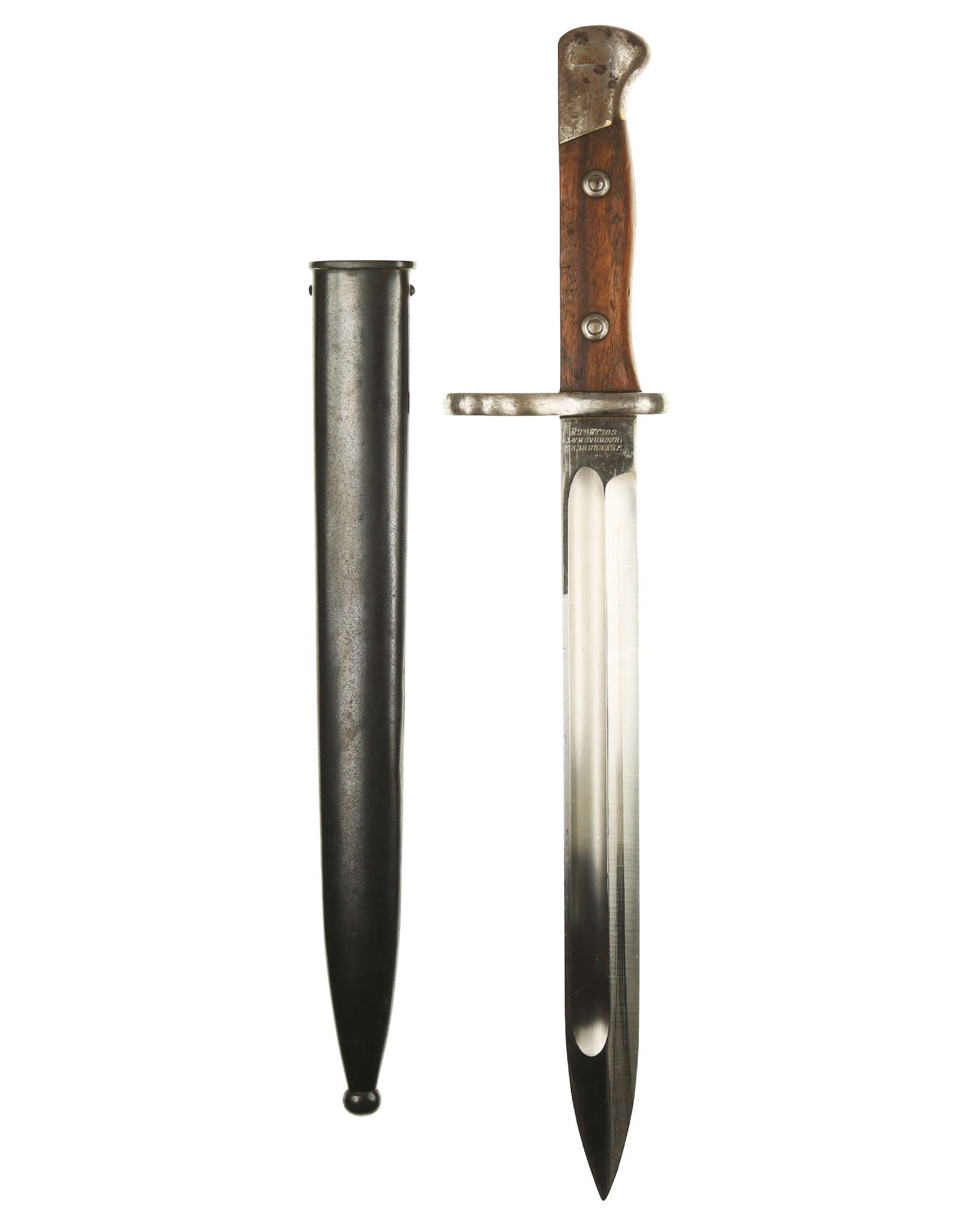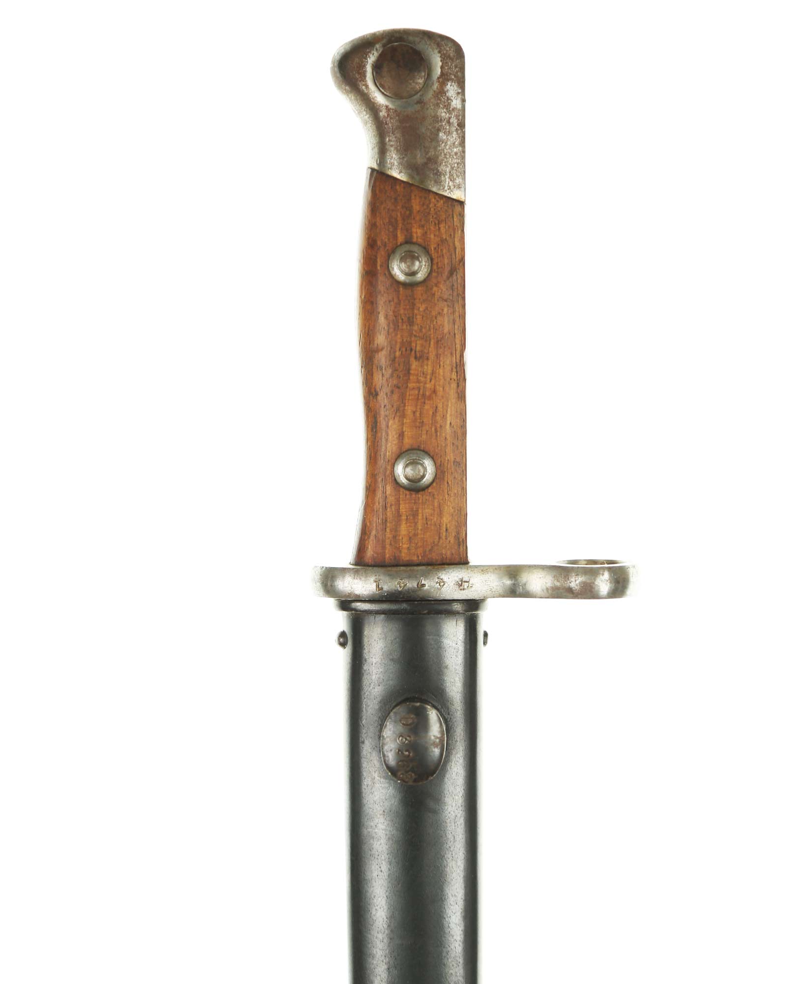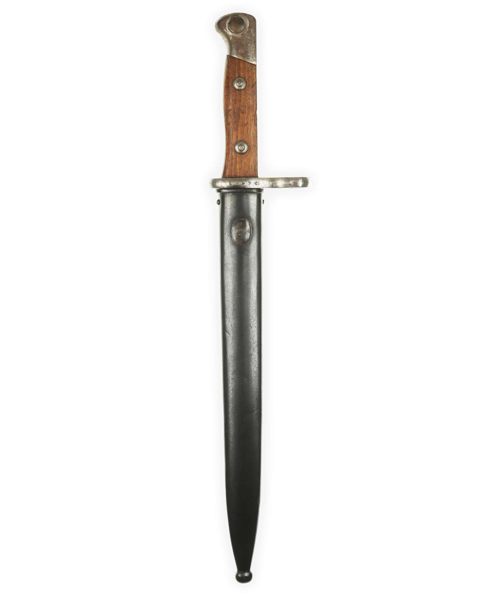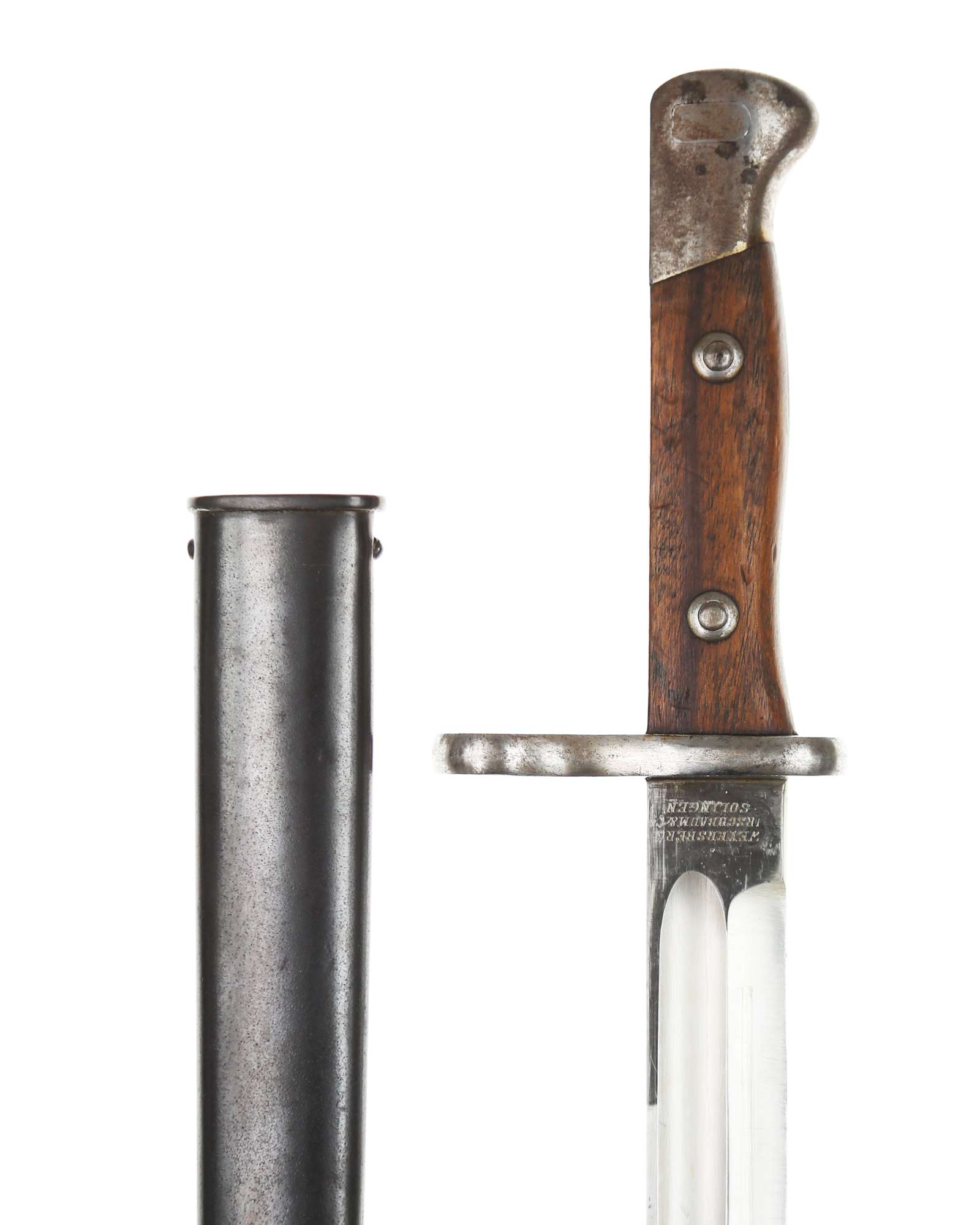 Bajonett Chile M1895 mit Solinger Hersteller Weyersberg Kirschbaum. Das Bajonett ist nummeriert auf der Parierstange: H4741, die Scheide ist mit D3263 gestempelt. Gesamtlänge: 395 mm.