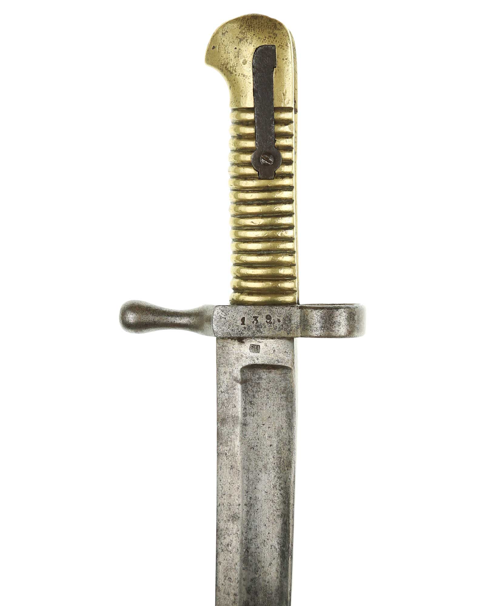 Belgien Säbelbajonett M1848 Thouvenin. Einschneidige Keilklinge, Rückseite mit Markierung: MS und auf der Rückseite 1855. Messinggriff, Parierstange gebogen und gestempelt mit 139. Das Säbelbajonett ist ohne Scheide.