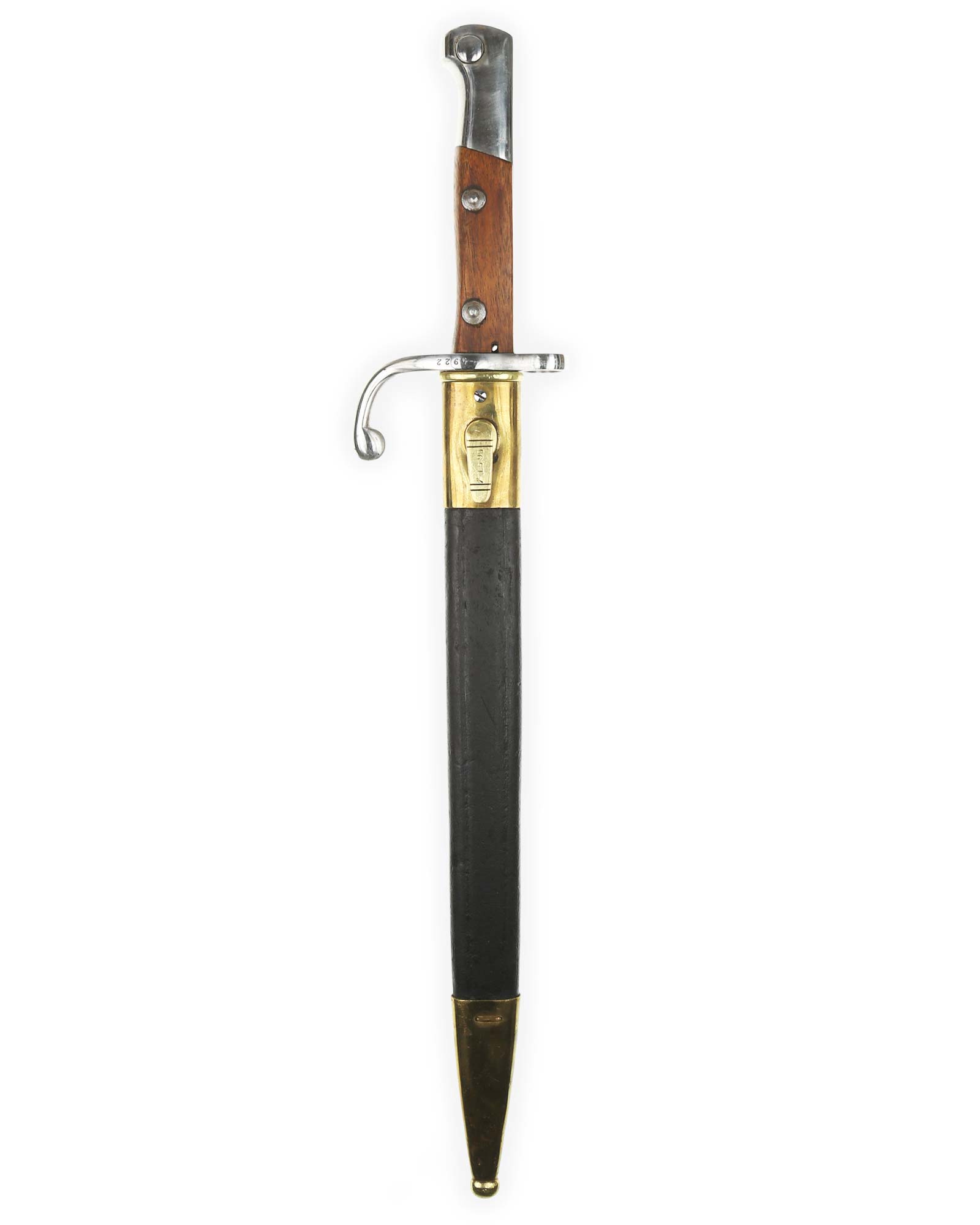 Brasilien Seitengewehr M1908 für Mauser-Gewehre. Die Scheide ist mit Leder überzogen. Der Hersteller ist Simson & Co. Suhl. Gesamtlänge 45,3 cm.