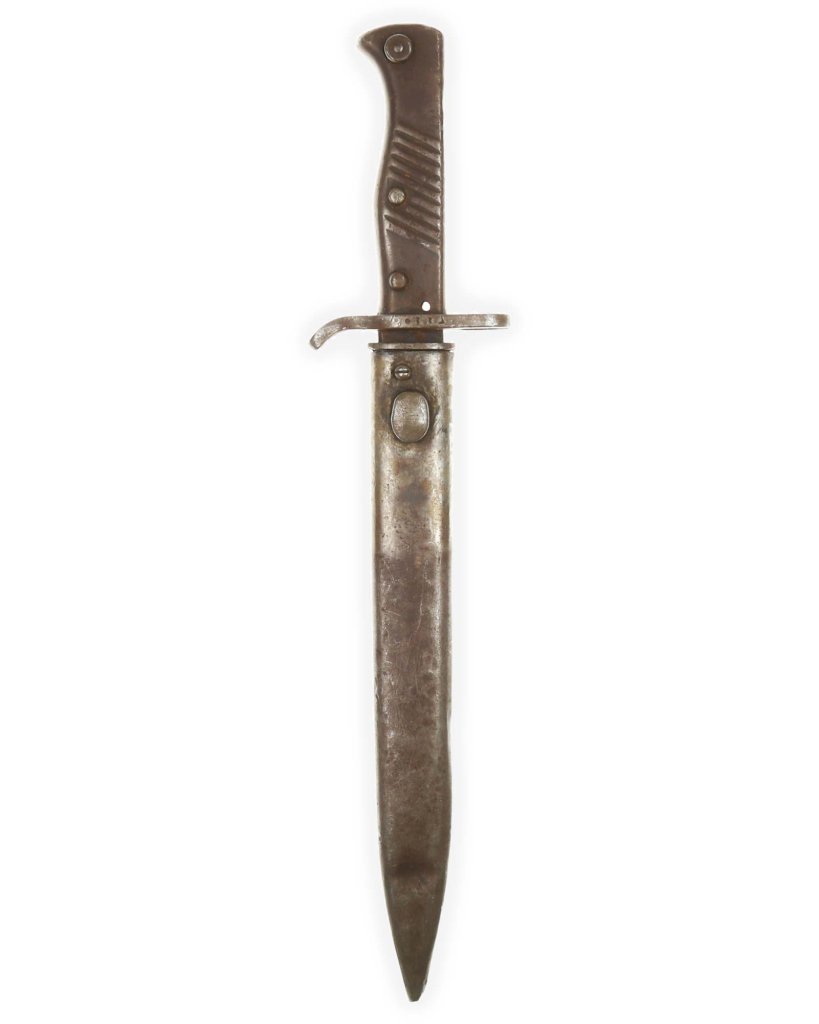 Ersatz Seitengewehr 98/05 mit Metallgriff. Beide Griffschalen und Griffschrauben unbeschädigt. Der Druckknopf funktioniert. Die Klinge ist einschneidig mit runden Hohlkehlen. Die Gesamtlänge beträgt 397 mm.
