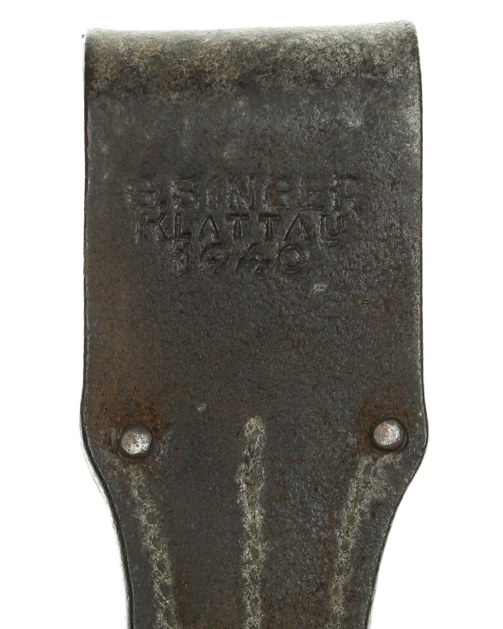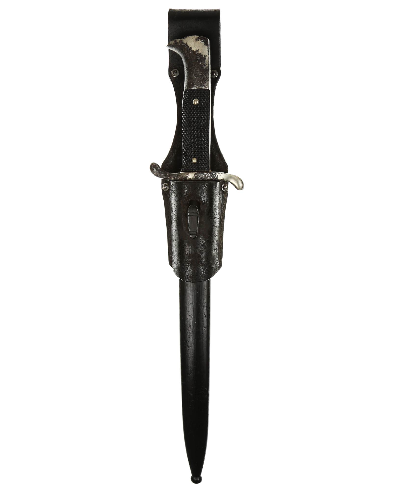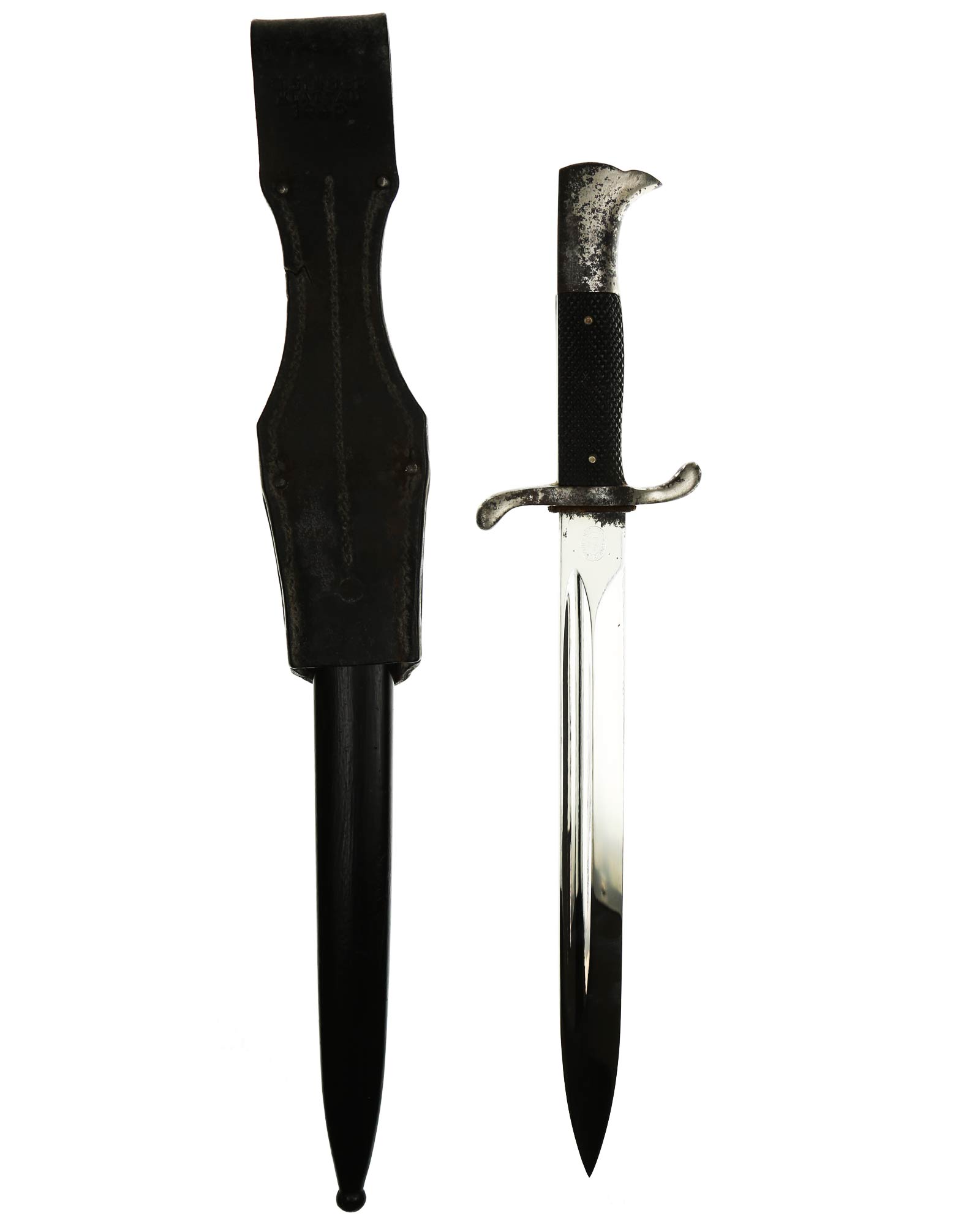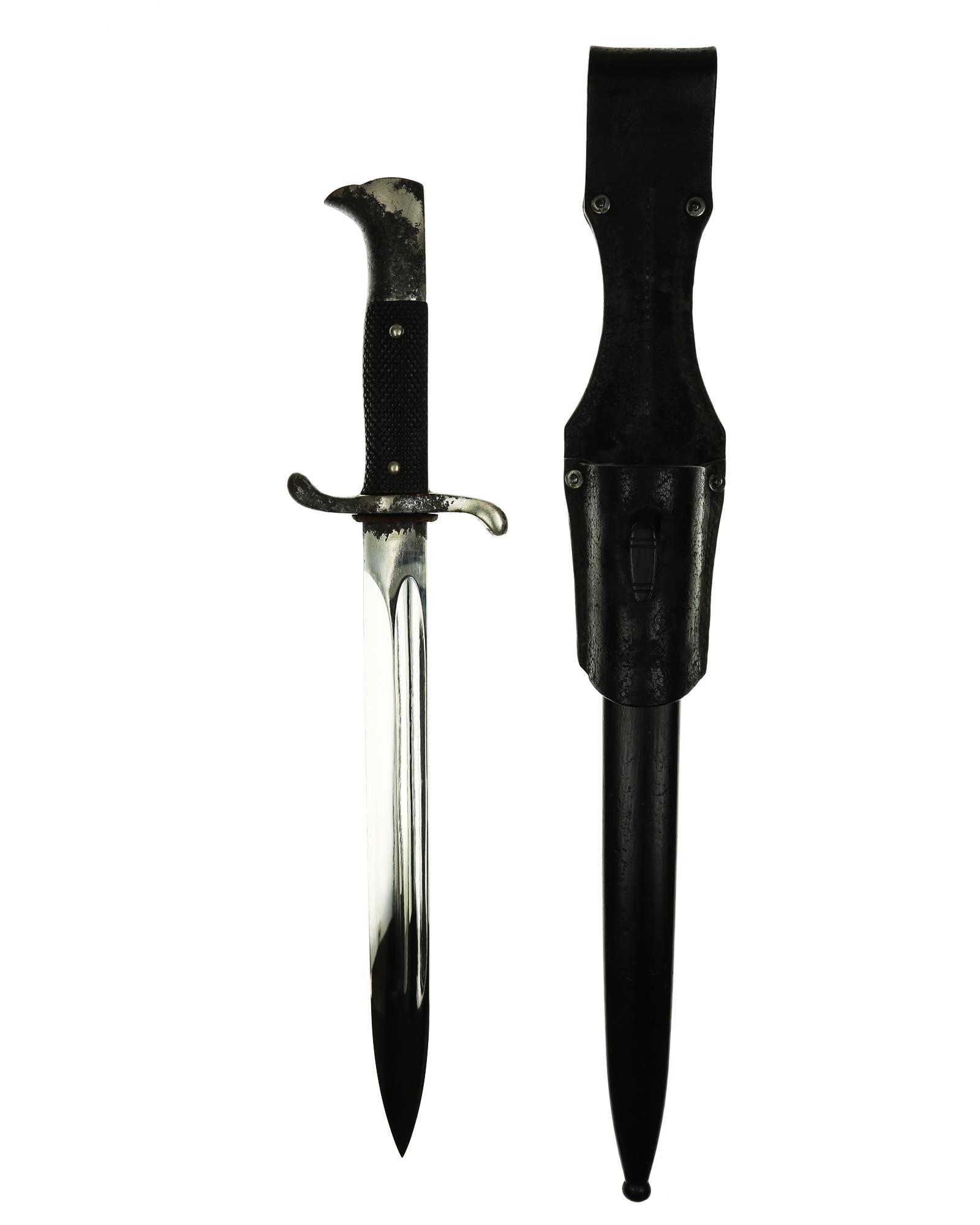 Feuerwehr Seitengewehr in einem gutem Zustand. Beide Griffschalen und Griffschrauben unbeschädigt. S-förmige Parierstange. Die Klinge ist einschneidig mit runden Hohlkehlen. Auf der Rückseite der Klinge befindet sich das Herstellerlogo: Carl Eickhorn Solingen. Stahlscheide mit schwarze Lackierung. Gesamtlänge beträgt 398 mm.