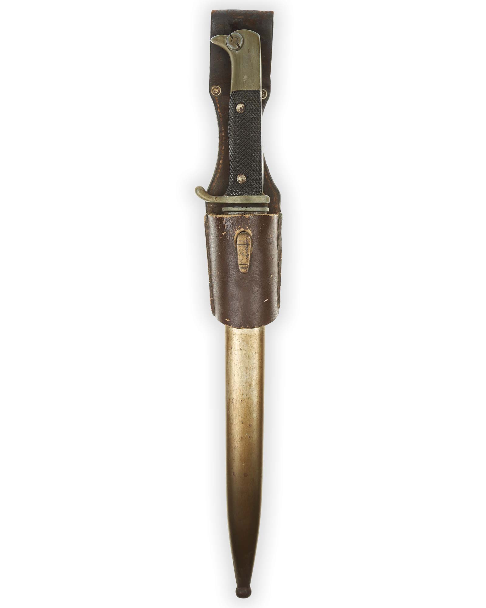 Langes Extra-Seitengewehr mit Ätzung Modell K98. Beide Griffschalen unbeschädigt. Die Klinge ist einschneidig mit runden Hohlkehlen. Auf der Rückseite der Klinge befindet sich das Herstellerlogo: Ernst Pack & Söhne Solingen und auf der Vorderseite die Ätzung "Zur Erinnerung an meine Dienstzeit". Stahlscheide mit Koppelschuh.