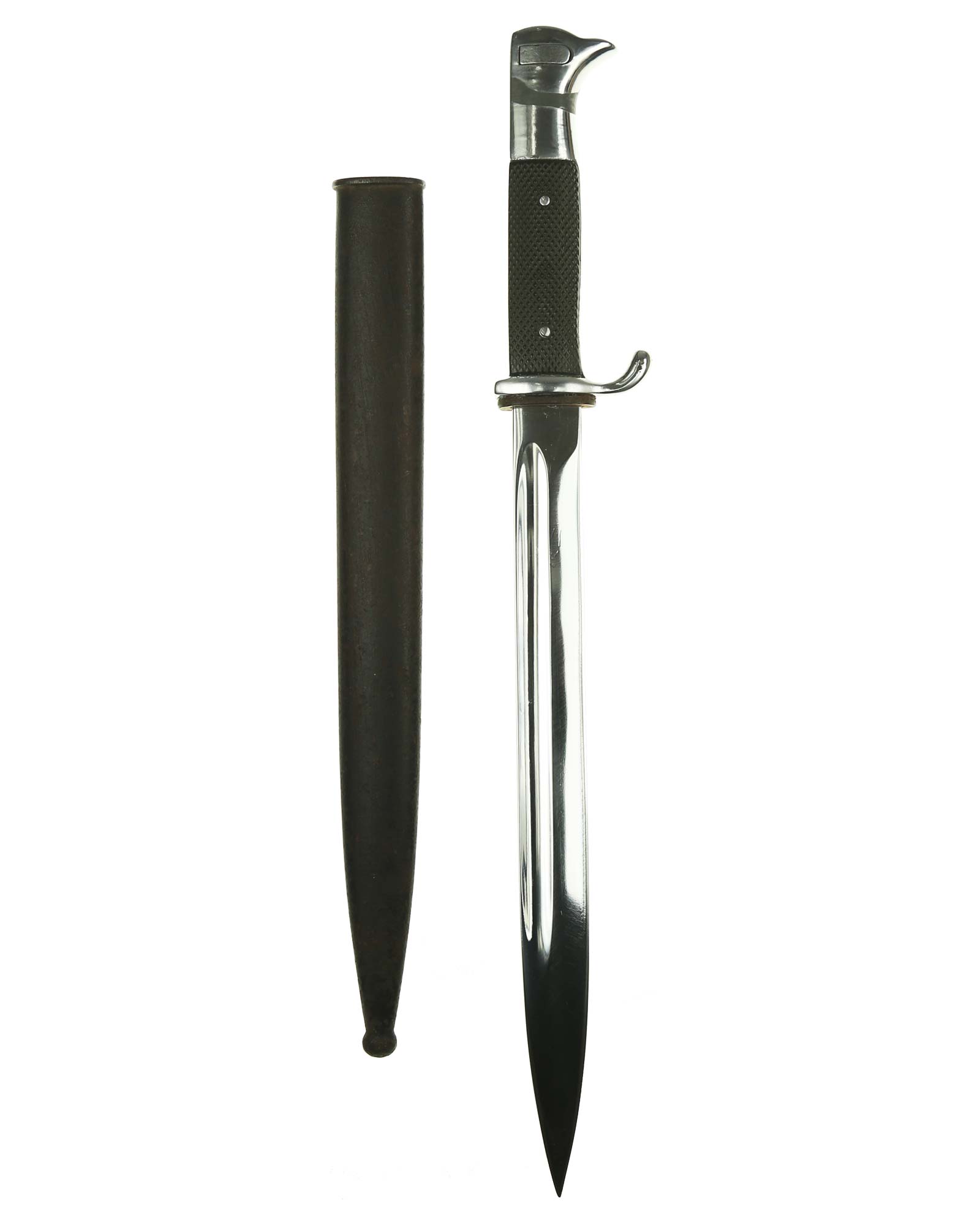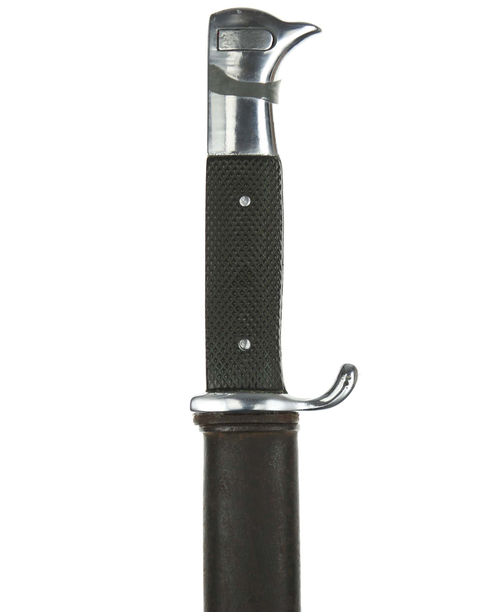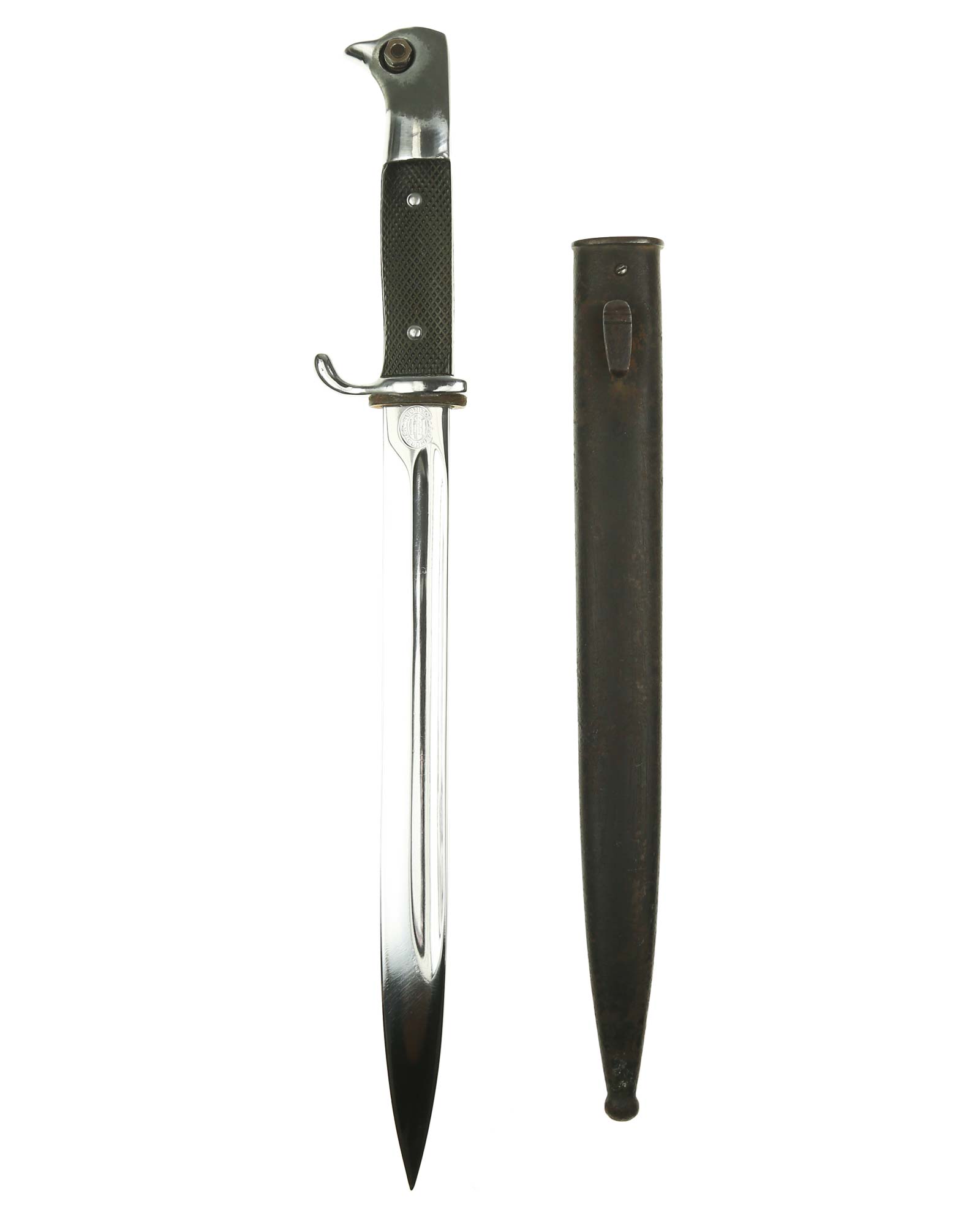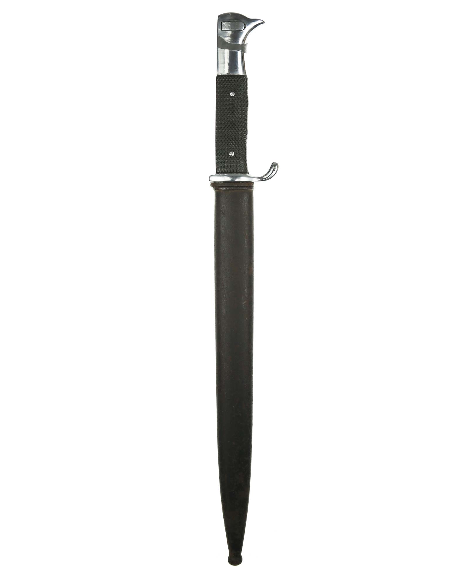 Langes Seitengewehr [K98] mit Hersteller. Beide Griffschalen und Griffschrauben unbeschädigt. Der Druckknopf fehlt. Die Klinge ist einschneidig mit runden Hohlkehlen. Auf der Vorderseite der Klinge befindet sich das Herstellerlogo: E. & F. Hörster Solingen. Gesamtlänge beträgt 400 mm.