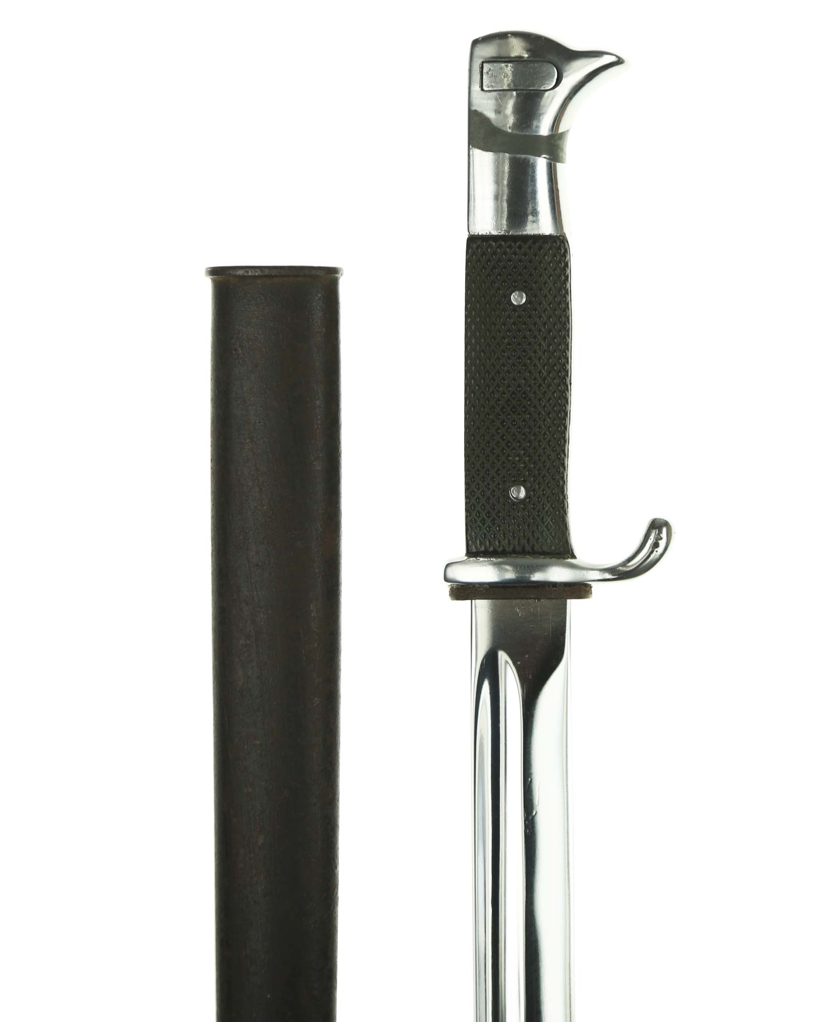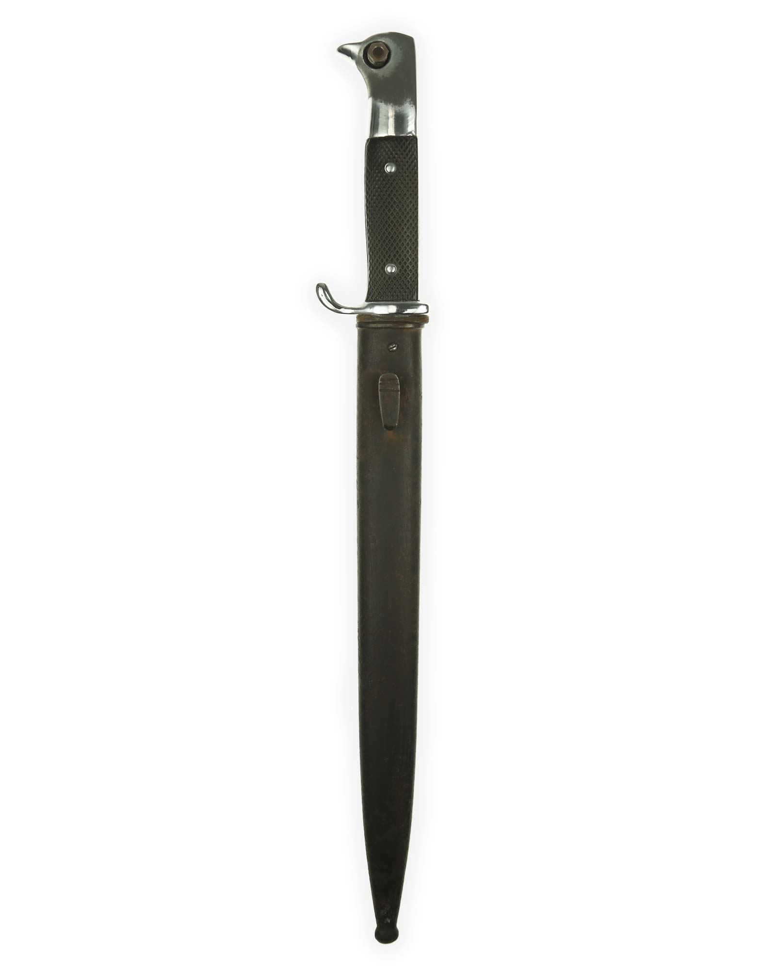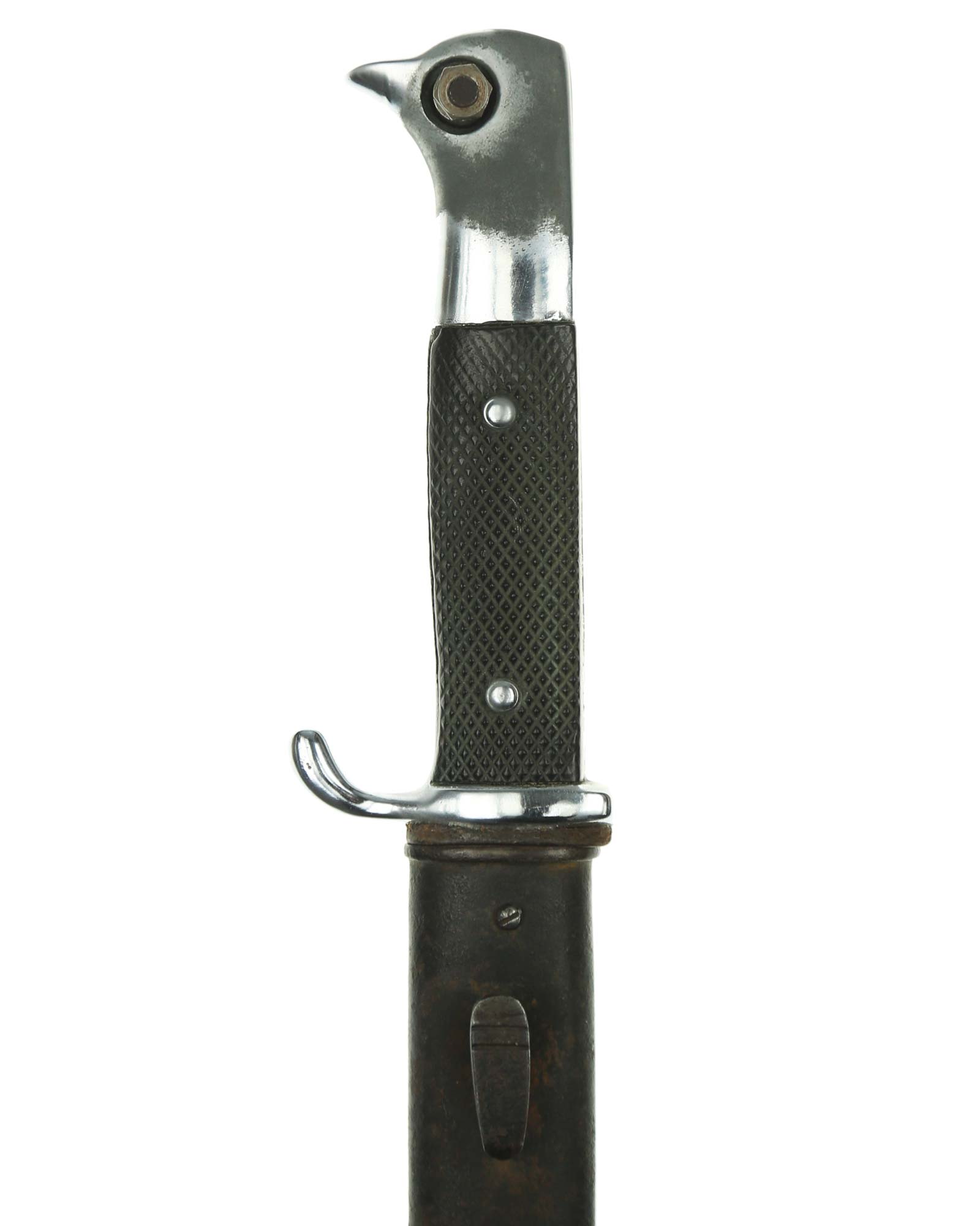 Langes Seitengewehr [K98] mit Hersteller. Beide Griffschalen und Griffschrauben unbeschädigt. Der Druckknopf fehlt. Die Klinge ist einschneidig mit runden Hohlkehlen. Auf der Vorderseite der Klinge befindet sich das Herstellerlogo: E. & F. Hörster Solingen. Gesamtlänge beträgt 400 mm.