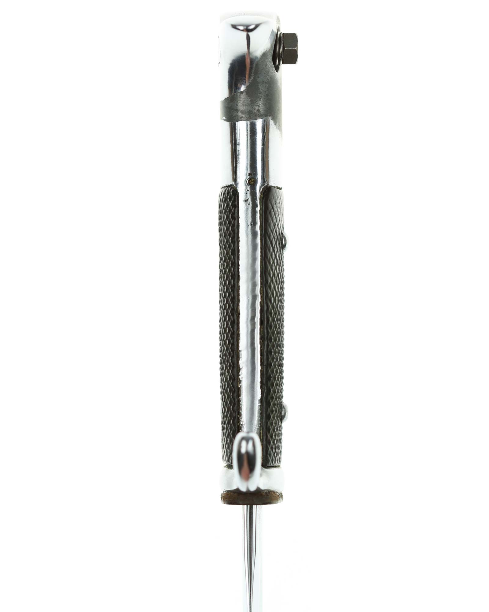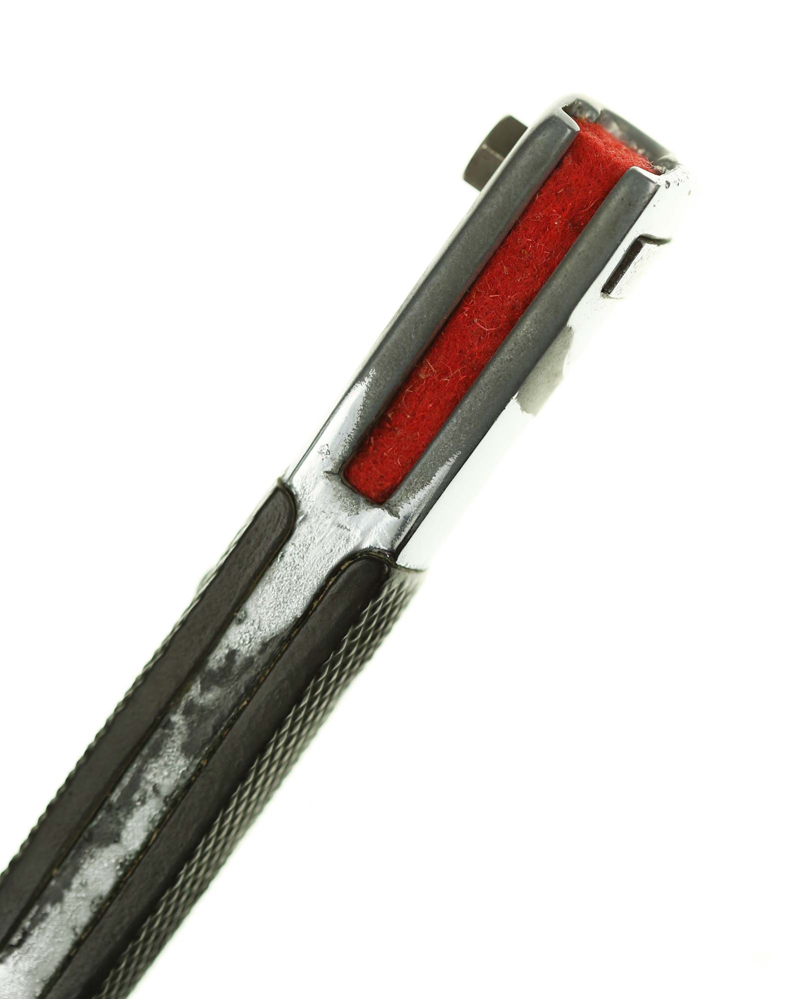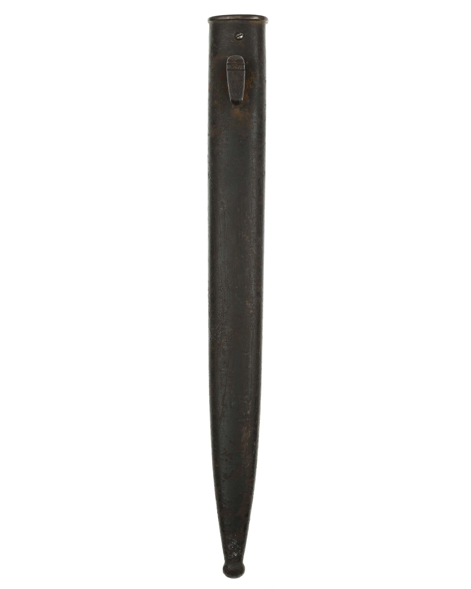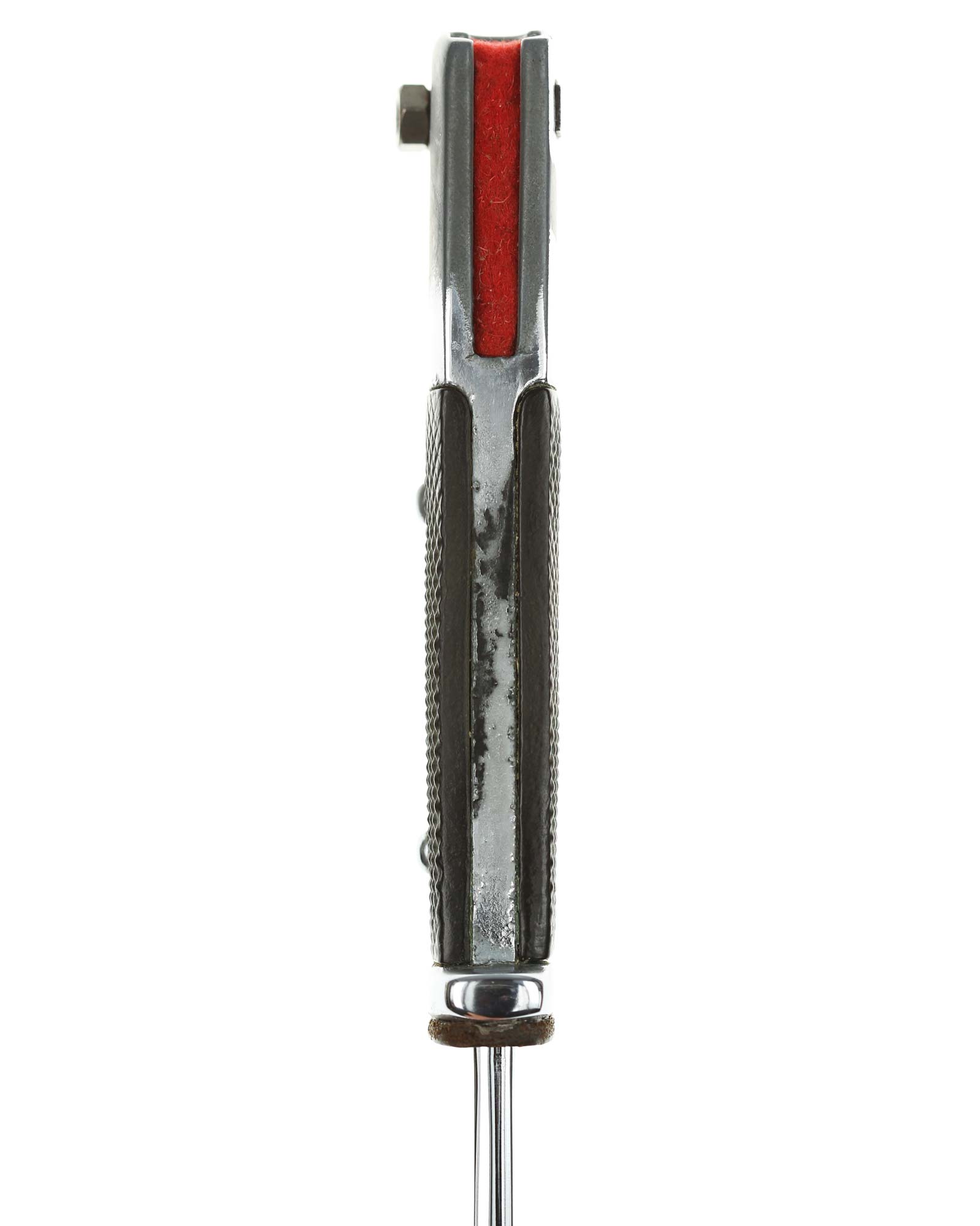 Langes Seitengewehr [K98] mit Hersteller. Beide Griffschalen und Griffschrauben unbeschädigt. Der Druckknopf fehlt. Die Klinge ist einschneidig mit runden Hohlkehlen. Auf der Vorderseite der Klinge befindet sich das Herstellerlogo: E. & F. Hörster Solingen. Gesamtlänge beträgt 400 mm.