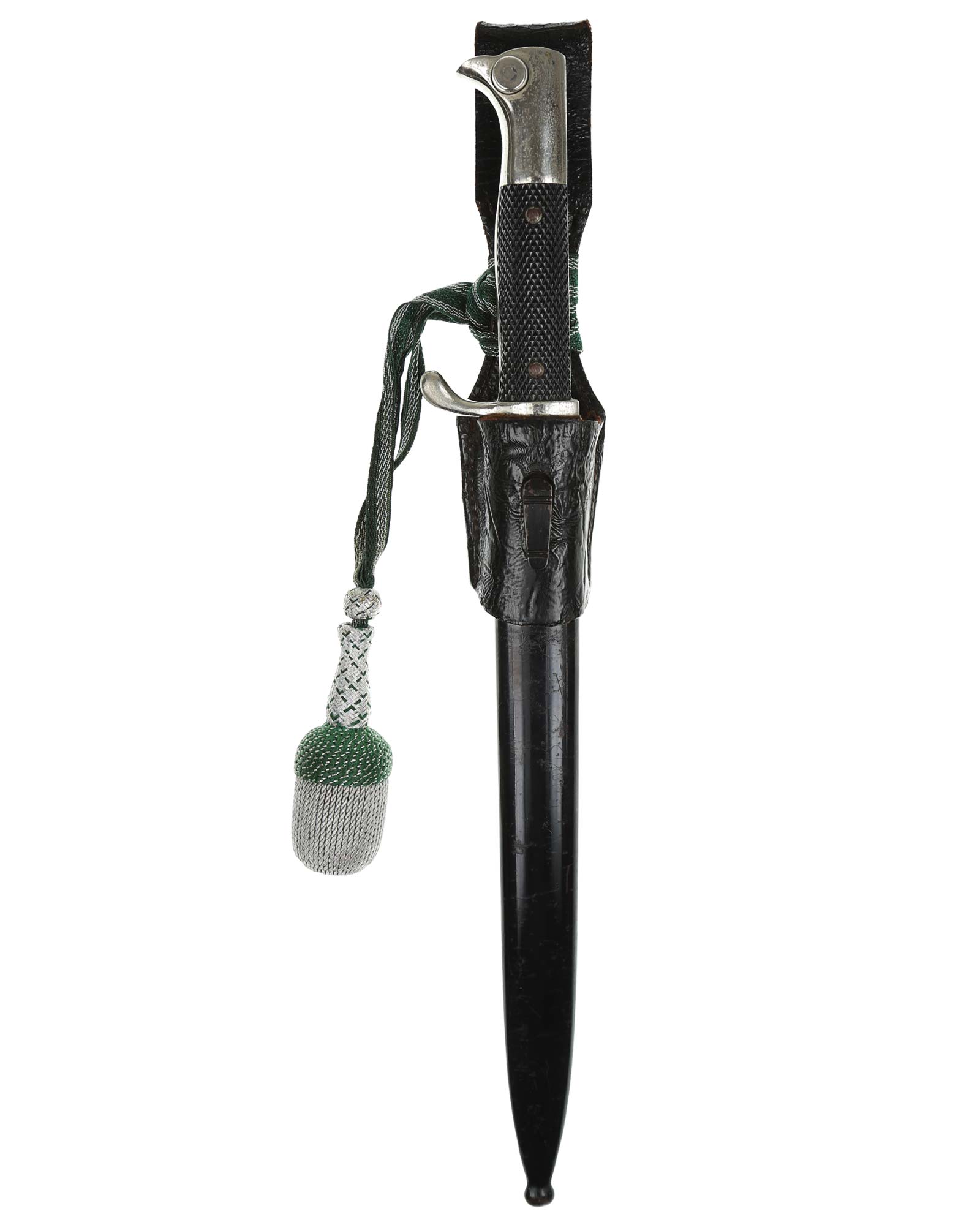 Langes Seitengewehr [K98] mit Leder-Koppelschuh und Portepee. Beide Griffschalen und Griffschrauben unbeschädigt. Druckknopf funktioniert einwandfrei. Die Klinge ist einschneidig mit runden Hohlkehlen. Auf der Rückseite der Klinge befindet sich das Herstellerlogo: Carl Eickhorn Solingen. Stahlscheide mit originaler Lackierung. Gesamtlänge beträgt 400 mm.