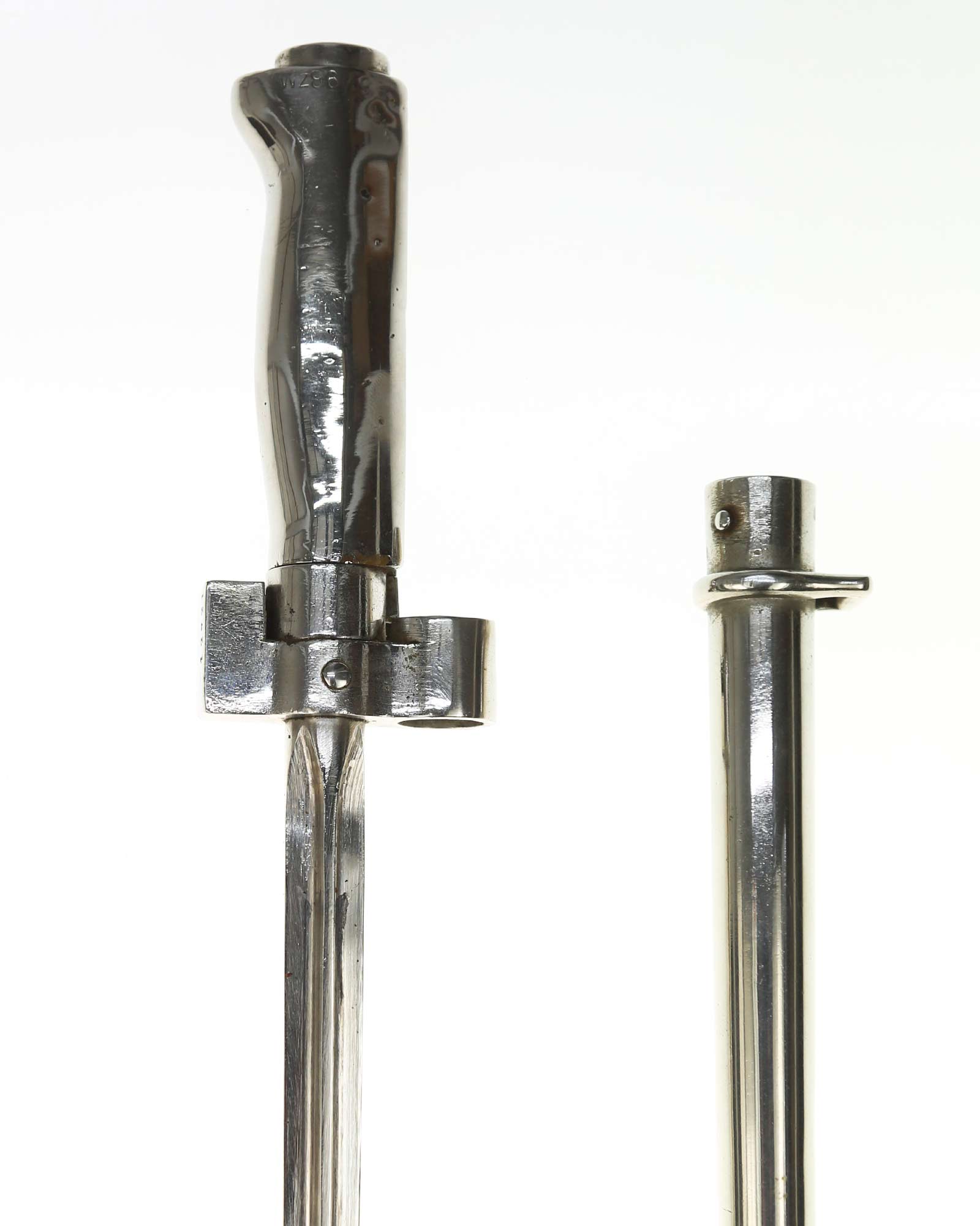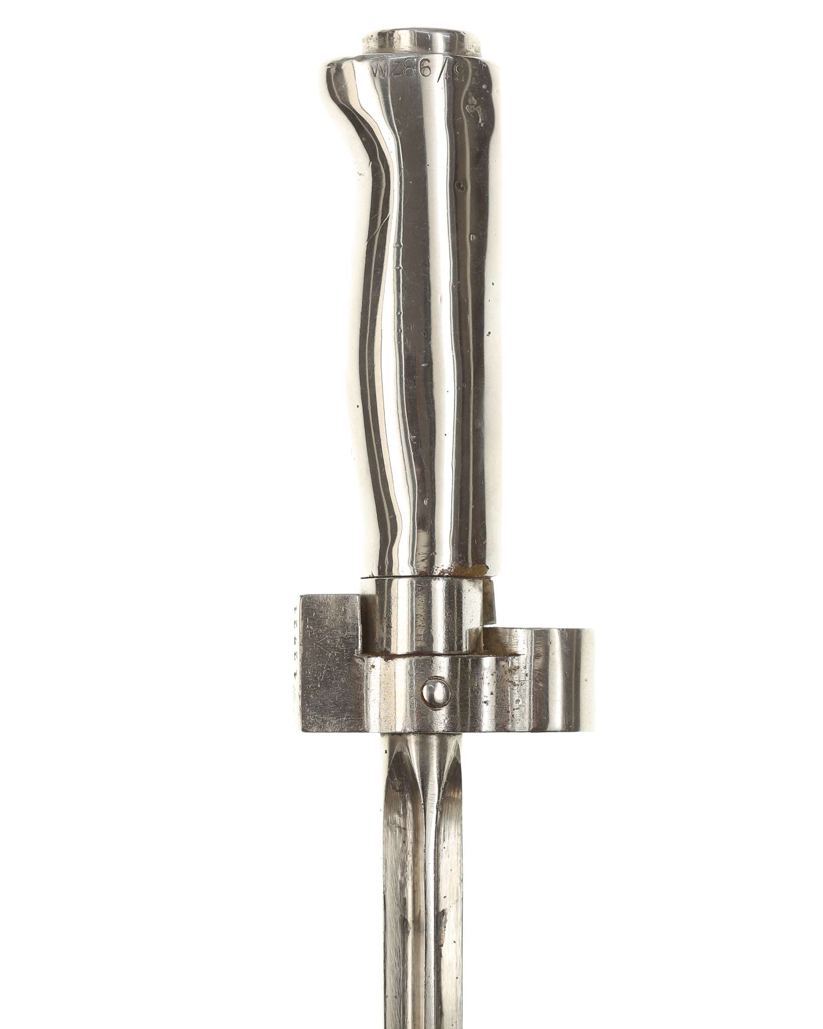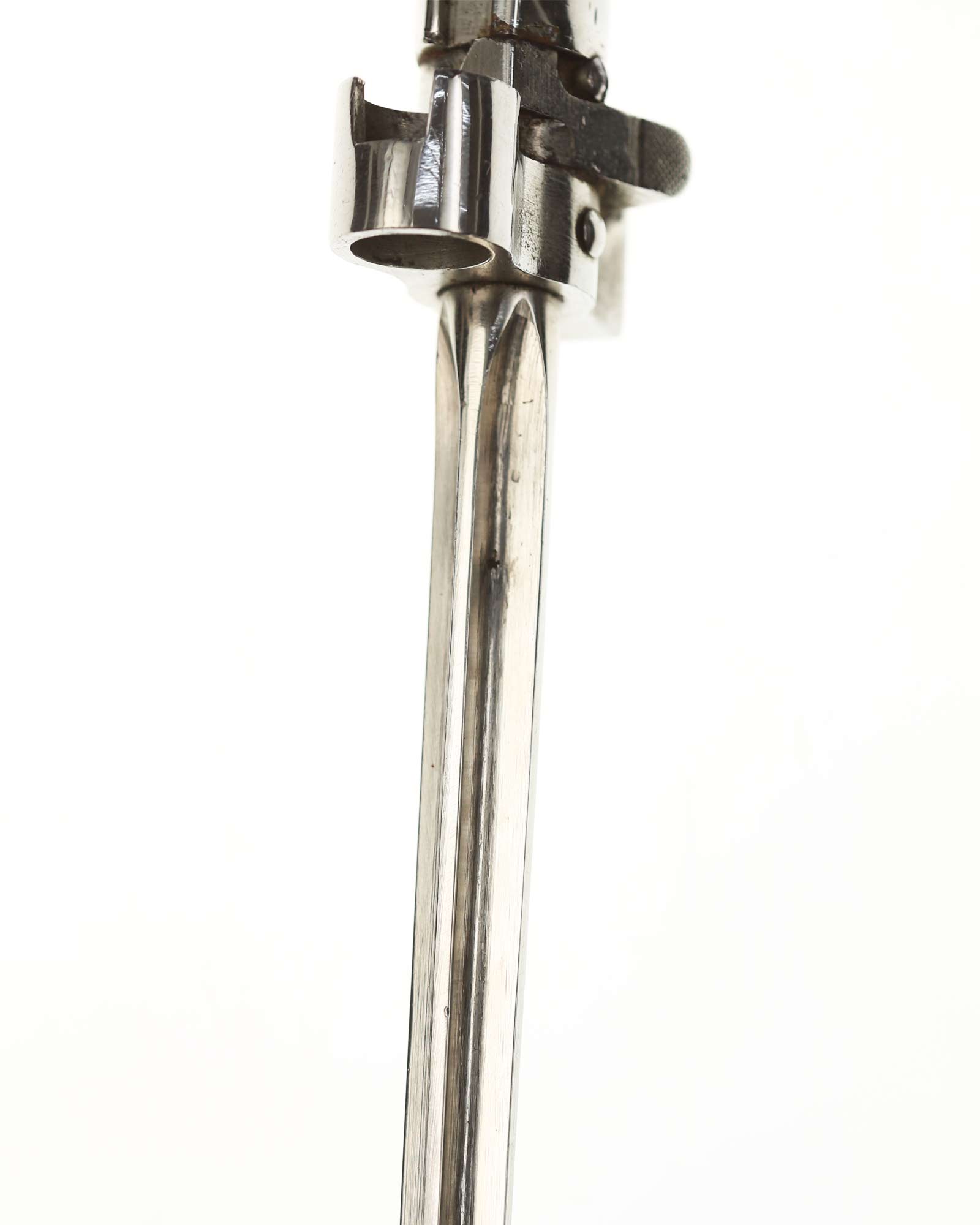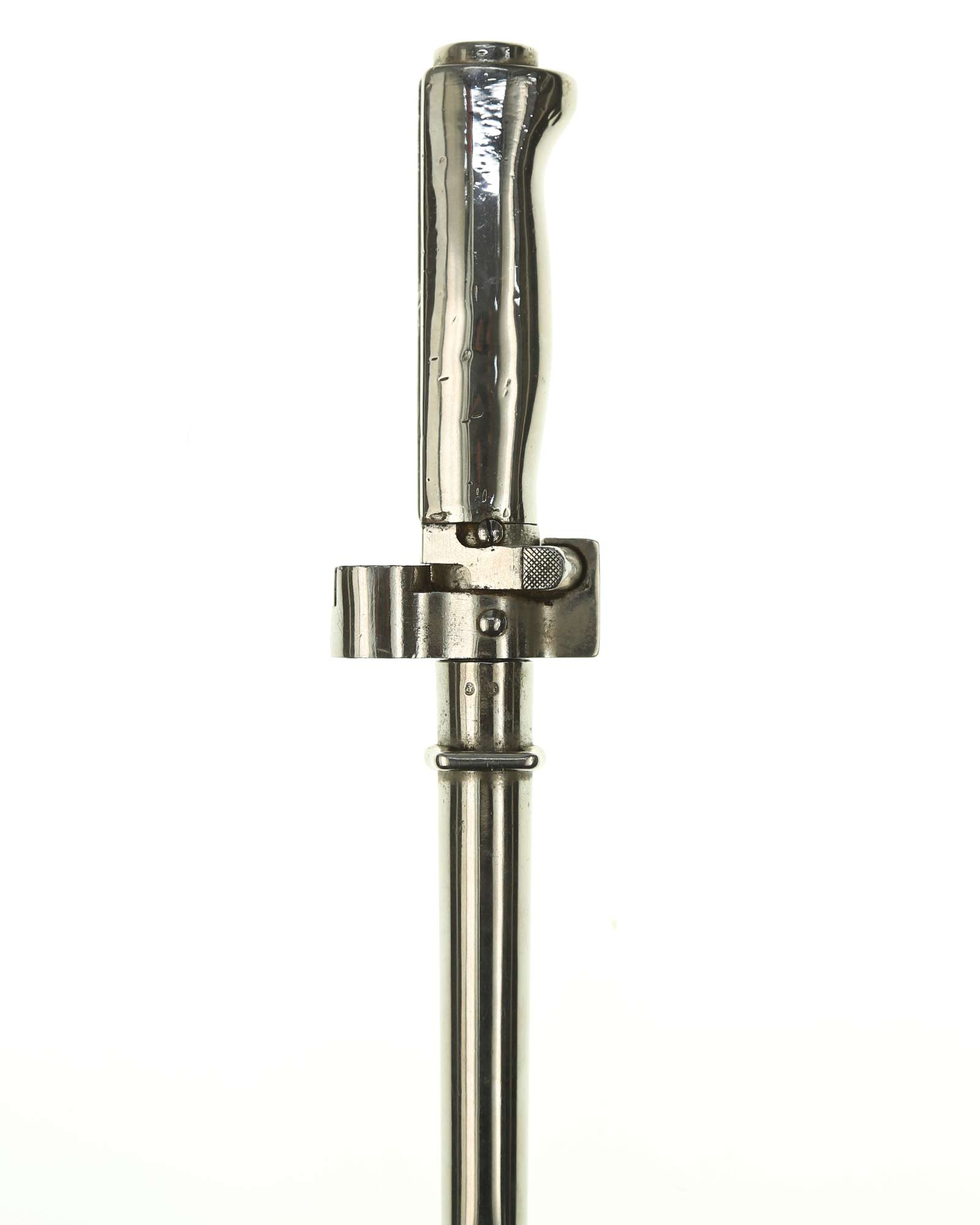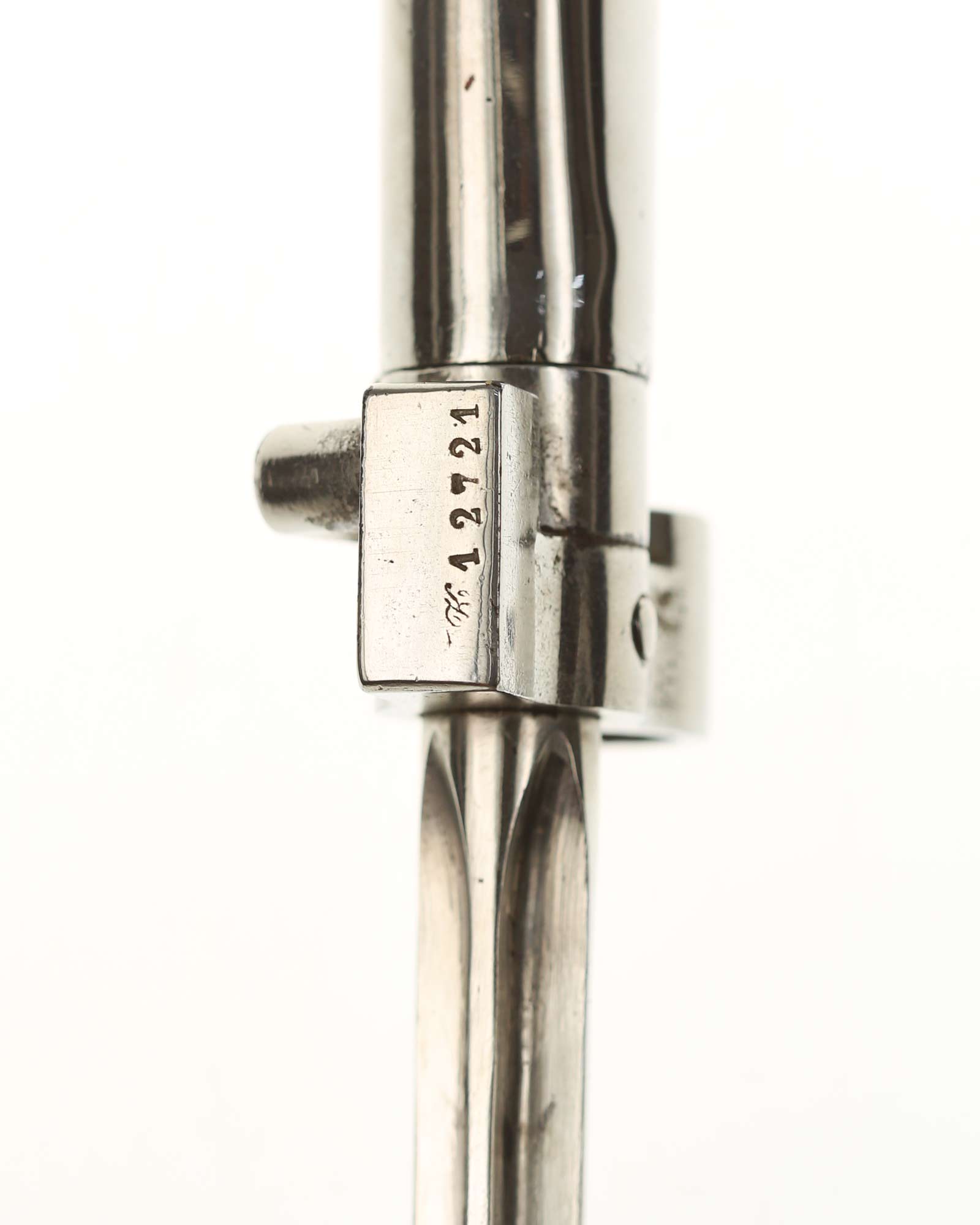 Frankreich Lebel-Bajonett M1886-15, Seitengewehr zum Infantriegewehr System Lebel. Griff mit stählerner Aufpflanzeinrichtung, im Querschnitt kreuzförmige spitz zulaufende Klinge, stählerne Rundscheide mit fester Trageöse.