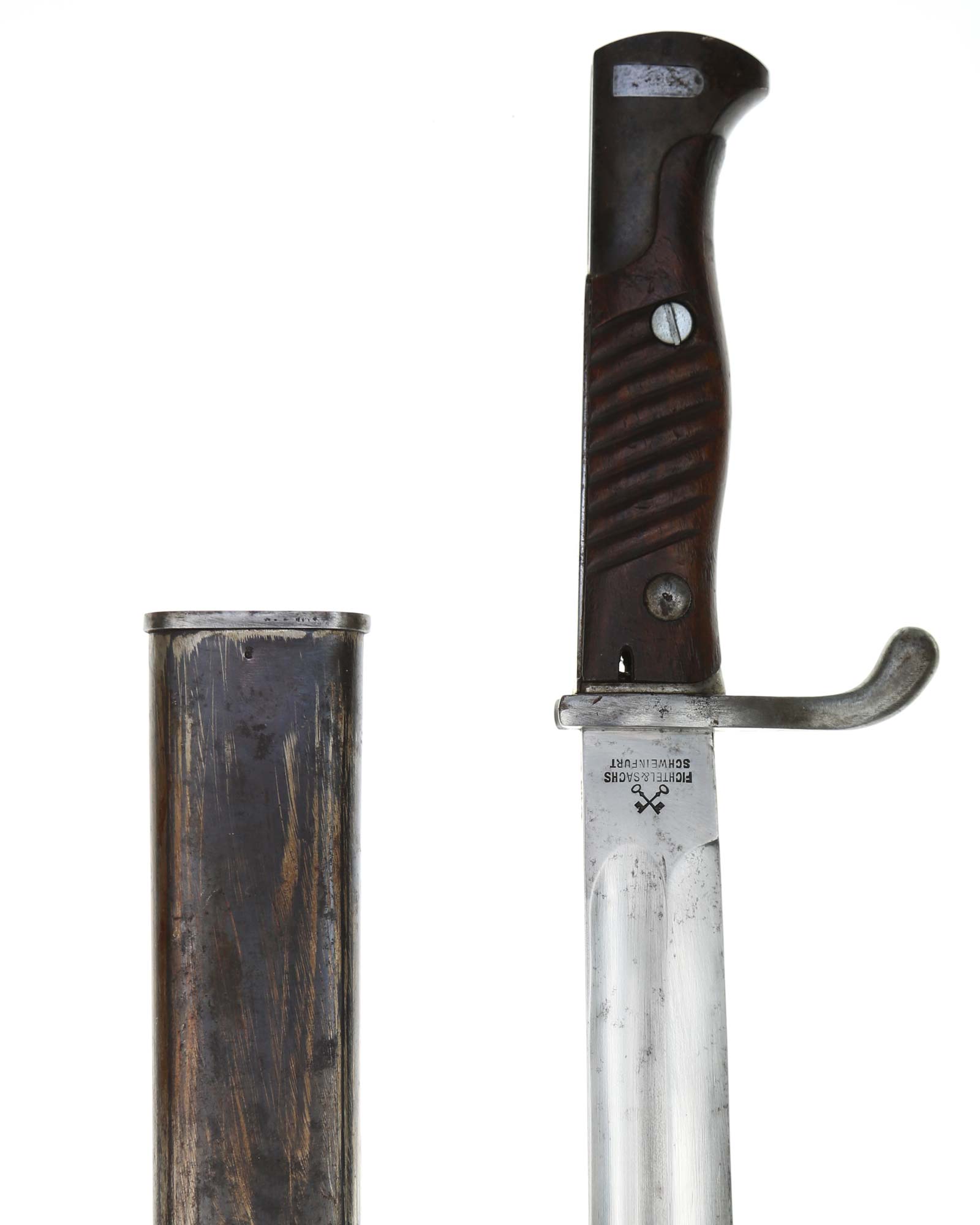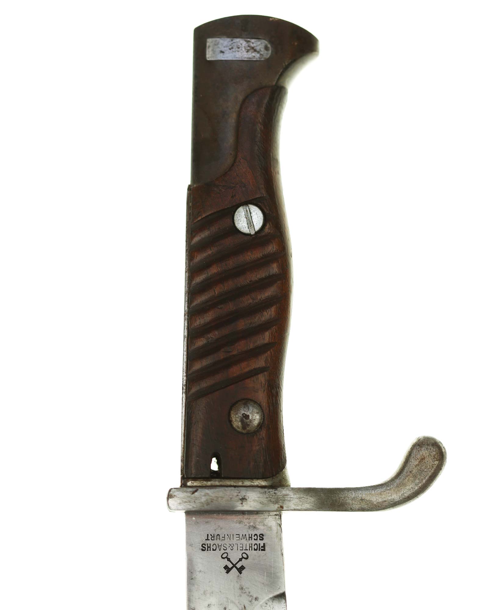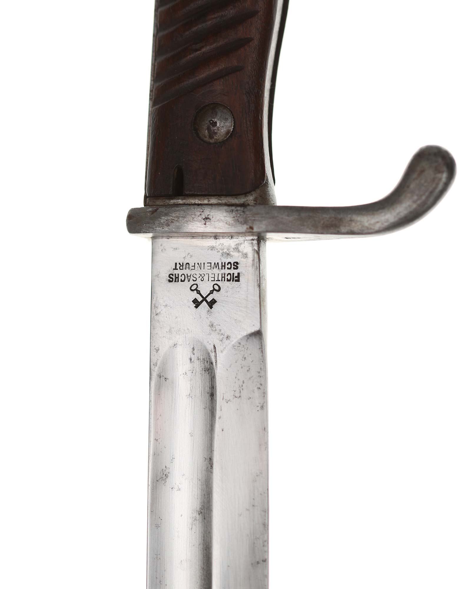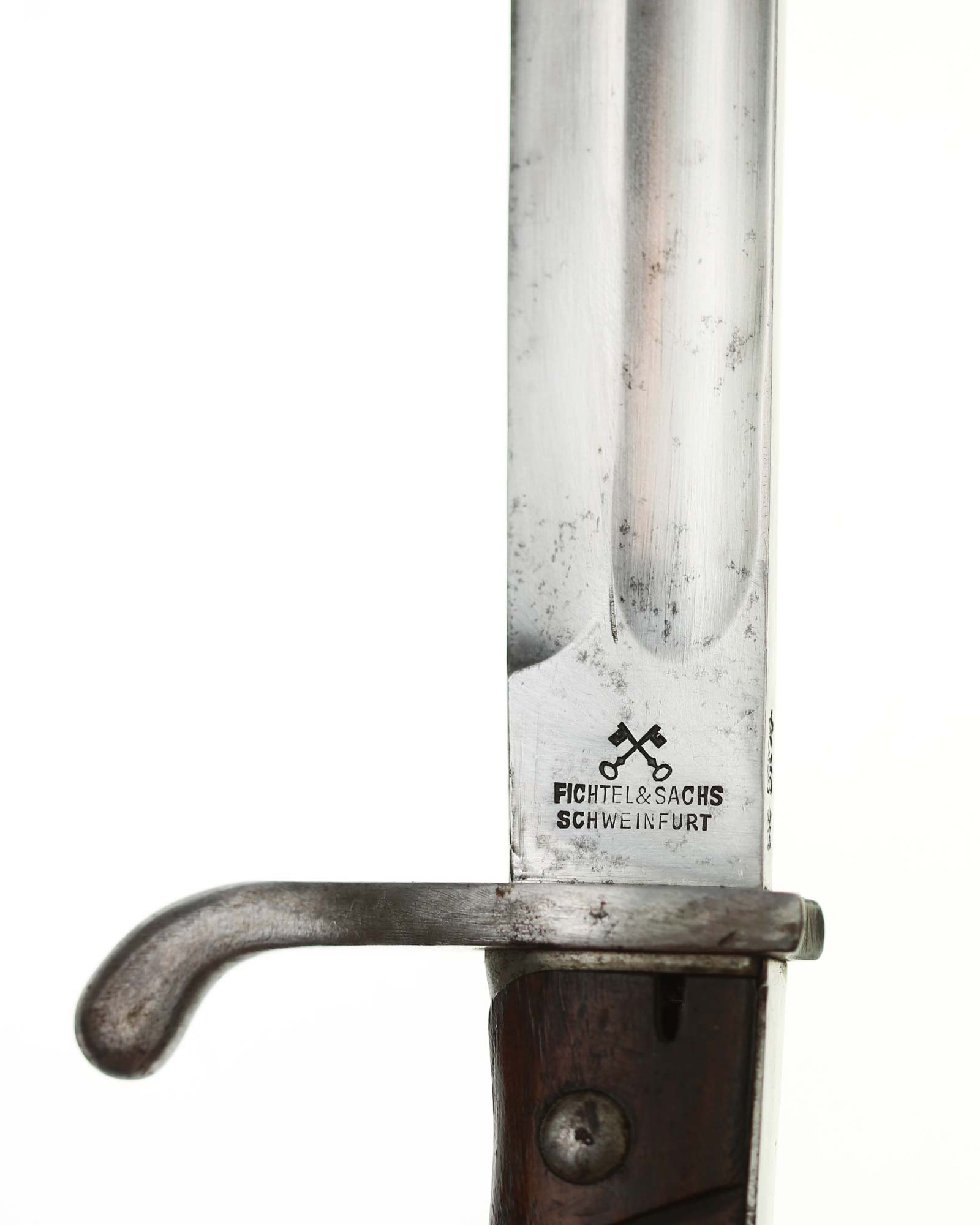Infanterie Seitengewehr SG 98/05 mit dem Hersteller: Fichtel & Sachs Schweinfurt. Griff mit zwei, gerillten Holzgriffschalen, obere Schraube erneuert. Griff, Klinge und beiden Scheidenbeschläge vernickelt. Die Klinge ist einschneidig und blank, auf der Rückseite befindet sich die Herstellermarkierung, Abnahmestempel (19)16 unter gekröntem L (Ludwig III, Bayern). Die Scheide ist brüniert.