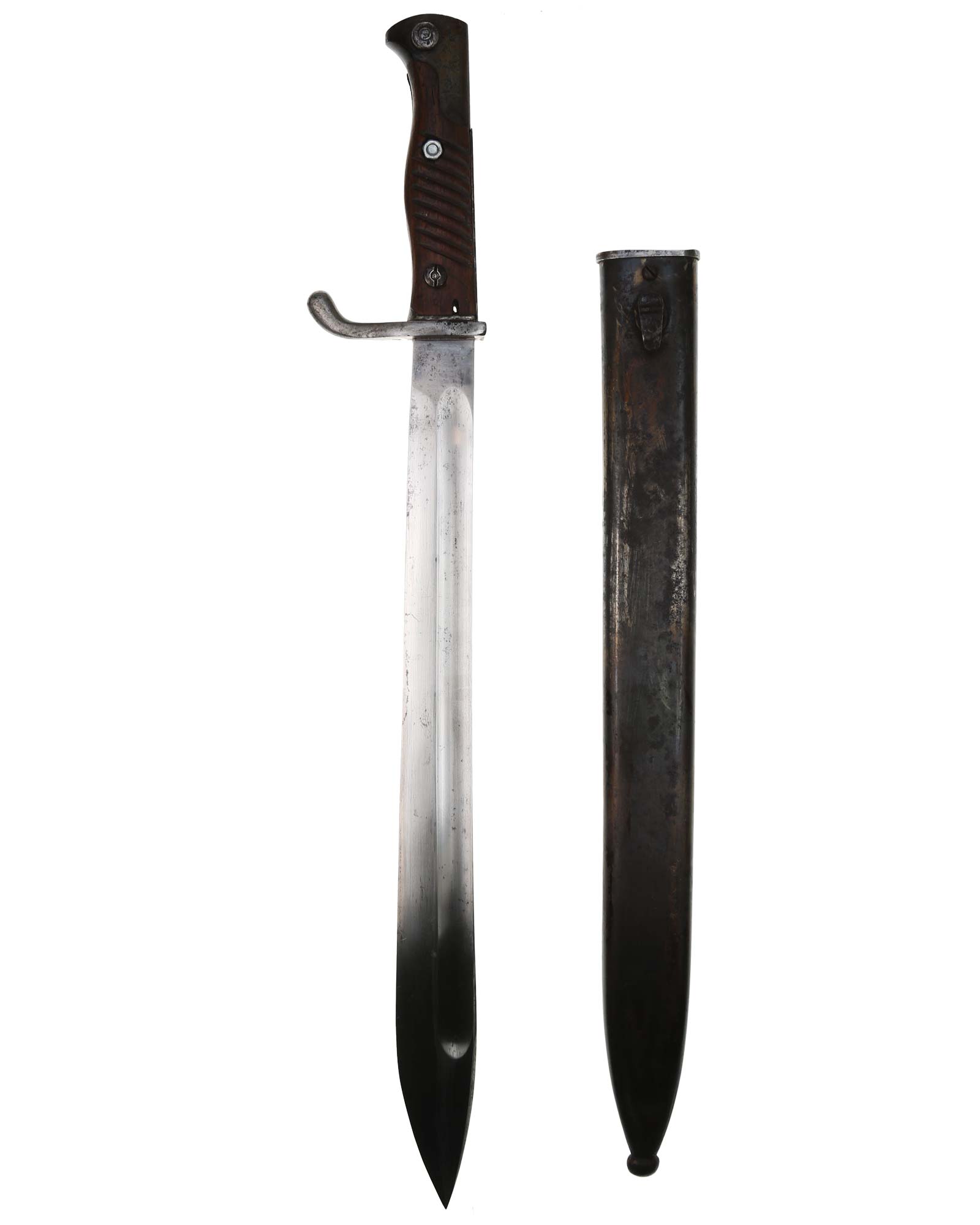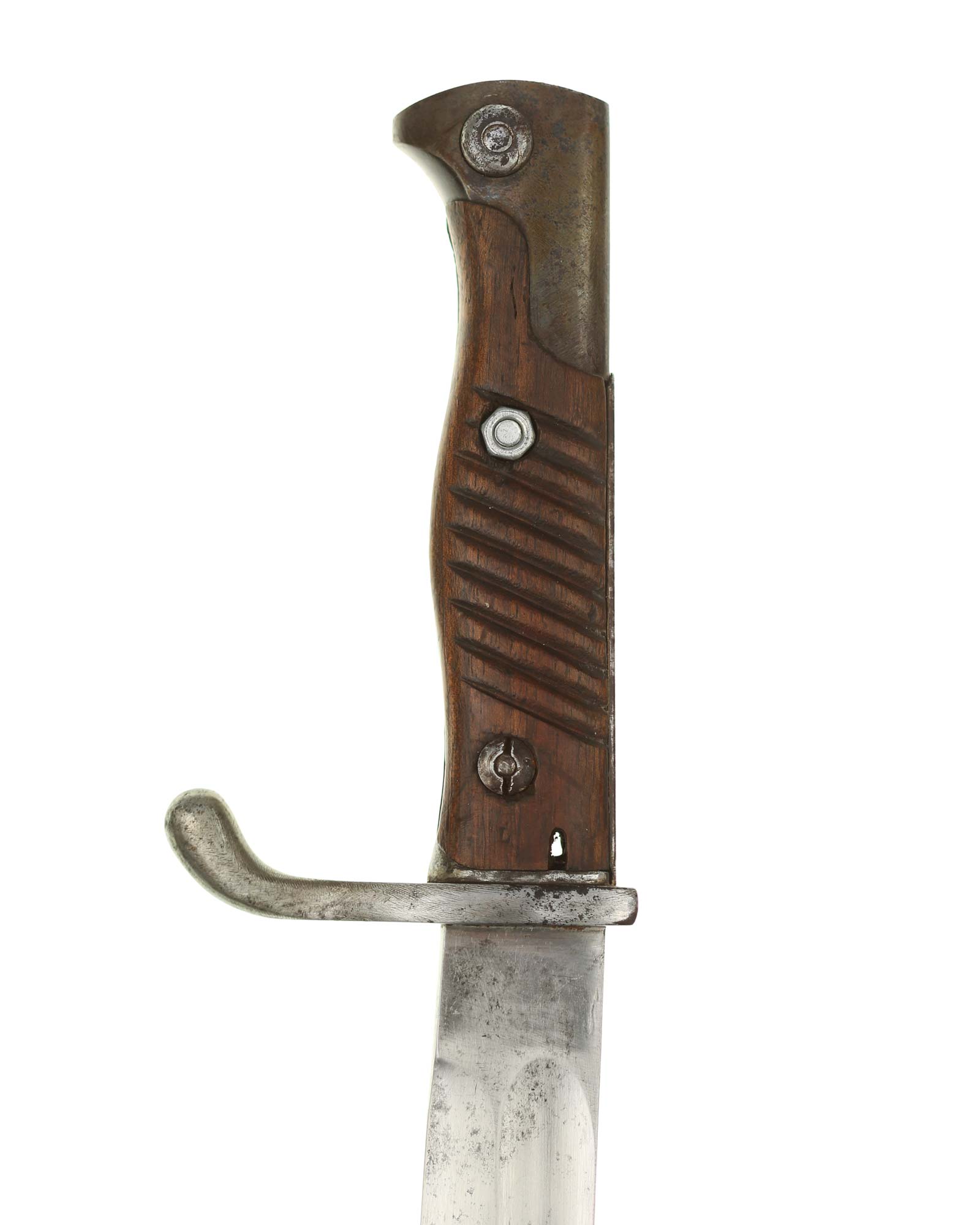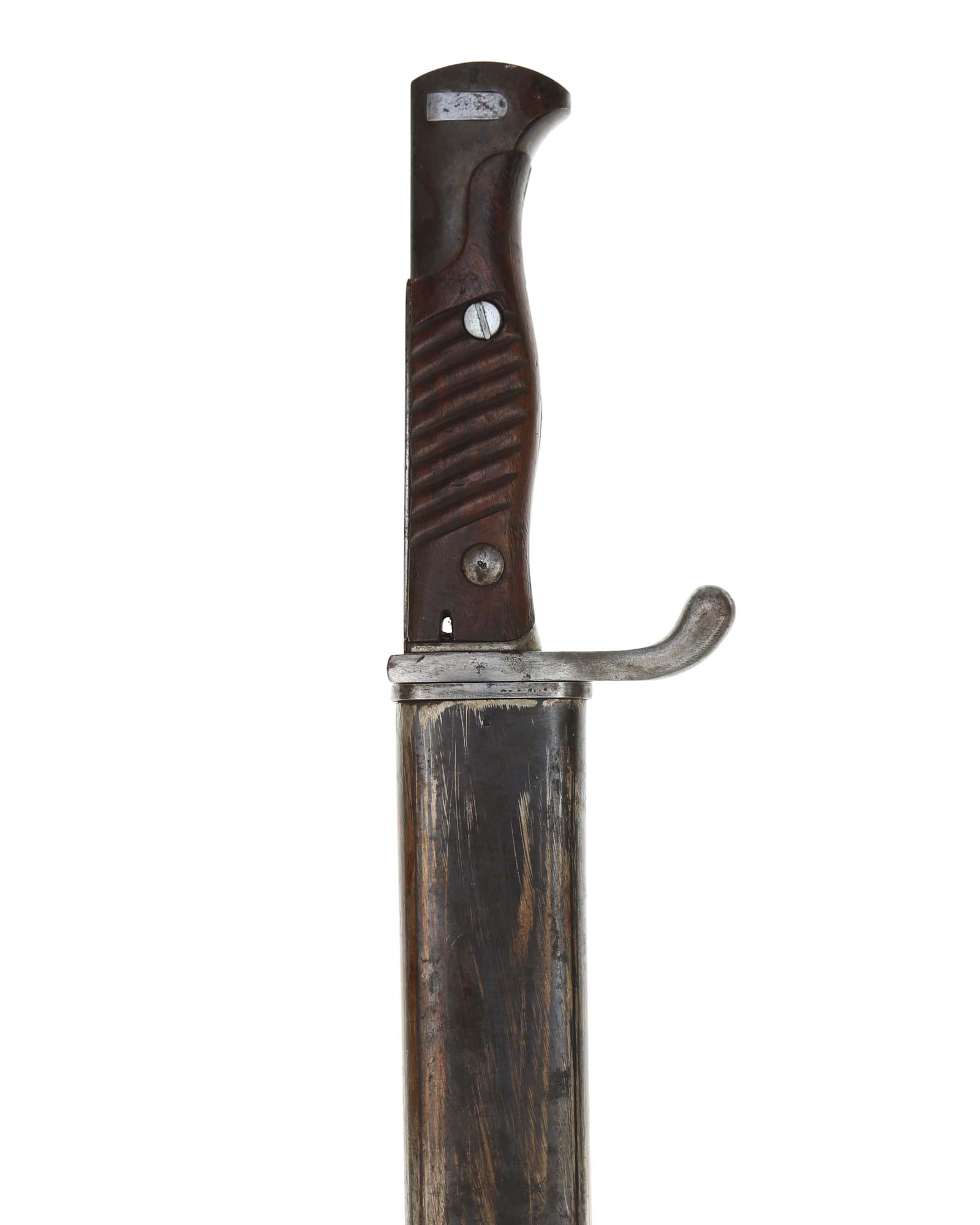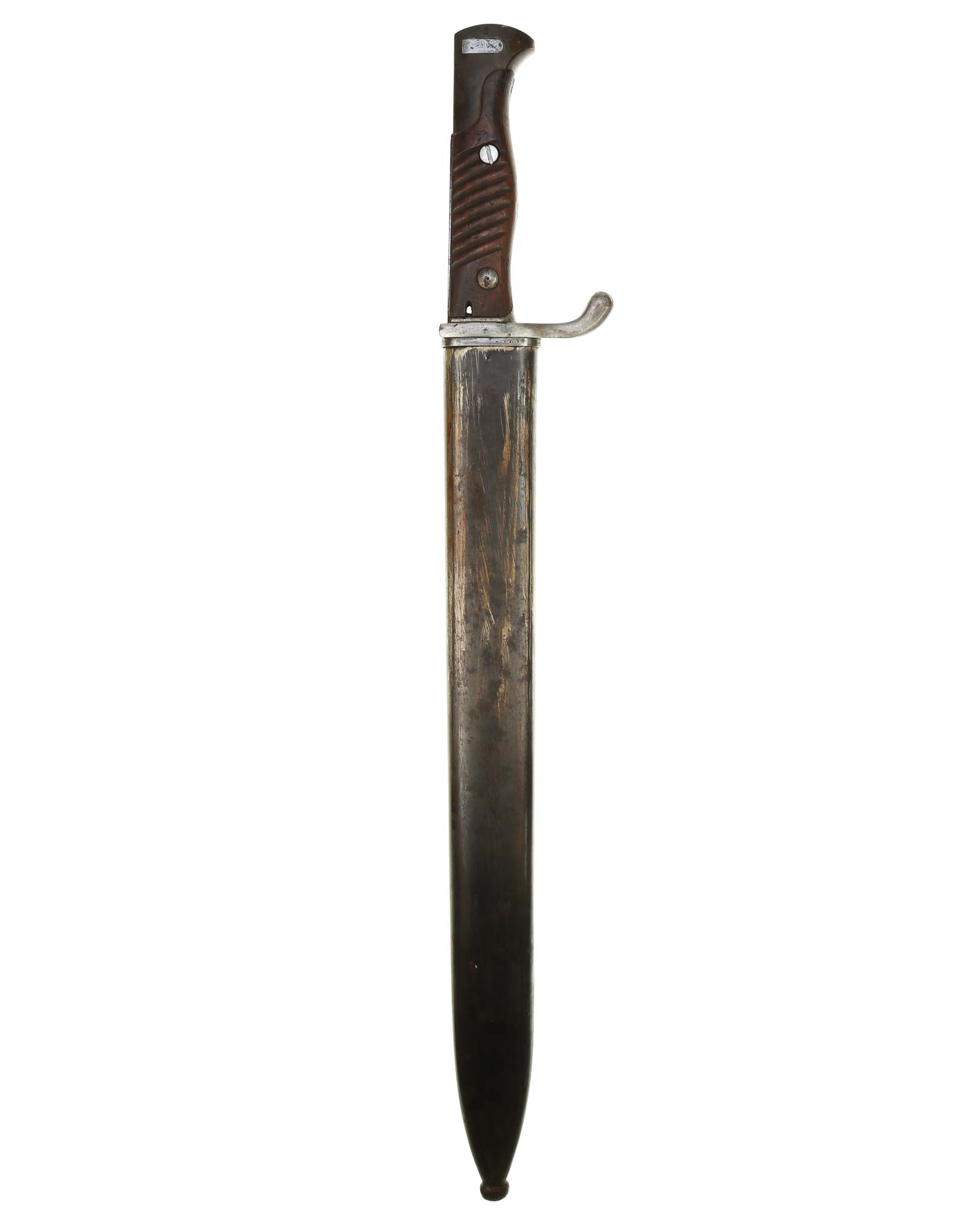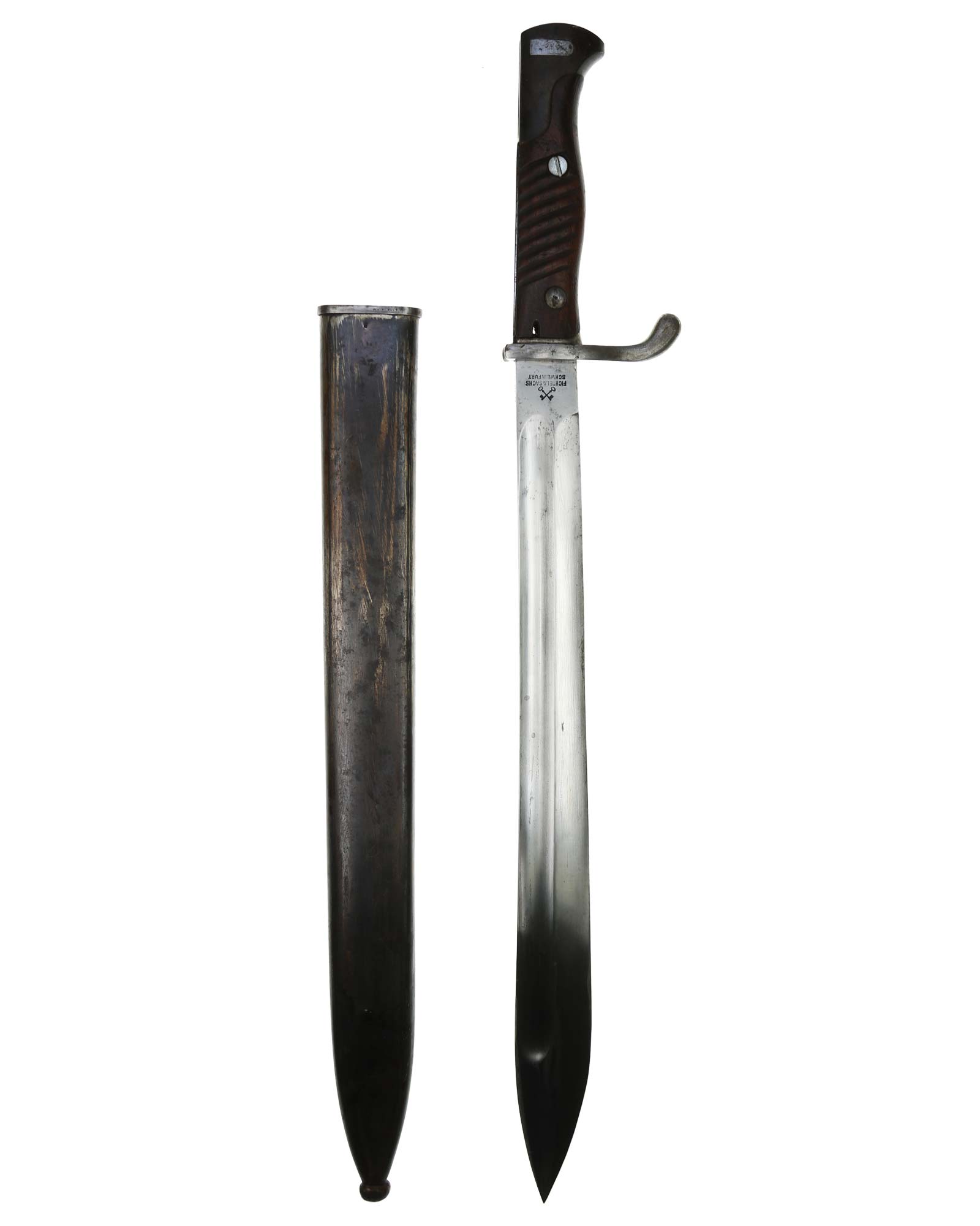 Infanterie Seitengewehr SG 98/05 mit dem Hersteller: Fichtel & Sachs Schweinfurt. Griff mit zwei, gerillten Holzgriffschalen, obere Schraube erneuert. Griff, Klinge und beiden Scheidenbeschläge vernickelt. Die Klinge ist einschneidig und blank, auf der Rückseite befindet sich die Herstellermarkierung, Abnahmestempel (19)16 unter gekröntem L (Ludwig III, Bayern). Die Scheide ist brüniert.