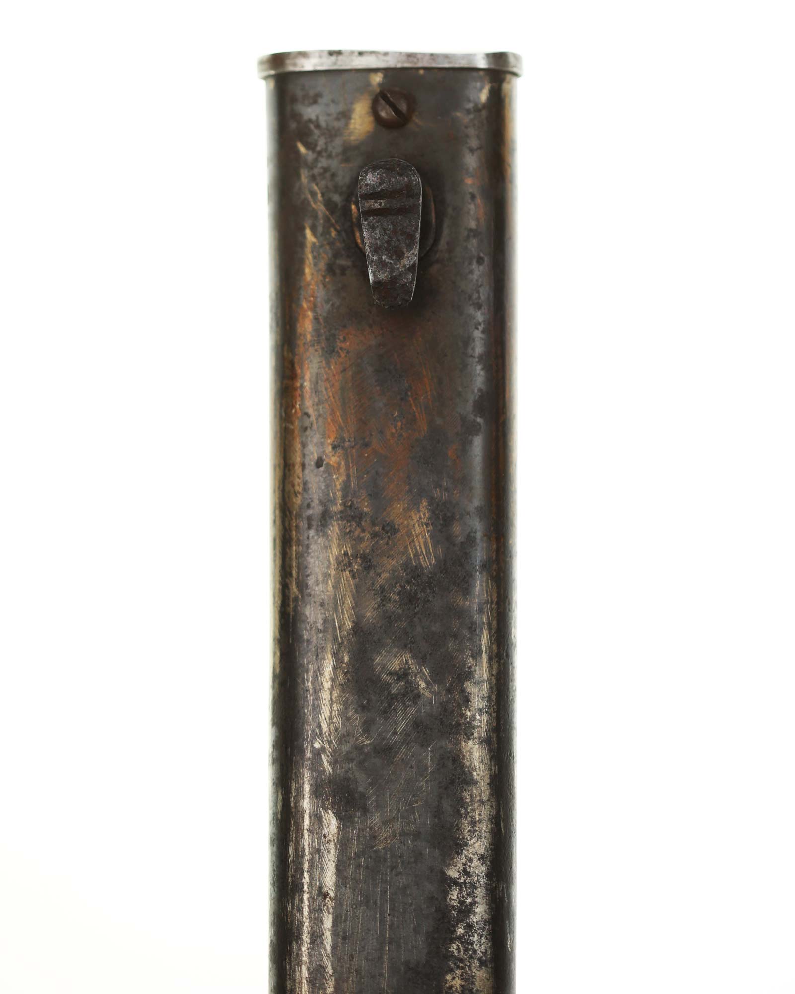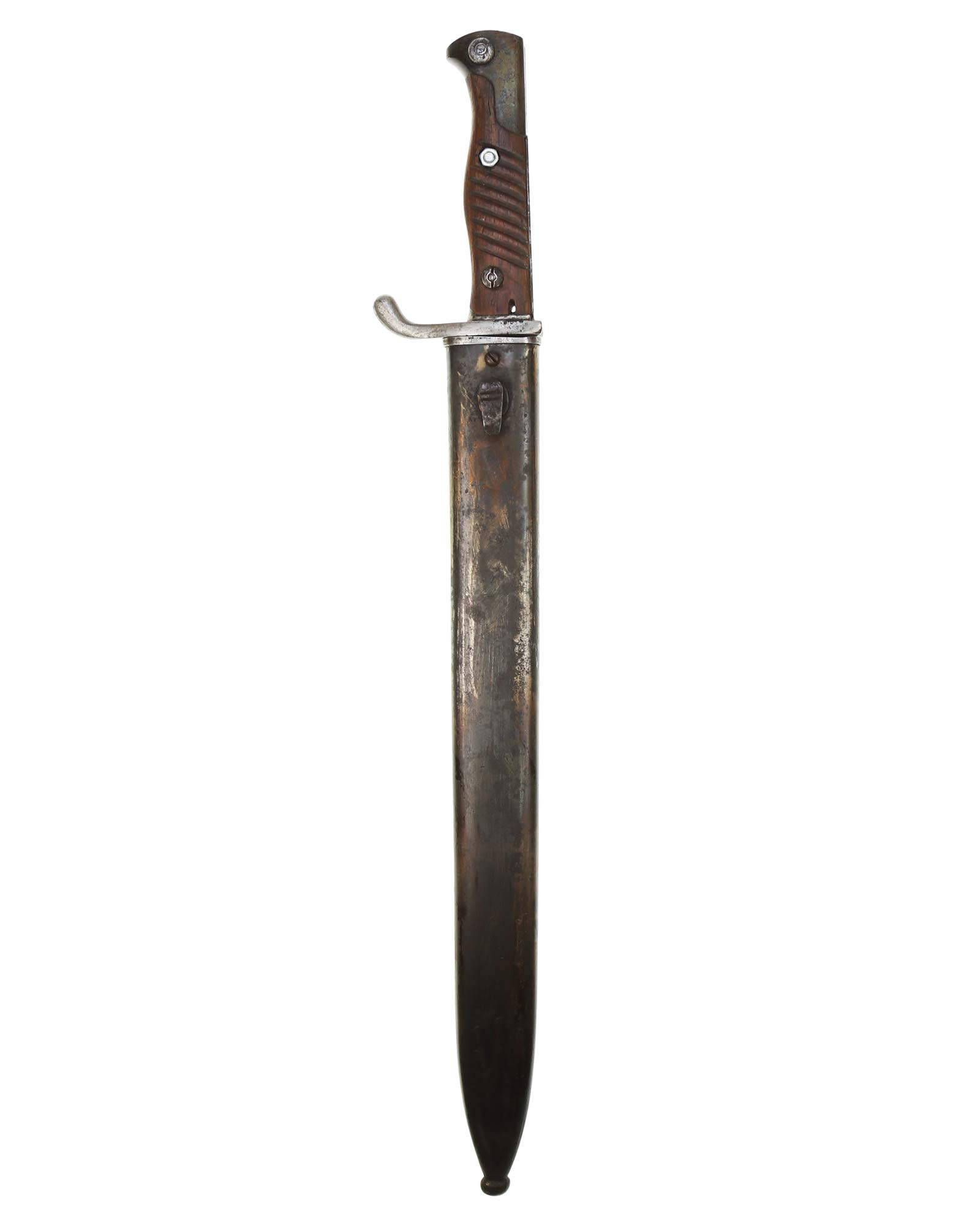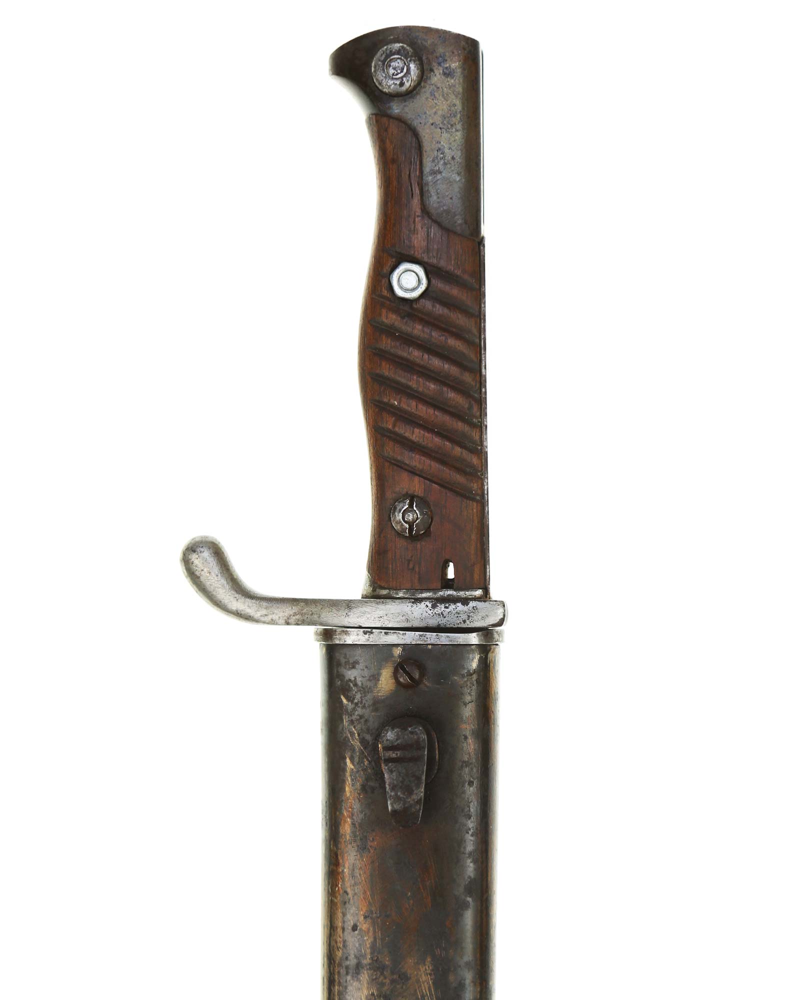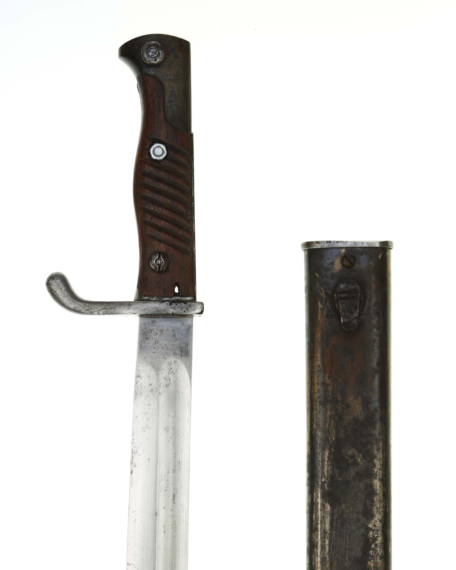 Infanterie Seitengewehr SG 98/05 mit dem Hersteller: Fichtel & Sachs Schweinfurt. Griff mit zwei, gerillten Holzgriffschalen, obere Schraube erneuert. Griff, Klinge und beiden Scheidenbeschläge vernickelt. Die Klinge ist einschneidig und blank, auf der Rückseite befindet sich die Herstellermarkierung, Abnahmestempel (19)16 unter gekröntem L (Ludwig III, Bayern). Die Scheide ist brüniert.