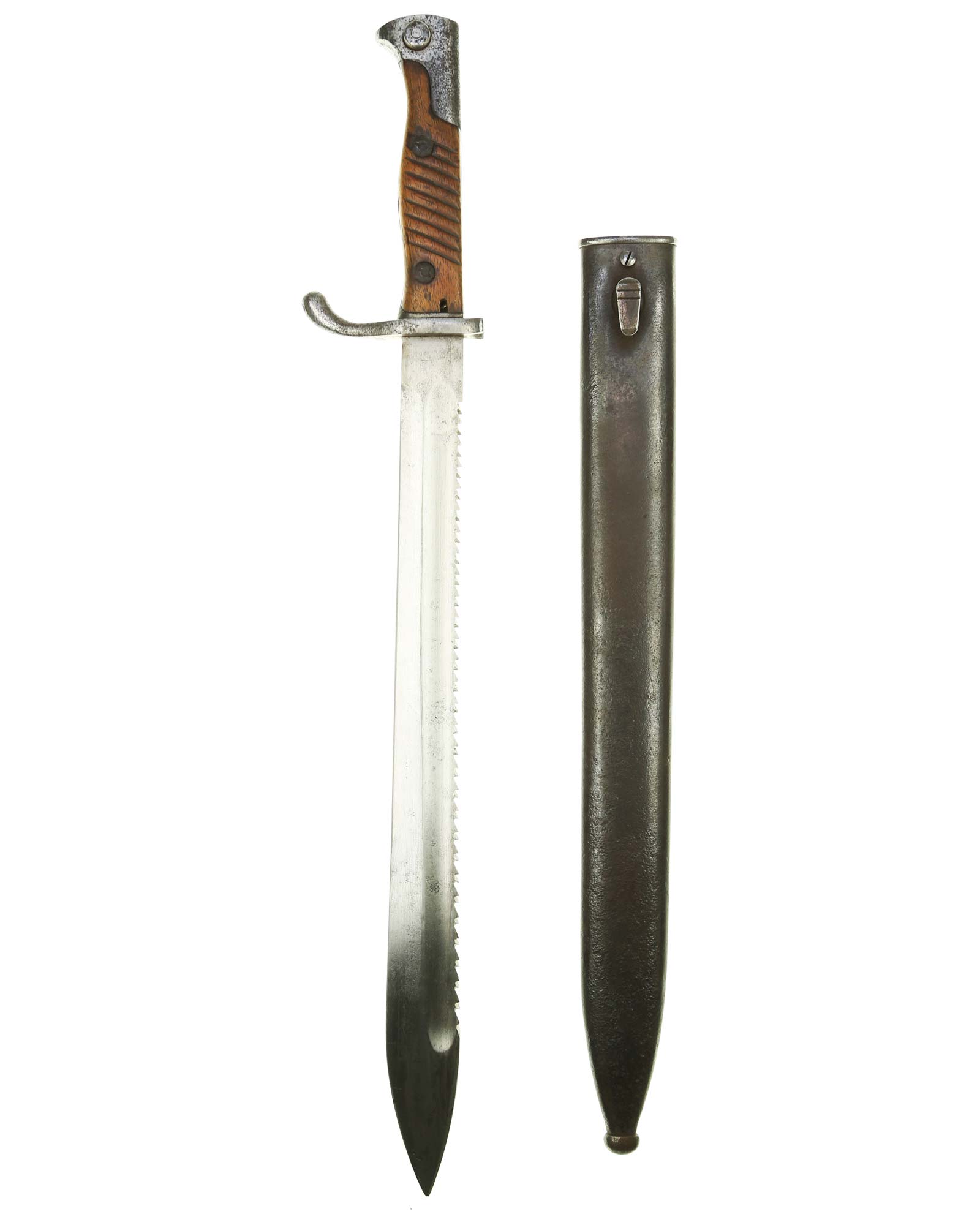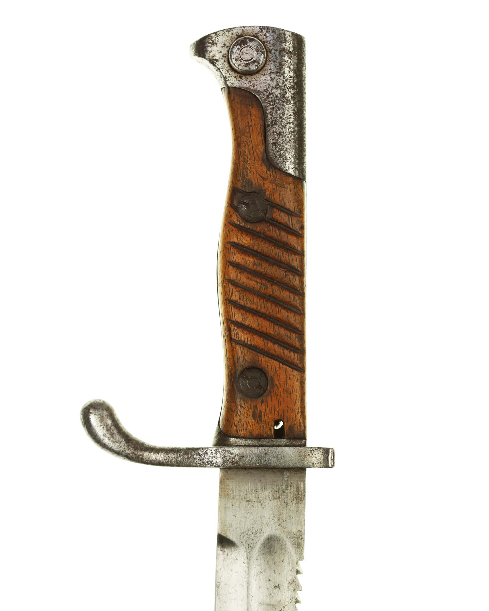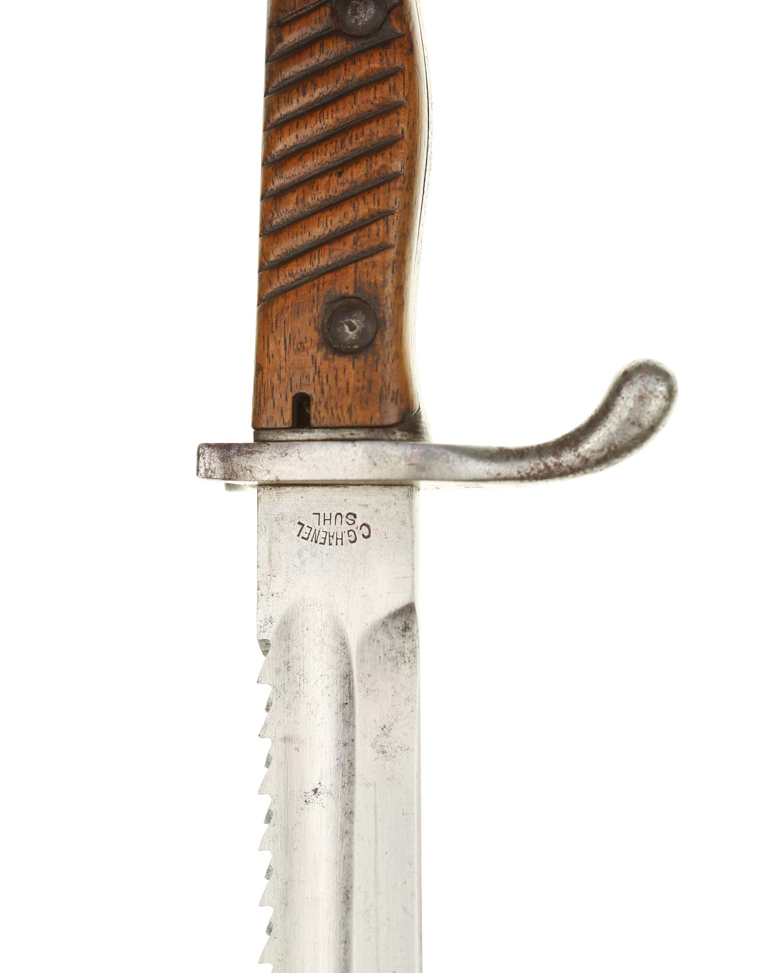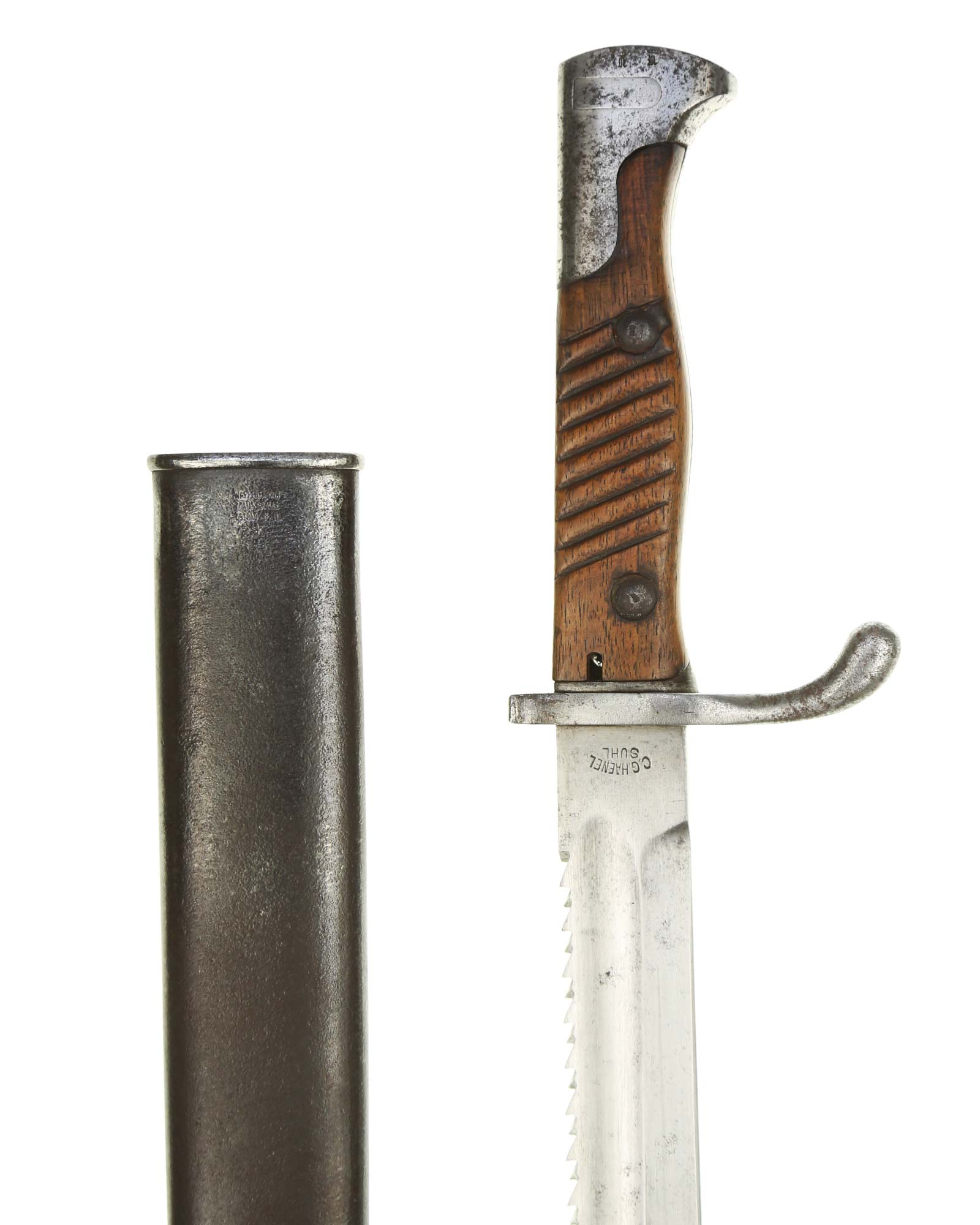 Preußen, Seitengewehr 98/05 a.A. mit Säge, Hersteller C.G. Haenel Suhl. Griff mit zwei, gerillten Holzgriffschalen, zweifach verschraubt. Drücker intakt, Stahlblechscheide.