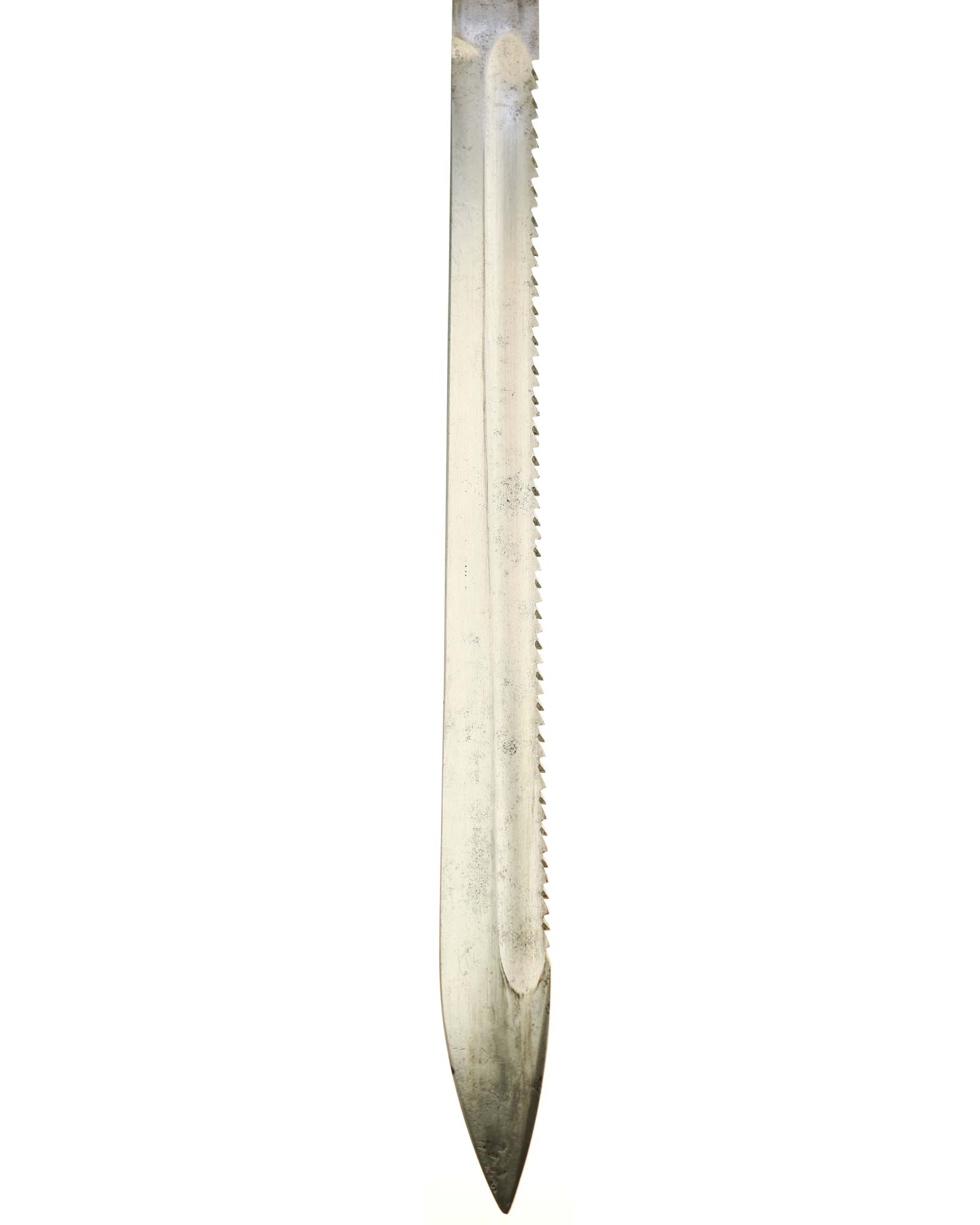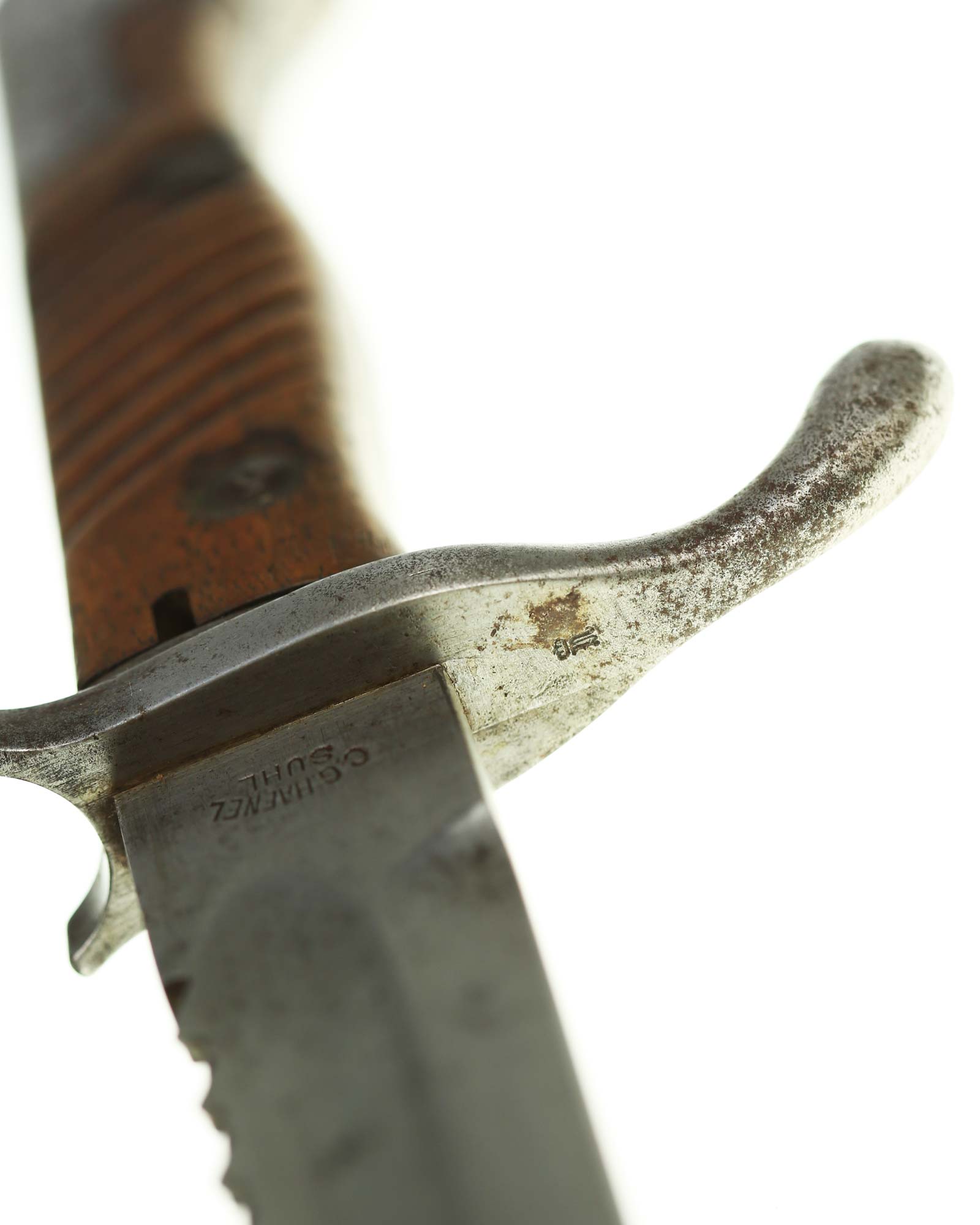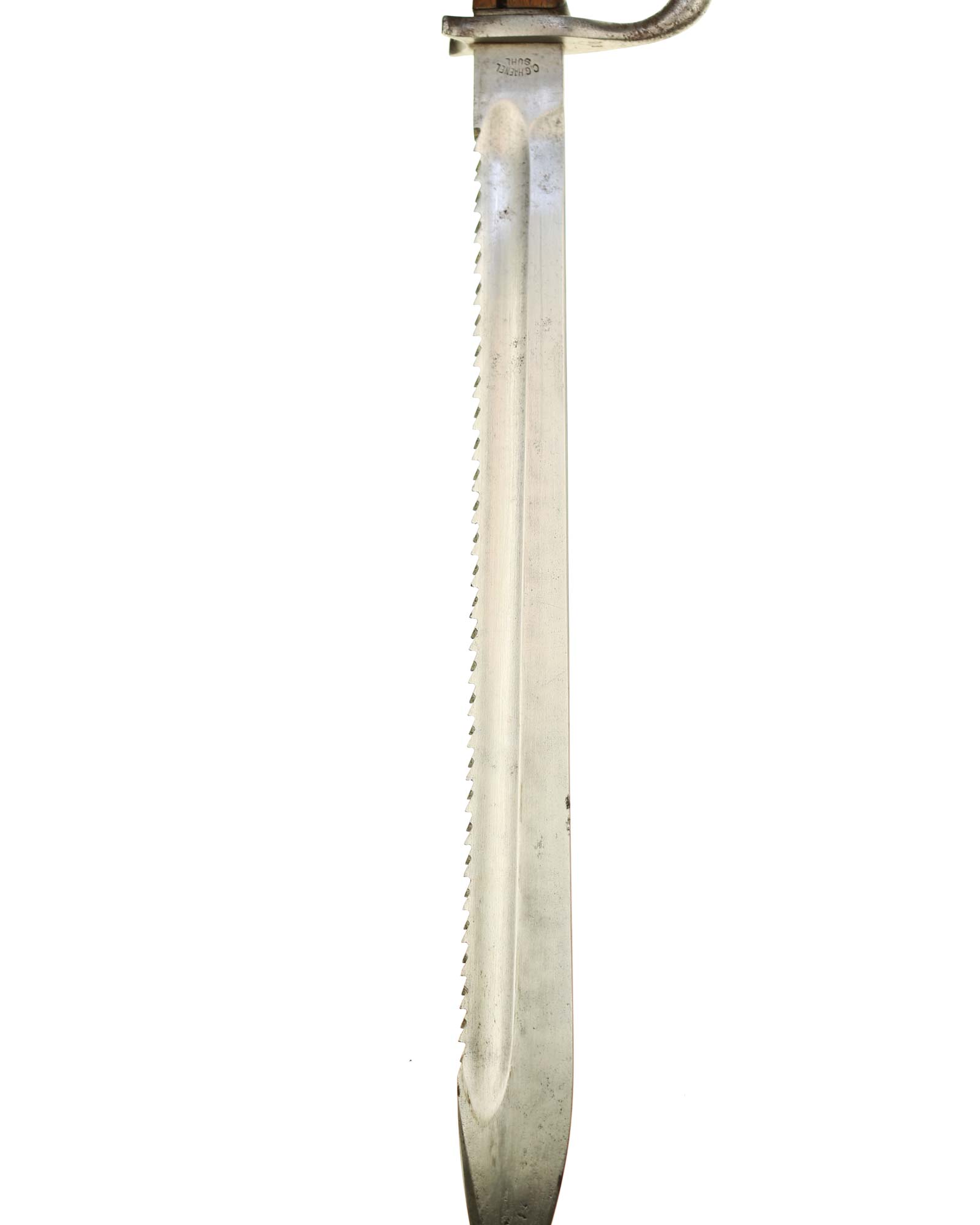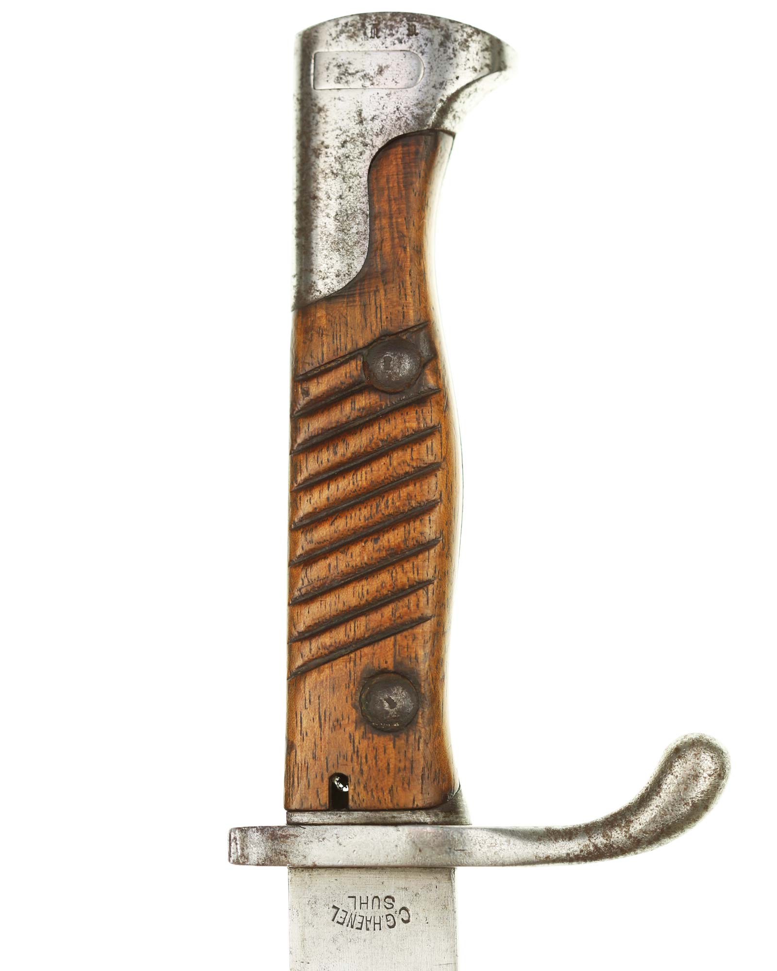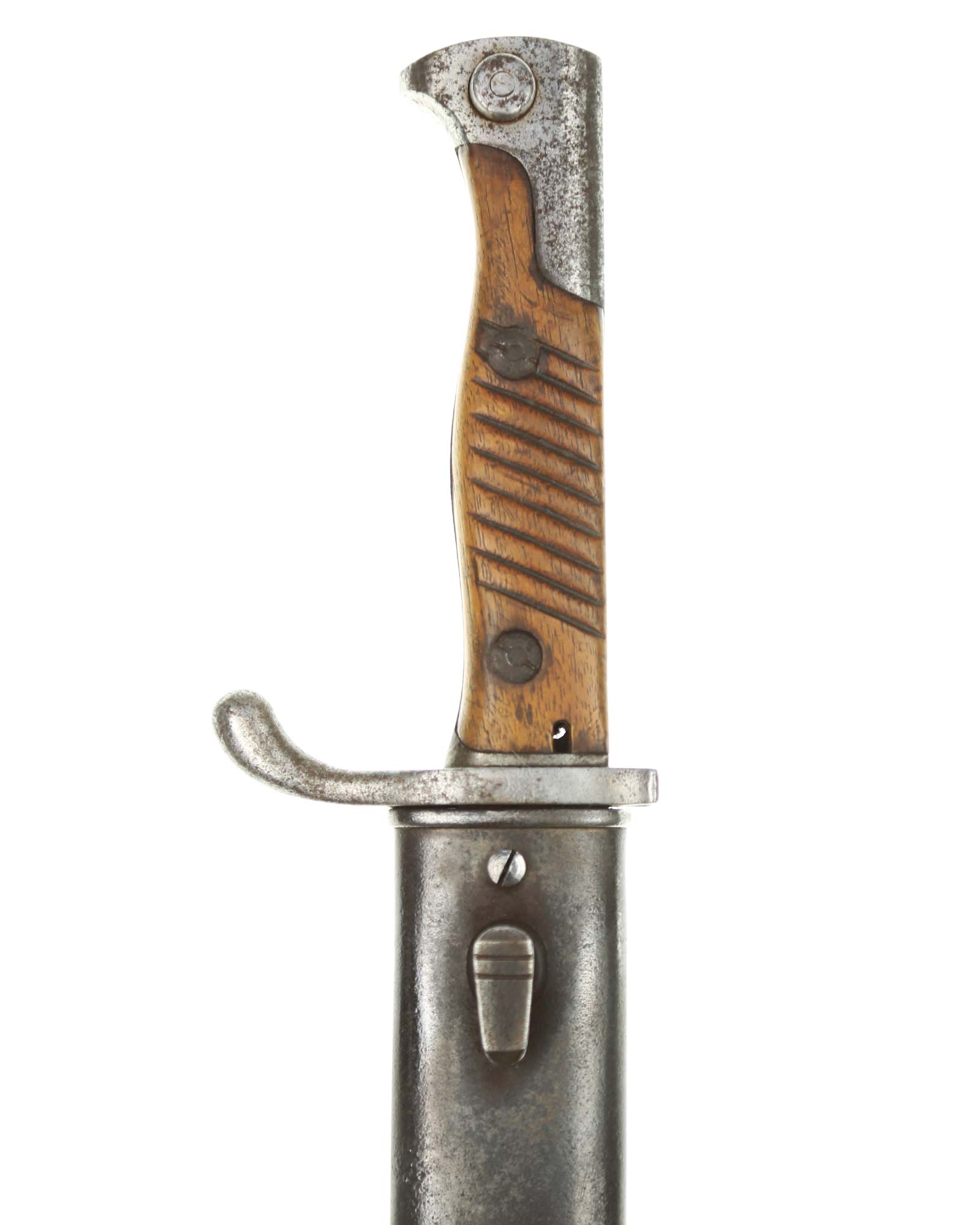 Preußen, Seitengewehr 98/05 a.A. mit Säge, Hersteller C.G. Haenel Suhl. Griff mit zwei, gerillten Holzgriffschalen, zweifach verschraubt. Drücker intakt, Stahlblechscheide.