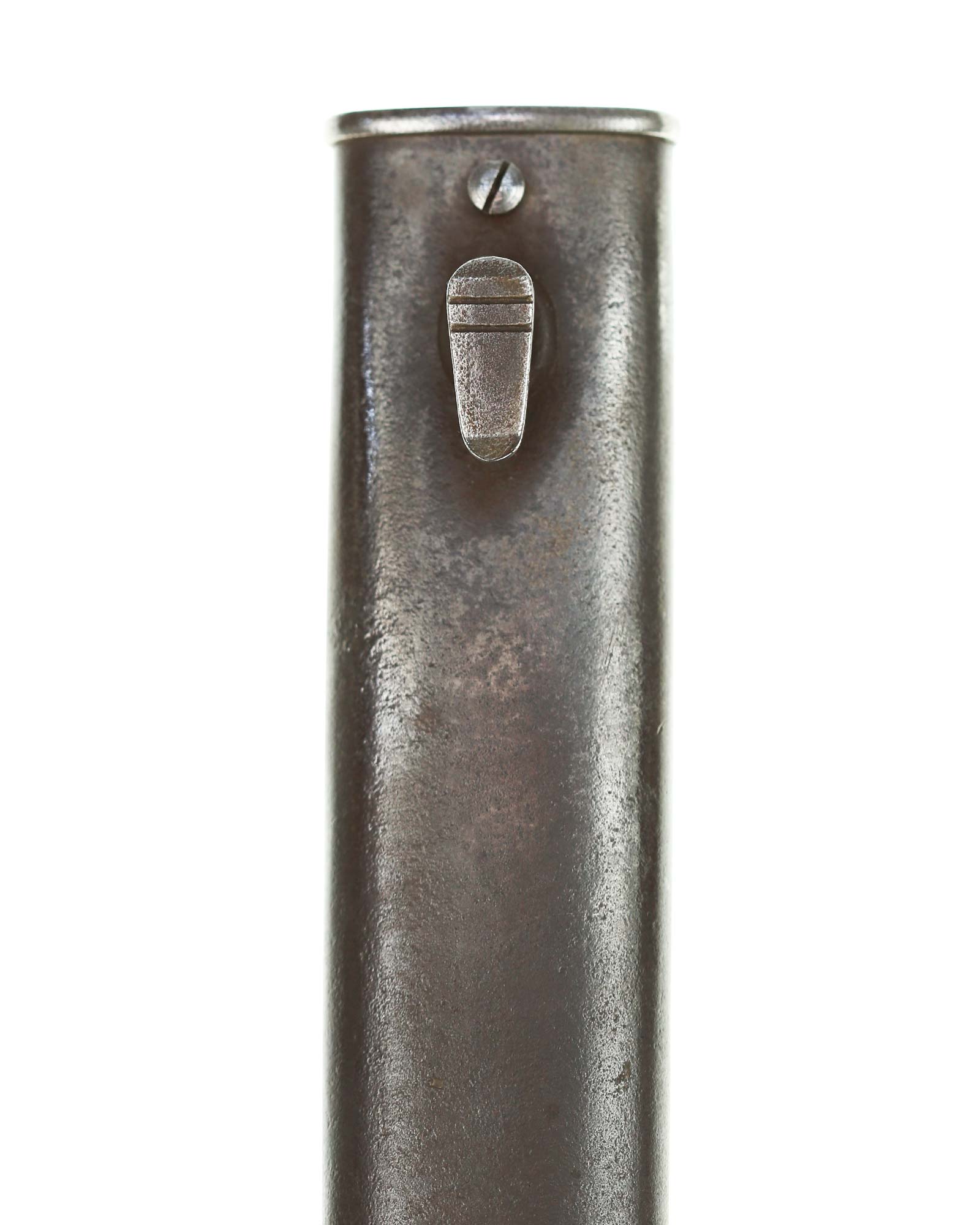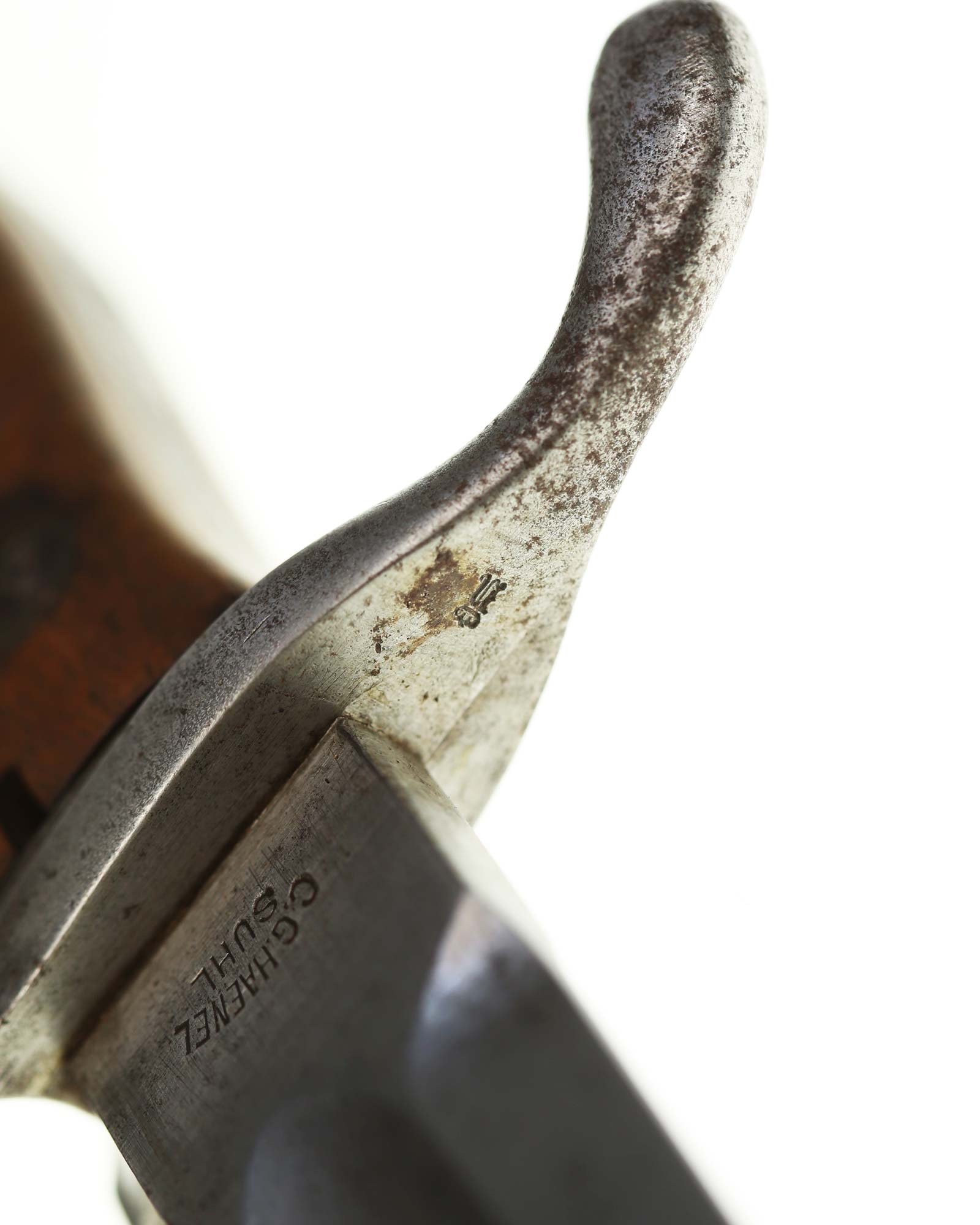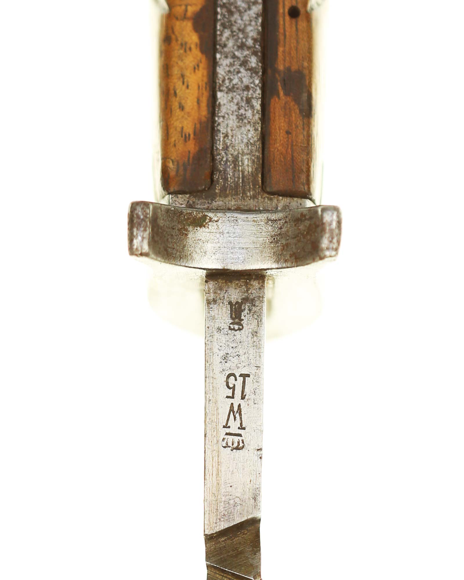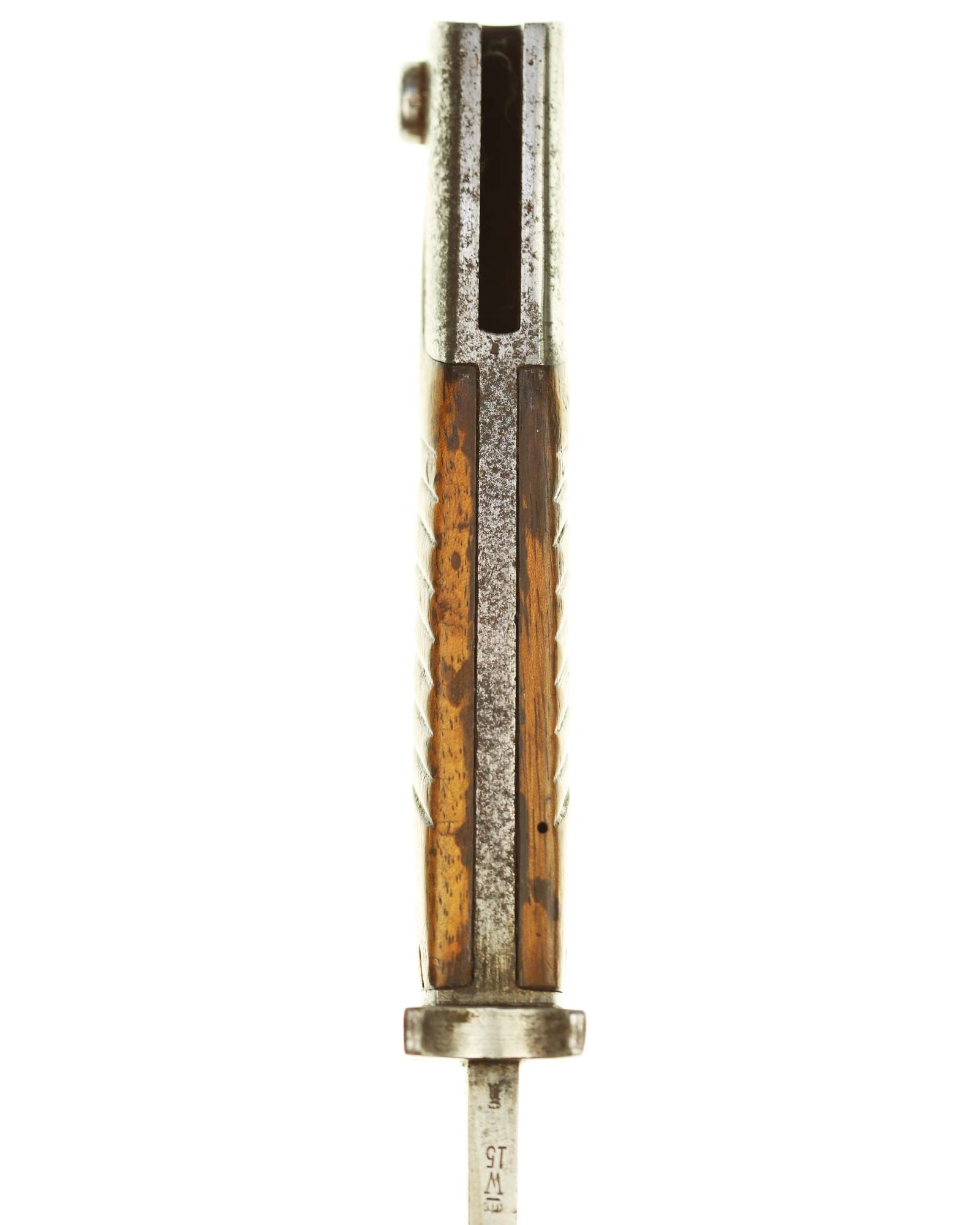 Preußen, Seitengewehr 98/05 a.A. mit Säge, Hersteller C.G. Haenel Suhl. Griff mit zwei, gerillten Holzgriffschalen, zweifach verschraubt. Drücker intakt, Stahlblechscheide.