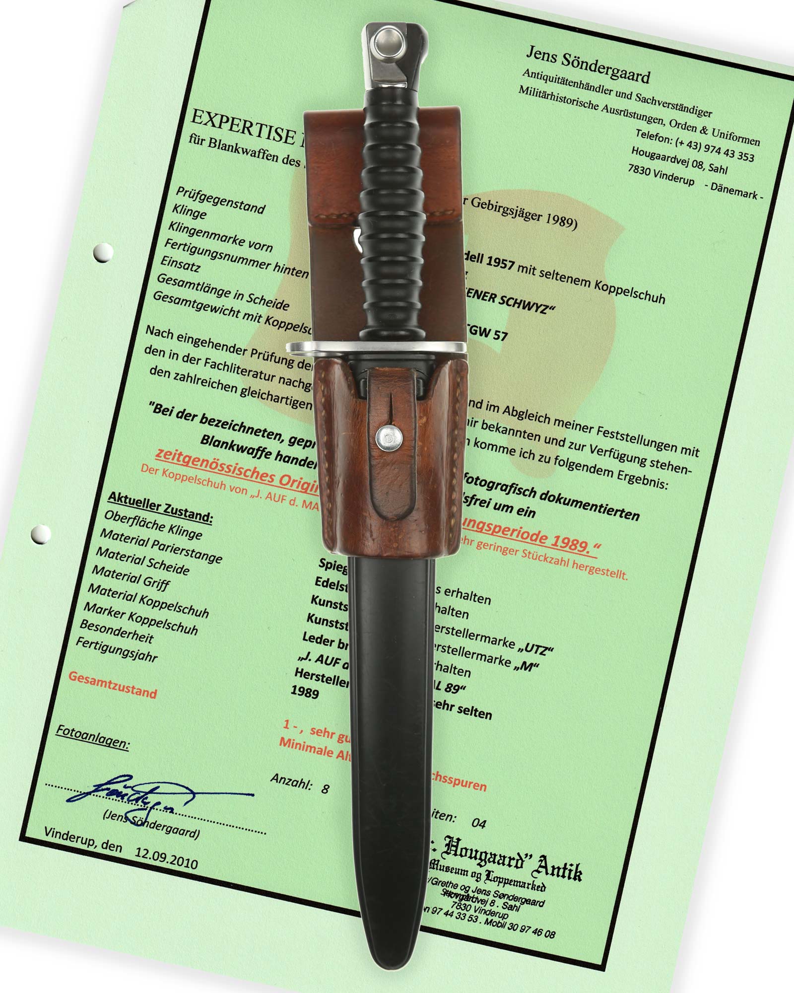 Ein sehr gut erhaltenes Bajonett aus später Fertigung 1989 vom Hersteller „VICTORIA ELSENER - Schweiz“ in einem sehr seltenen Lederkoppelschuh von „J. Auf d. MAUR EUTHAL“ in einem gepolsterten Etui und mit Expertise (in KOPIE).