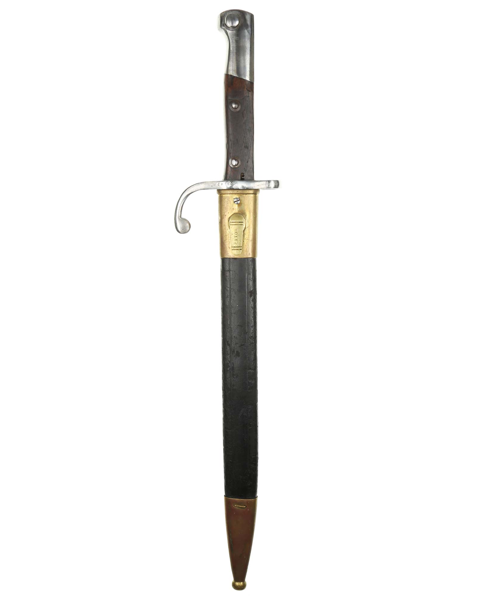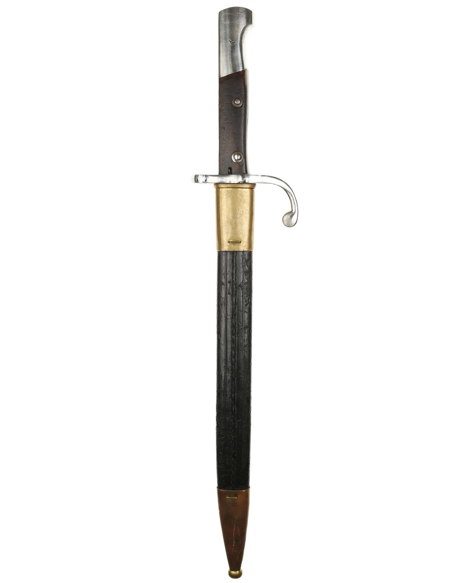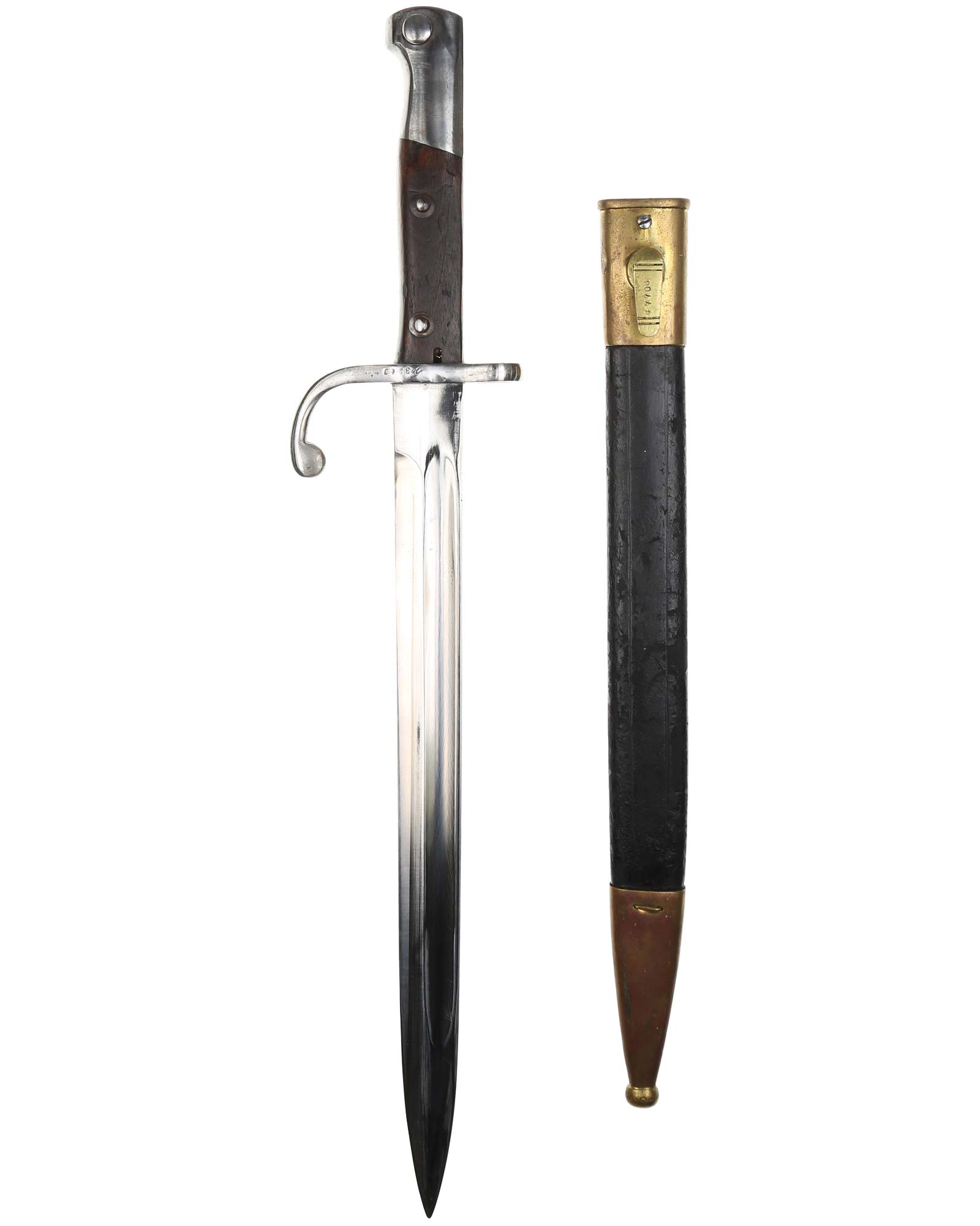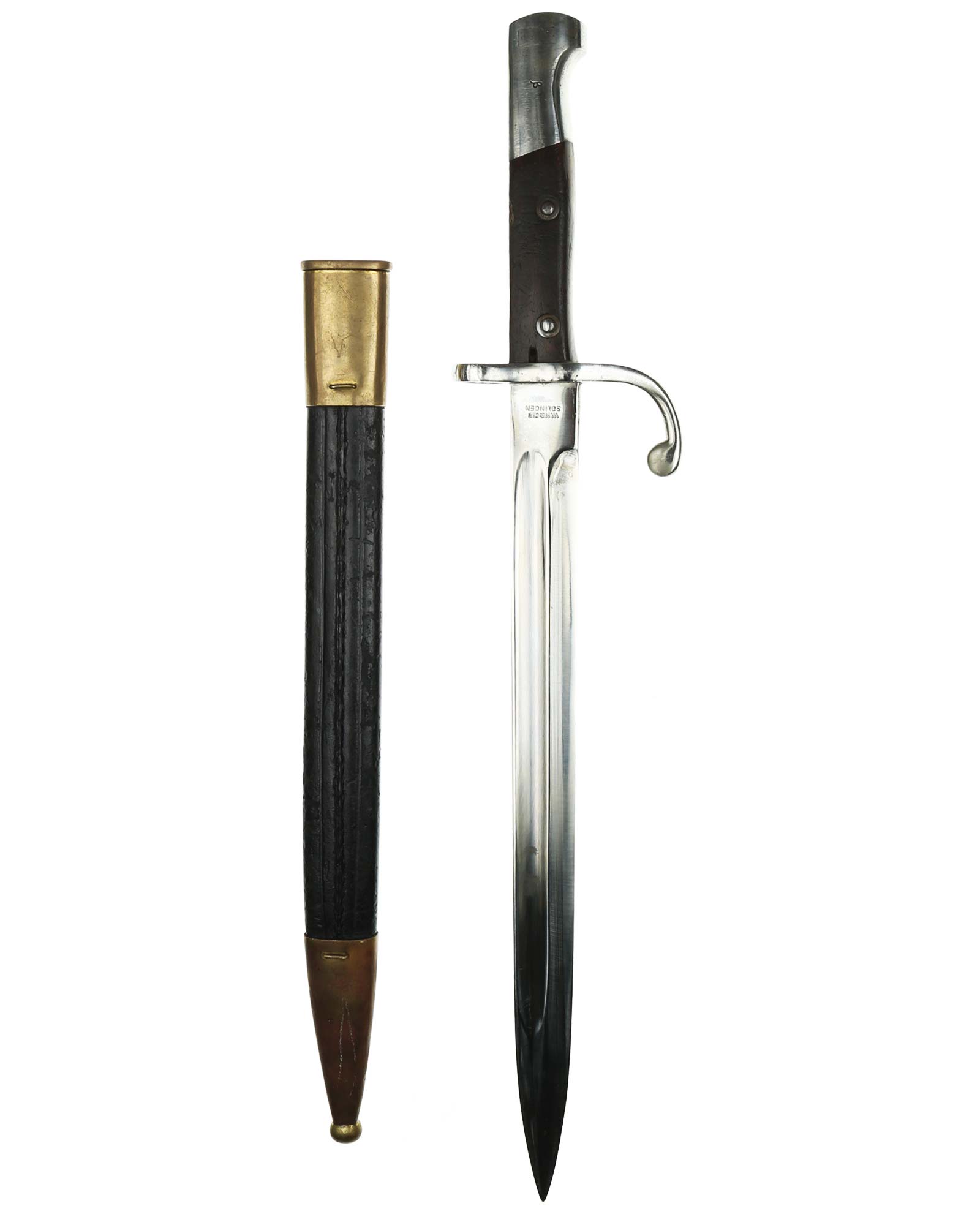 Brasilien Seitengewehr M 1908 für Mauser-Gewehre. Die Scheide ist mit Leder überzogen. Der Hersteller ist WKC Solingen. Gesamtlänge 45,3 cm.