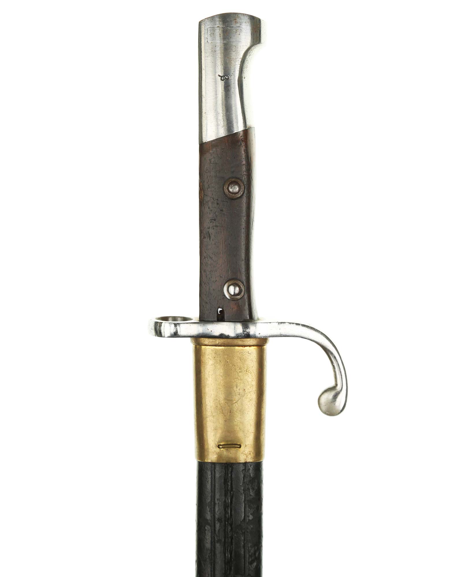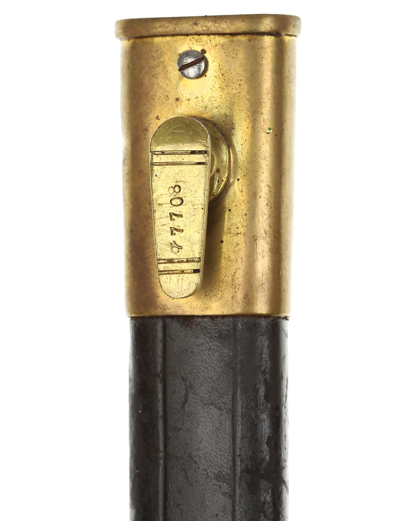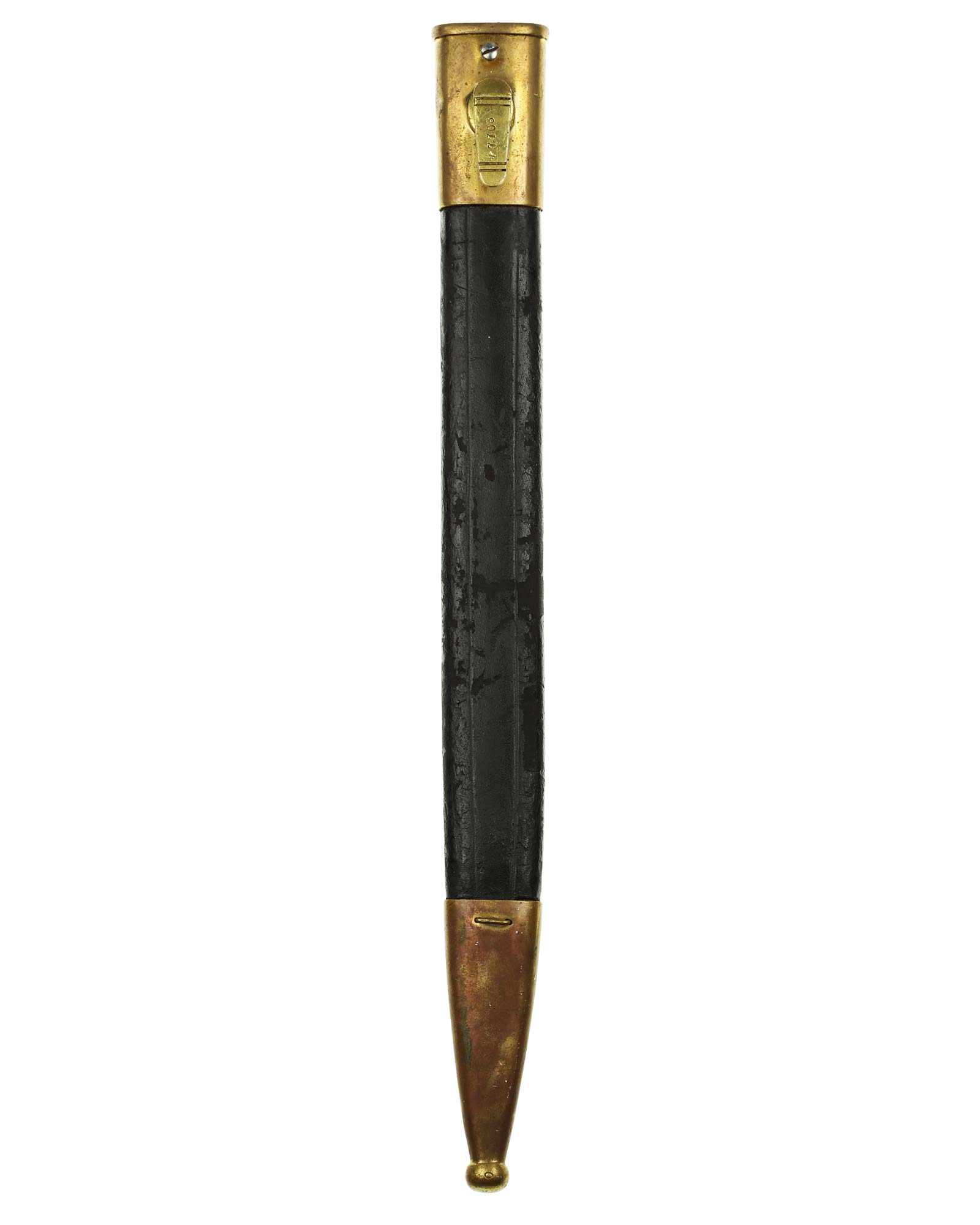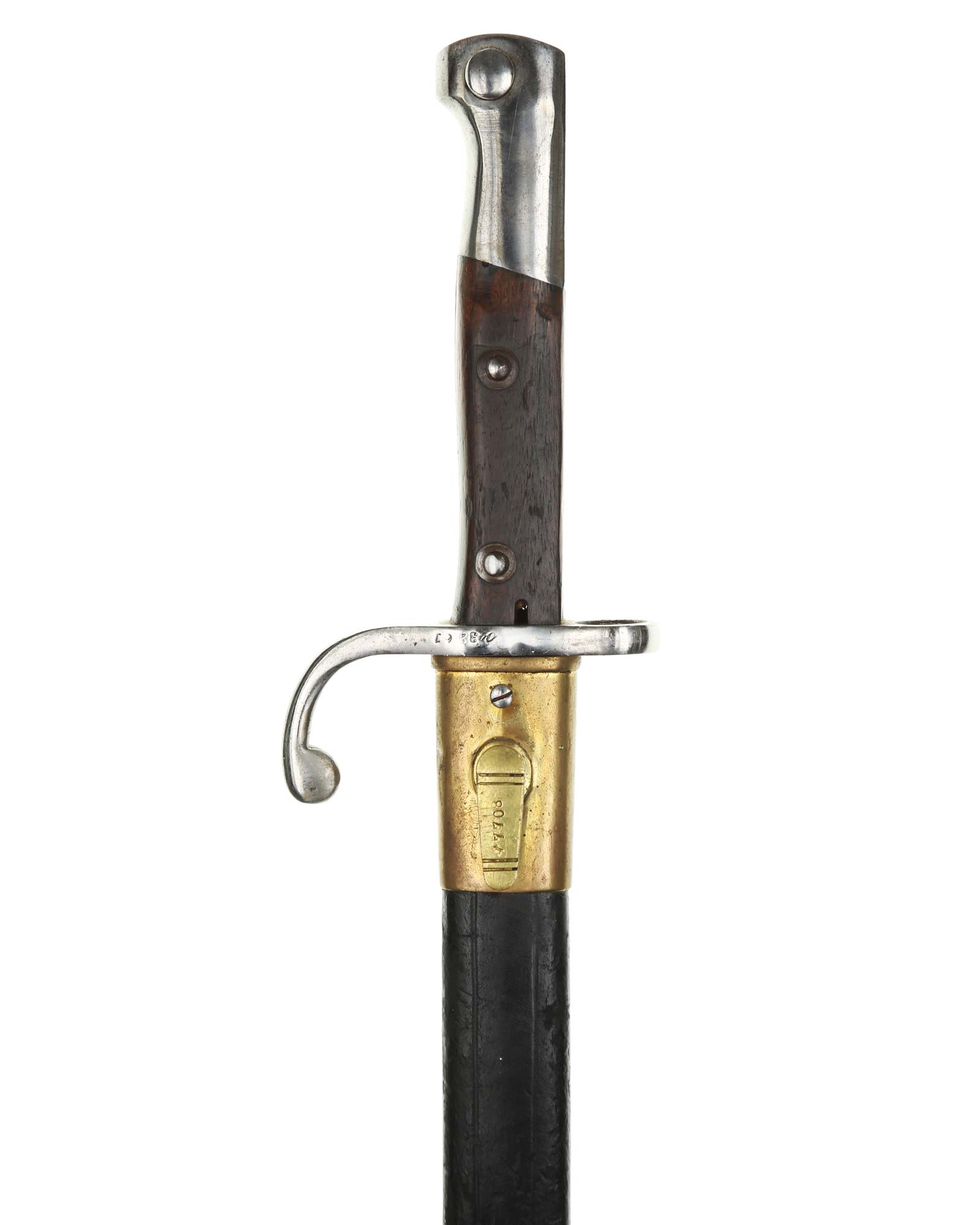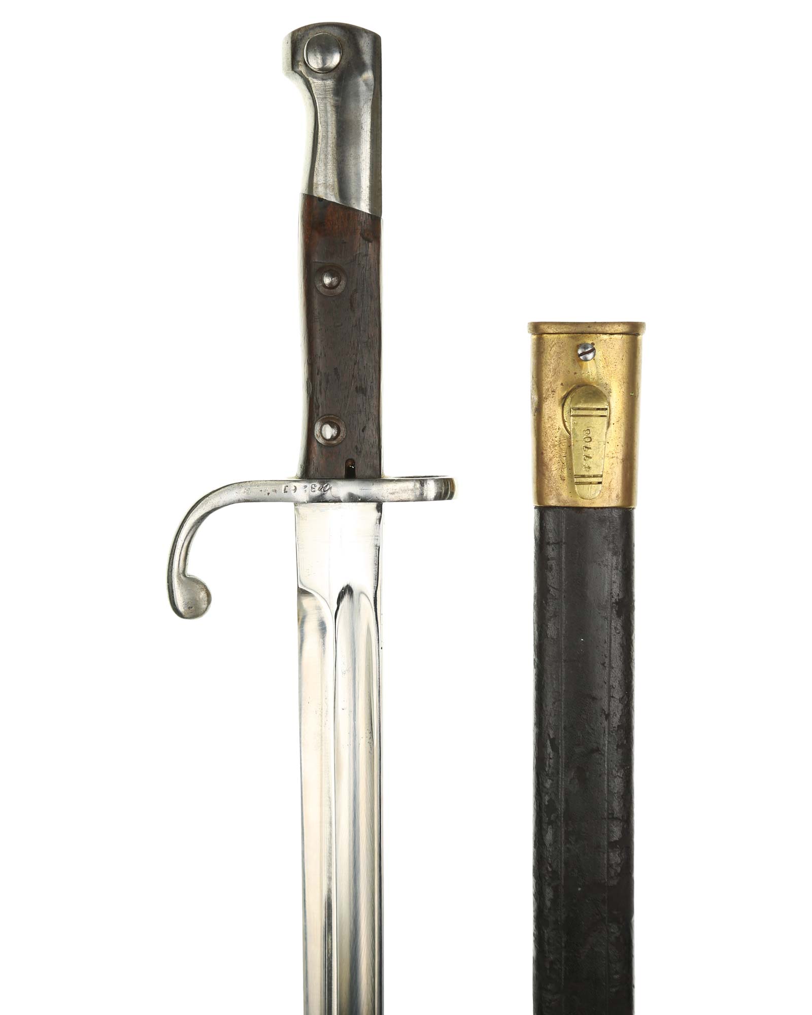 Brasilien Seitengewehr M 1908 für Mauser-Gewehre. Die Scheide ist mit Leder überzogen. Der Hersteller ist WKC Solingen. Gesamtlänge 45,3 cm.