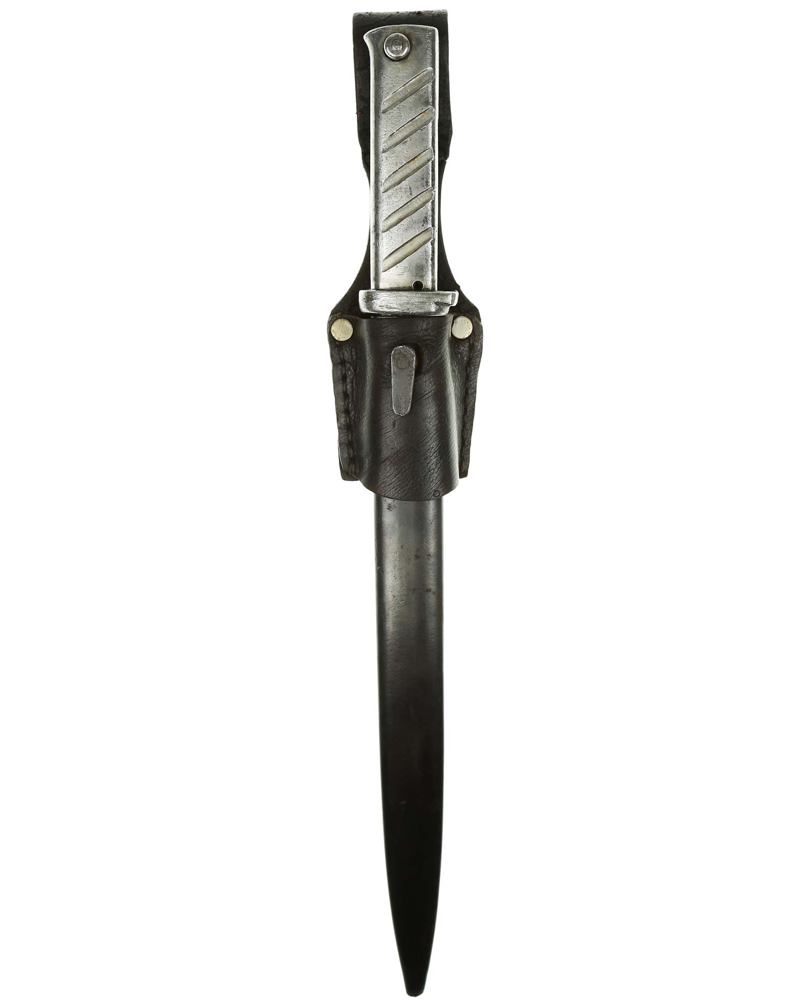 Deutsches "Ersatz" Seitengewehr Modell 1917 für Mauser-Gewehre. Die Scheide ist aus Stahl und brüniert. Hersteller auf Rückseite der Klinge vorhanden. Der Griff ist aus einem Stück Stahl und fast quadratisch. Es hat fünf breite diagonale Rillen auf beiden Seiten.