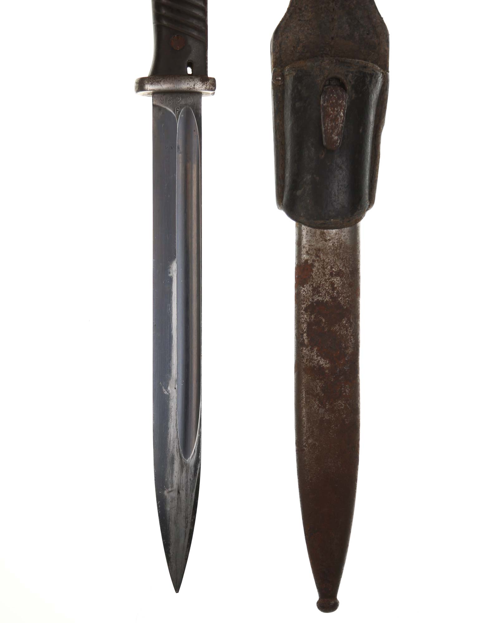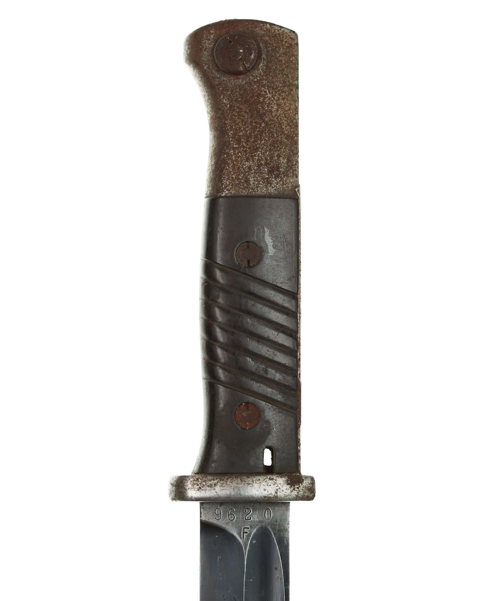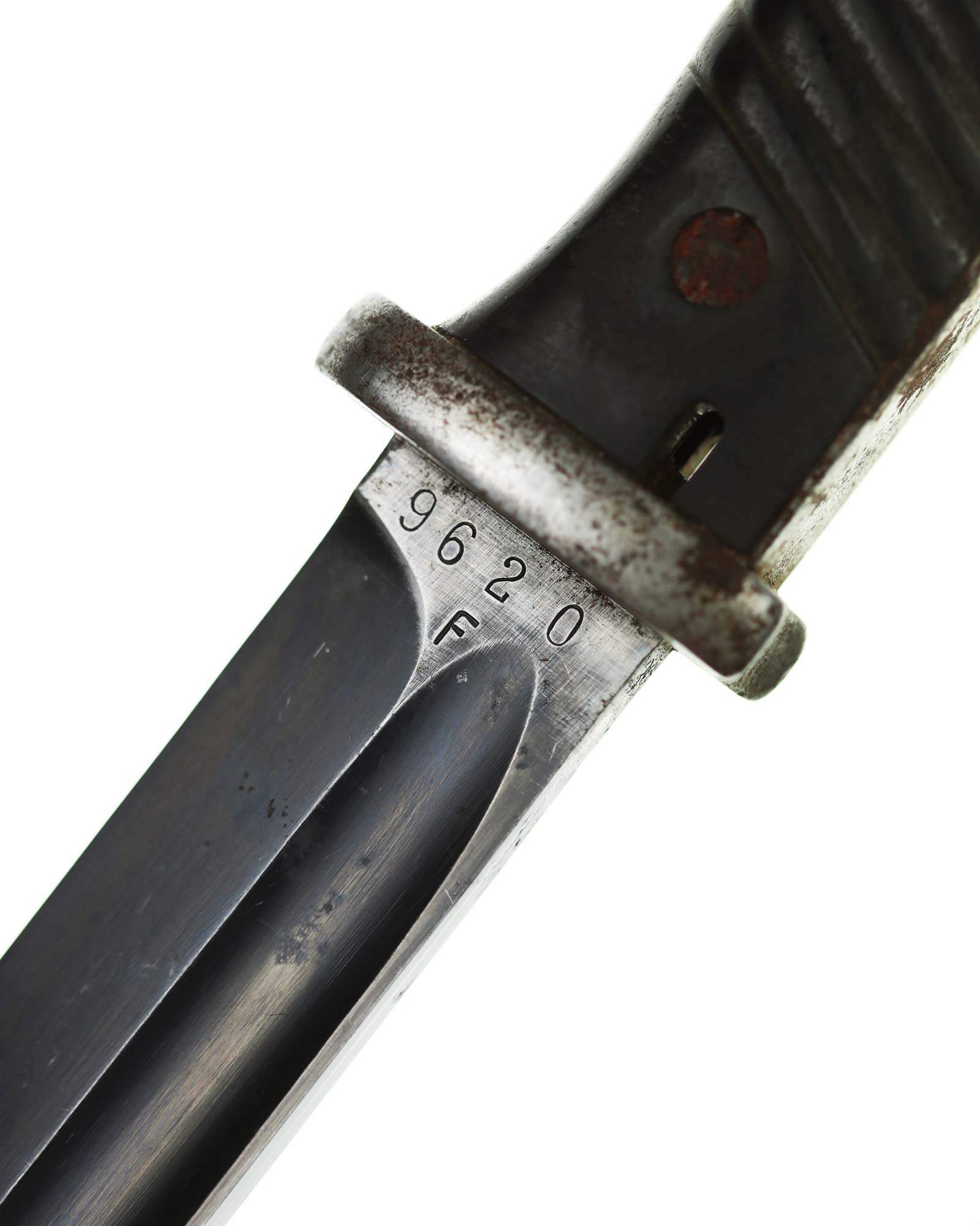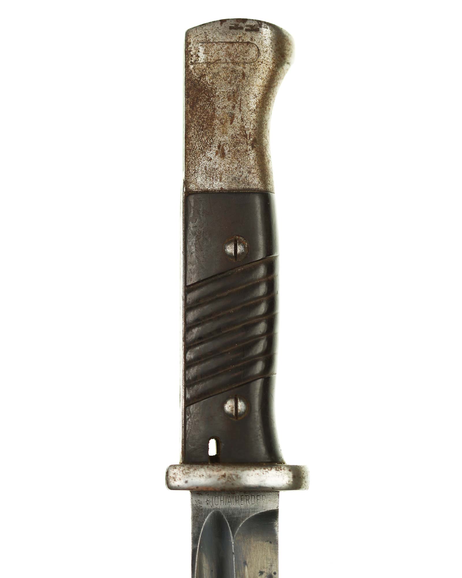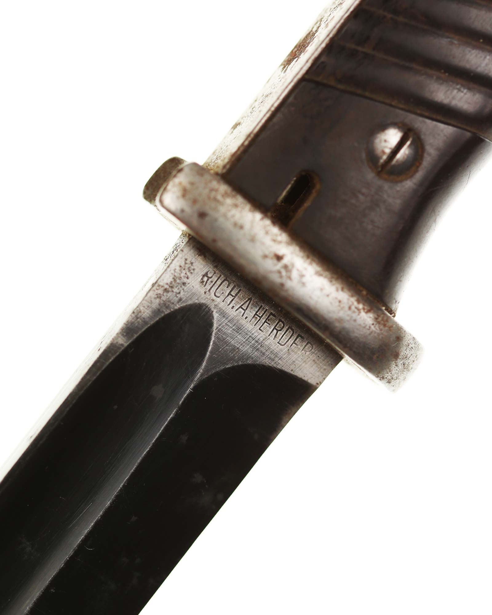 Seitengewehr 84/98 nummerngleich mit der Scheide. Griff mit schwarzbraunen Bakelit-Griffschalen, diese werden mit zwei Schrauben befestigt. Druckknopf funktioniert einwandfrei. Die Klinge ist brüniert und einschneidig mit runden Hohlkehlen. Auf der Vorderseite der Klinge ist die Nummer (9620 F) eingeschlagen, Rückseite mit Herstellermarkierung: Rich. A. Herder Solingen. Stahlscheide mit Leder-Koppelschuh. Gesamtlänge beträgt 406 mm.