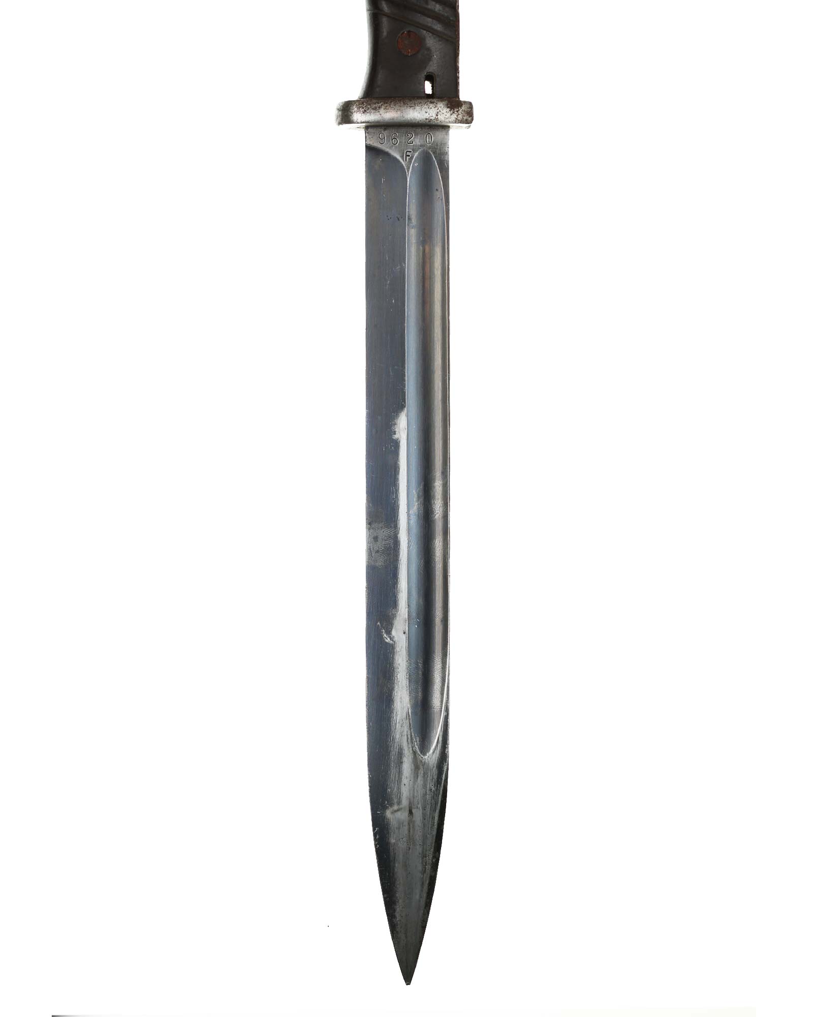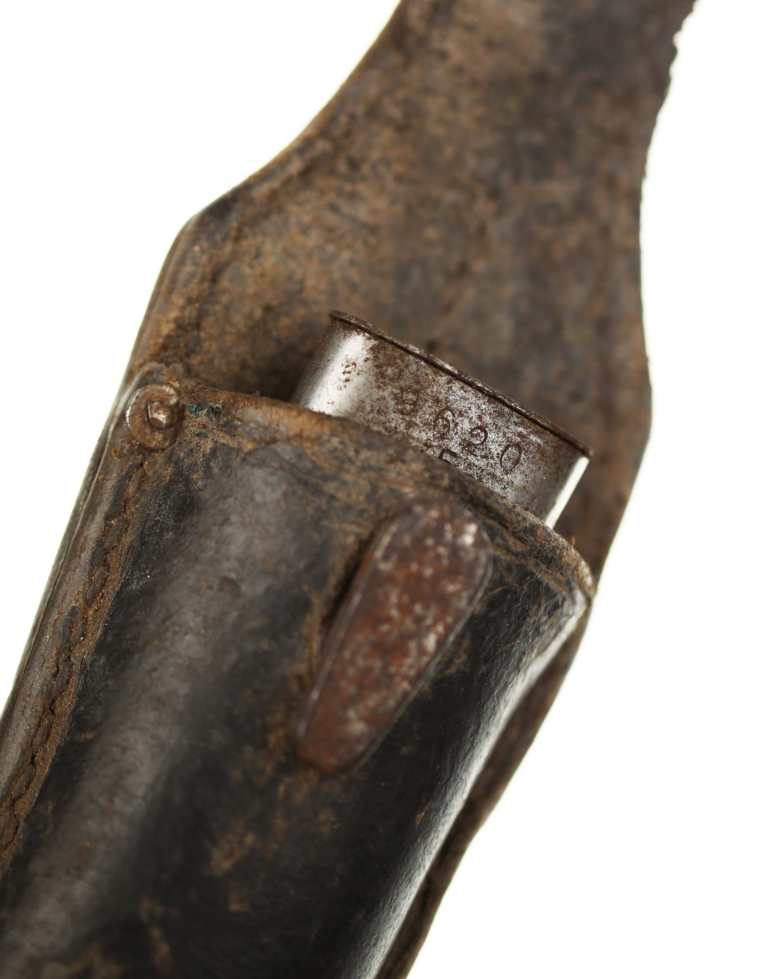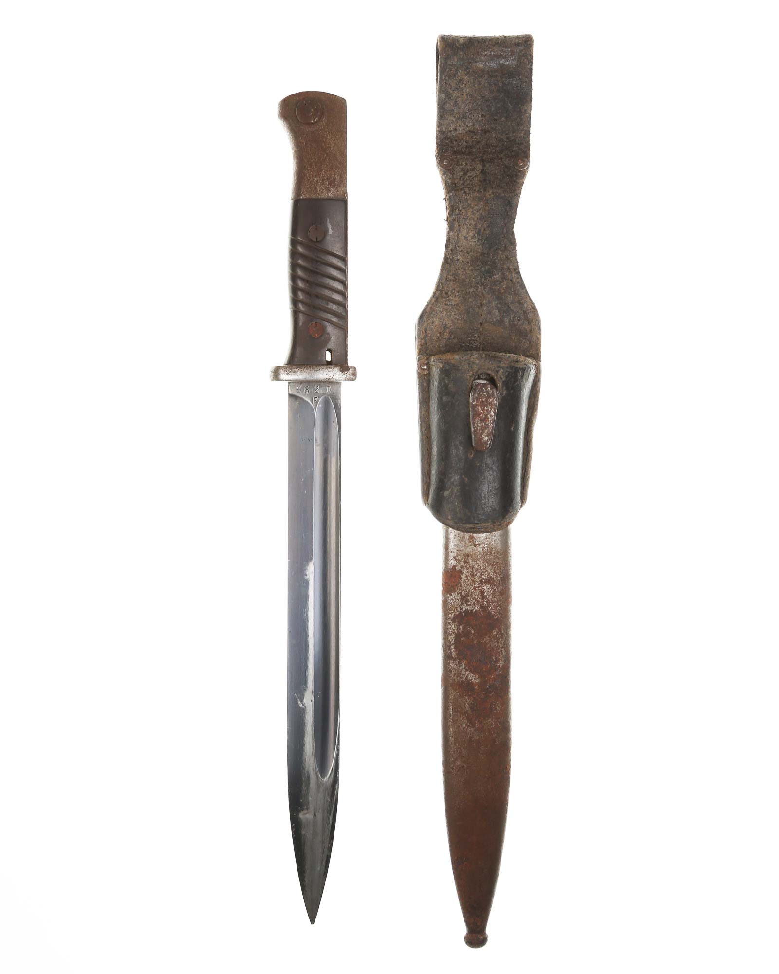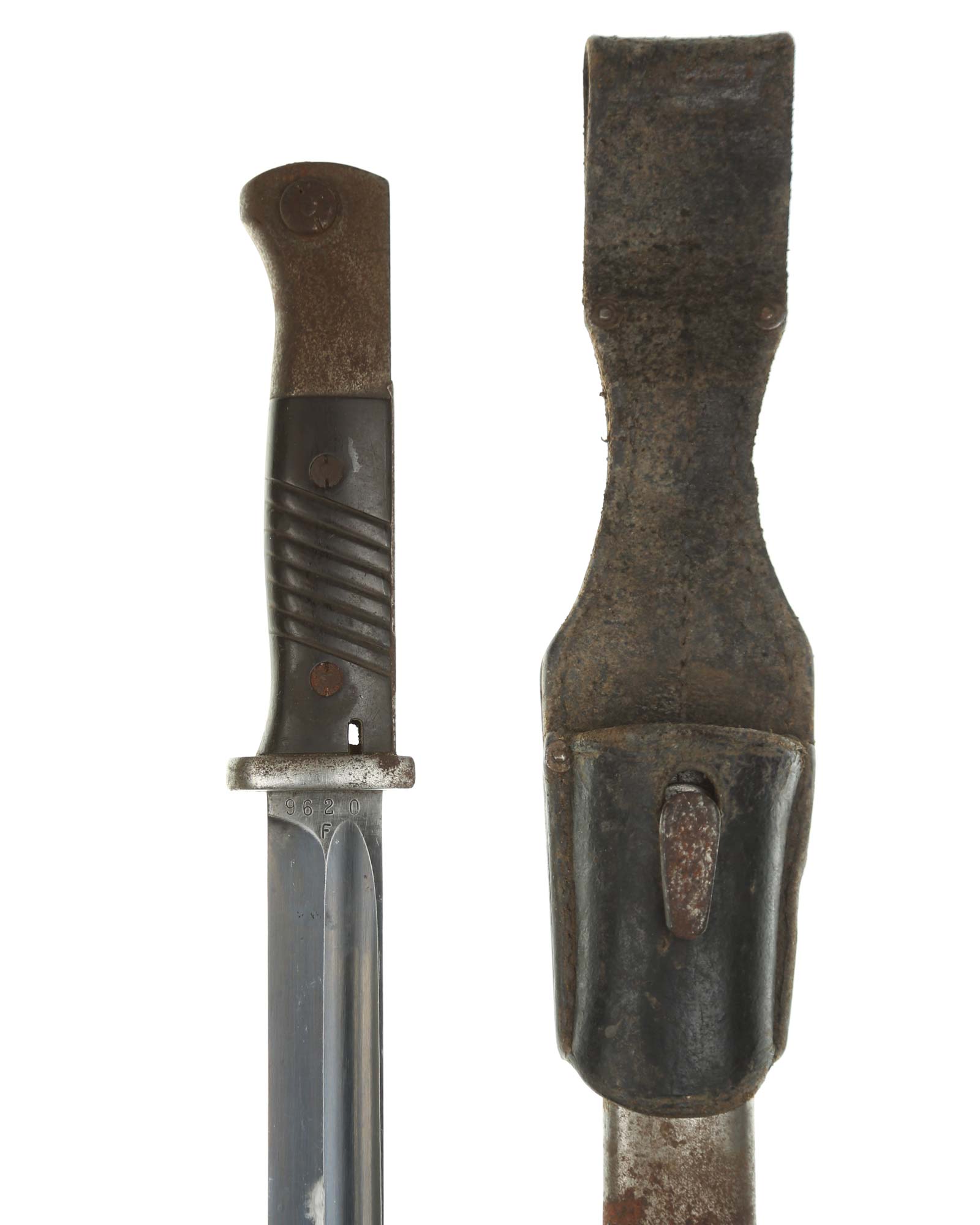 Seitengewehr 84/98 nummerngleich mit der Scheide. Griff mit schwarzbraunen Bakelit-Griffschalen, diese werden mit zwei Schrauben befestigt. Druckknopf funktioniert einwandfrei. Die Klinge ist brüniert und einschneidig mit runden Hohlkehlen. Auf der Vorderseite der Klinge ist die Nummer (9620 F) eingeschlagen, Rückseite mit Herstellermarkierung: Rich. A. Herder Solingen. Stahlscheide mit Leder-Koppelschuh. Gesamtlänge beträgt 406 mm.