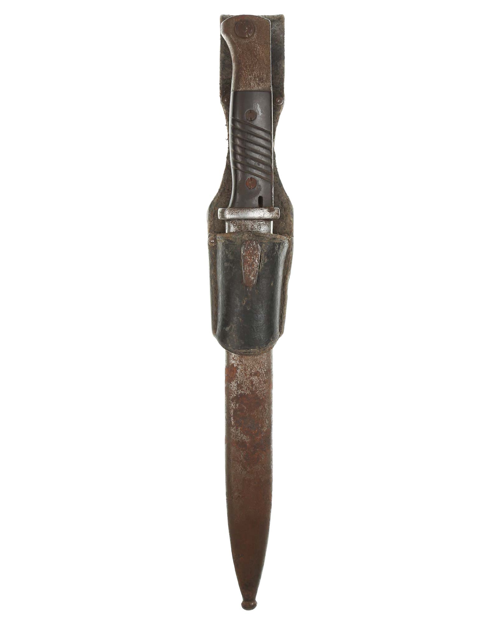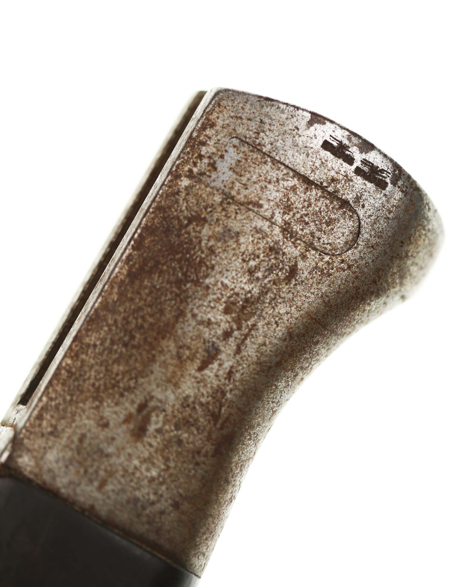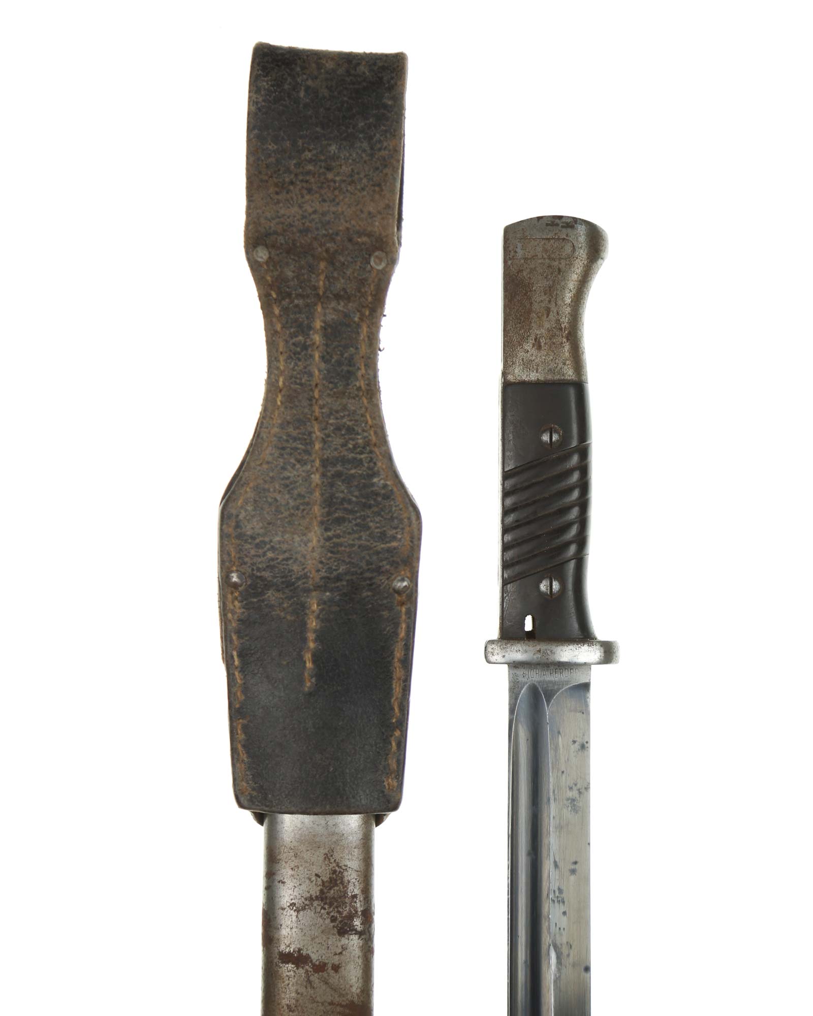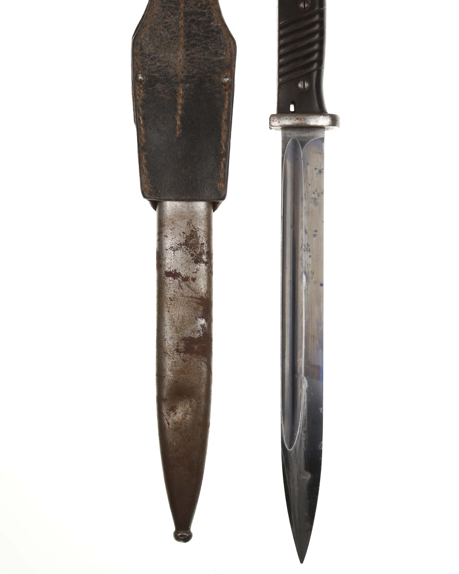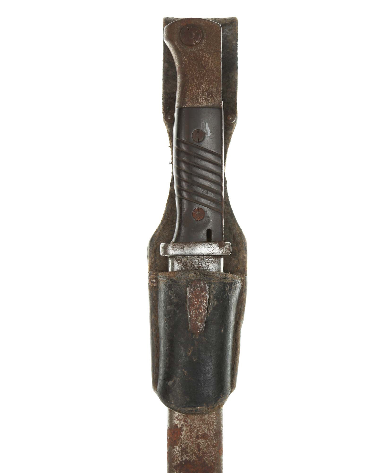 Seitengewehr 84/98 nummerngleich mit der Scheide. Griff mit schwarzbraunen Bakelit-Griffschalen, diese werden mit zwei Schrauben befestigt. Druckknopf funktioniert einwandfrei. Die Klinge ist brüniert und einschneidig mit runden Hohlkehlen. Auf der Vorderseite der Klinge ist die Nummer (9620 F) eingeschlagen, Rückseite mit Herstellermarkierung: Rich. A. Herder Solingen. Stahlscheide mit Leder-Koppelschuh. Gesamtlänge beträgt 406 mm.