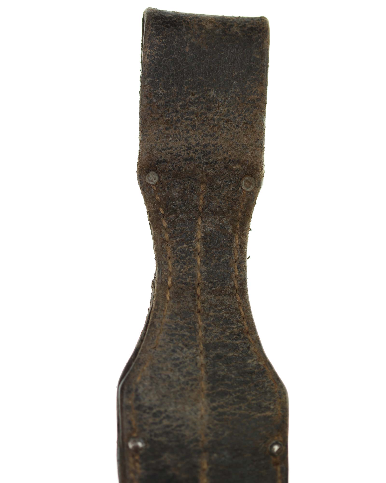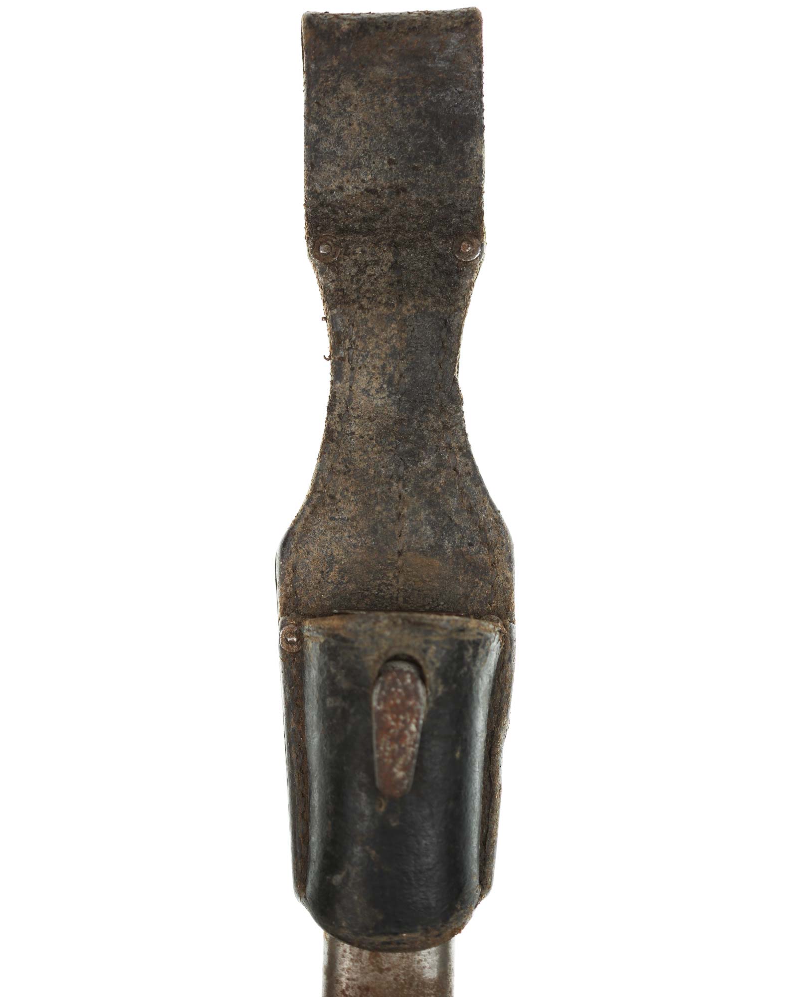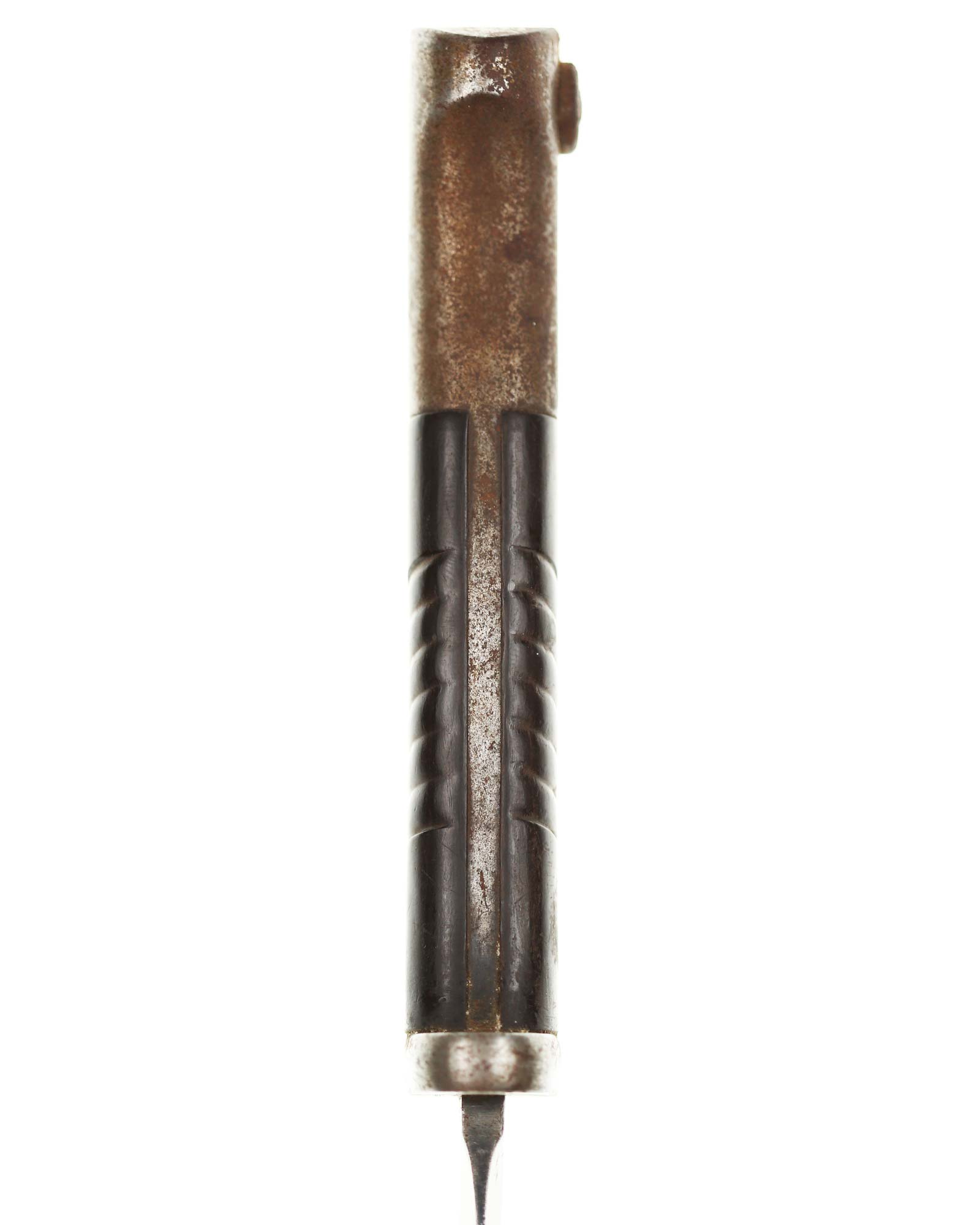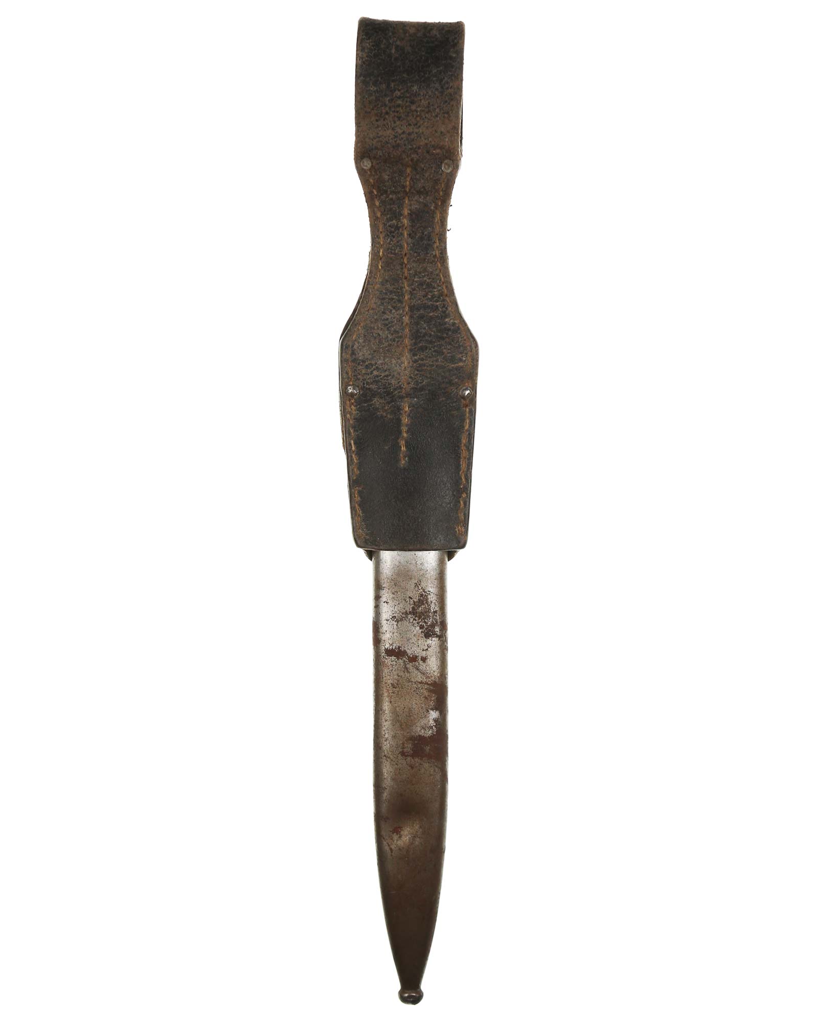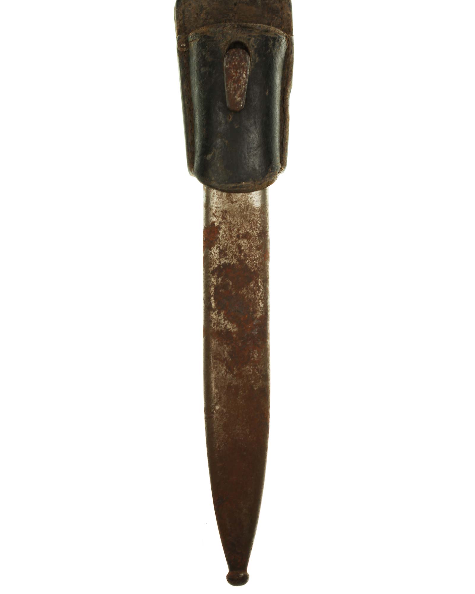 Seitengewehr 84/98 nummerngleich mit der Scheide. Griff mit schwarzbraunen Bakelit-Griffschalen, diese werden mit zwei Schrauben befestigt. Druckknopf funktioniert einwandfrei. Die Klinge ist brüniert und einschneidig mit runden Hohlkehlen. Auf der Vorderseite der Klinge ist die Nummer (9620 F) eingeschlagen, Rückseite mit Herstellermarkierung: Rich. A. Herder Solingen. Stahlscheide mit Leder-Koppelschuh. Gesamtlänge beträgt 406 mm.